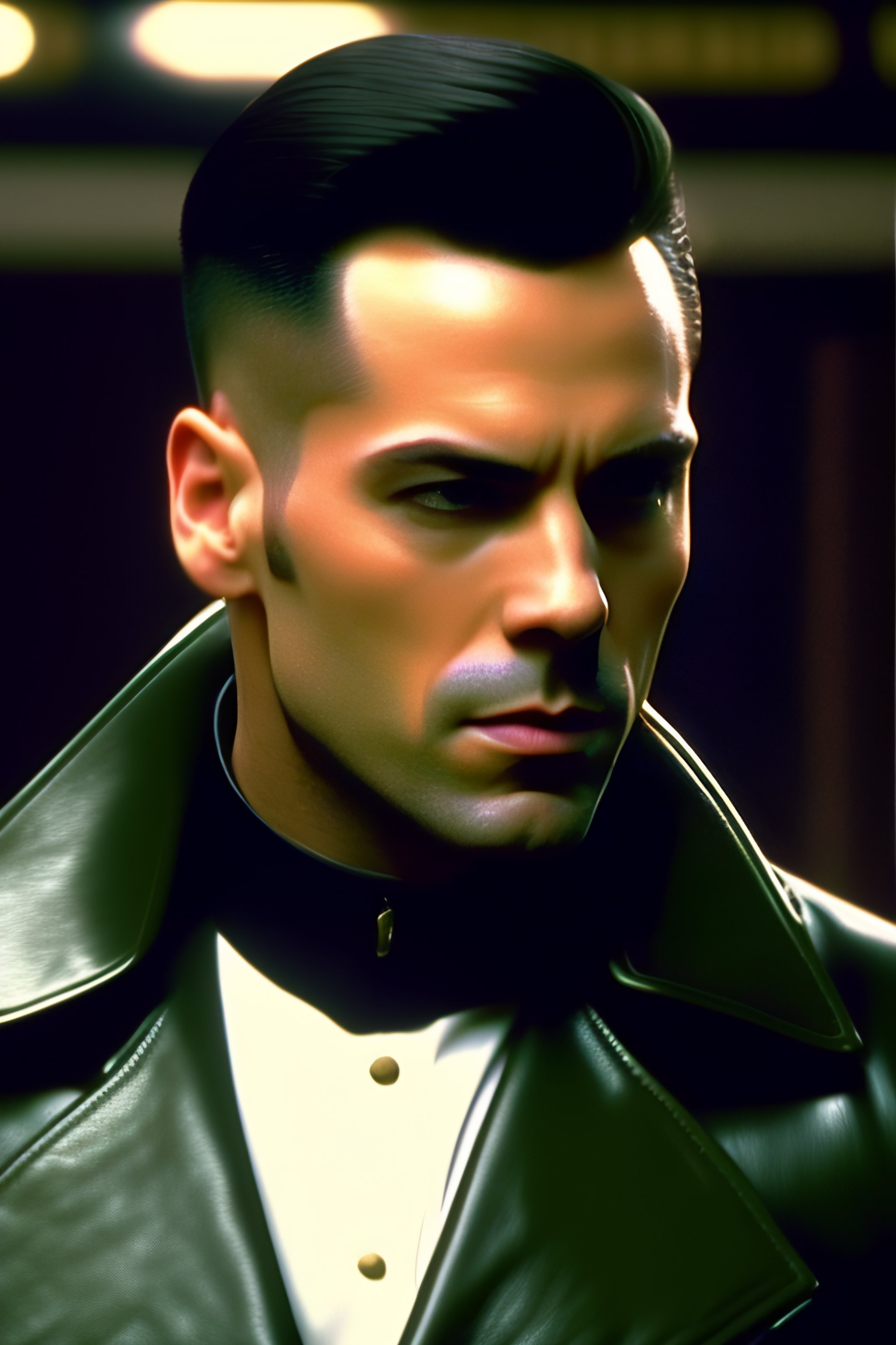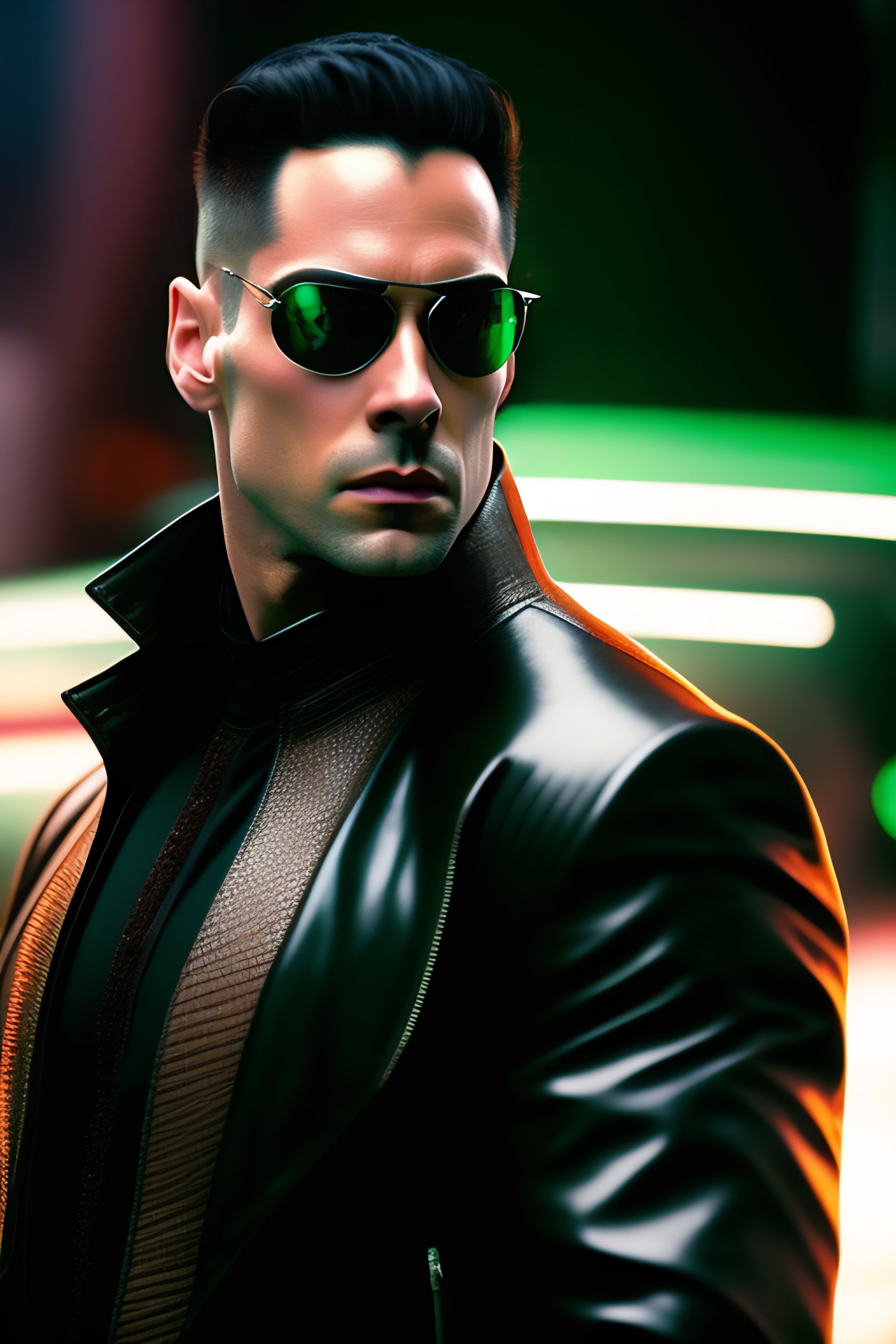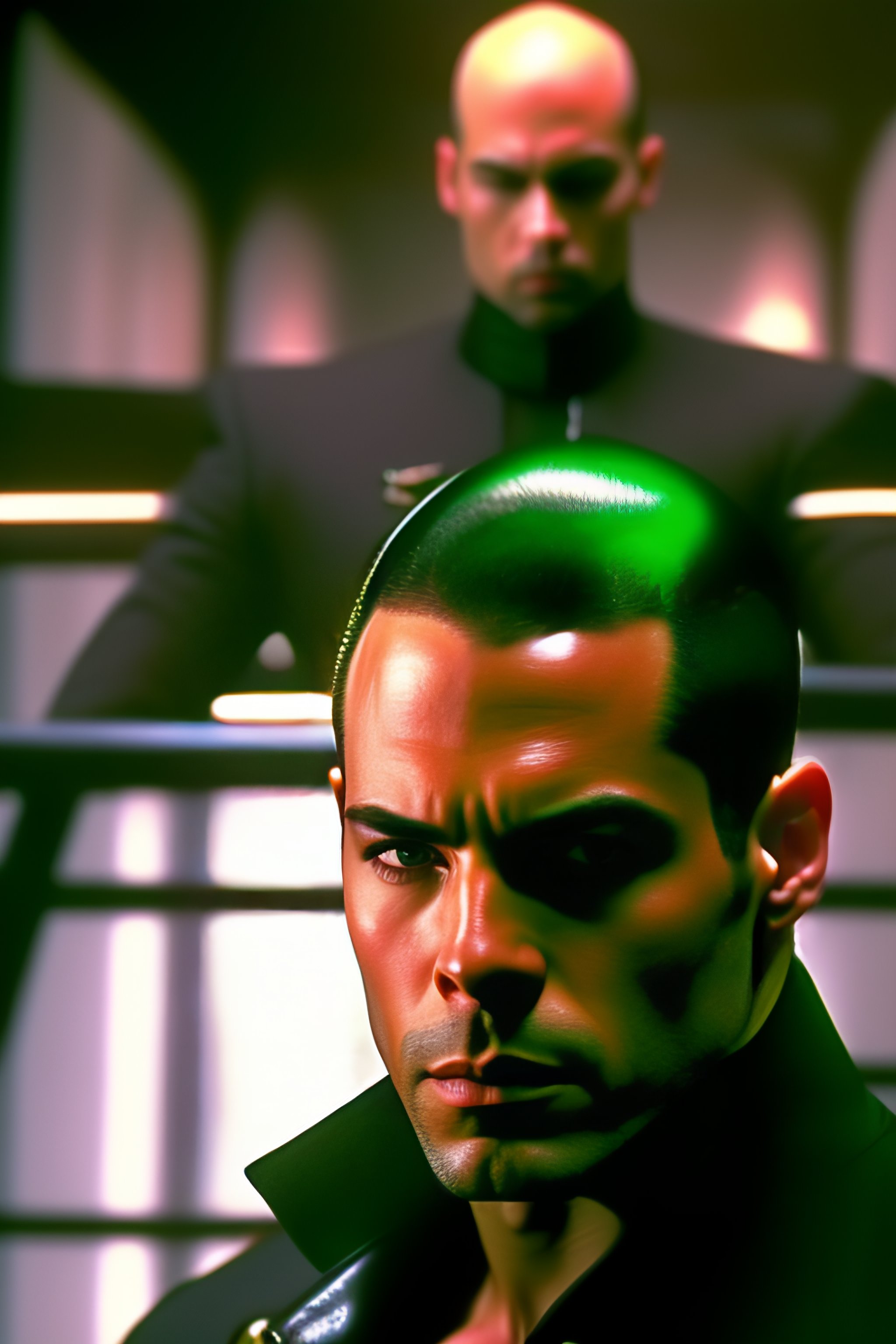 Film still of bald andrew tate as neo in the matrix, full body, leather jacket, enter the matrix, matrix is green, dodge bullets
