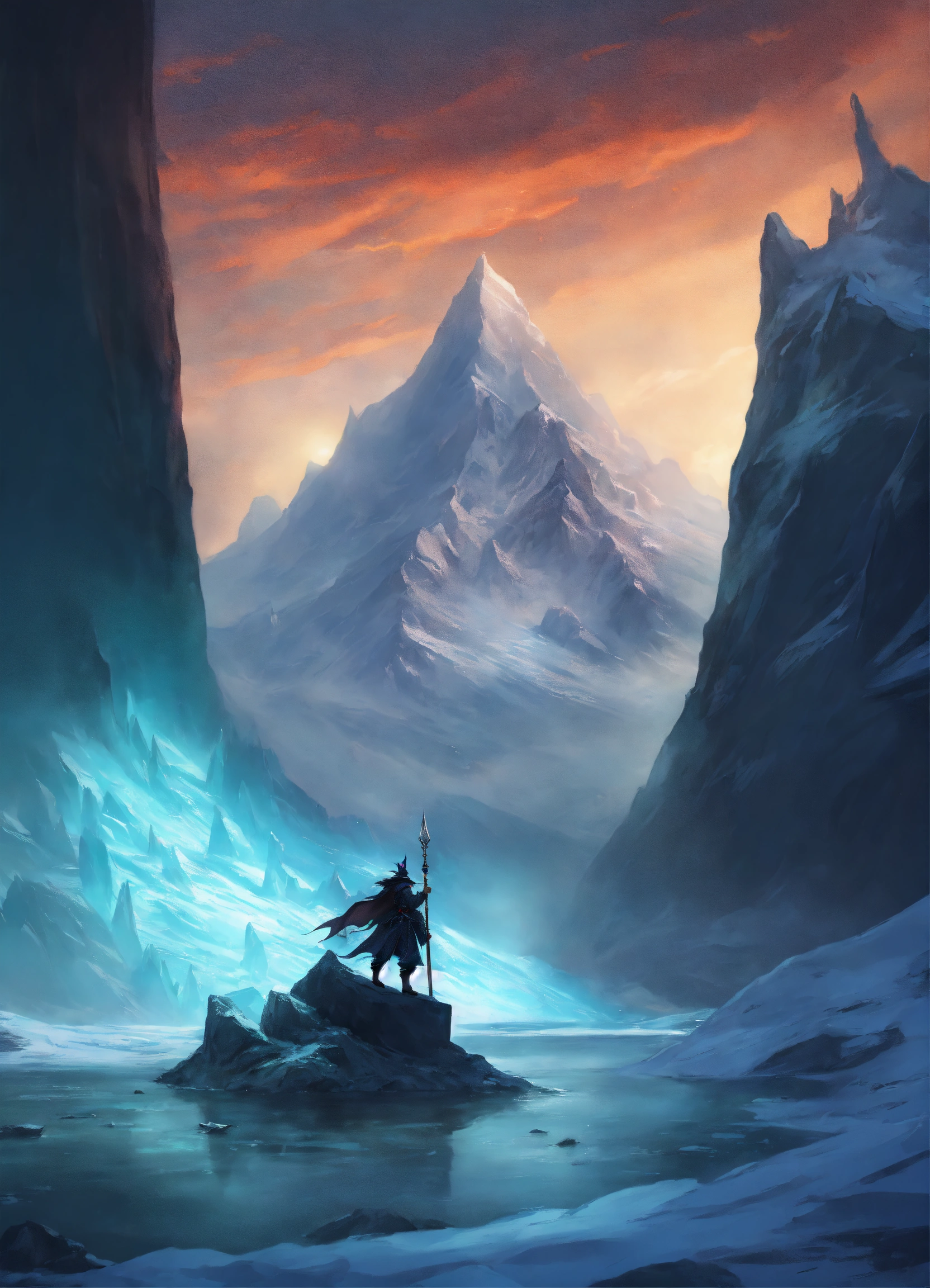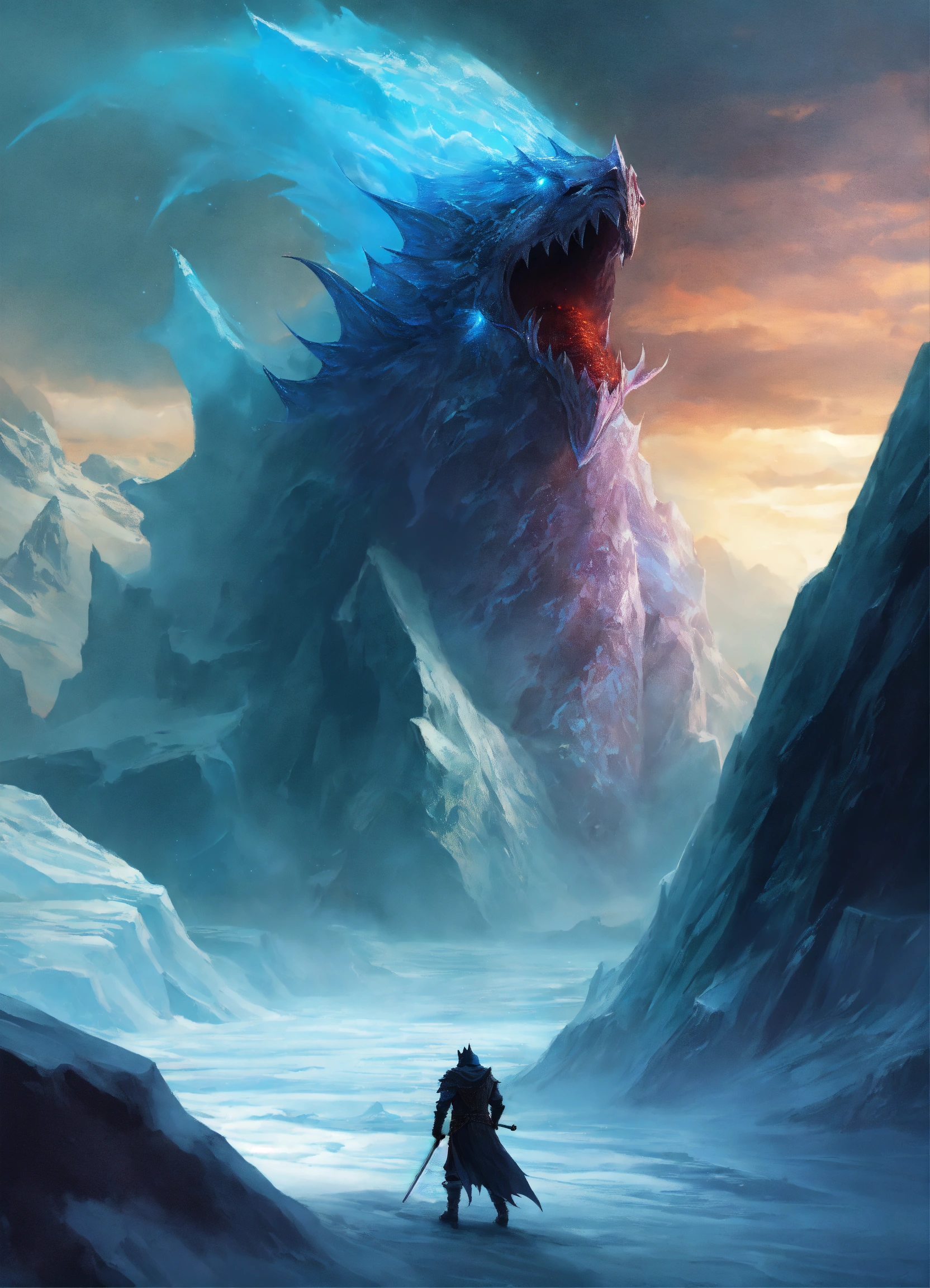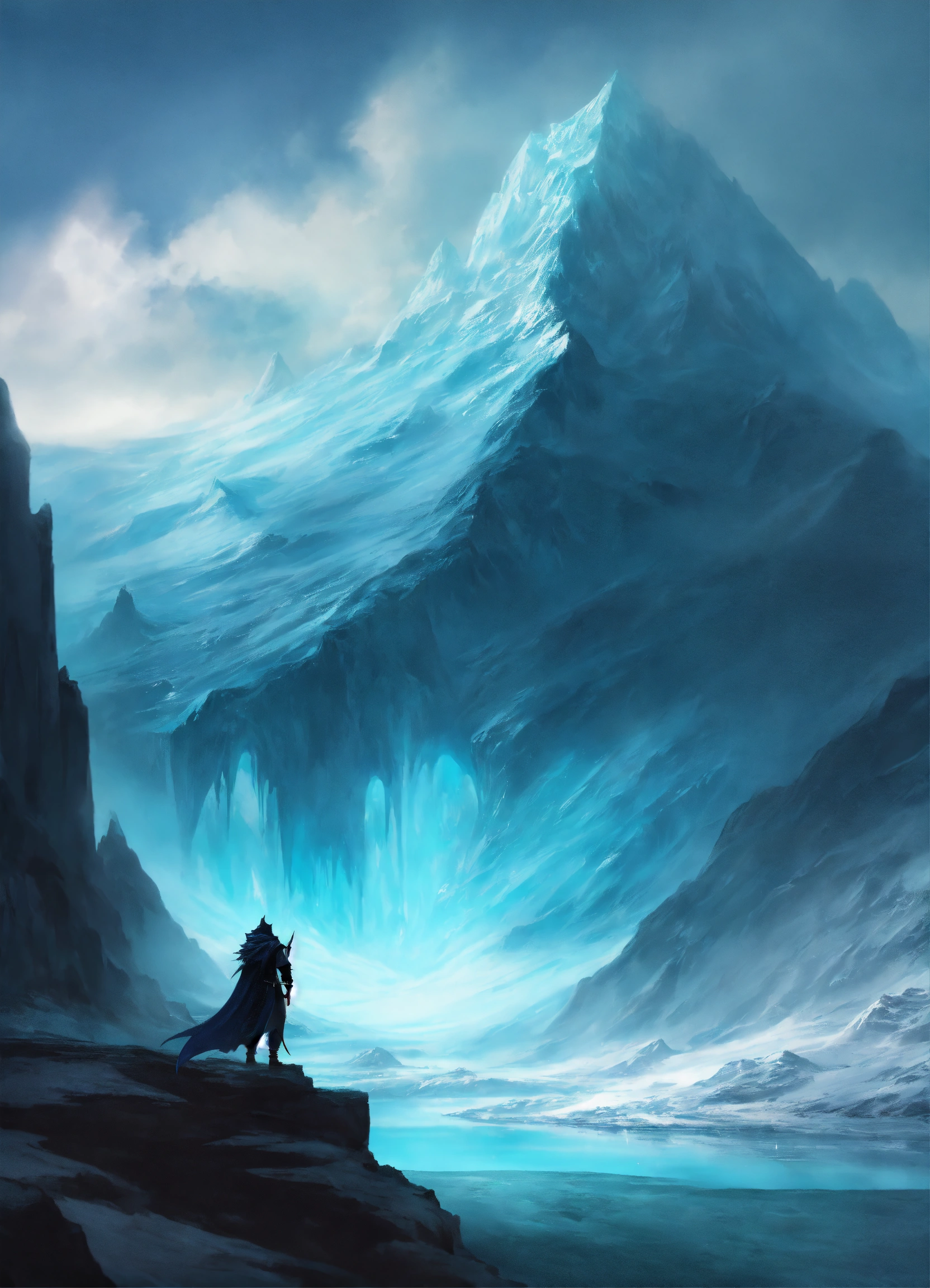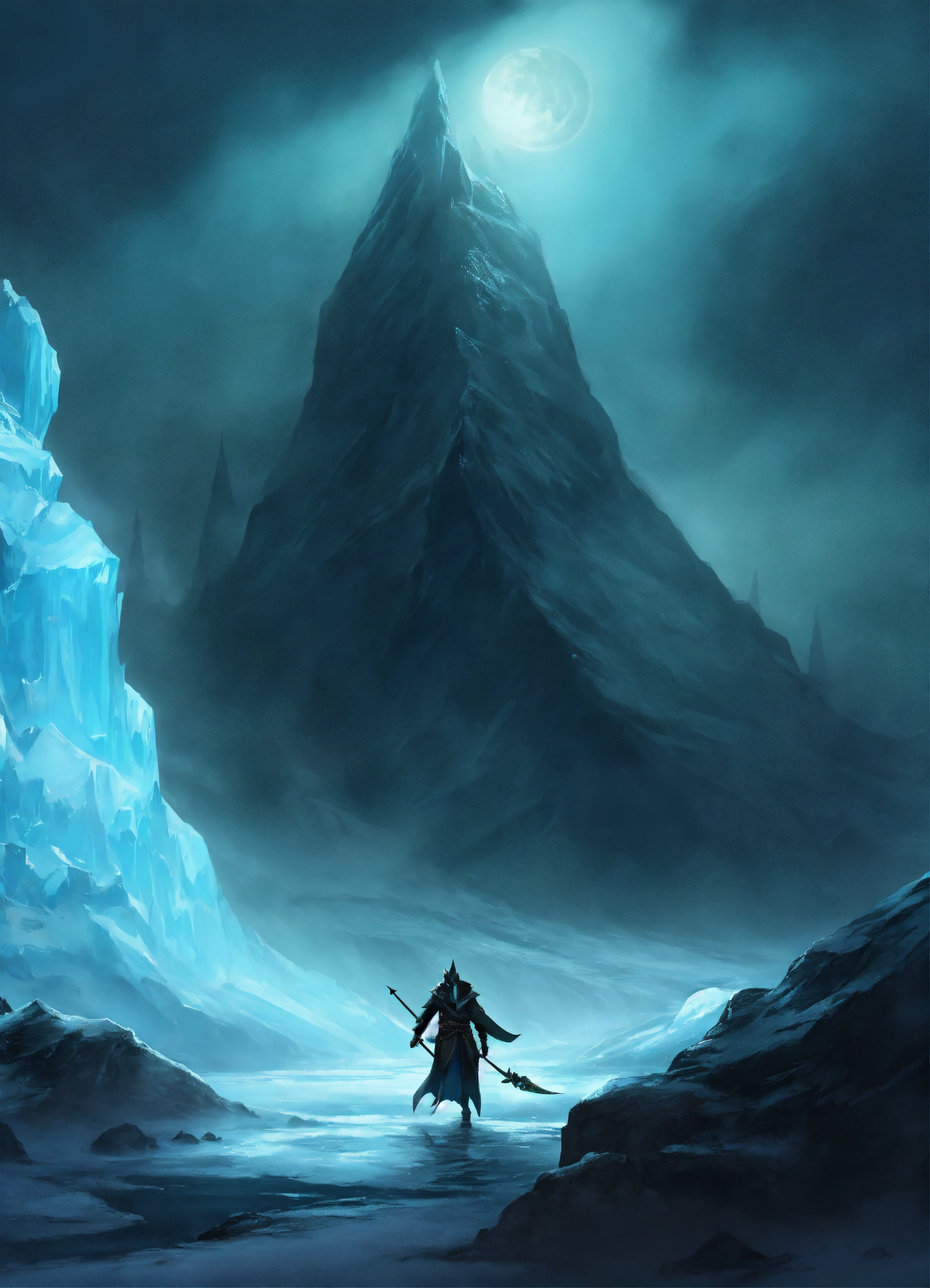 Shadow specter in chilling glacier, dnd, fantasy, sinister, distant view, evil fish, role playing, fantasy