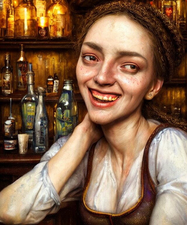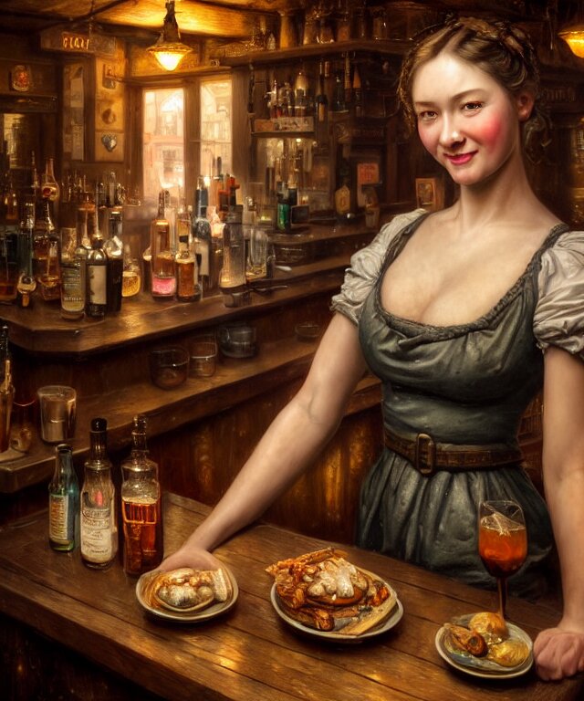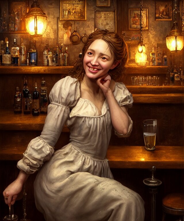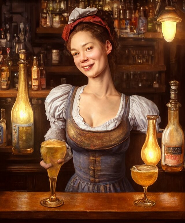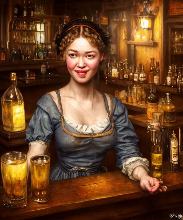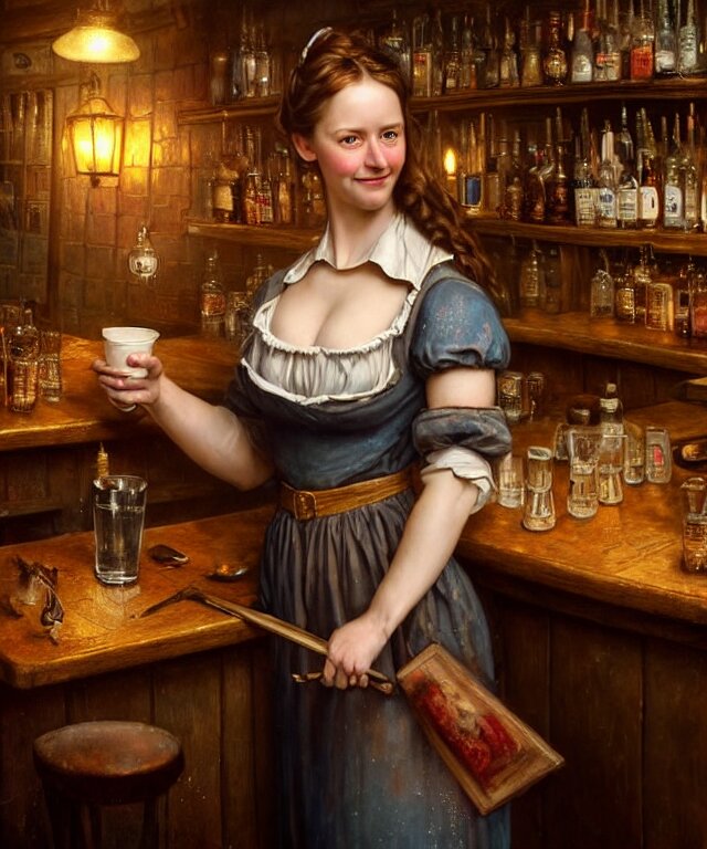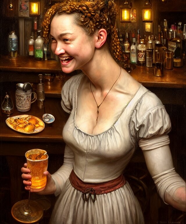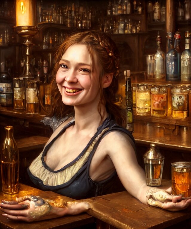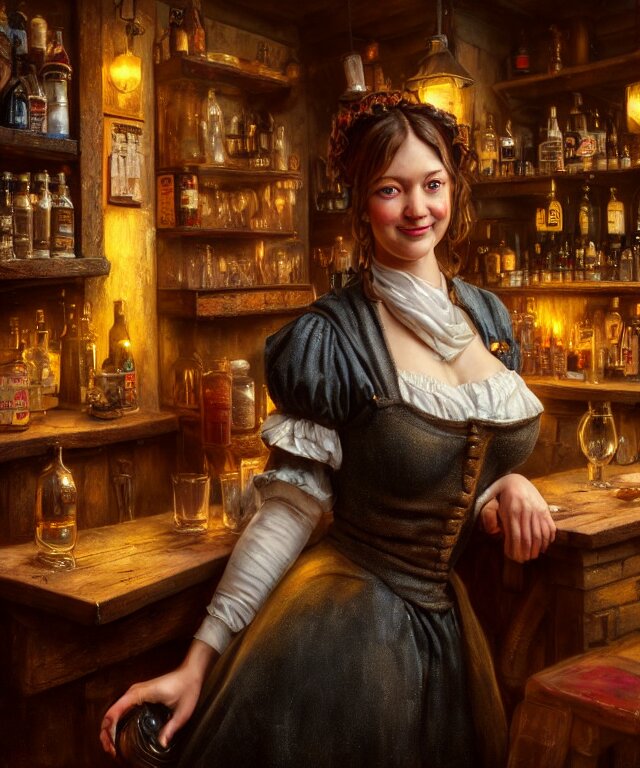 Hyperrealistic mixed media painting of a beautiful smiling charismatic barmaid, dimly lit cozy tavern, relaxed pose, medieval period, stunning 3d render inspired art by tim okamura + perfect facial symmetry + dim volumetric lighting, 8k octane beautifully detailed render, post-processing, extremely hyperdetailed, intricate, epic composition, grim yet sparkling atmosphere, cinematic lighting + masterpiece, trending on artstation, very very detailed, masterpiece, stunning, lifelike, photorealistic, art by john collier and albert aublet and krenz cushart and artem demura and alphonse mucha
