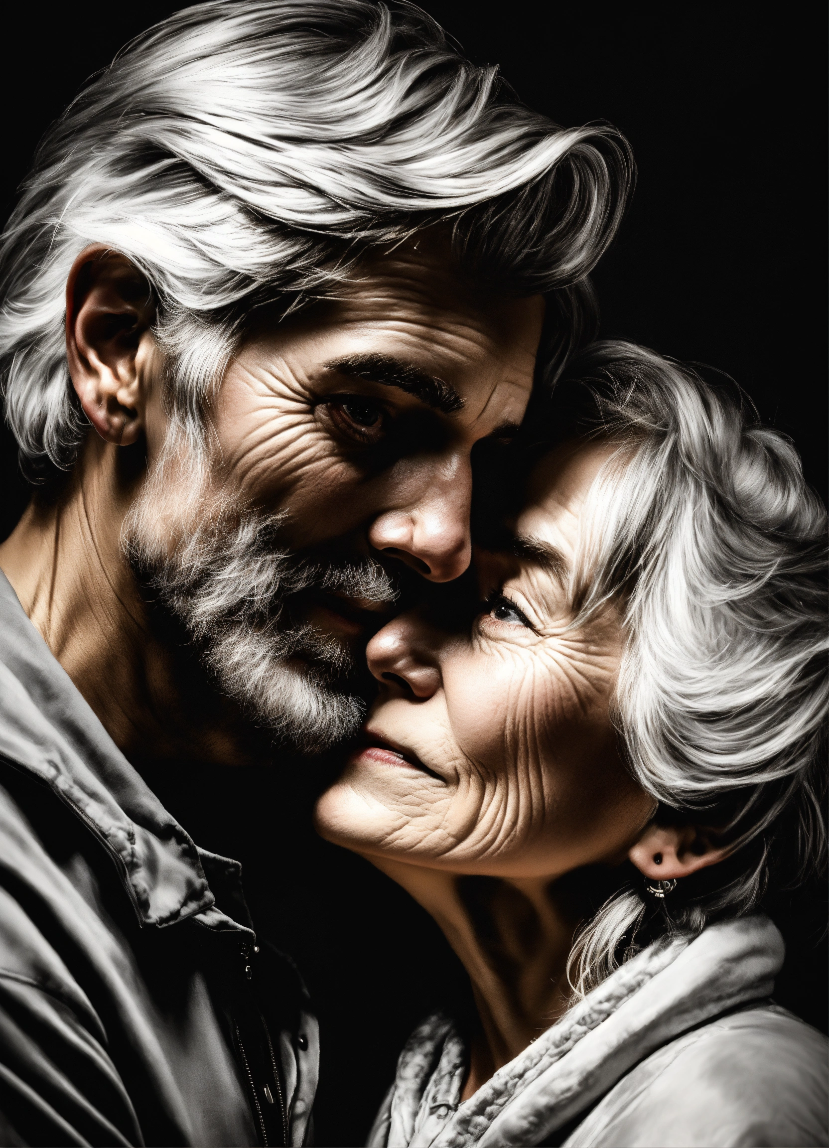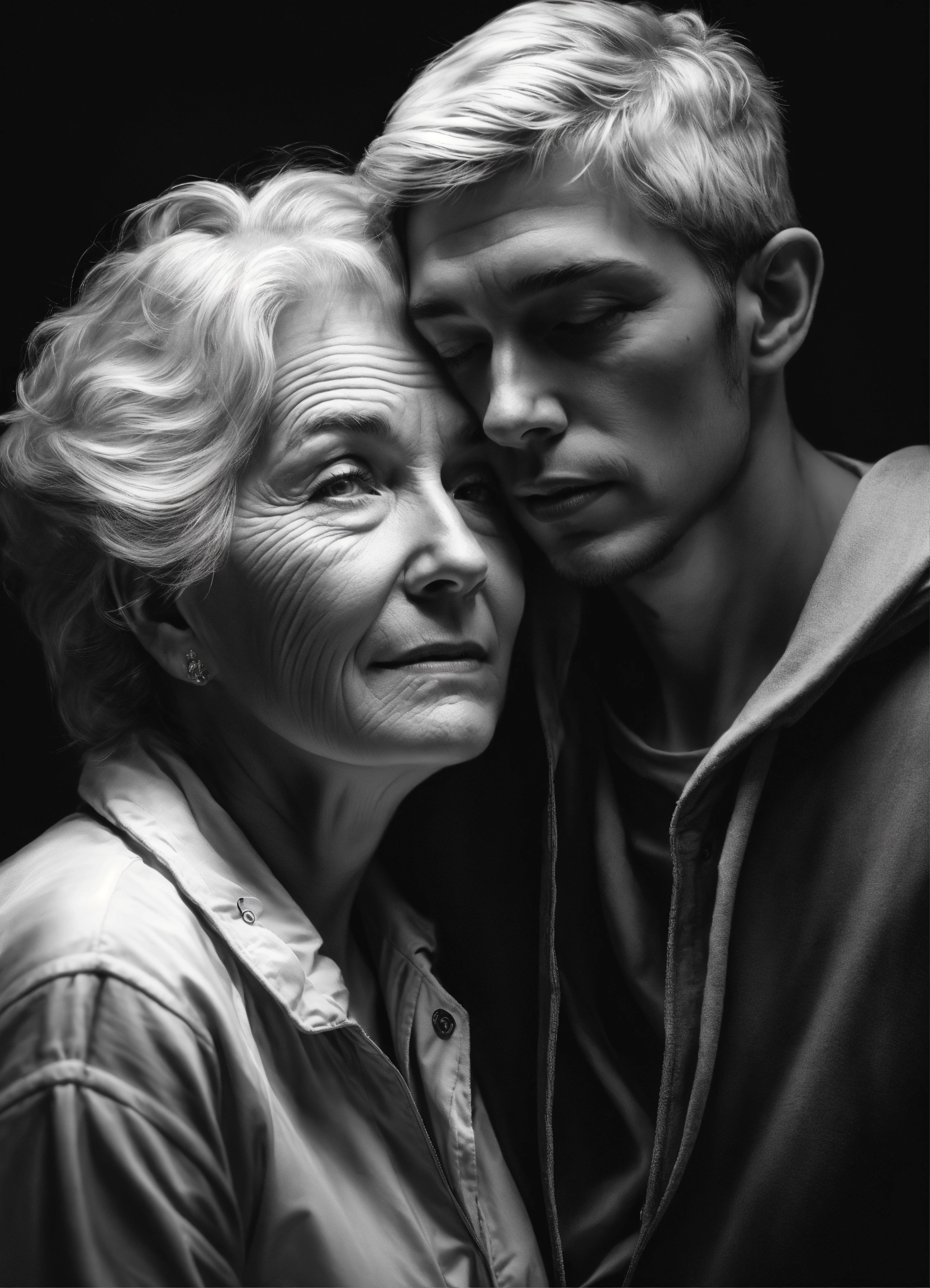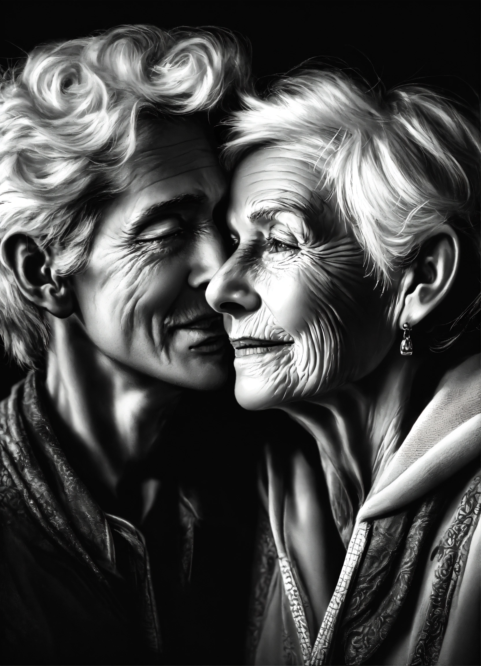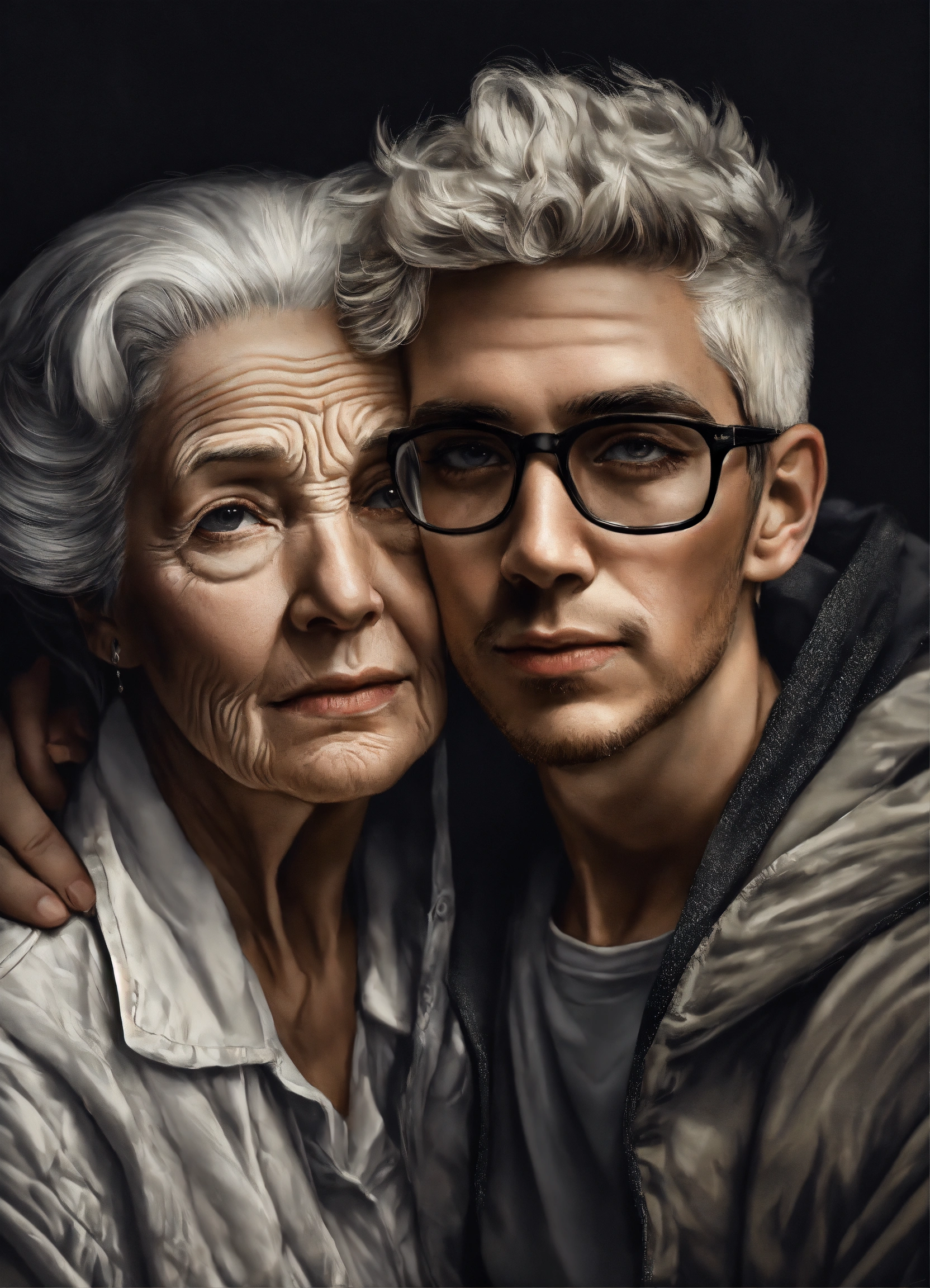 Pop art, hyperrealist portrait of white old woman and young man embracing, black and white painting, fantasy art, photo realistic, dynamic lighting, artstation, poster, volumetric lighting, very detailed faces, 4 k, award winning