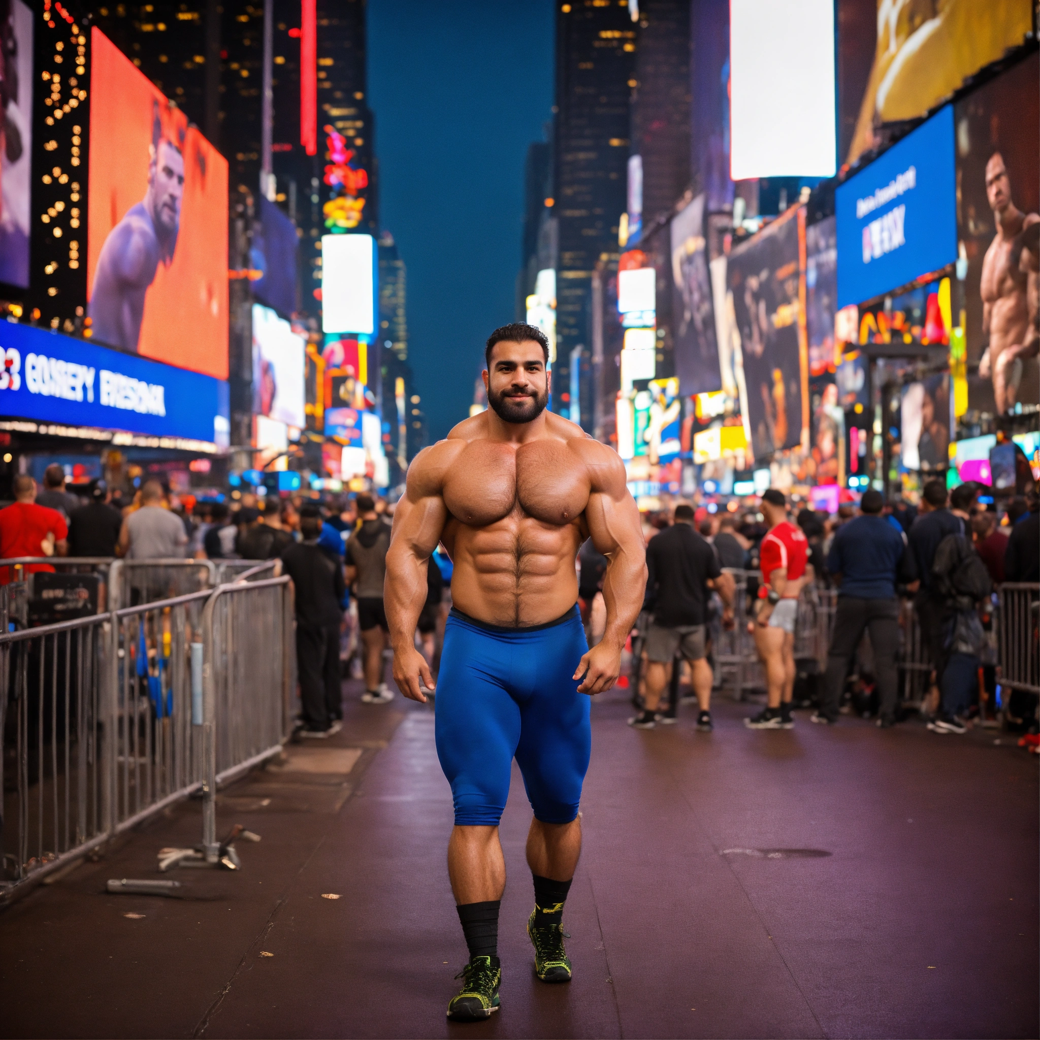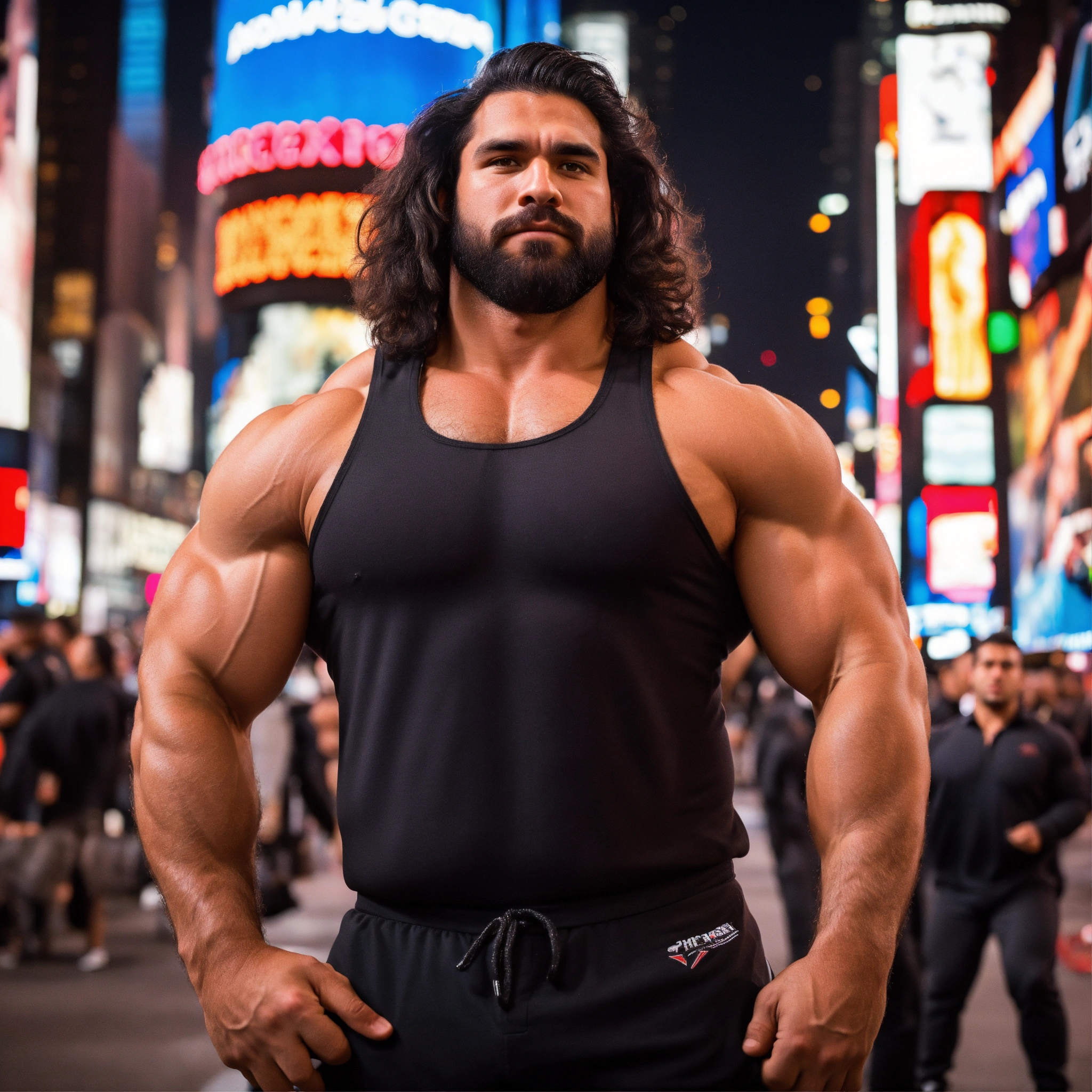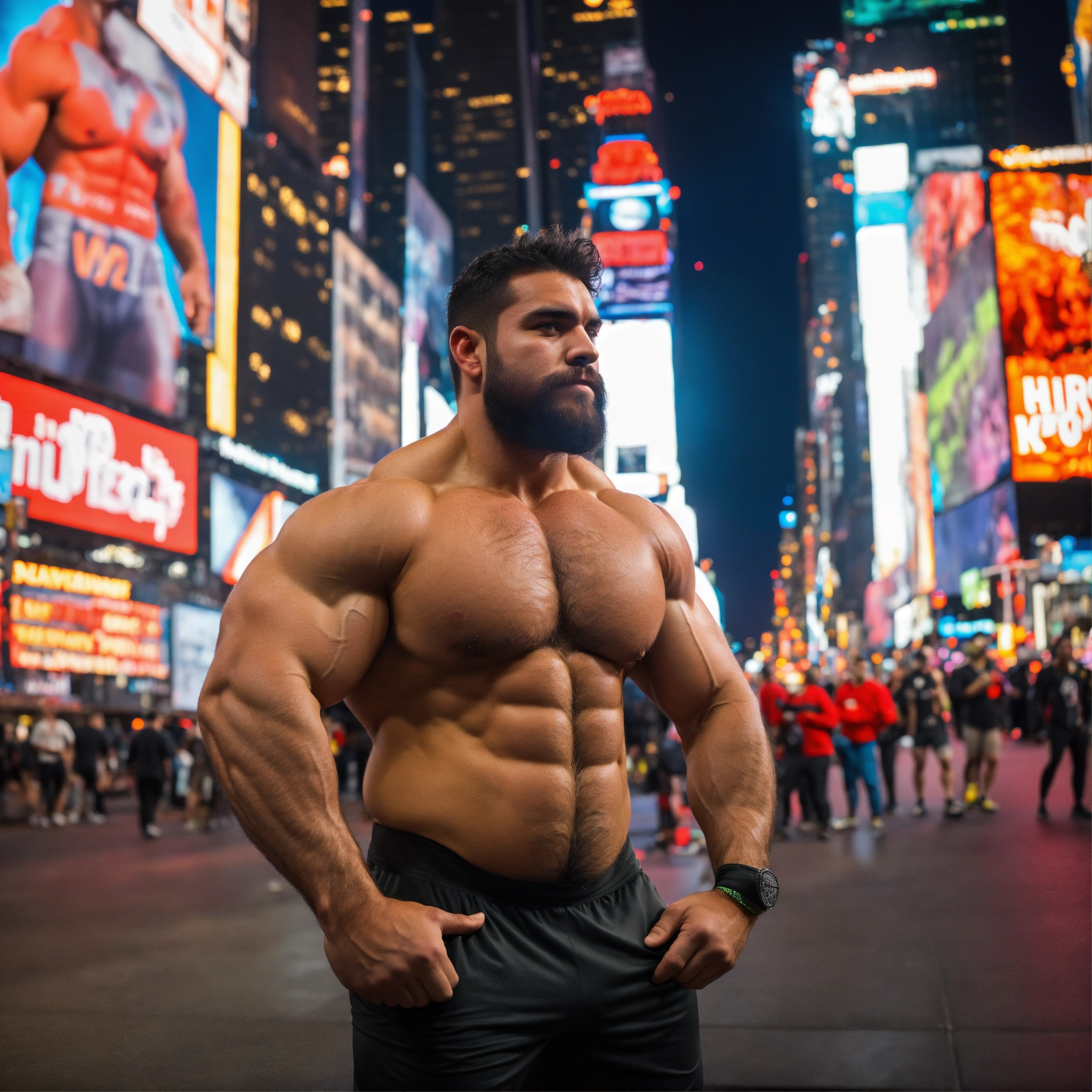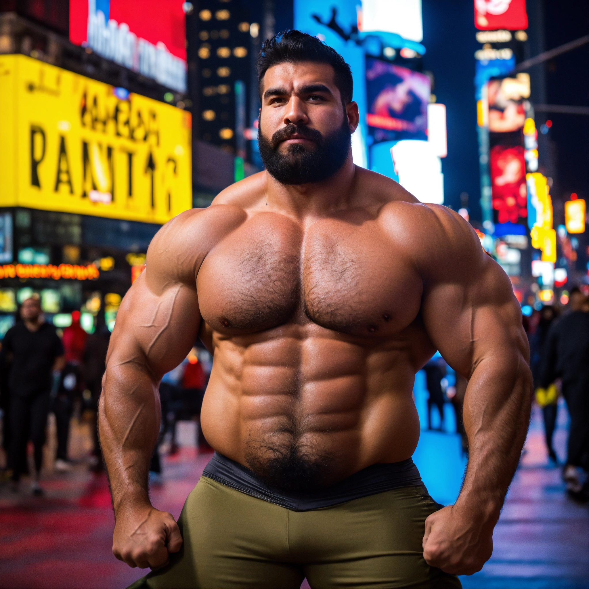 30-year-old hairy chilean man with big muscles, big bodybuilder, body like a wrestler, in times square at night