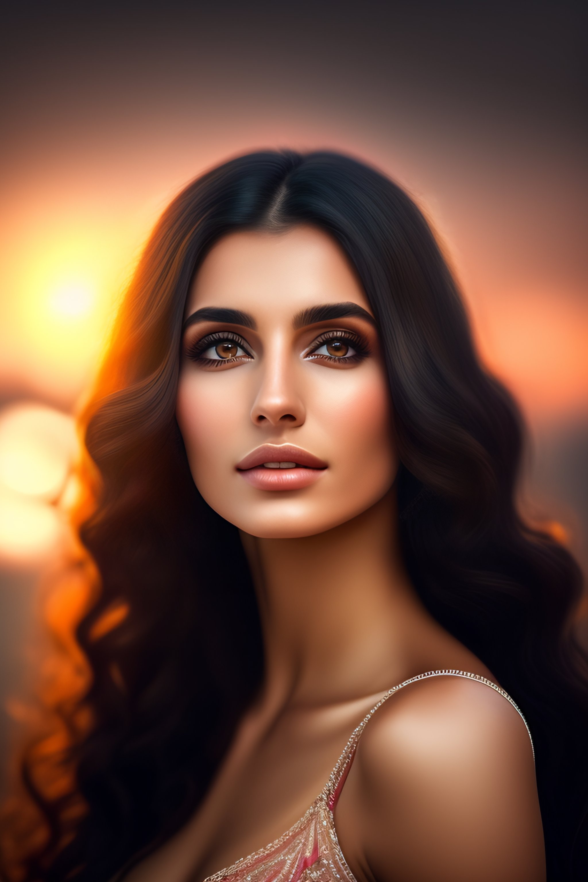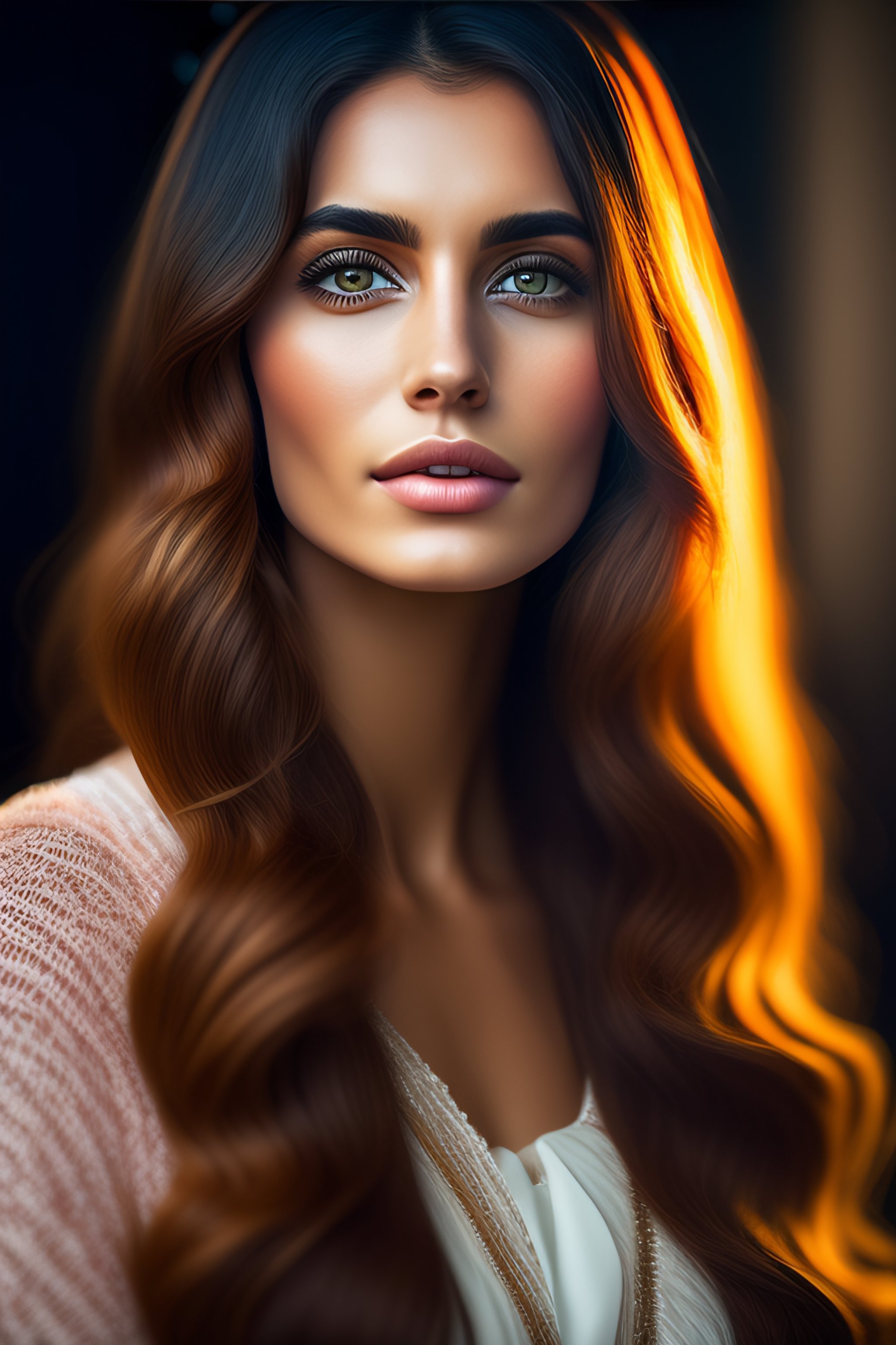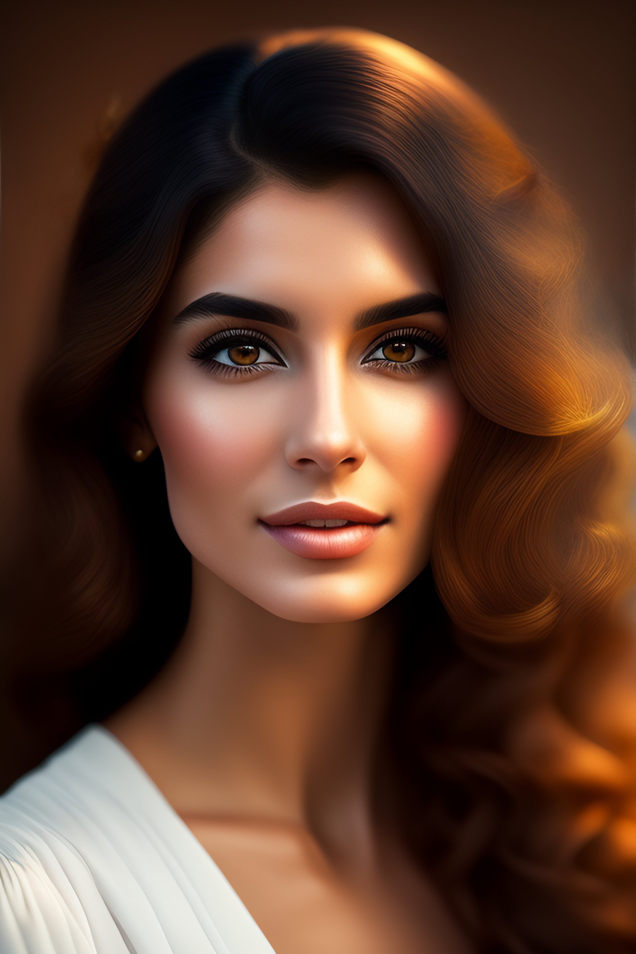 Woman, round straight nose, wavy long hair, round big eyes, round face, small thick lips, soft jawline, armenia