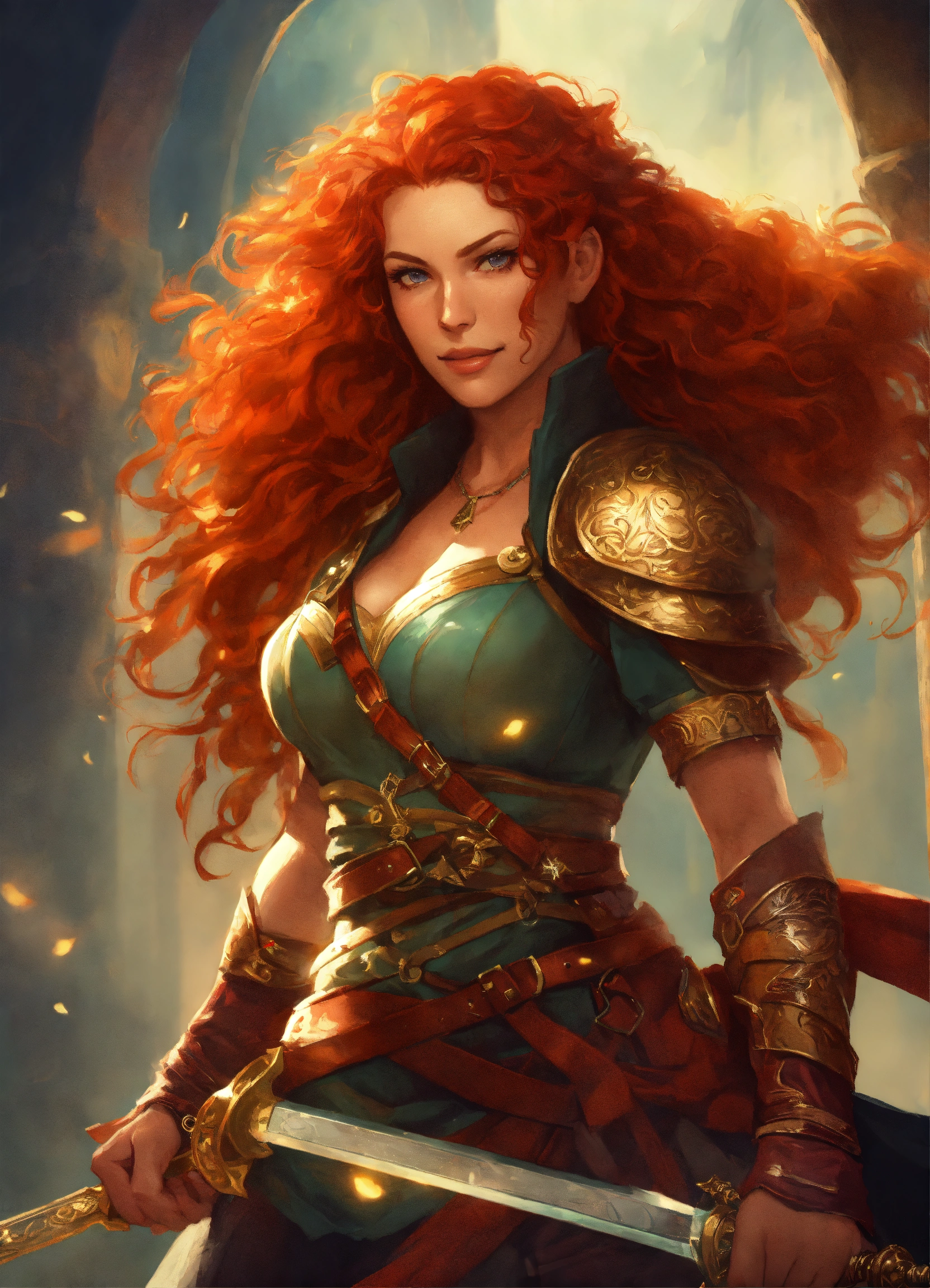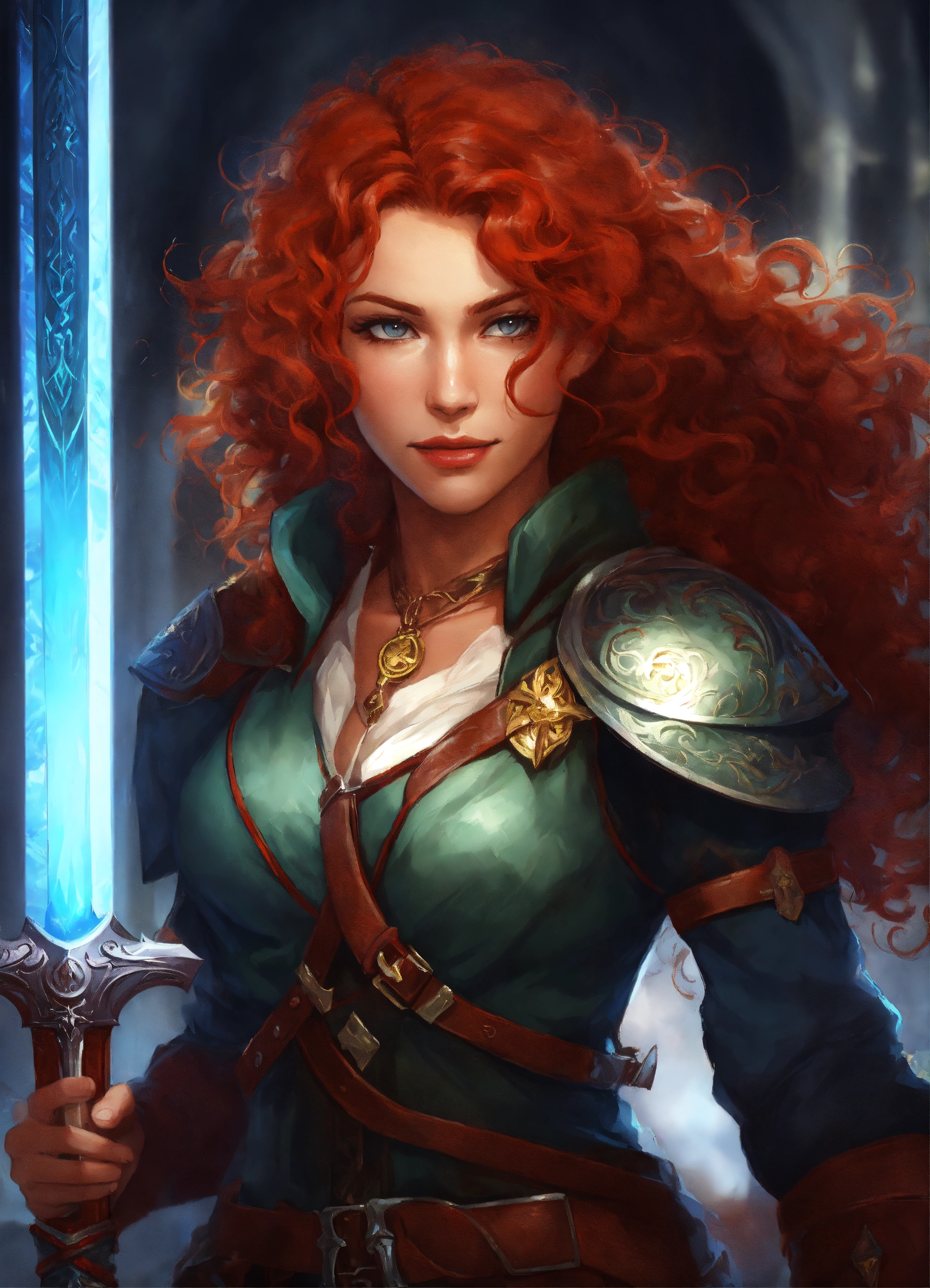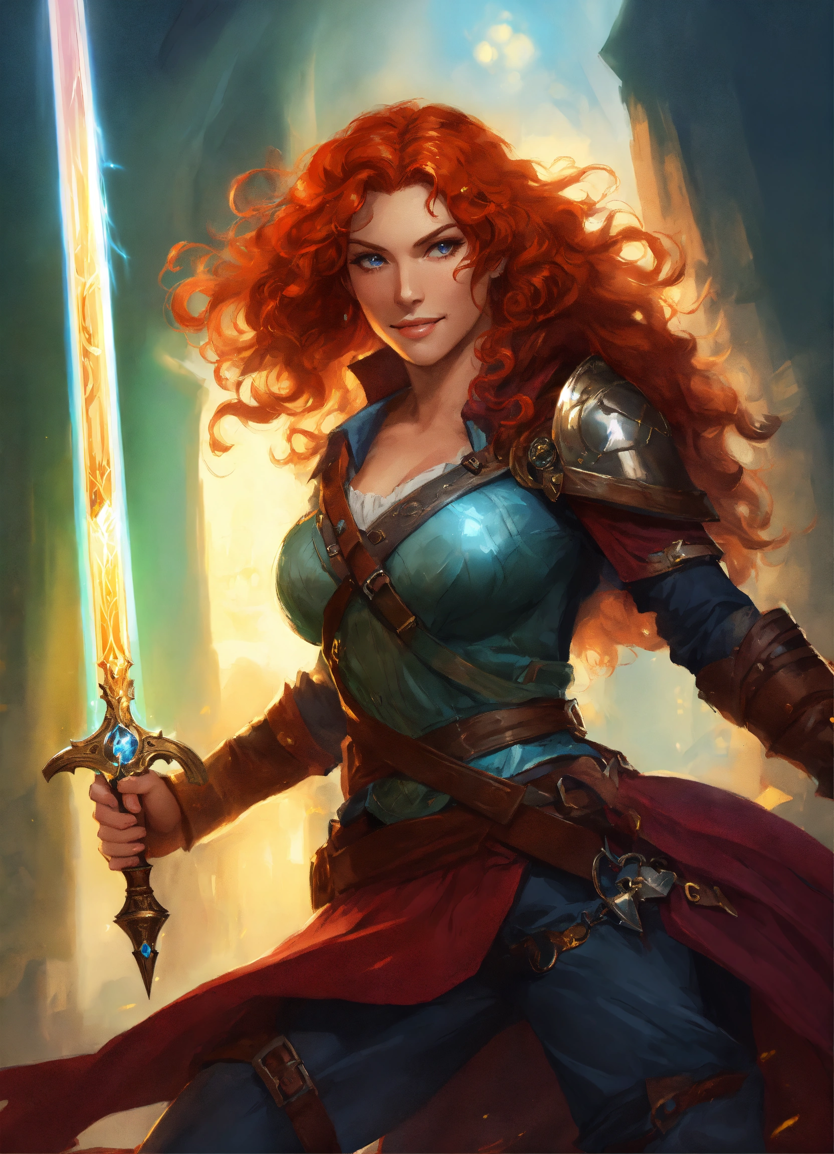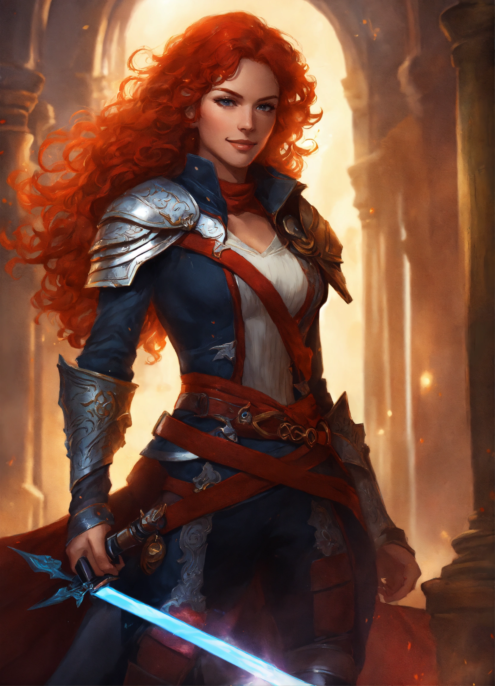 "legendary fantasy heroine wielding energy sword", curly red hair, smirk, adventurer, historical, fantasy art, concept art