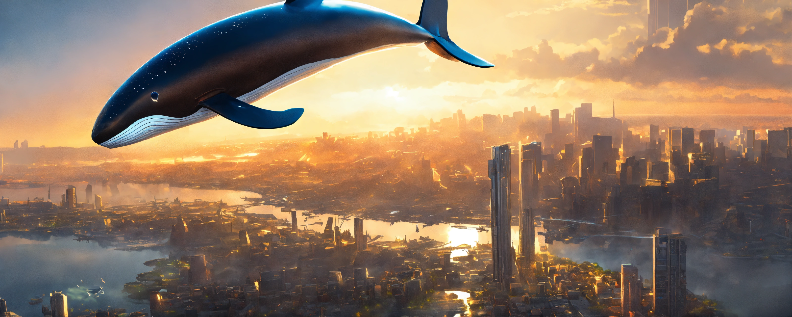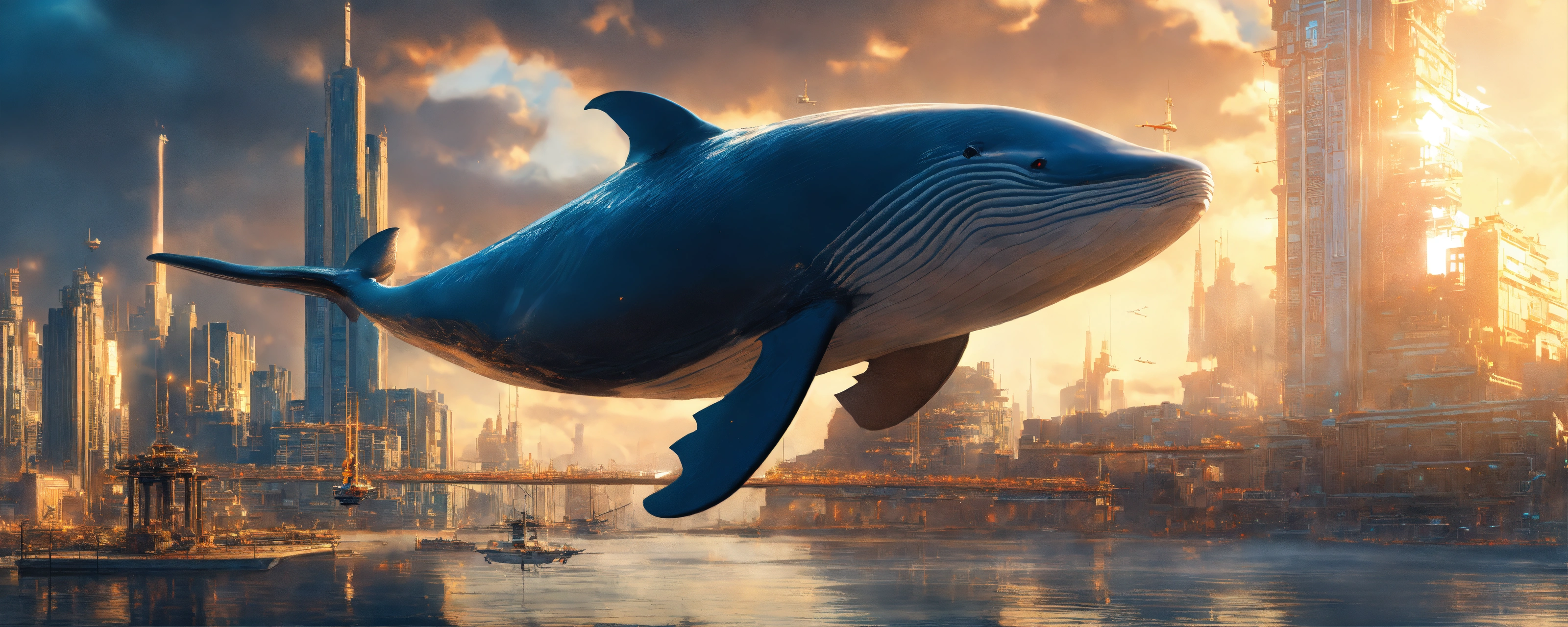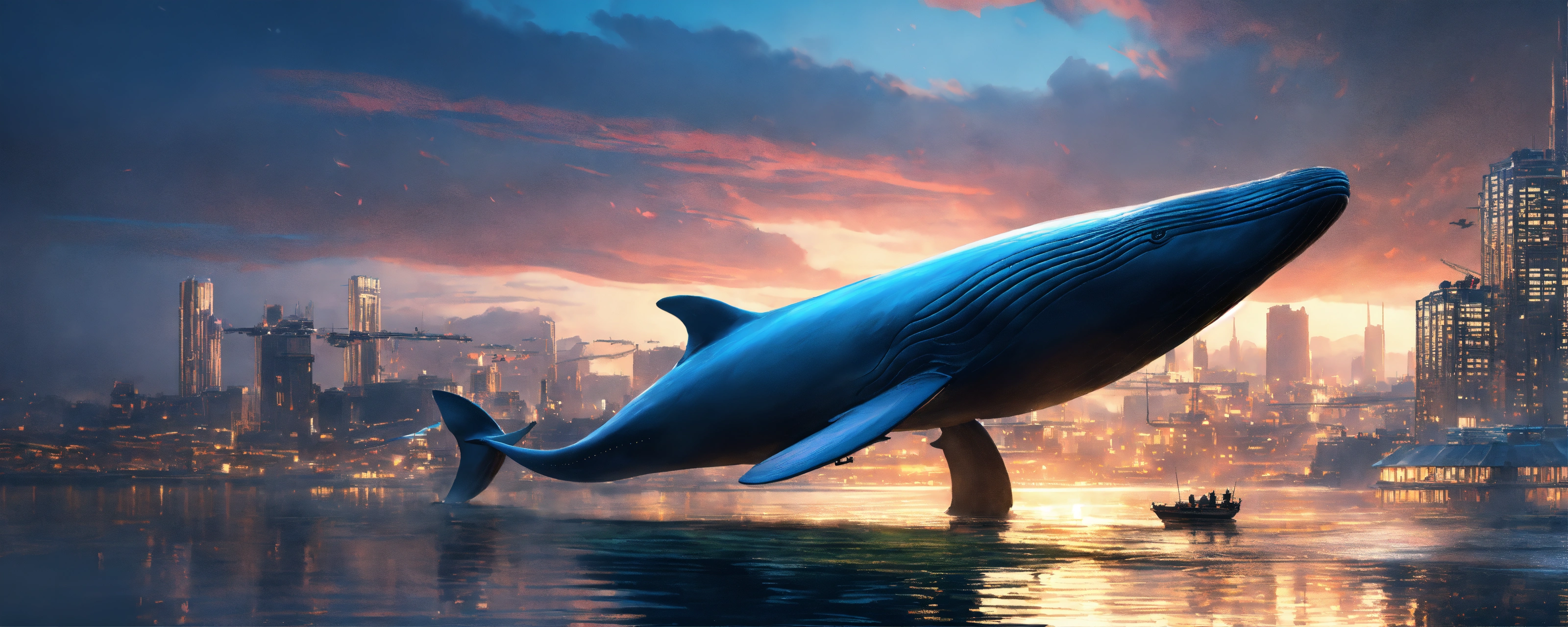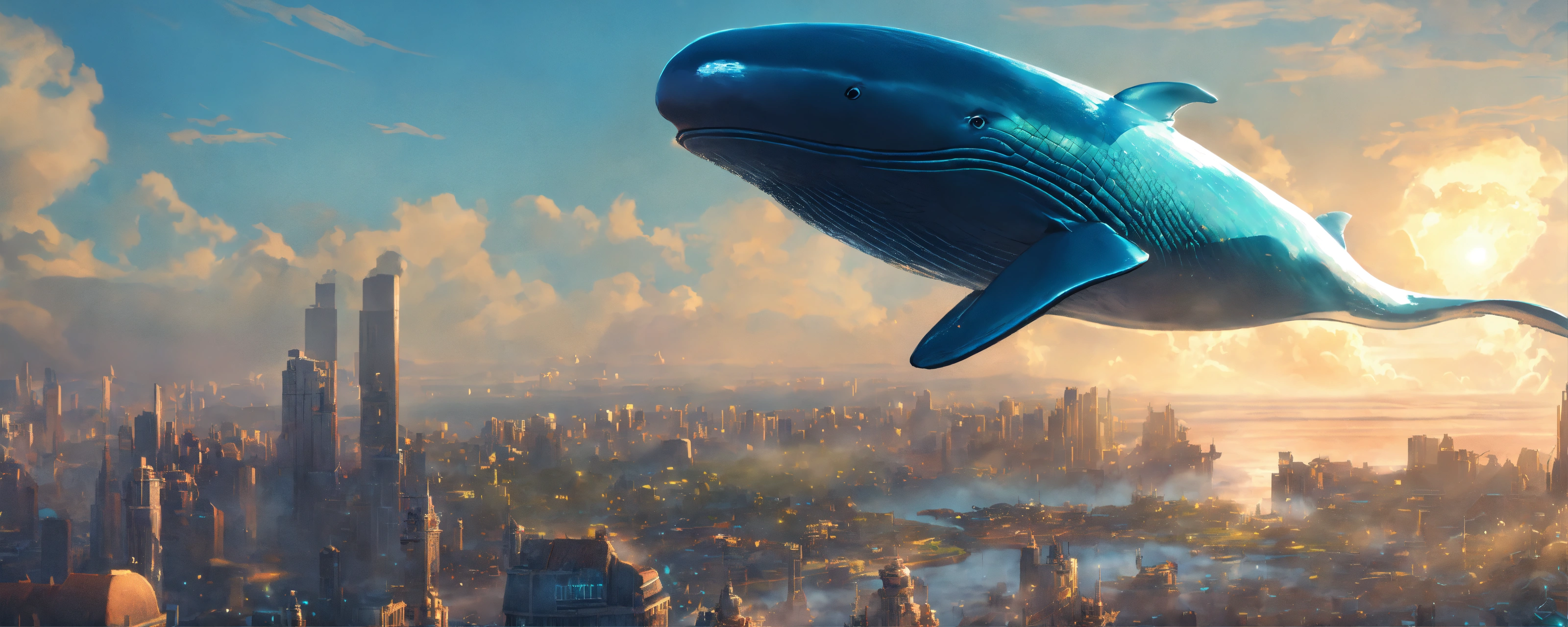 Flying whale, light, shadows, rippling reflections, steam, epic composition, intricate, elegant, volumetric lighting, digital painting, highly detailed, artstation, sharp focus, illustration, concept art, photorealistic, rtx, ray-traced, futuristic city background