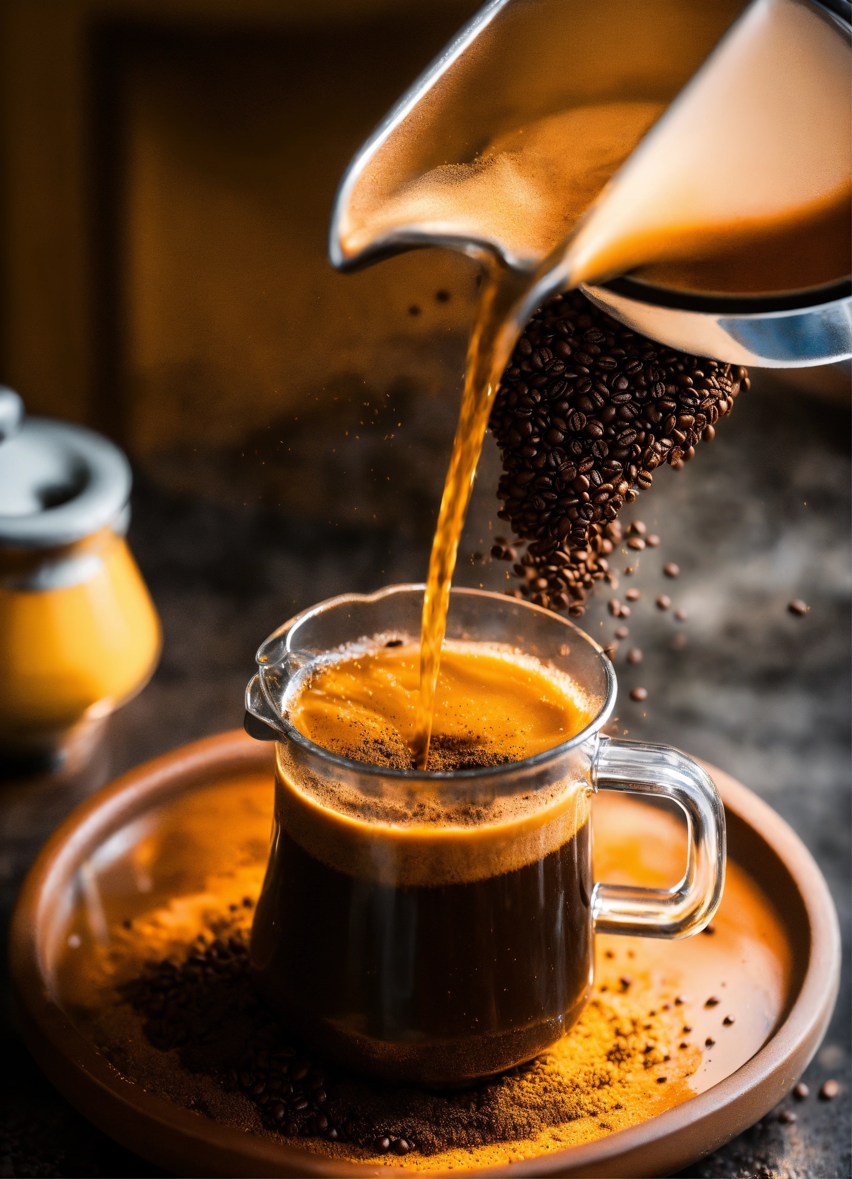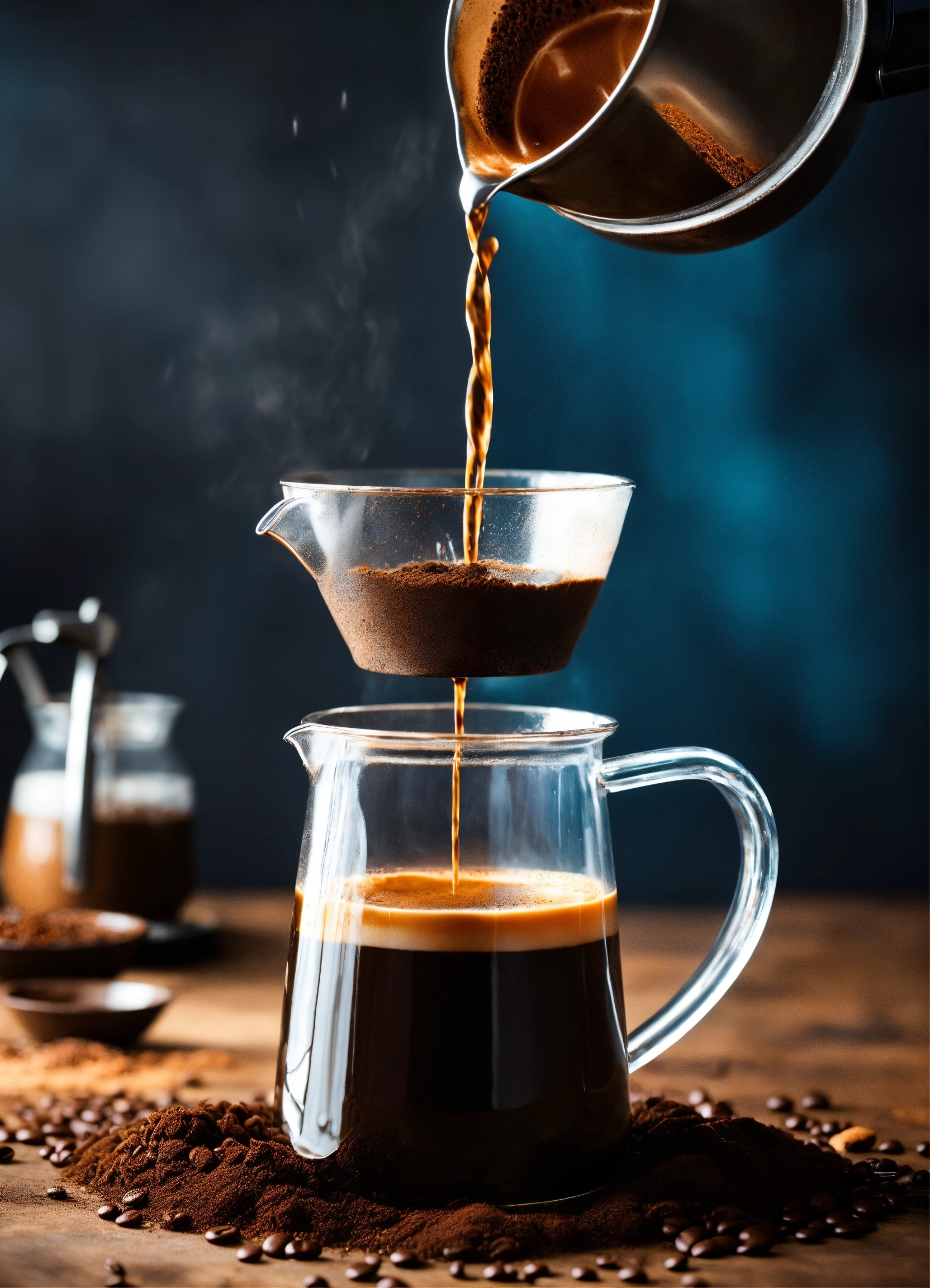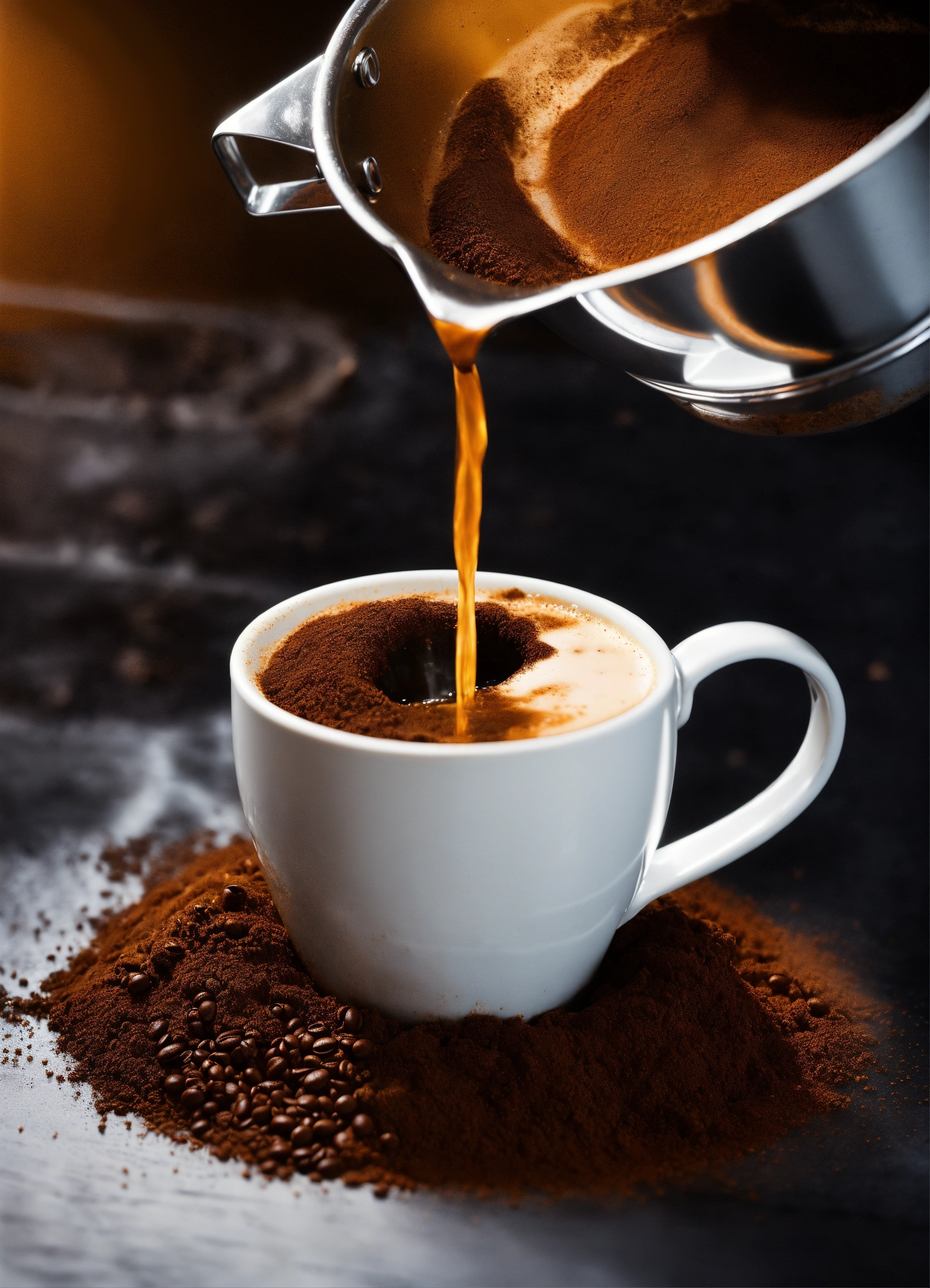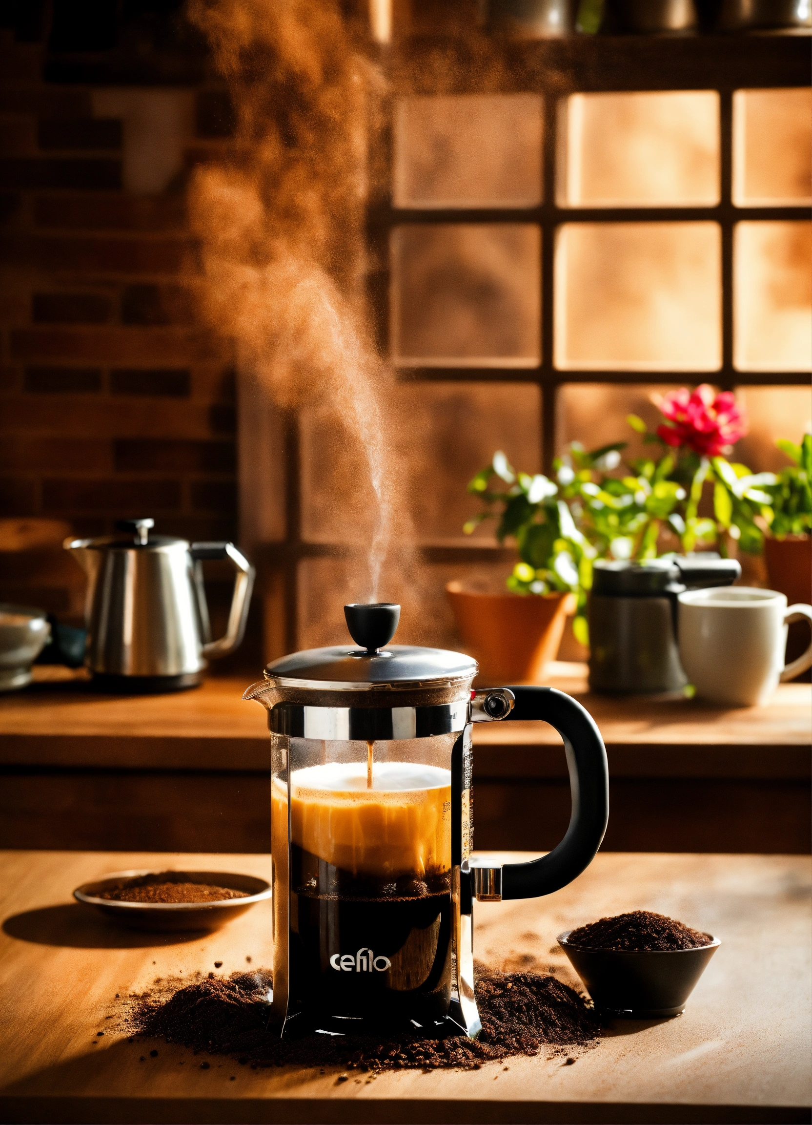 Generate an image of hot water in a kettle being poured over the coffee grounds in the french press, show the saturation of the coffee grounds
