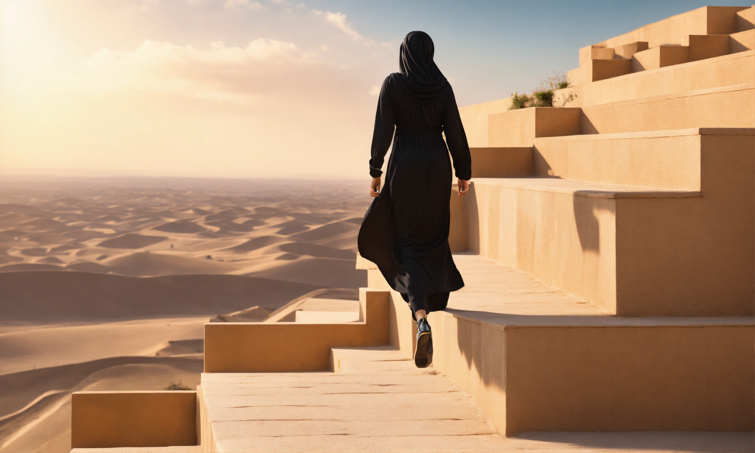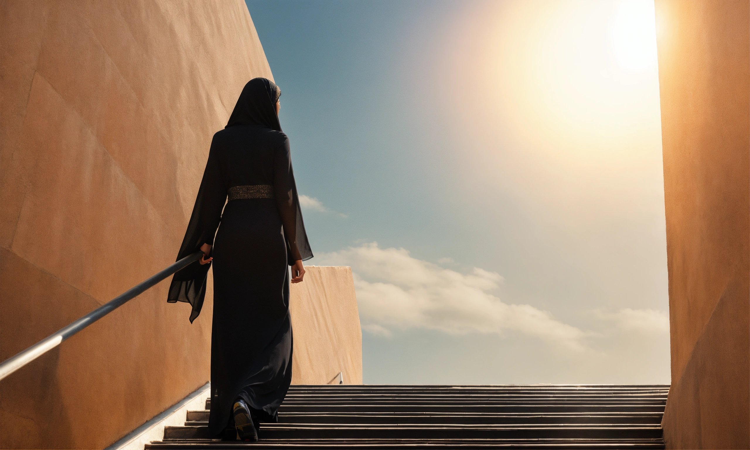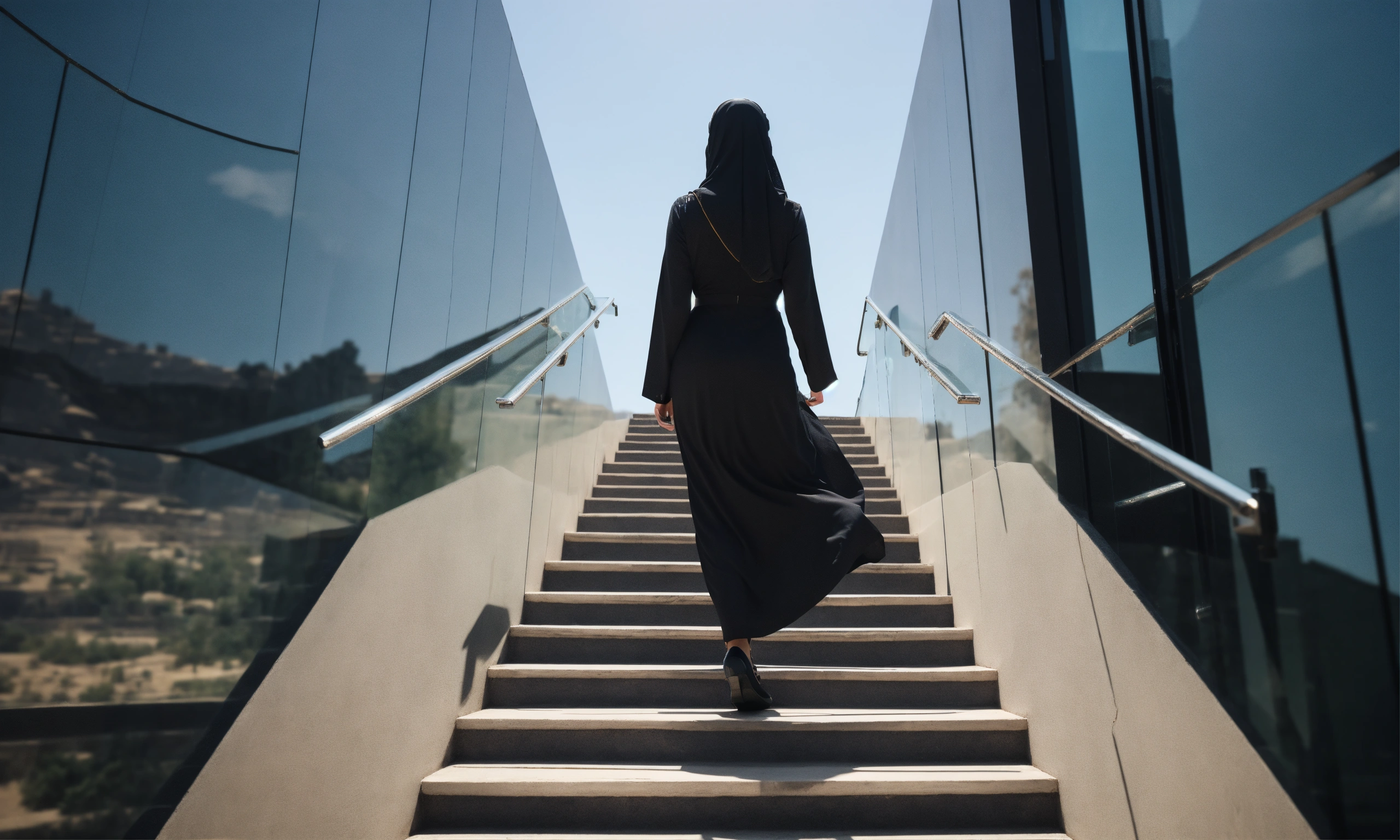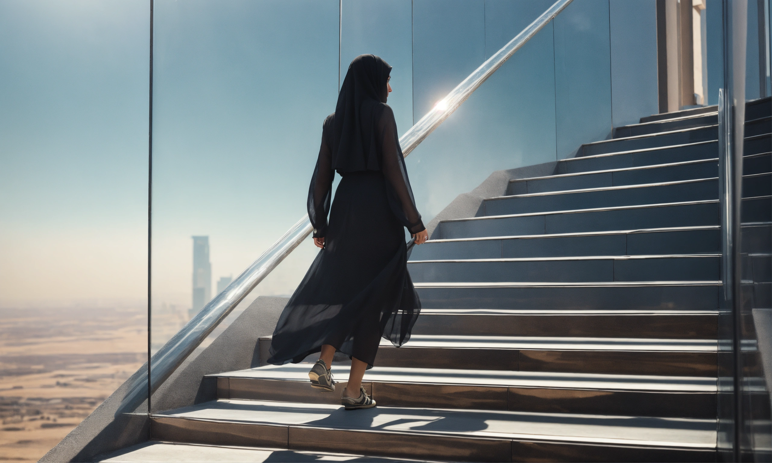Saudi woman climbing six steps only, walking upward, side-way, close up, glass, black dress, modern, sky, horizon, natural light, warm, photo-realistic, 8k, high definition