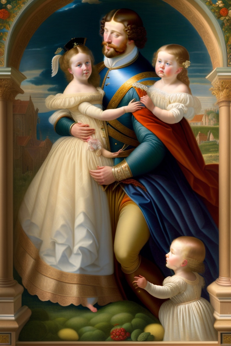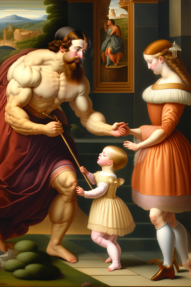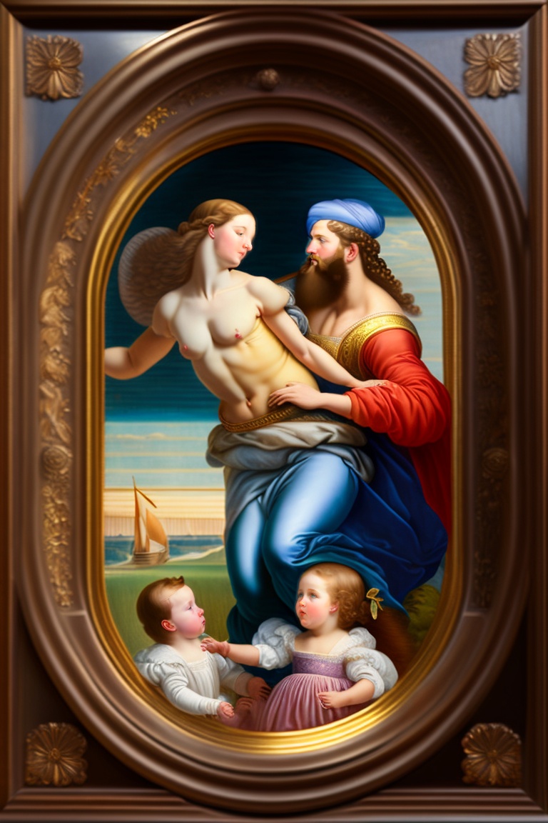 A renaissance painting depicting a full body man lifting an arm, a woman, a child, and a baby, engaging in interactive scenes while displaying the deep.
