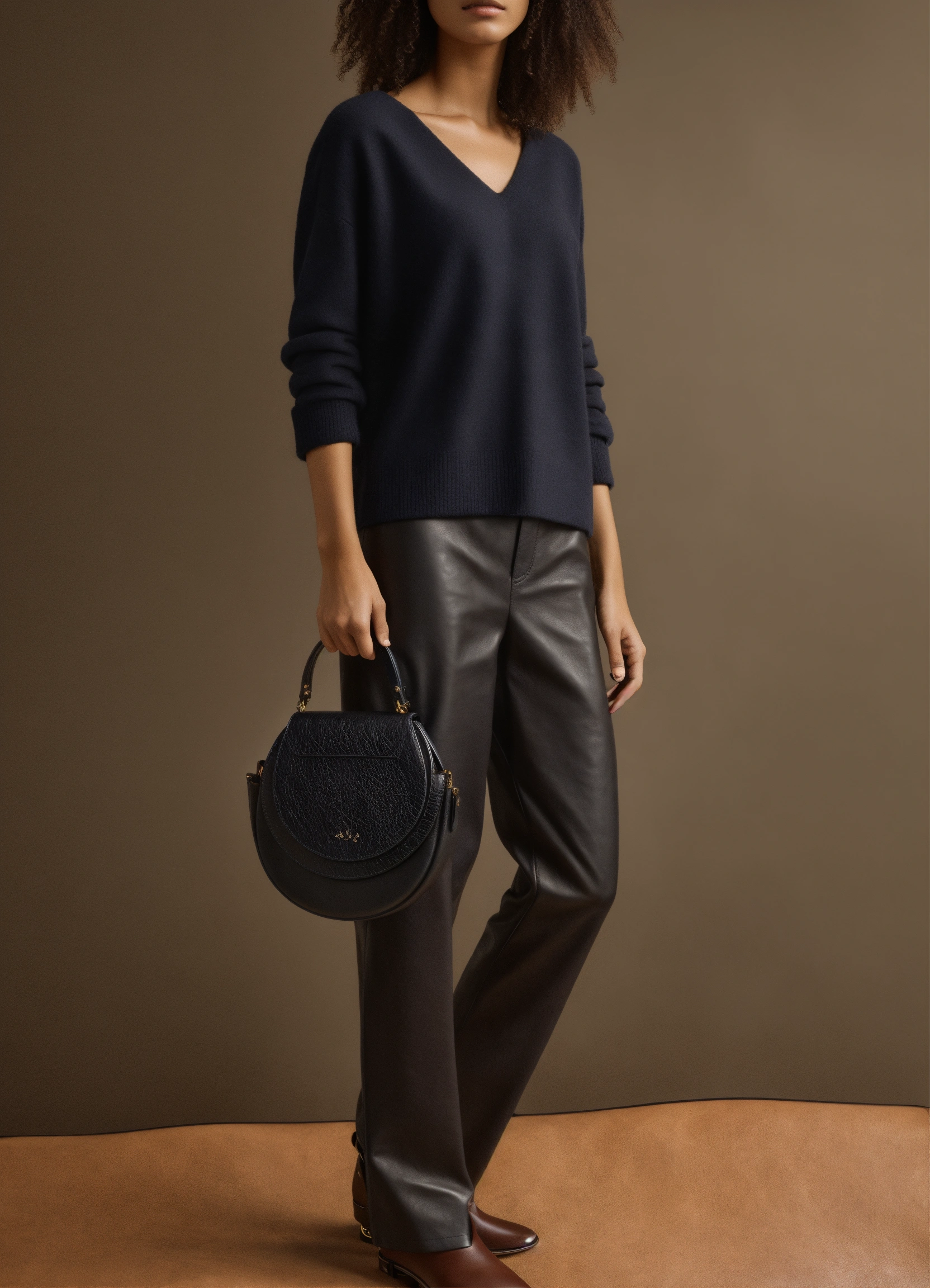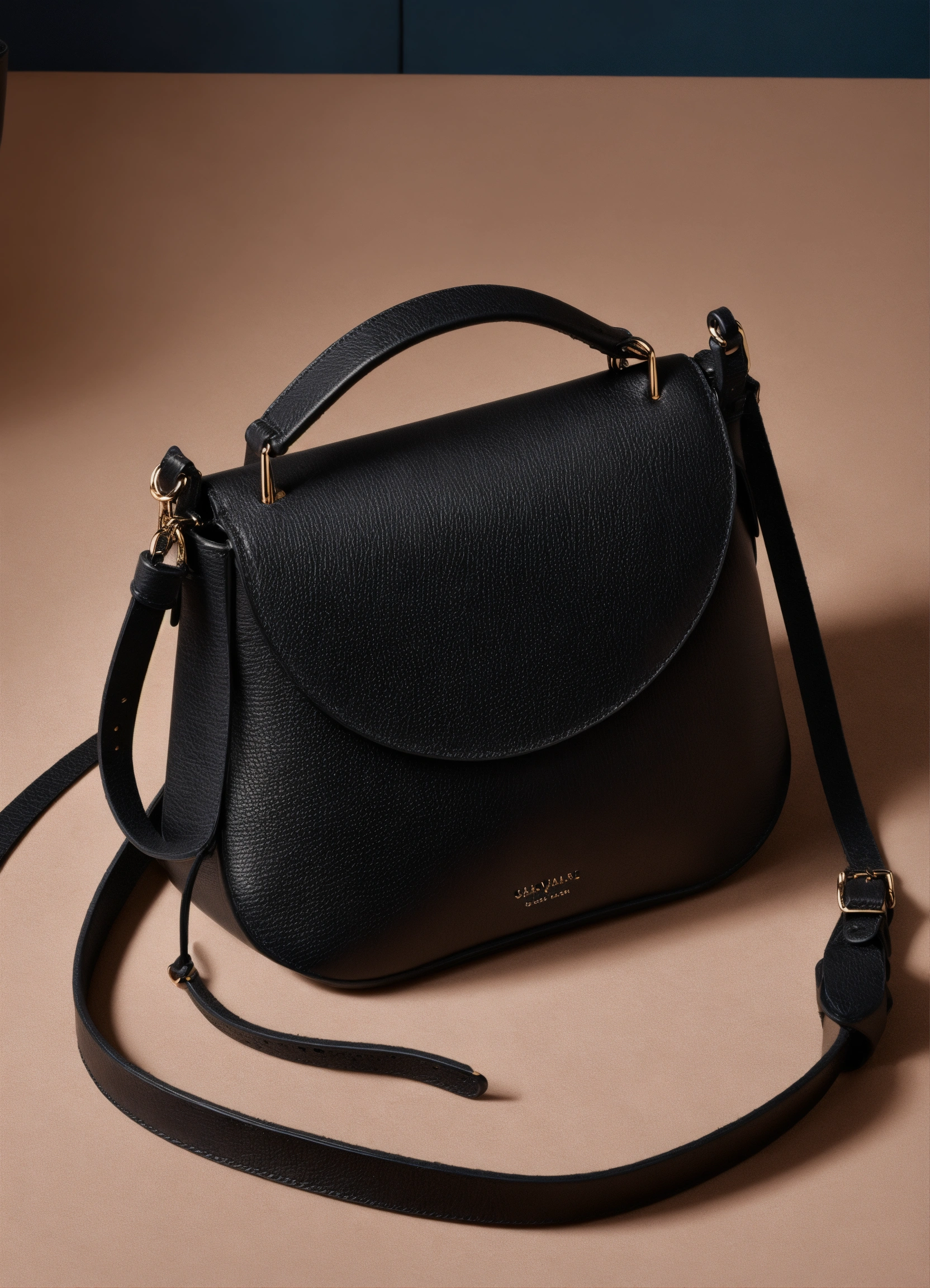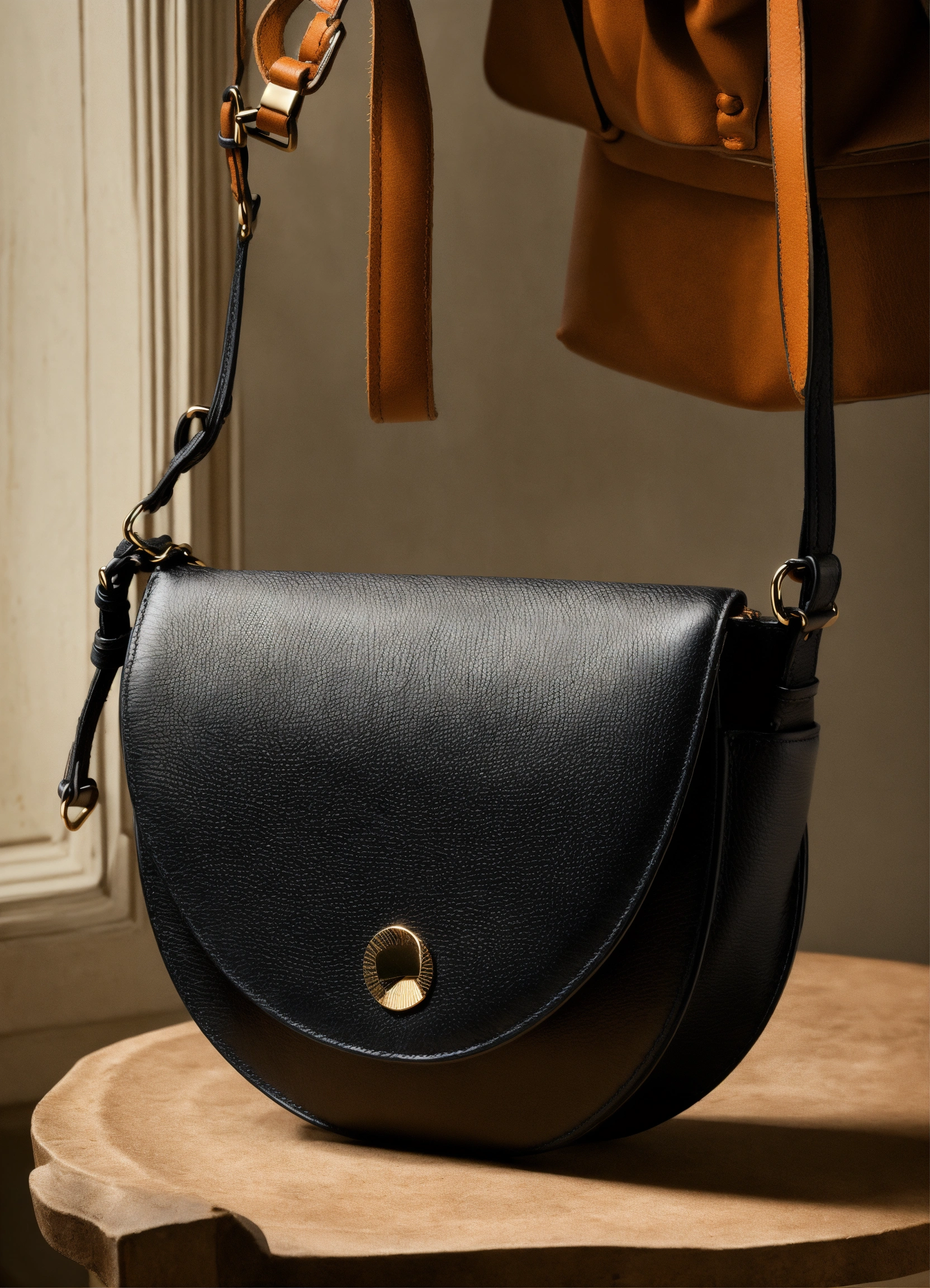 well-designed half-moon shaped black-grain leather bag with an integrated strap.