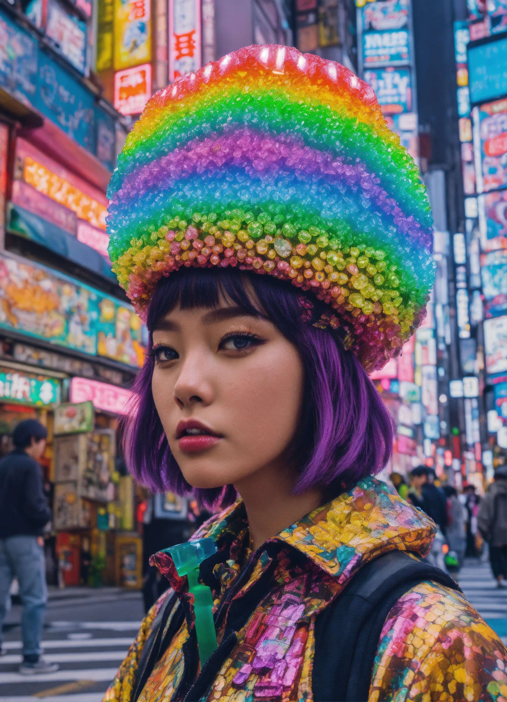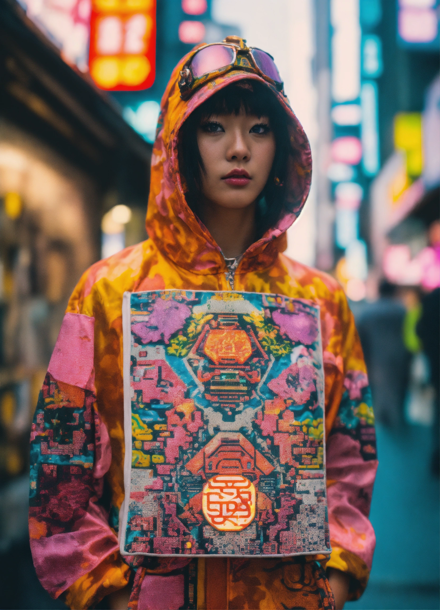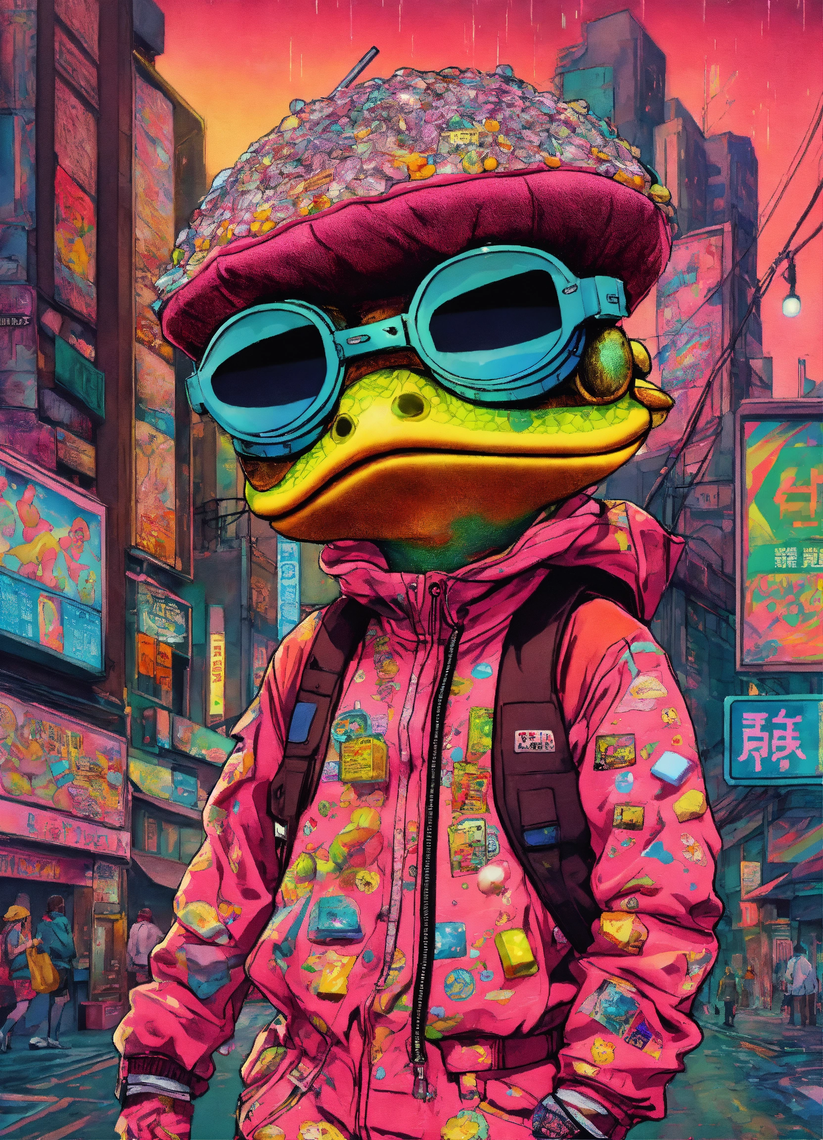 Photorealistic tokyo street fashion shoot of toad bong crystals as a samuri qr code weed pattern psychedelic dmt mayan cyber punk toad outfit post apocalypse slice of life anime with eth cryptocurrency in a 1980 vapor wave in a akira comic book