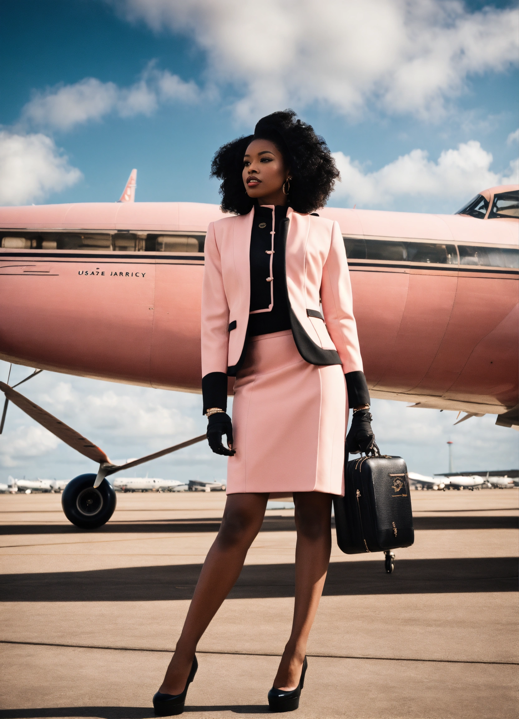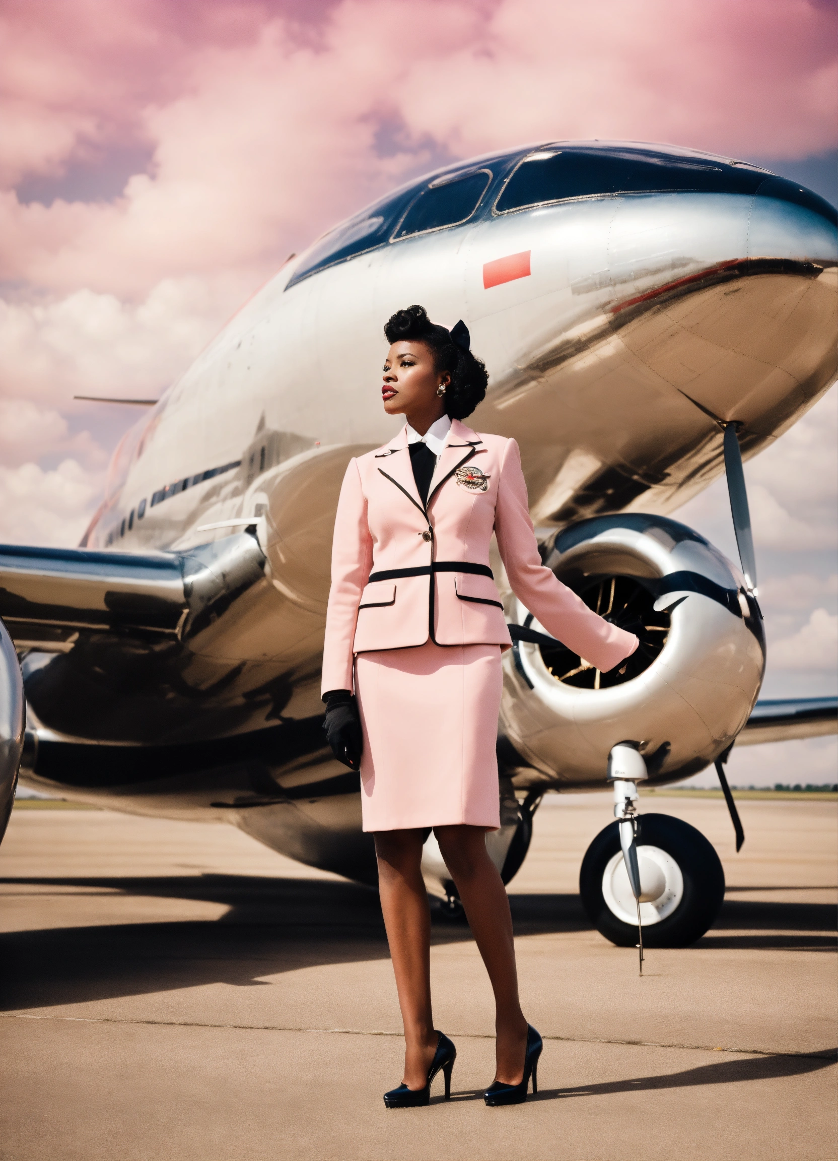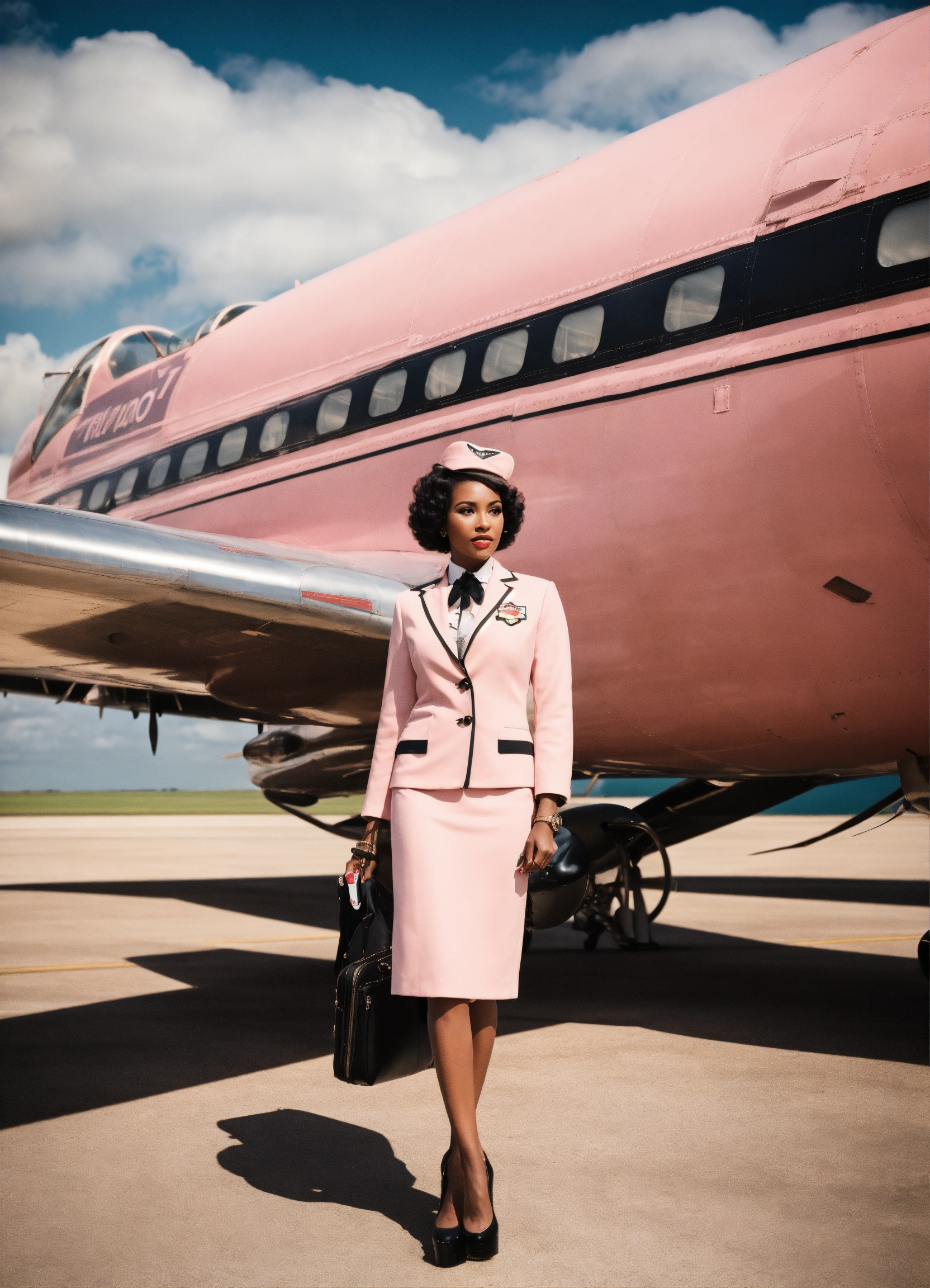 Reate a visually stunning scene featuring an african-american flight attendant in a chic light pink and black ensemble with a structured jacket, platform shoes, and a retro airline logo, iso 400, surrealistic, 8k, full frame, landscape, vintage airplane hangar, classic aircraft, "retro skies" in elegant script.