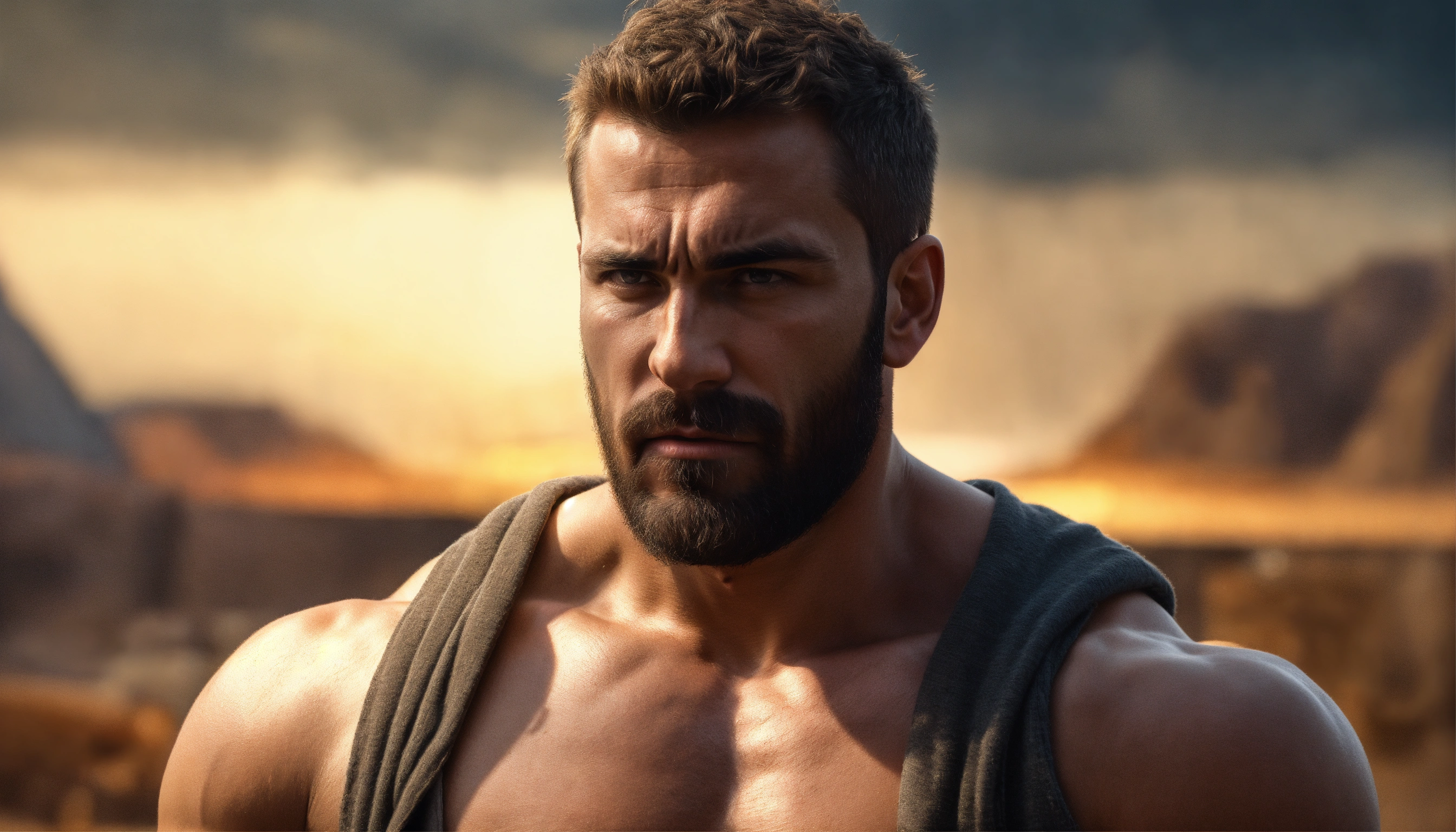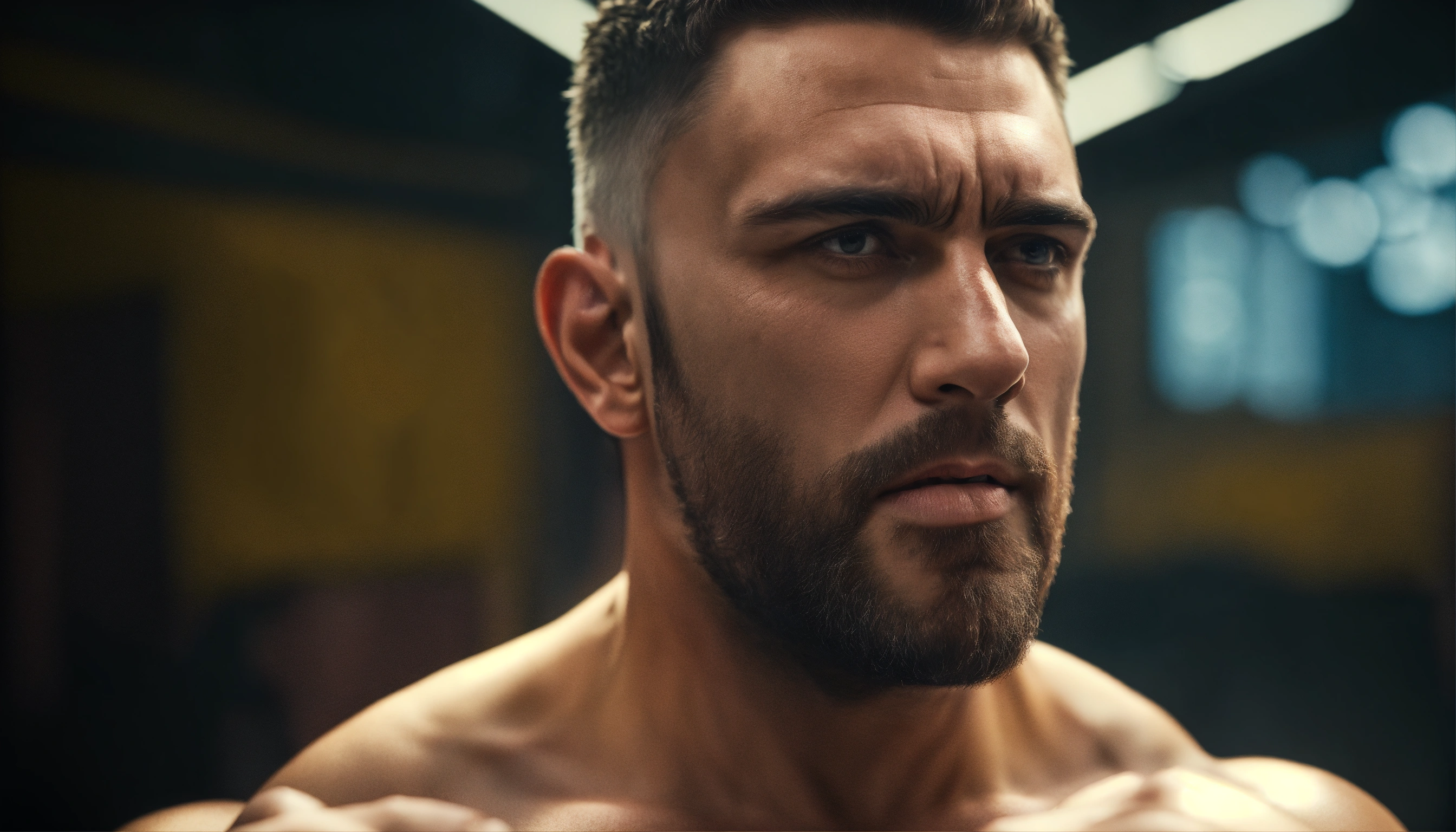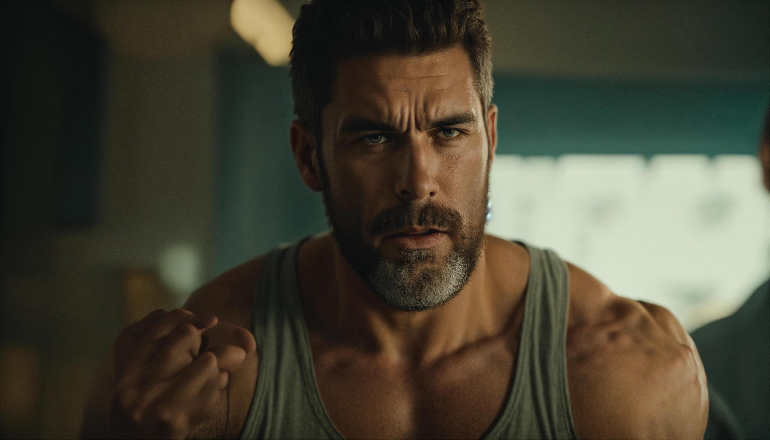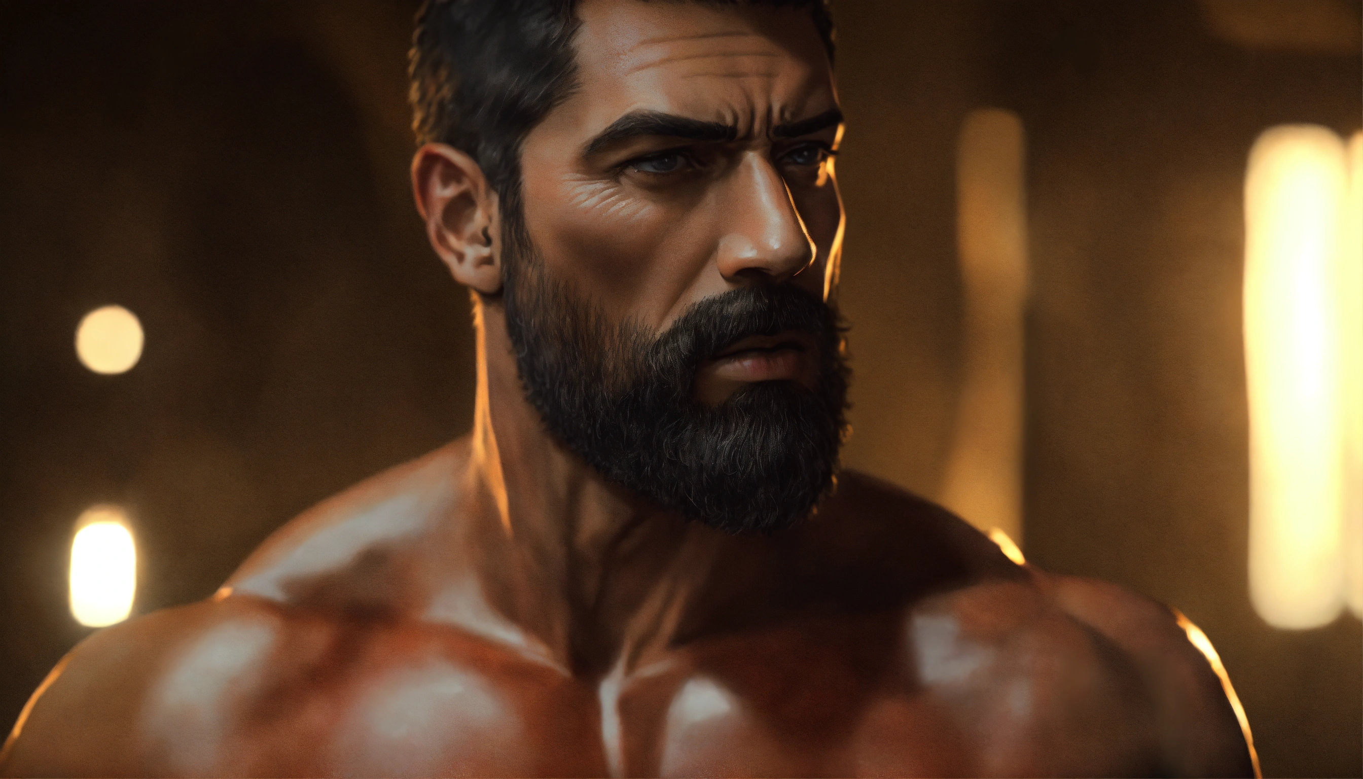 Stoic man, muscle, very strong, half body, hushing with his finger infront of his mouth, looking straight into the camera, realistic, 8k, 169
