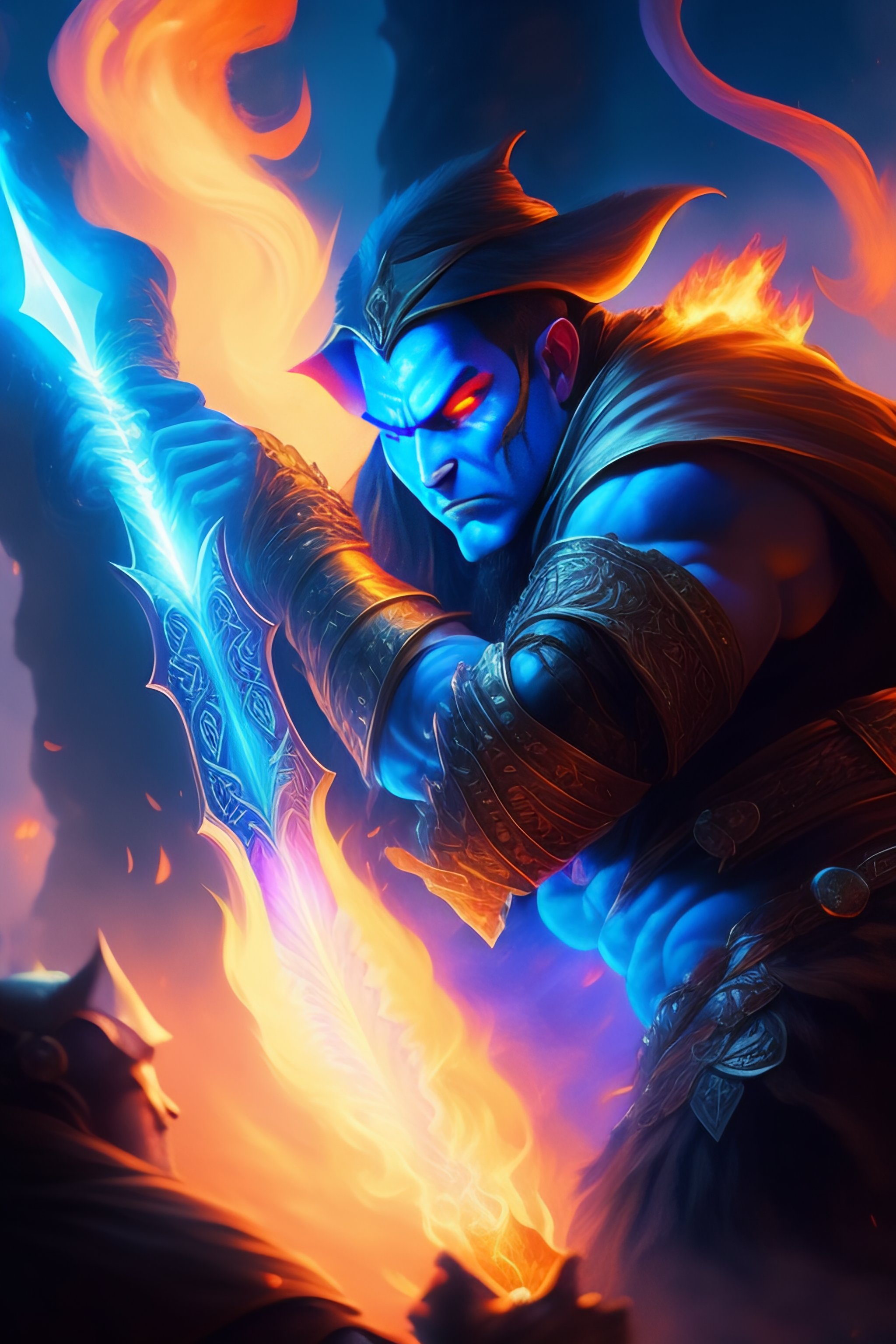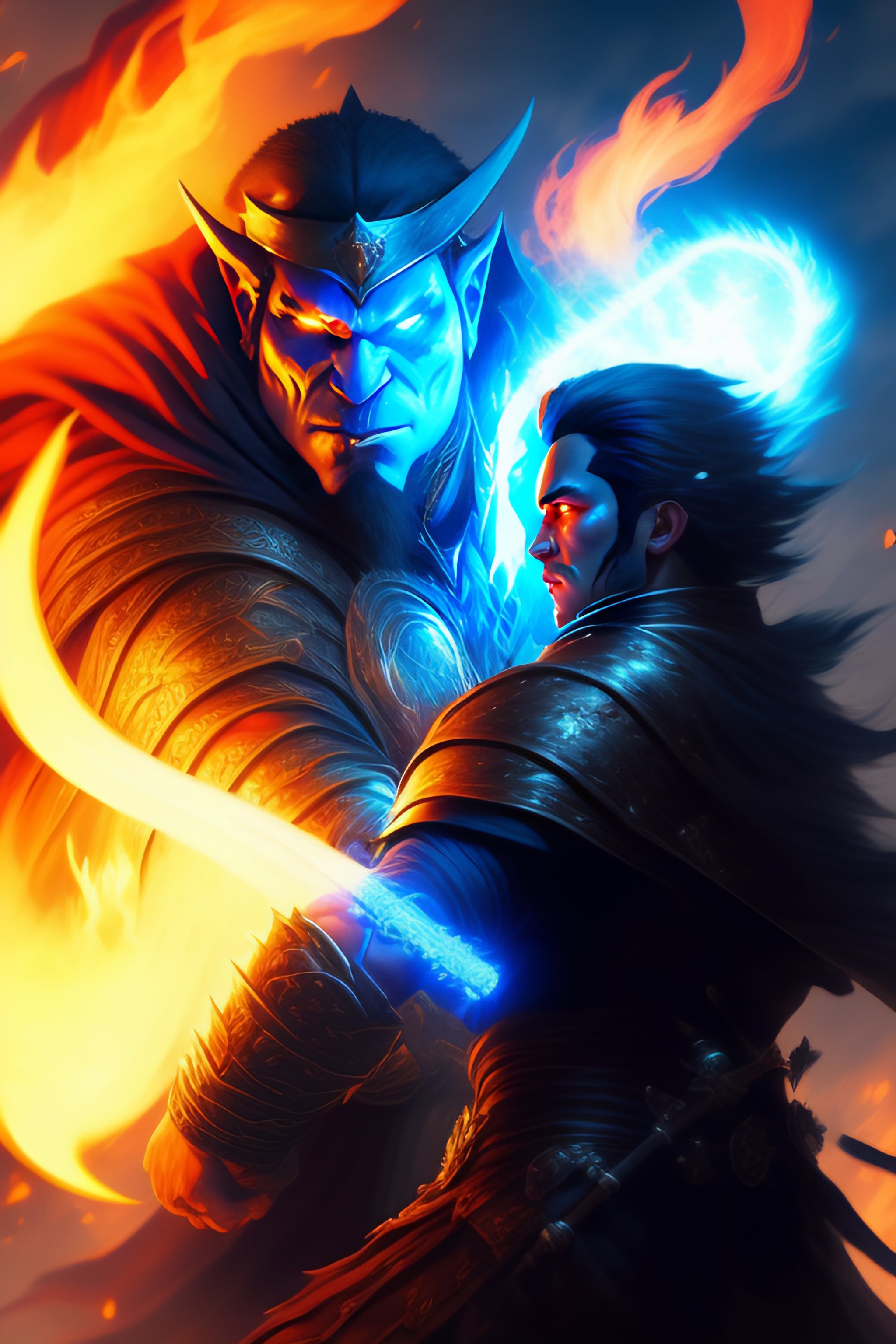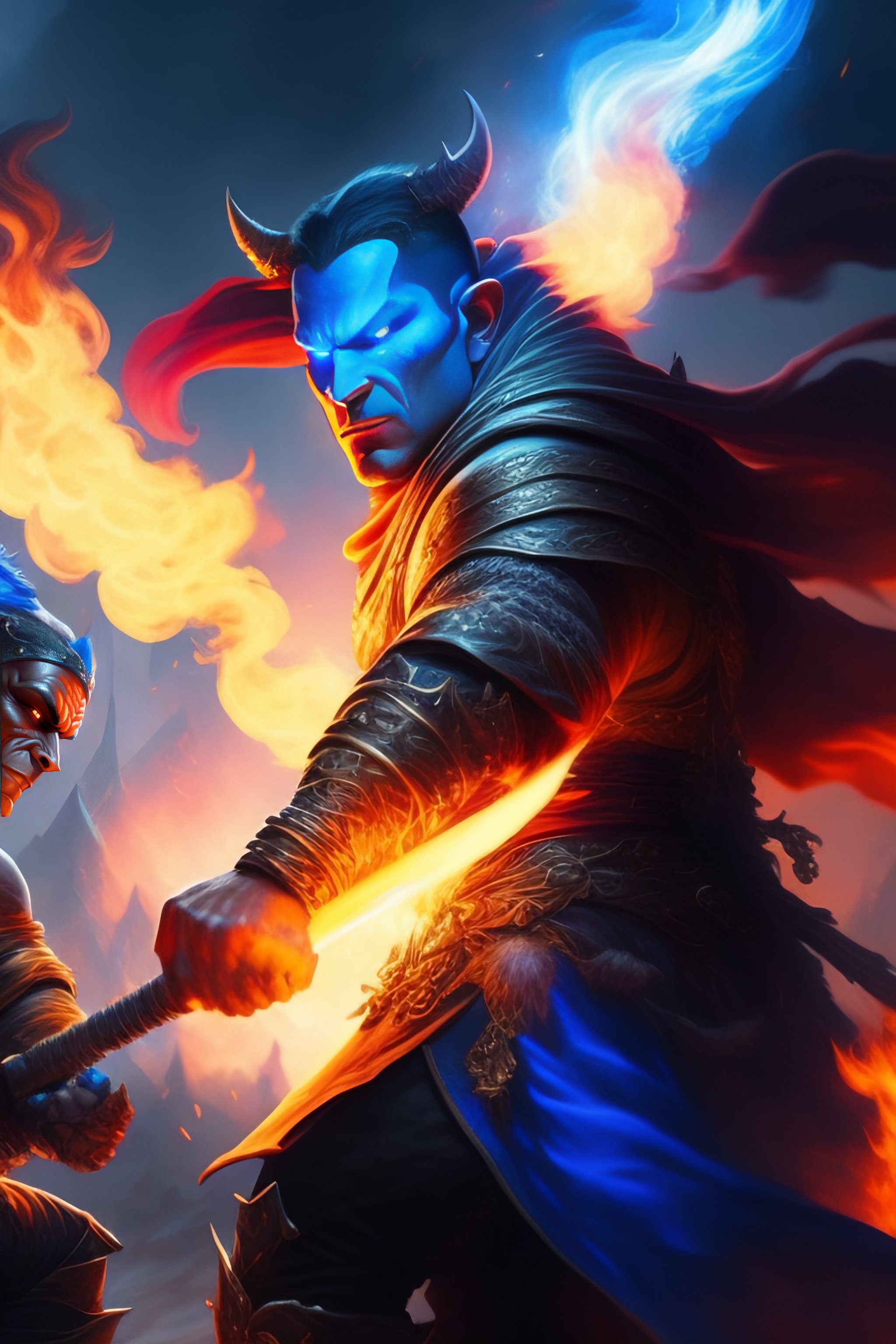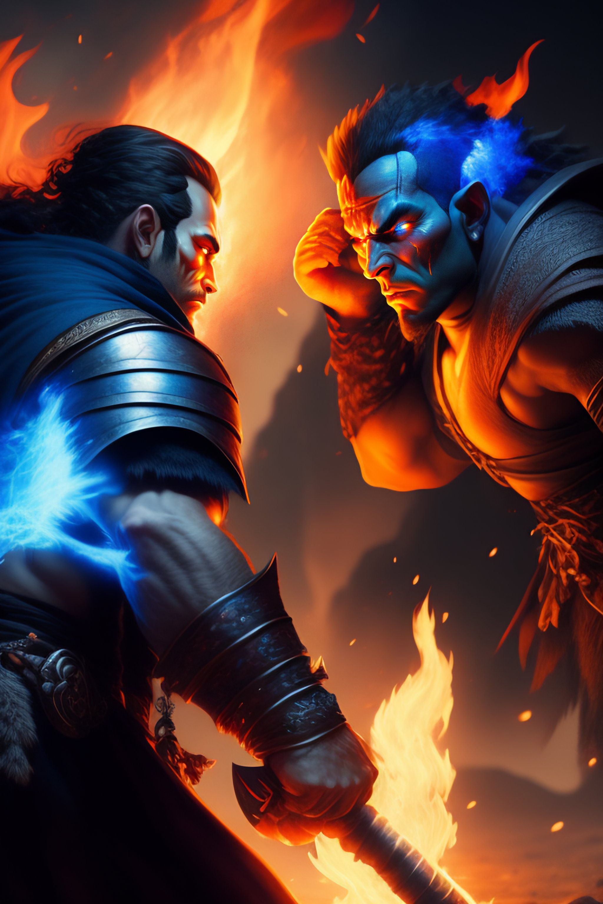 A pyromancer is fighting a orc with blue fire, medium level shot, epic scene, mucha style, general fantasy, illustration, concept art
