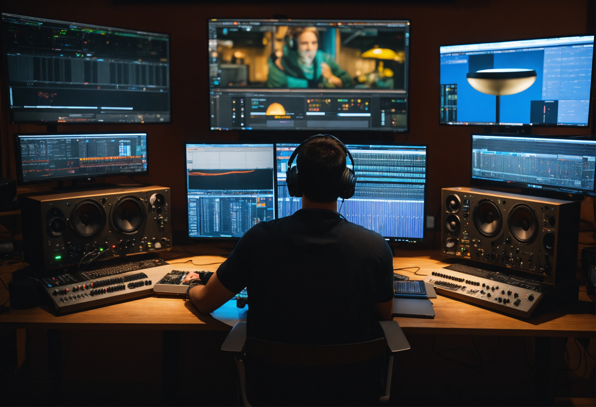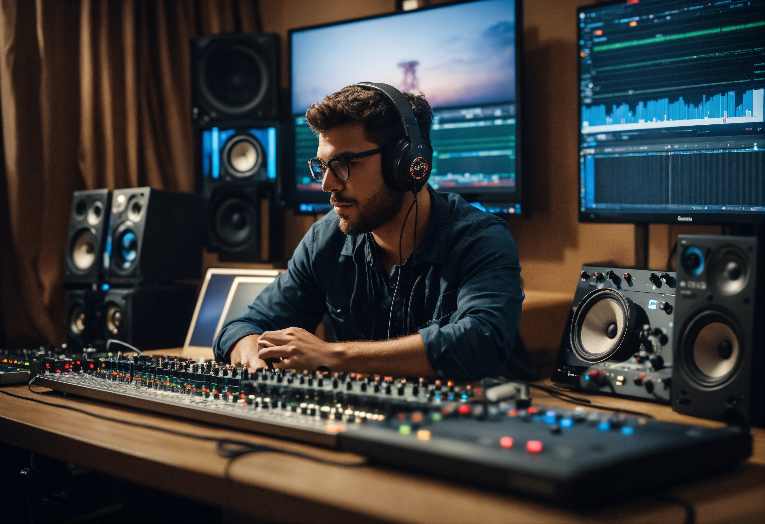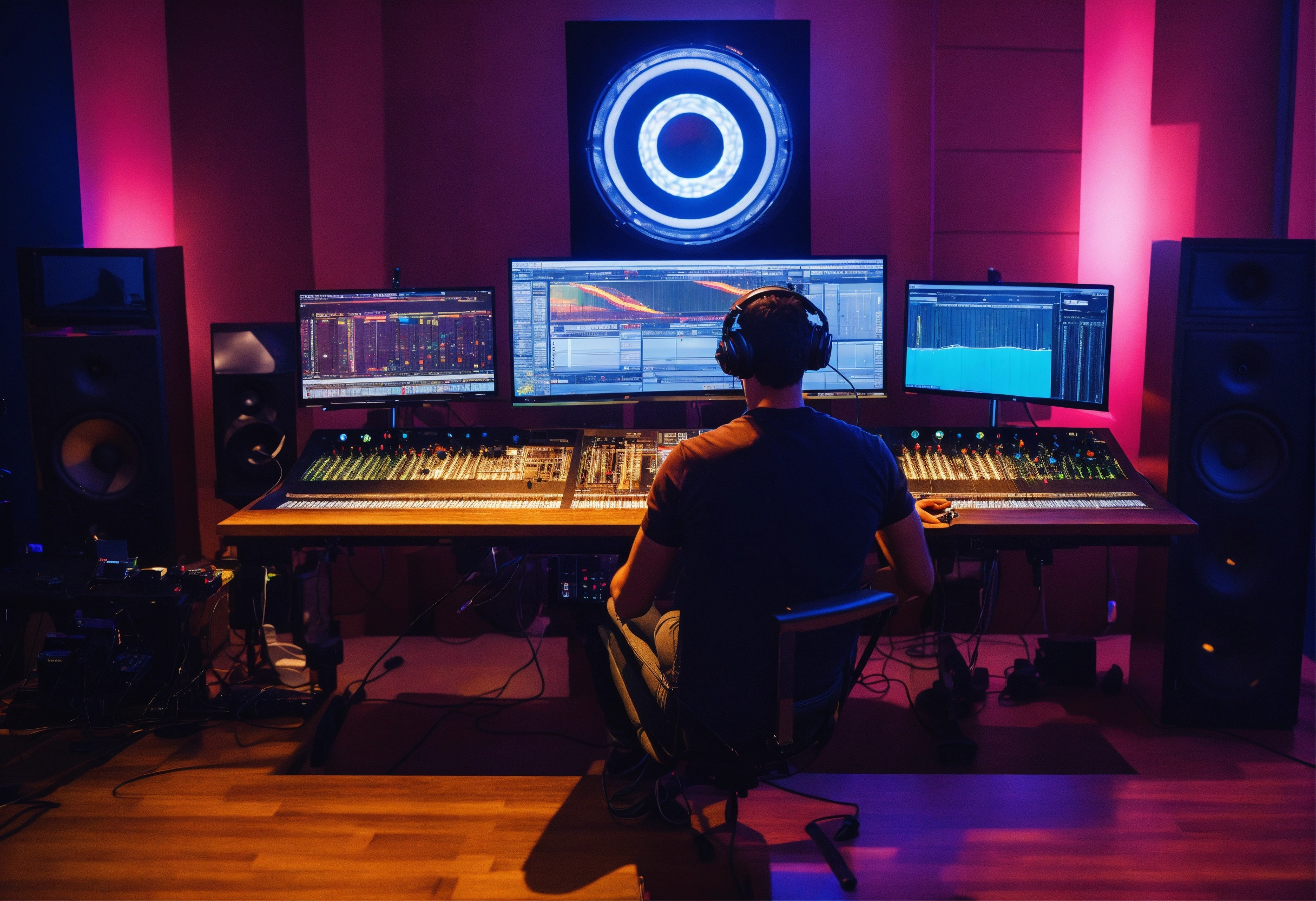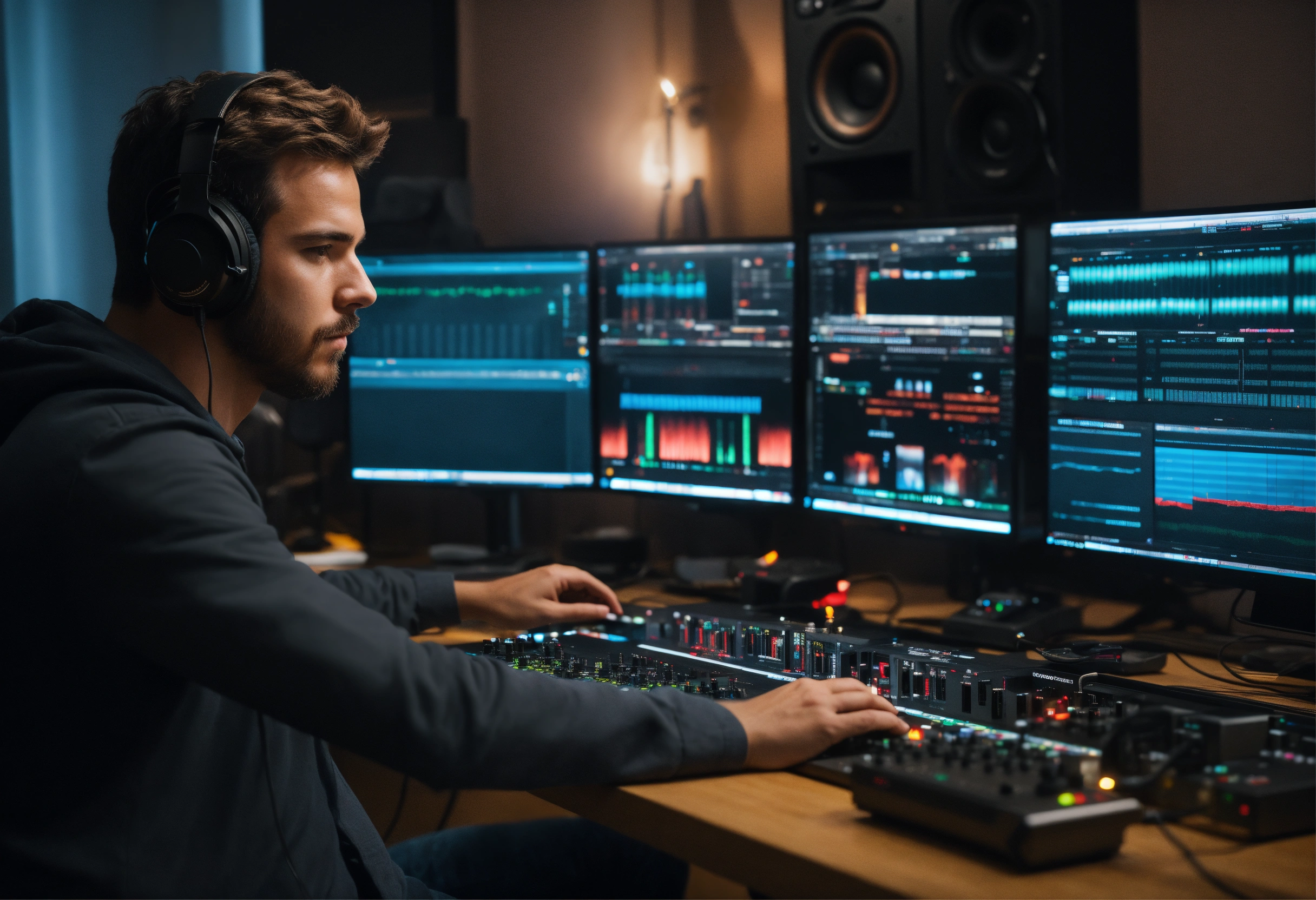 Photo a sound engineer at a computer - a person is sitting at a computer with 3 screens, with a huge remote control for mixing sounds. he's playing something on this remote. next to the computer we see speakers, headphones. realistic. a clear correct focus. beautiful symmetrical face. full frame. 3d, hd, real image, complex details, depth of field, beautiful lighting, 8k.