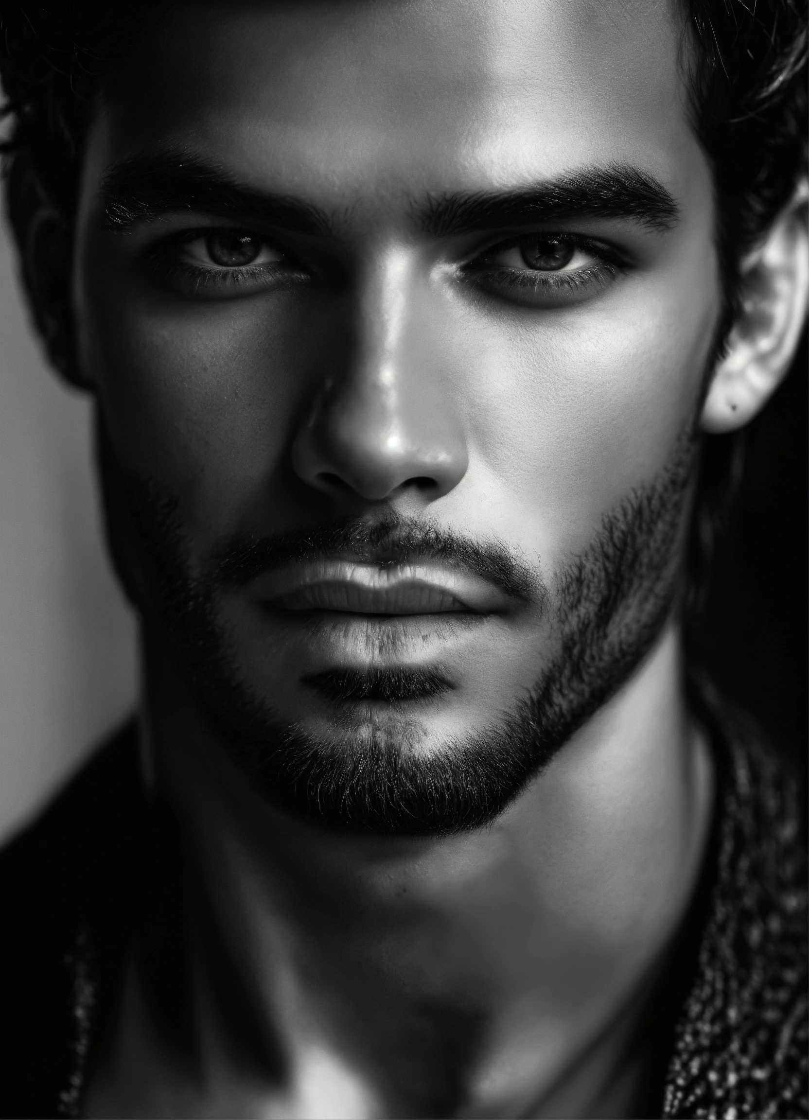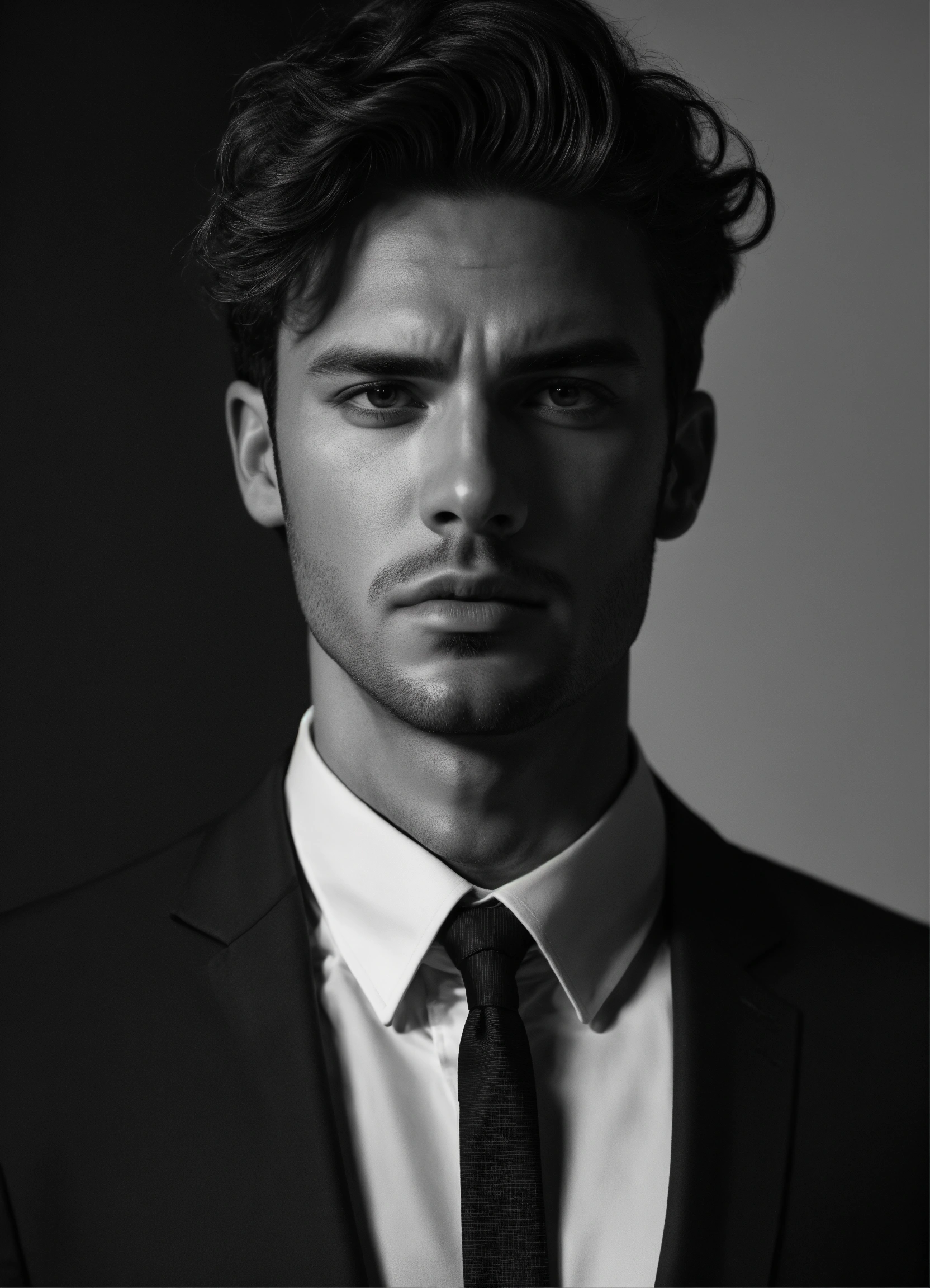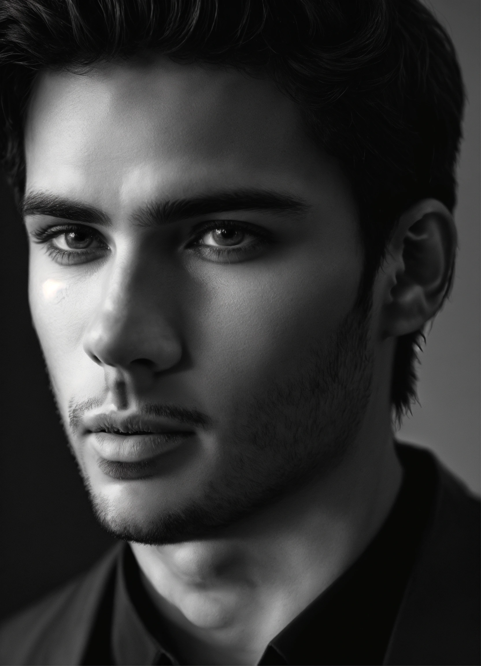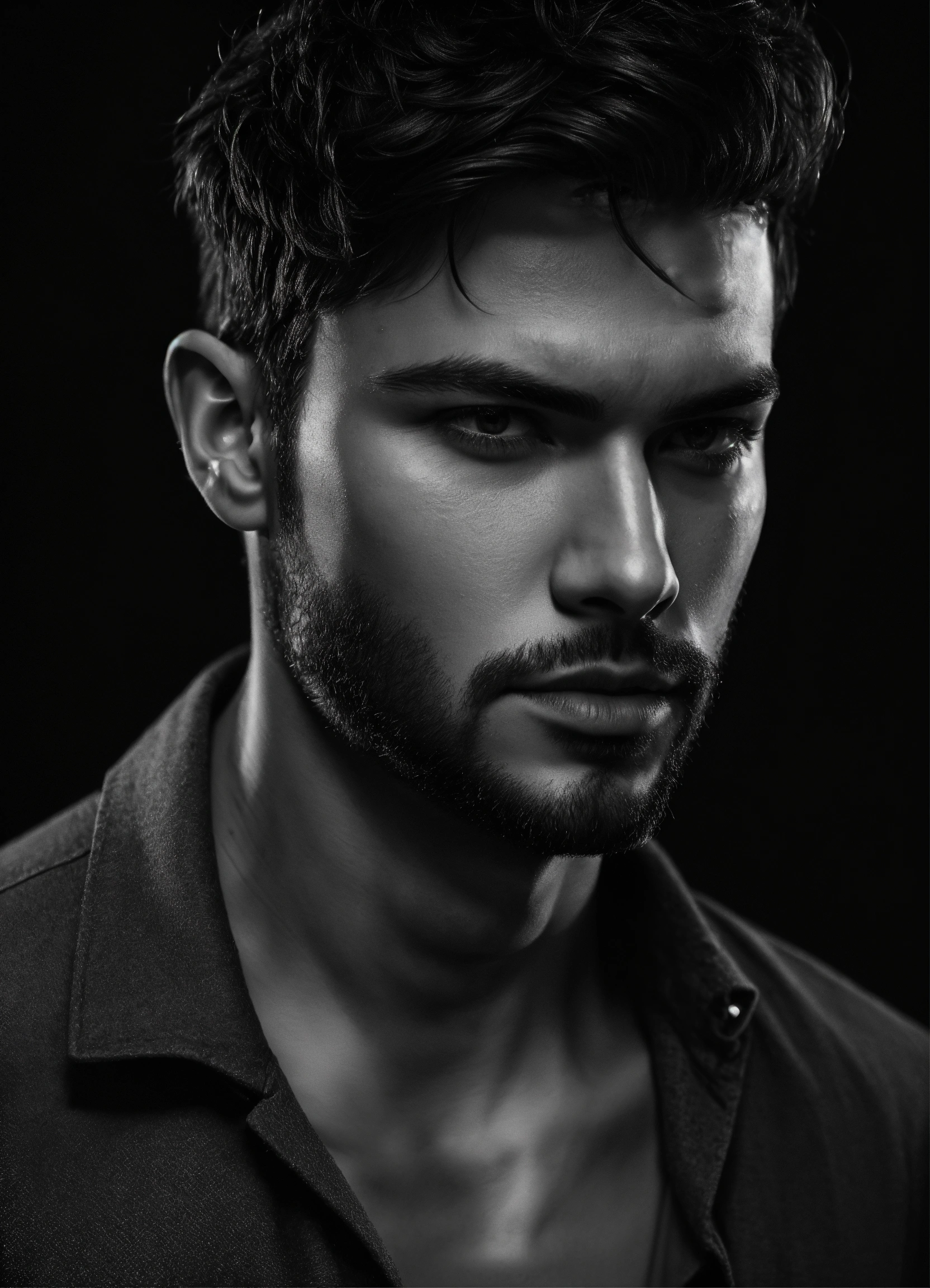 Photo of male model gonçalo teixeira, black and white, realistic, poster, not painted, very detailed faces, skin with pores, 4 k, dark suit, black plain background, skin not smoothed, face from left to right, desire in the eyes, half profile, glowering, looking into the camera, dark shirt
