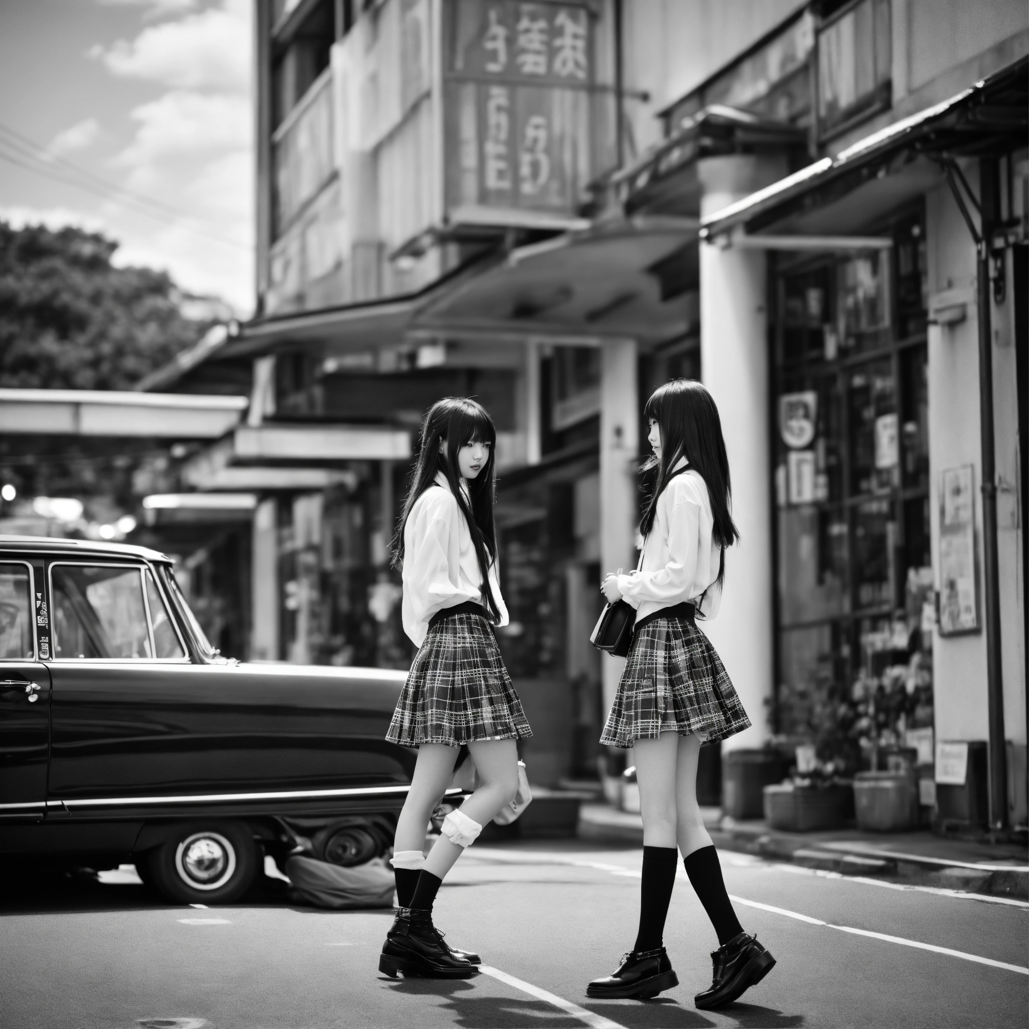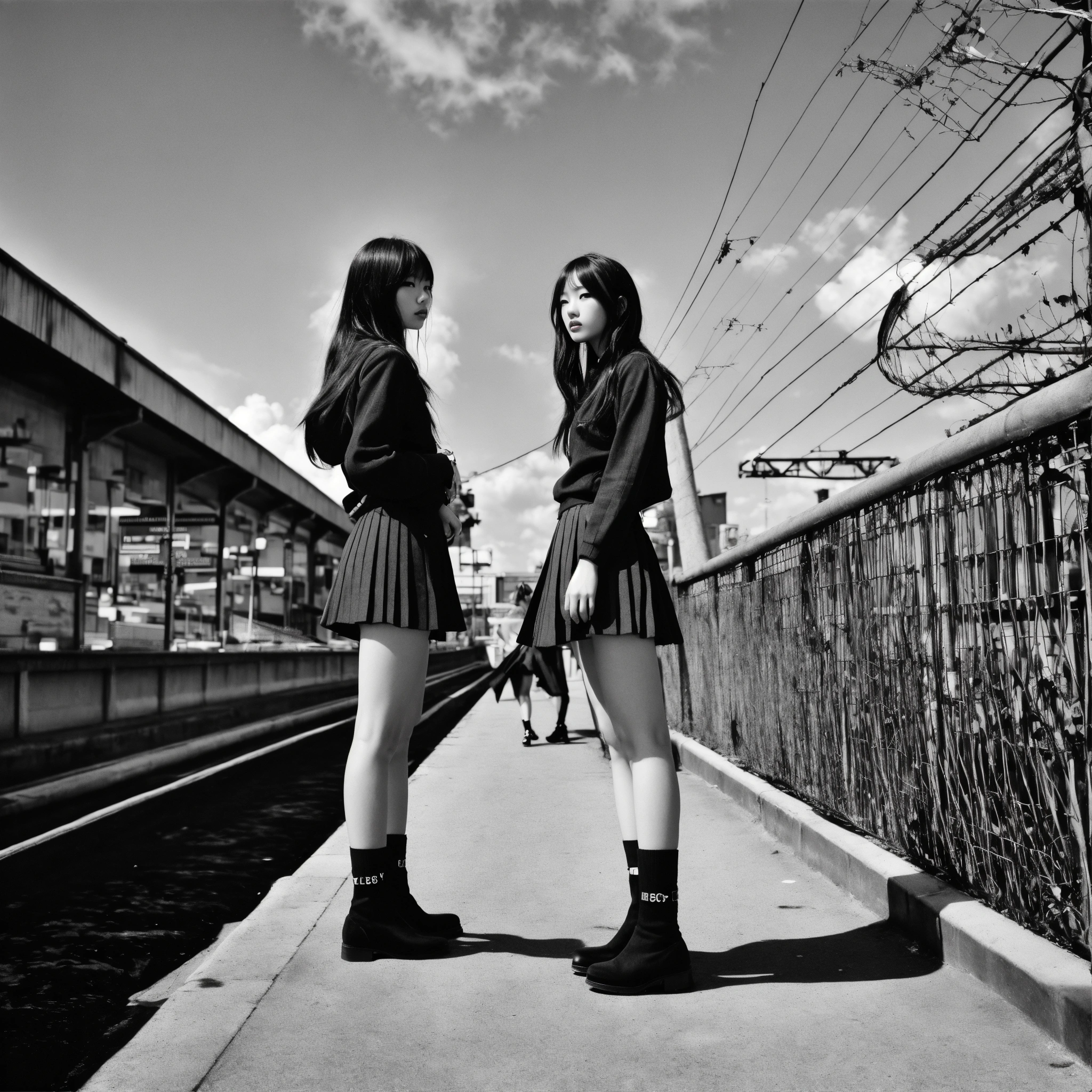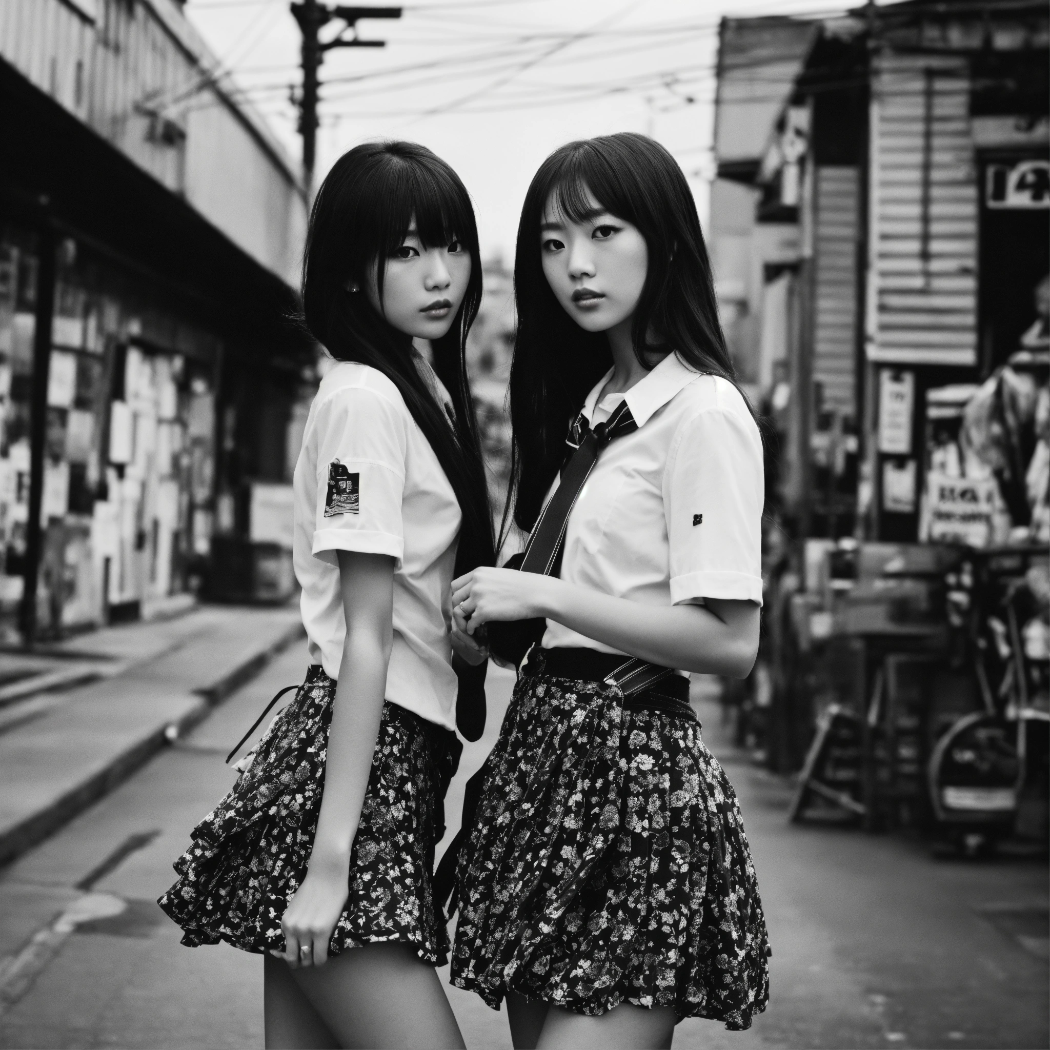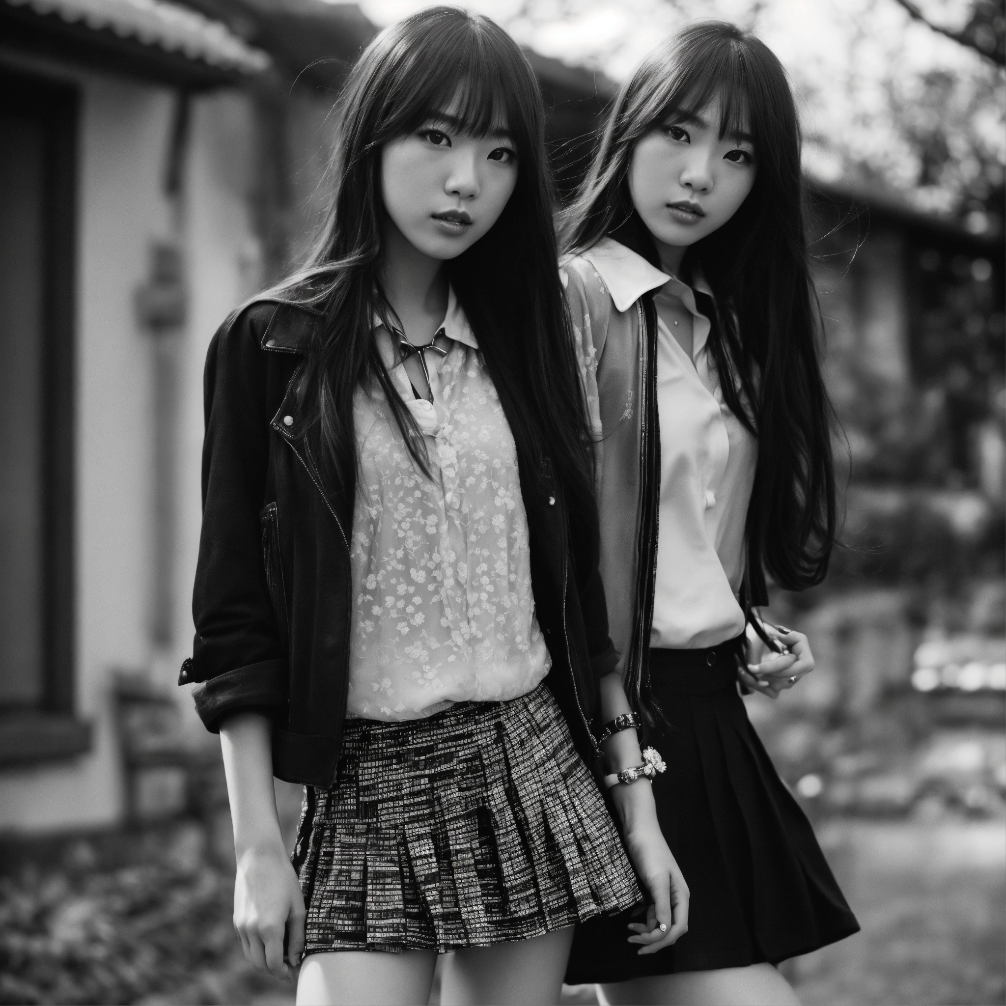 Extremely detailed photographic image, grained image, beautifully composed, monochrome image, comtenporary fashionable image, fashionable magazine photography, leica summicron 35mm f2.0, kodak 400tx, fashion photography, fashionable model, two beautiful japanese anime idol high school girls wearing a mini skirt, with long hair blowing in the wind, both staring into the camera, with each posing a specific photogenic pose differently, with no intimacy to each others