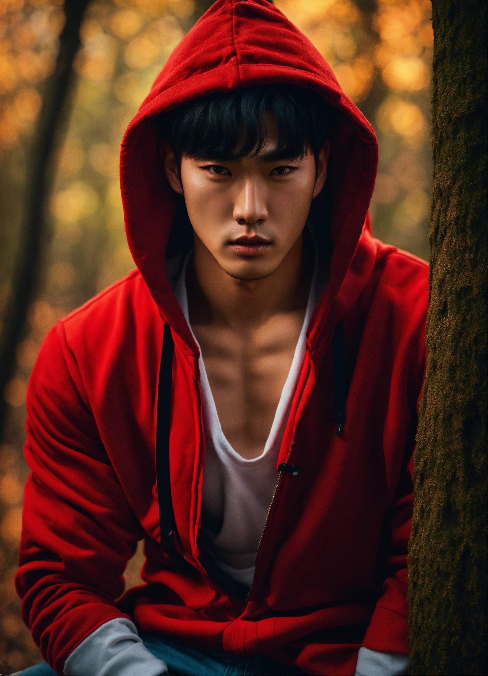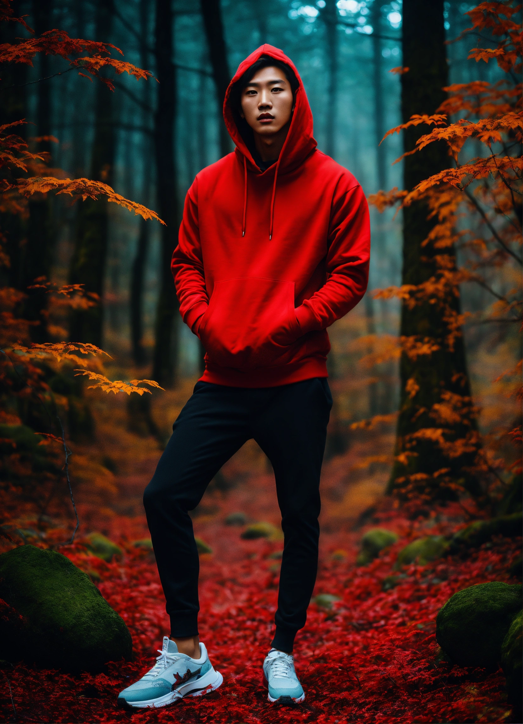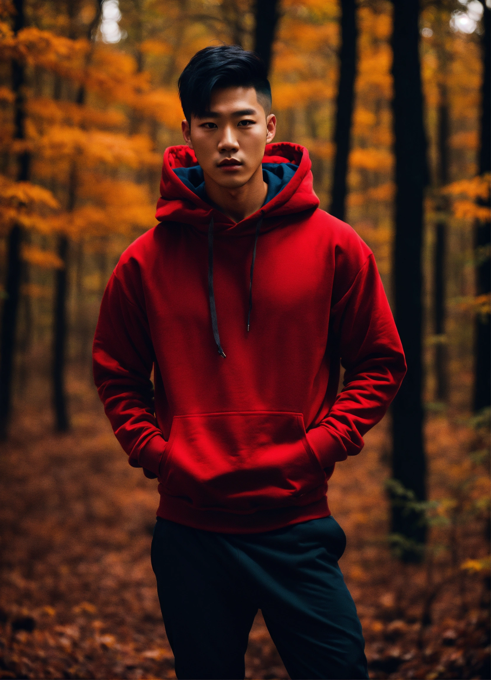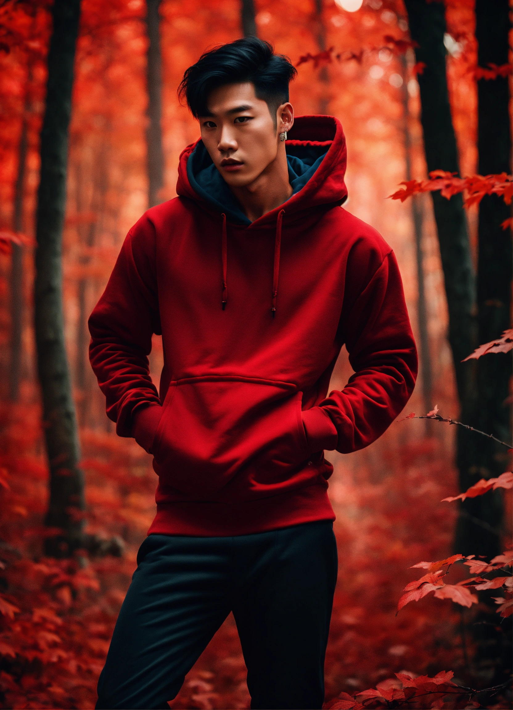 Pin-up poster of a fit korean male model wearing a blank scarlet red hoodie in a autumnal forest, dark fantasy atmosphere, dramatic lighting, facing camera, wonho