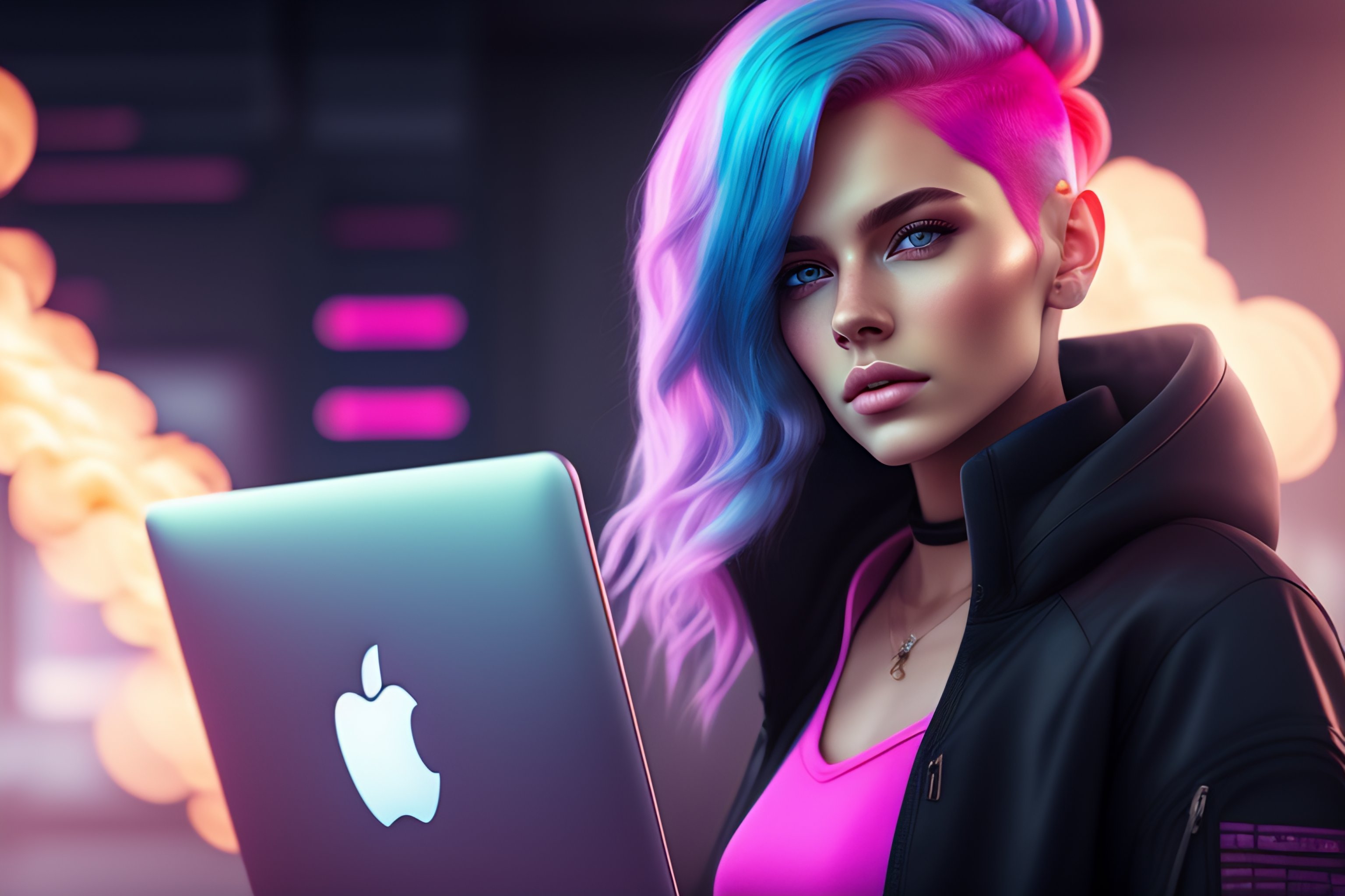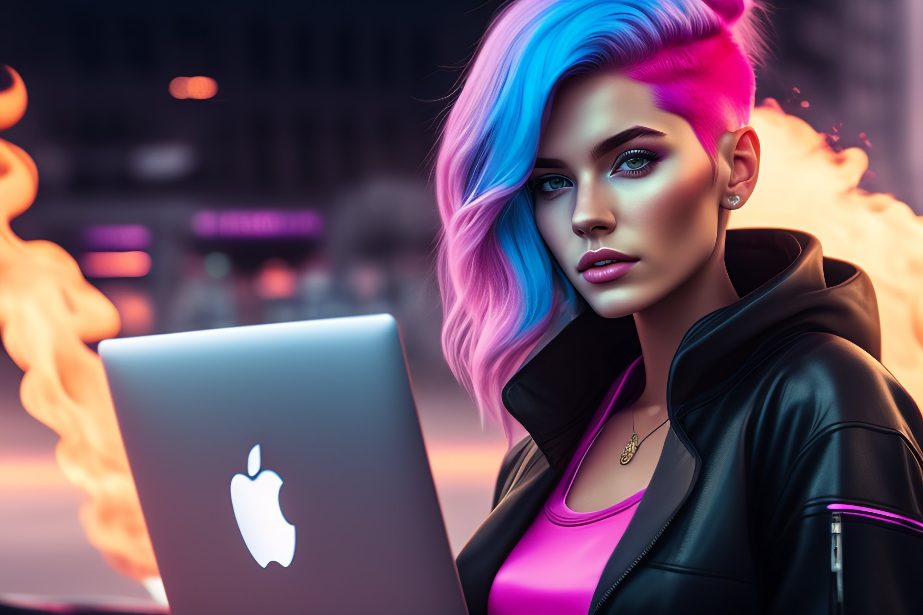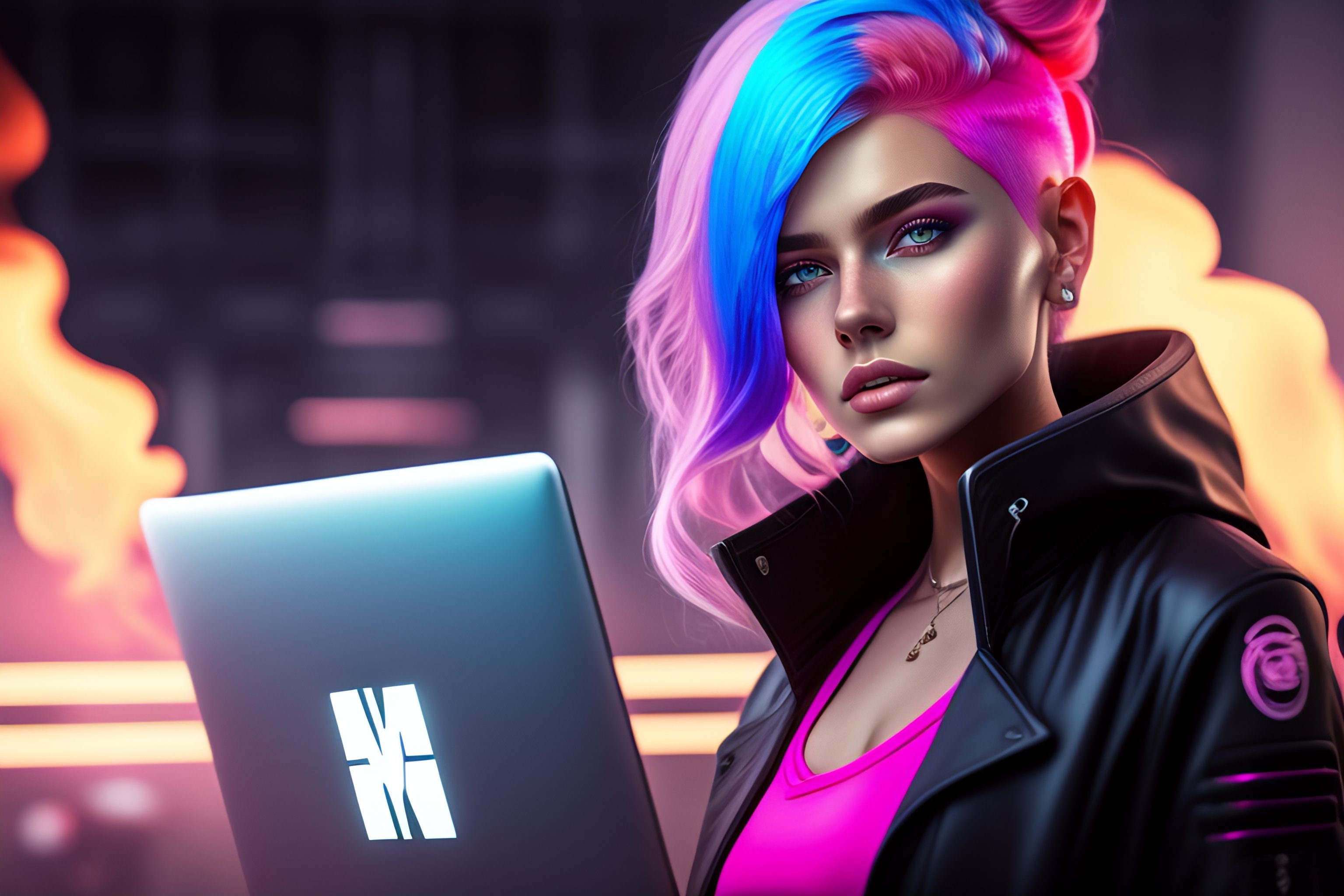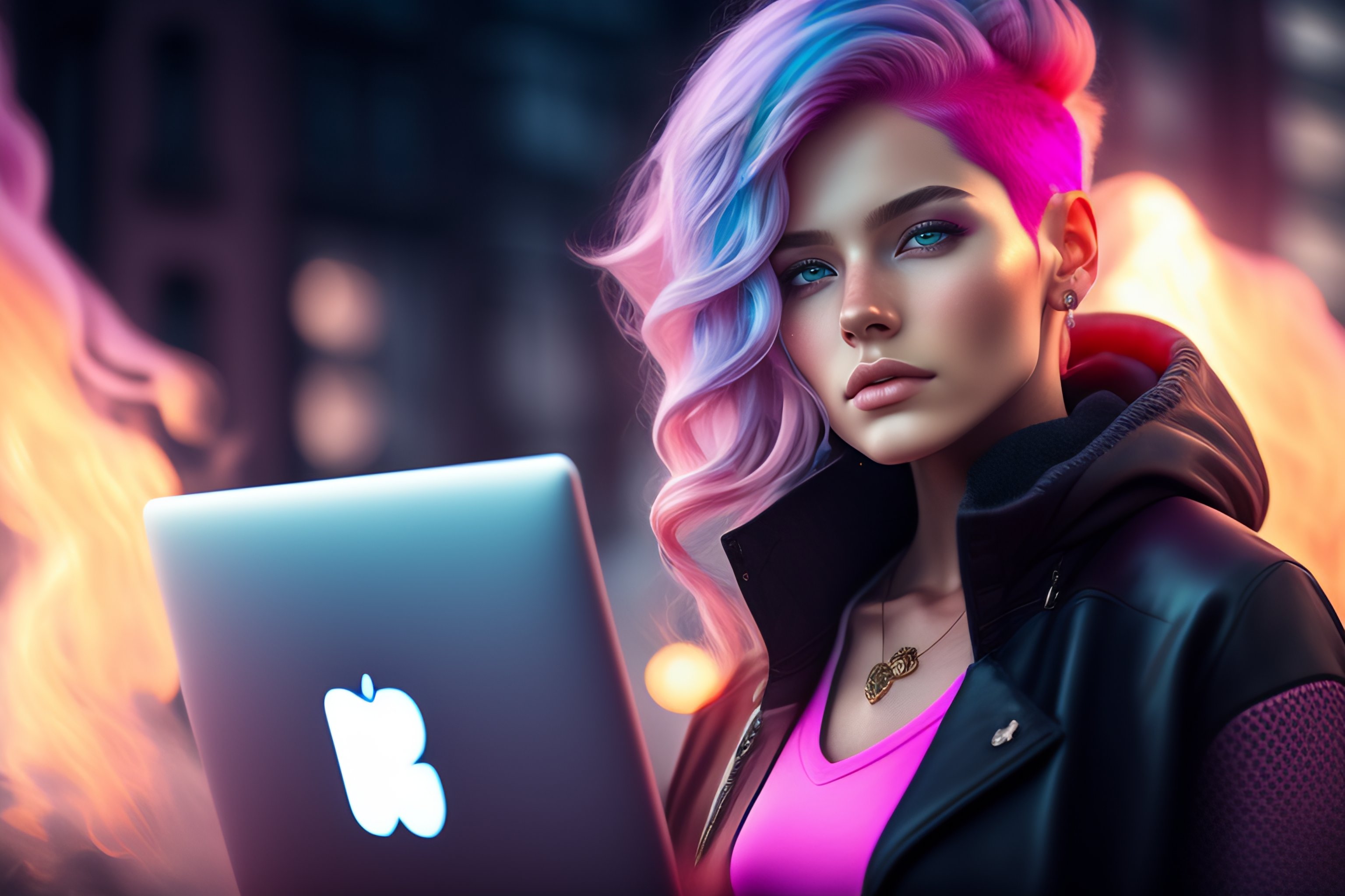 Portrait of a girl with pink hair and gray eyes with laptop computer that is on fire, cinematic, slate gray atmosphere, soft cinematic light, adobe lightroom, hdr, intricate, highly detailed, muted colors, in front camera 50mm, by ilya kuvshinov sci-fi, faded, dim