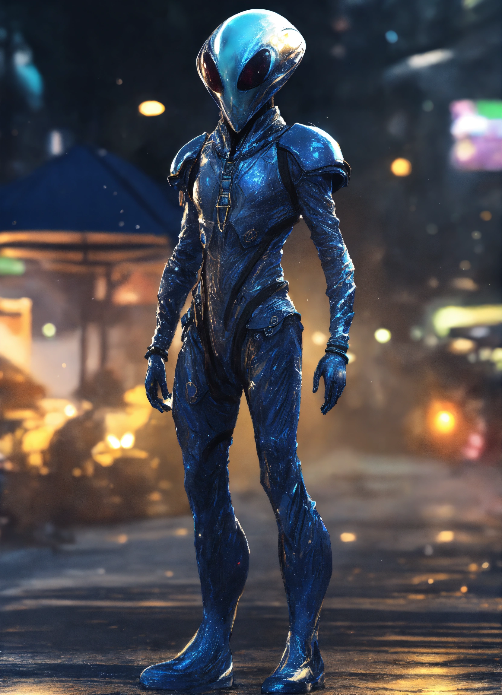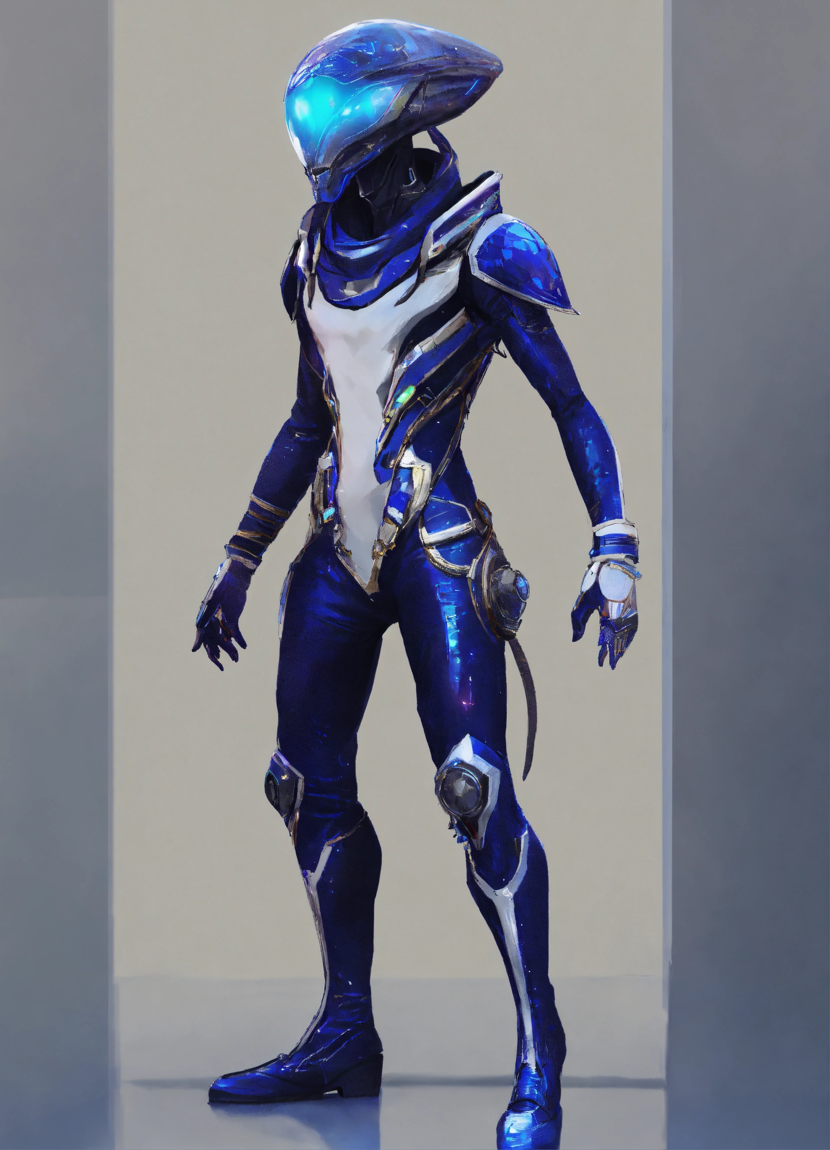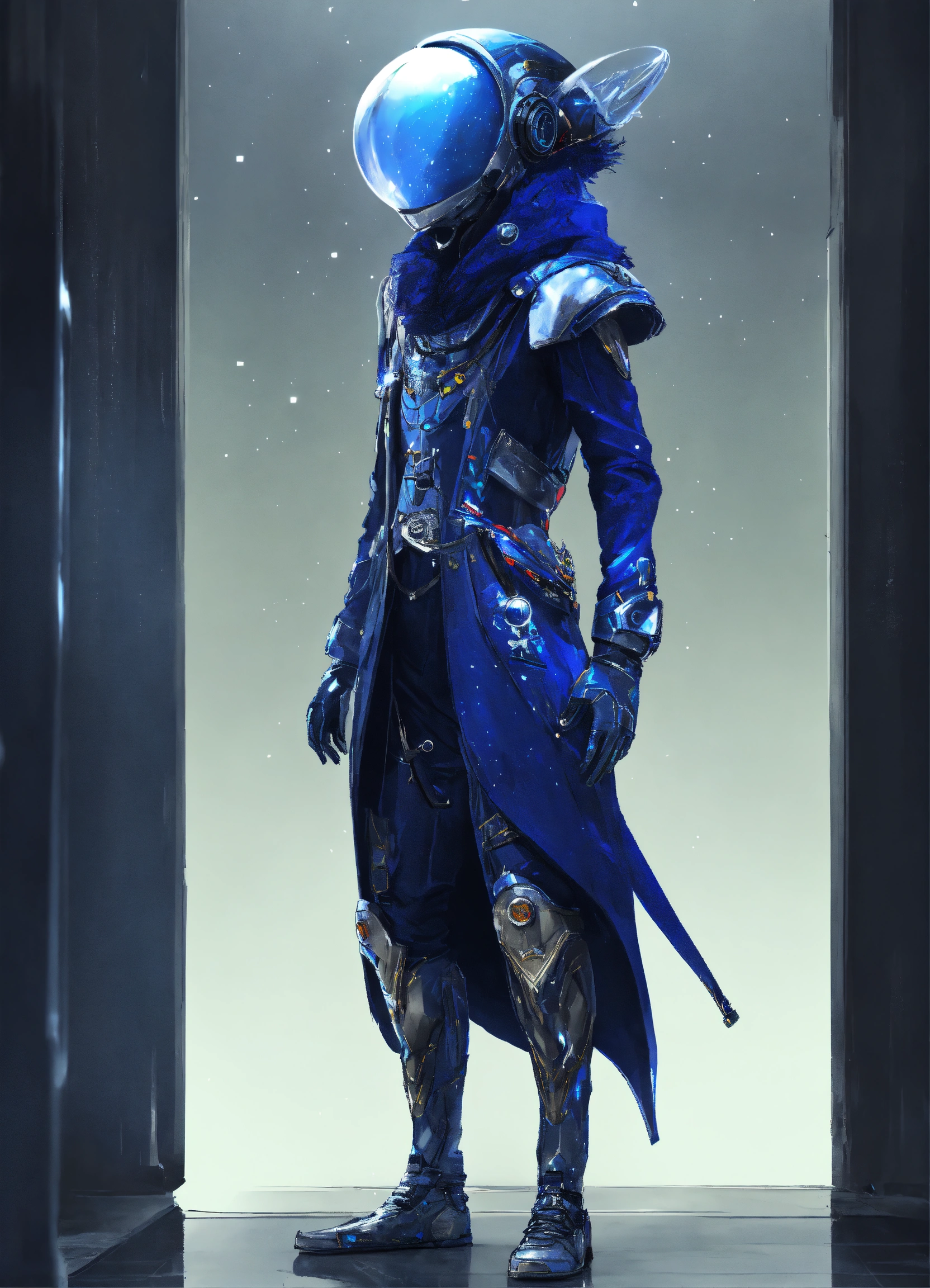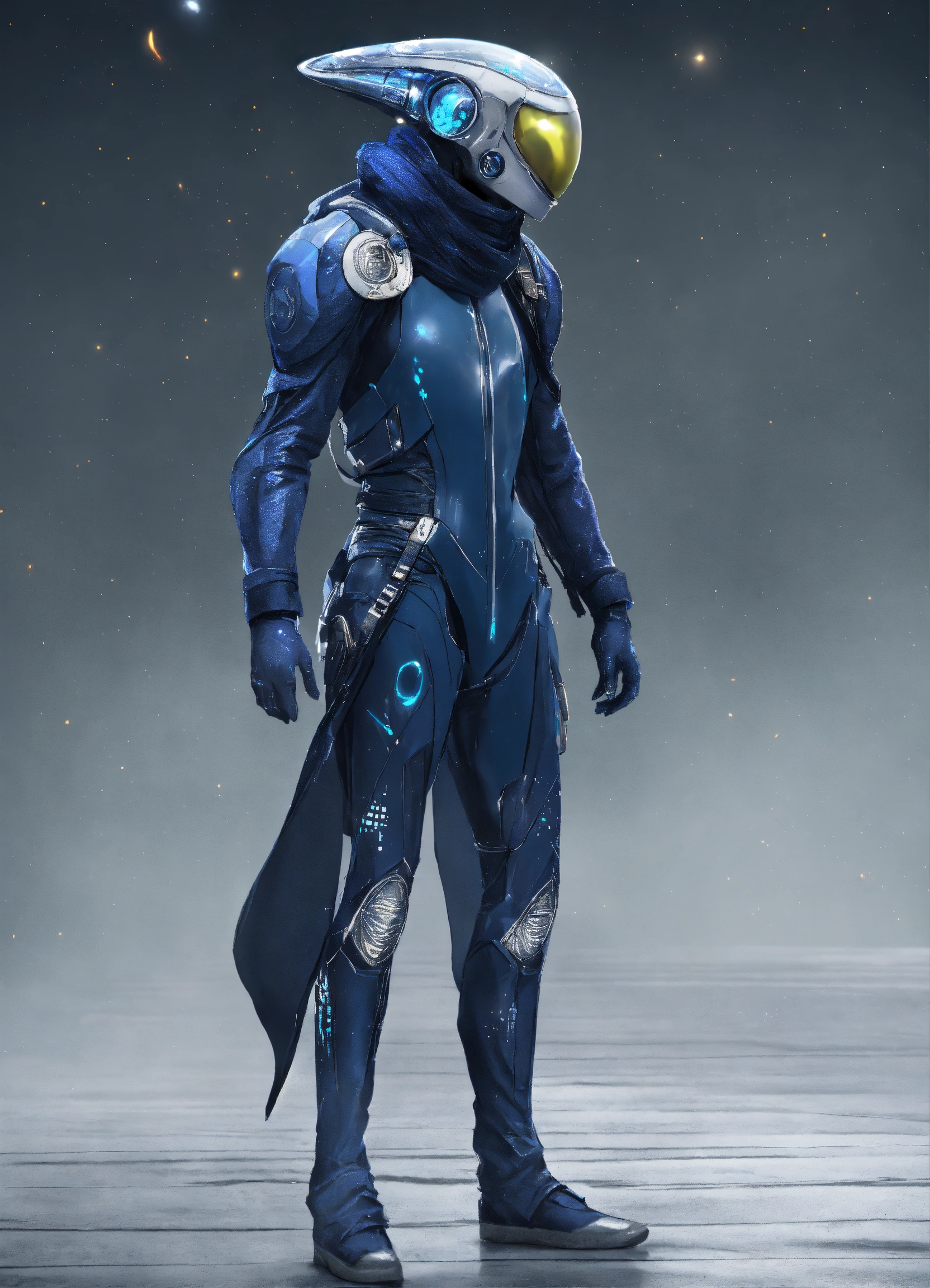 A alien, alienrace male, alien_hippie hippiestyle clothings colored navy blue shiny white with silver dekoredet, winter clothings, full body wide shot, walking pose, intricate, sharp_focus, concept_art, simple white backround