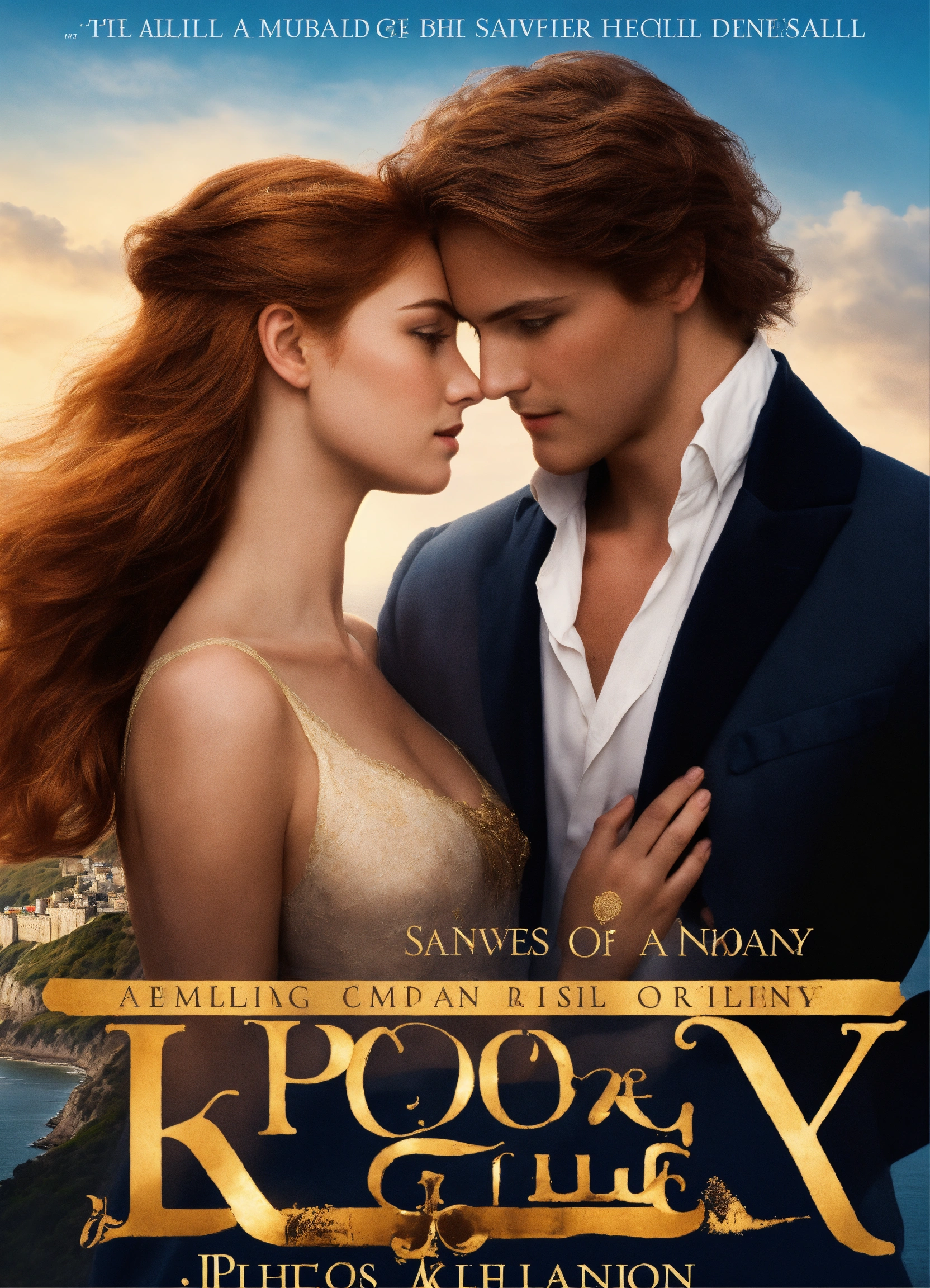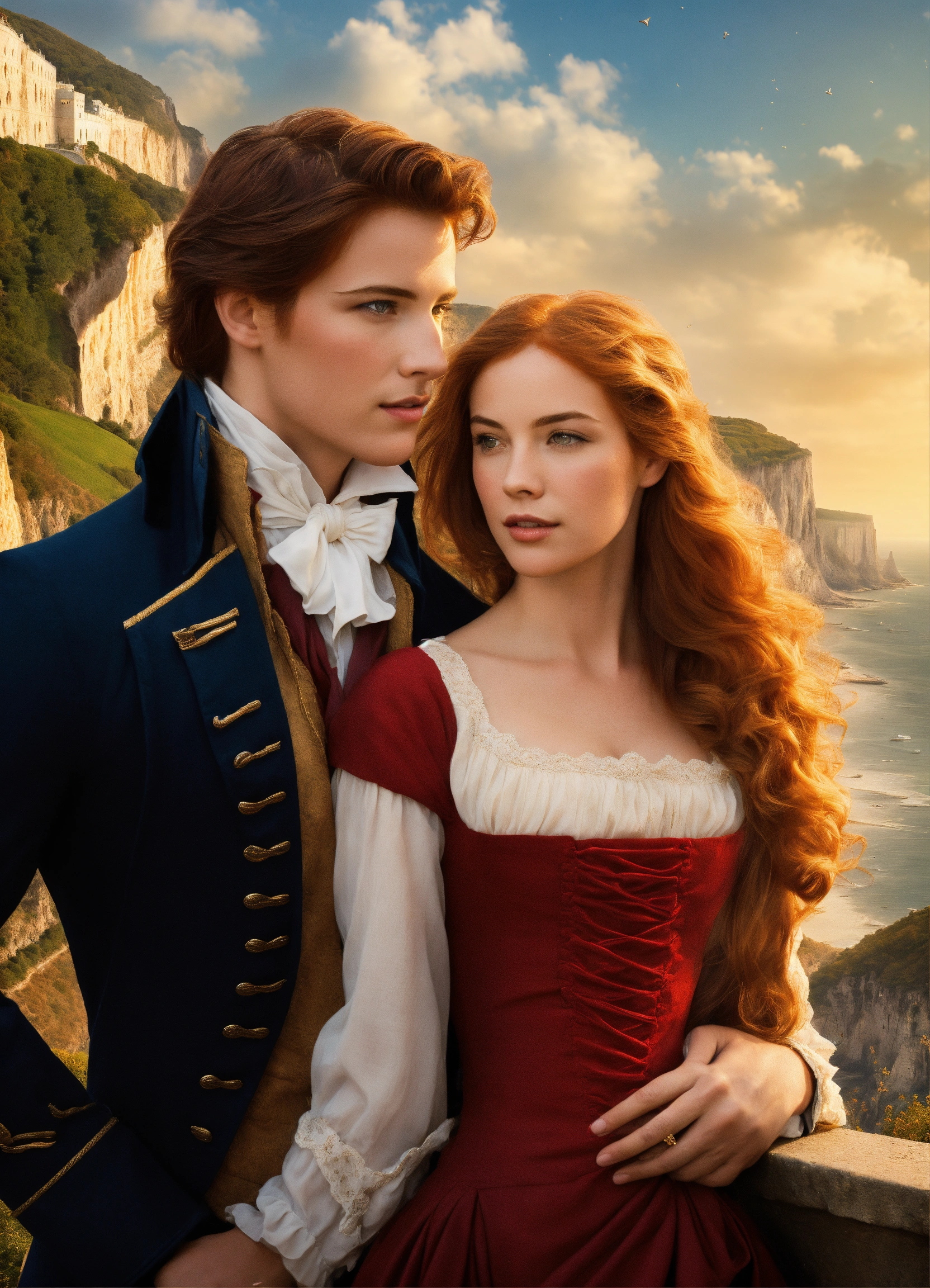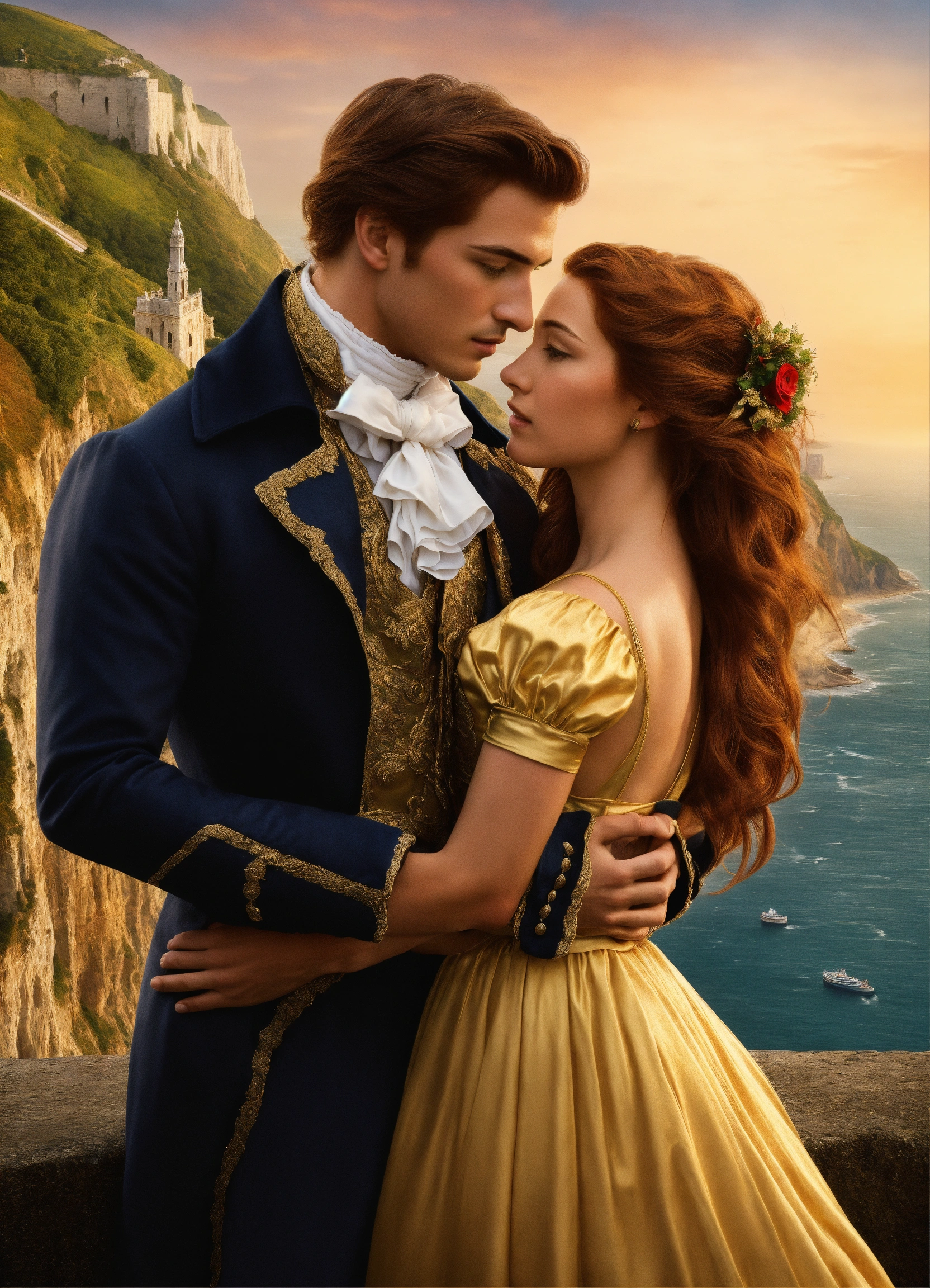 Create a captivating cover design that conveys the theme of romantic comedy, with the title of " loves many guises ", featuring a dashing regency gentleman with auburn hair embracing a slender woman with golden hair, a long face, and hazel eyes. again, the cliffs of dover and a sable collie could be near their legs. photorealistic, photoreal, book cover style design, with shadows and effect that gives the design captivating, super detailed, extremely detailed, detailed hands, half body focus, with the cliffs of dover in their background, half body focus