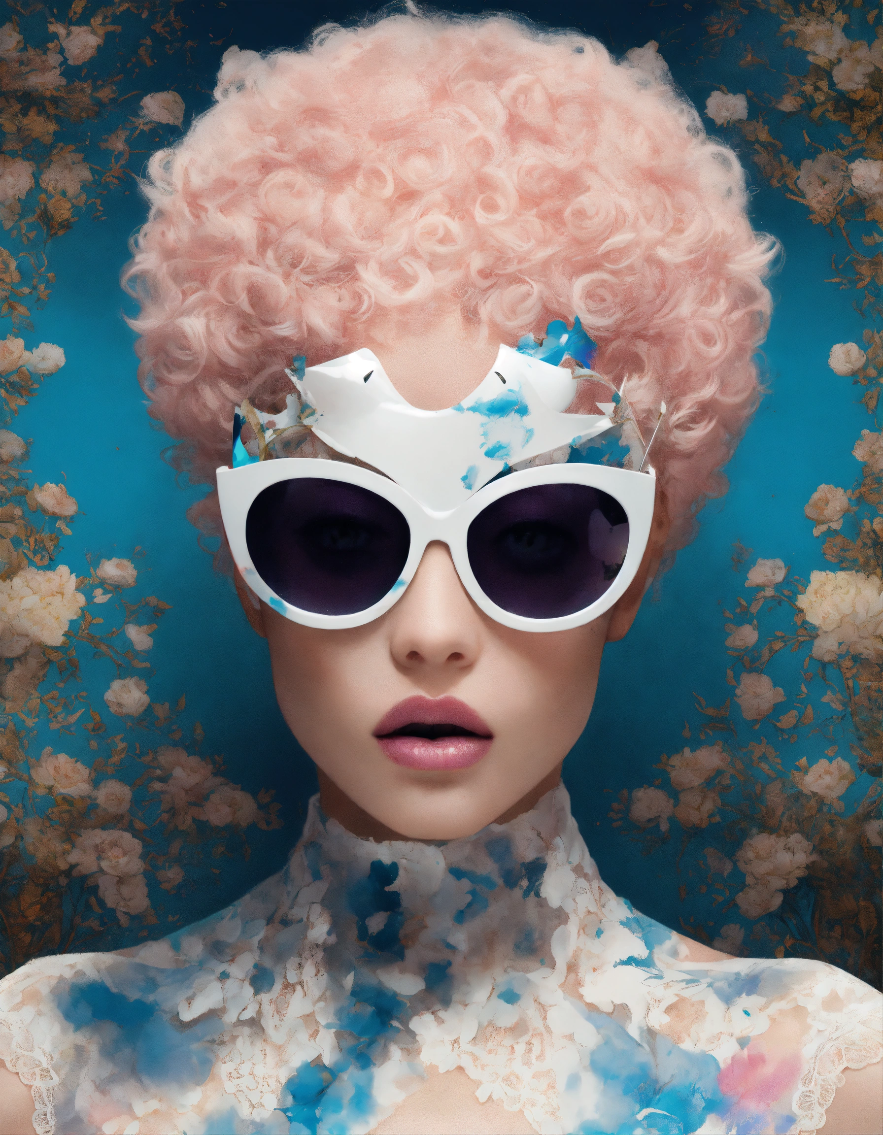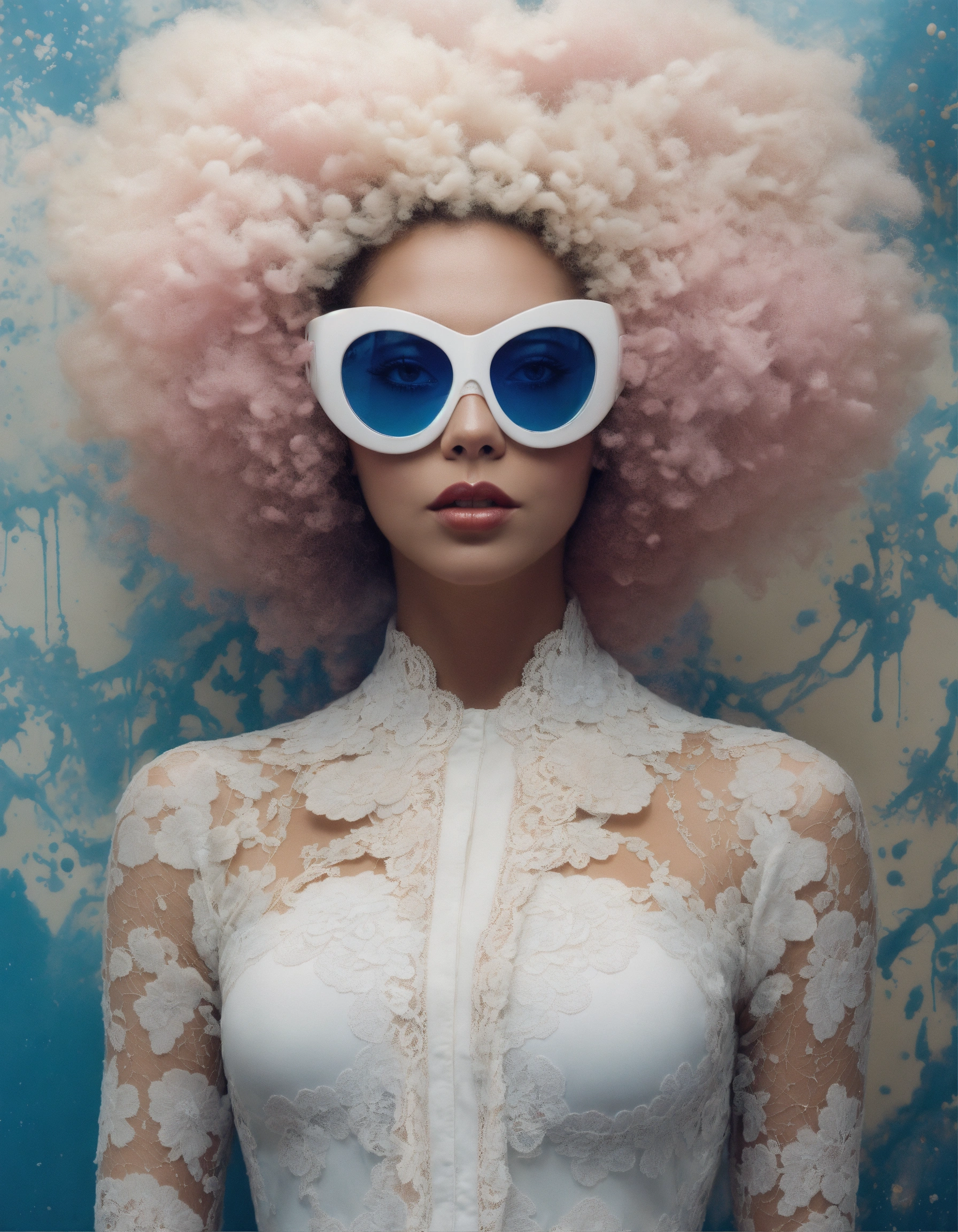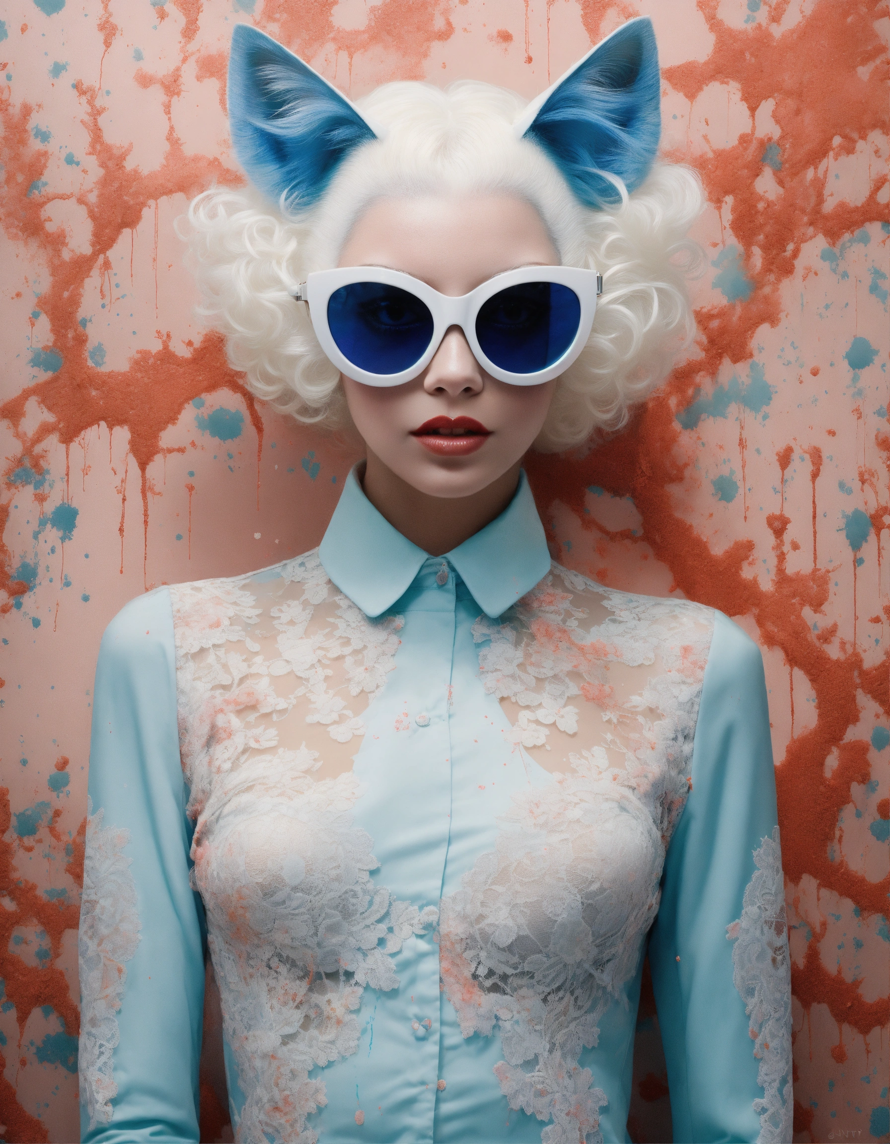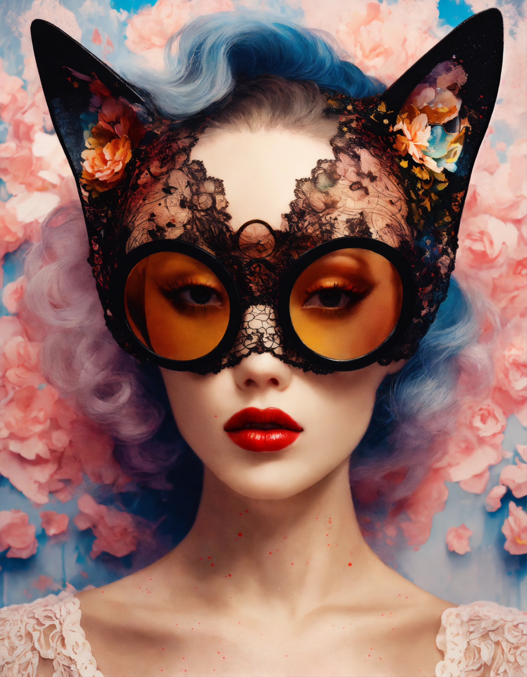 White and pastel color front portrait photography, a woman's face in an afro american cat woman mask with sunglasses, emerges from ink splatters, an attractive lace body, 80 degree view, art by sergio lopez, natalie shau, james jean and salvador dali