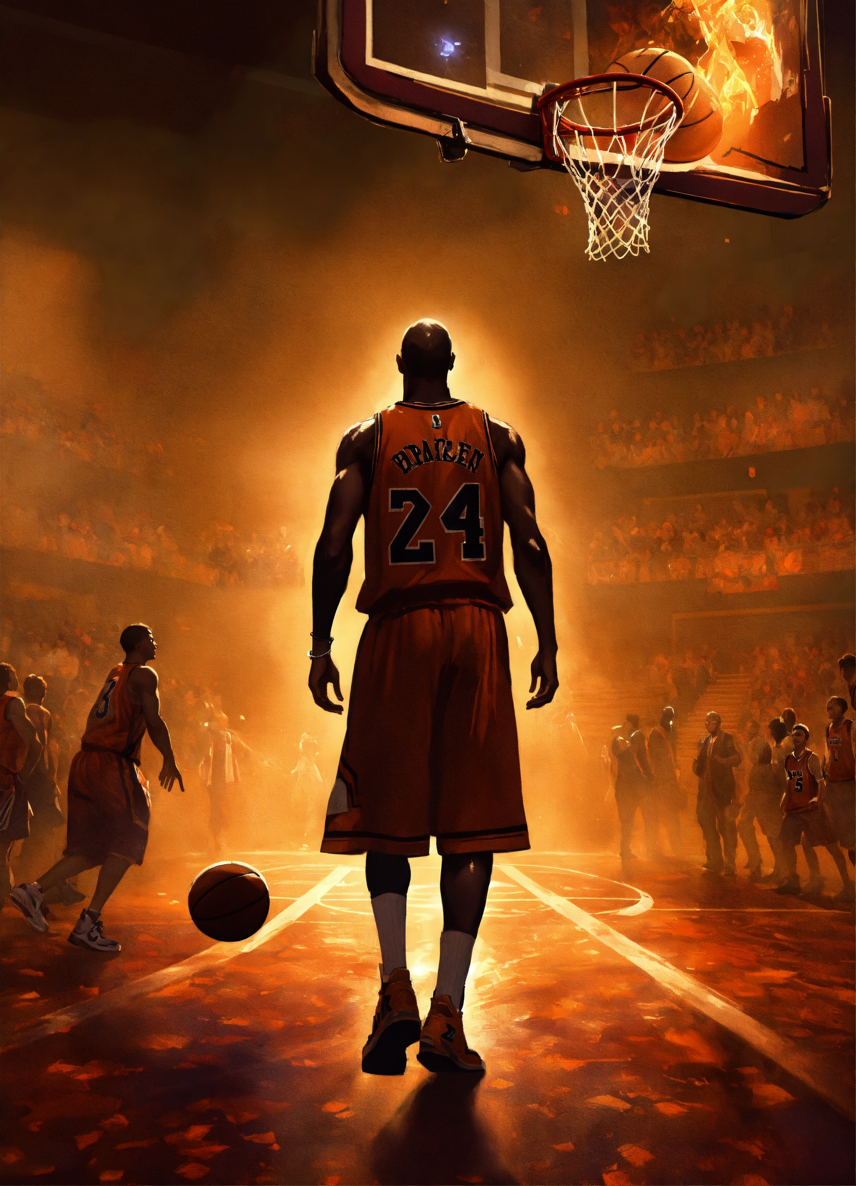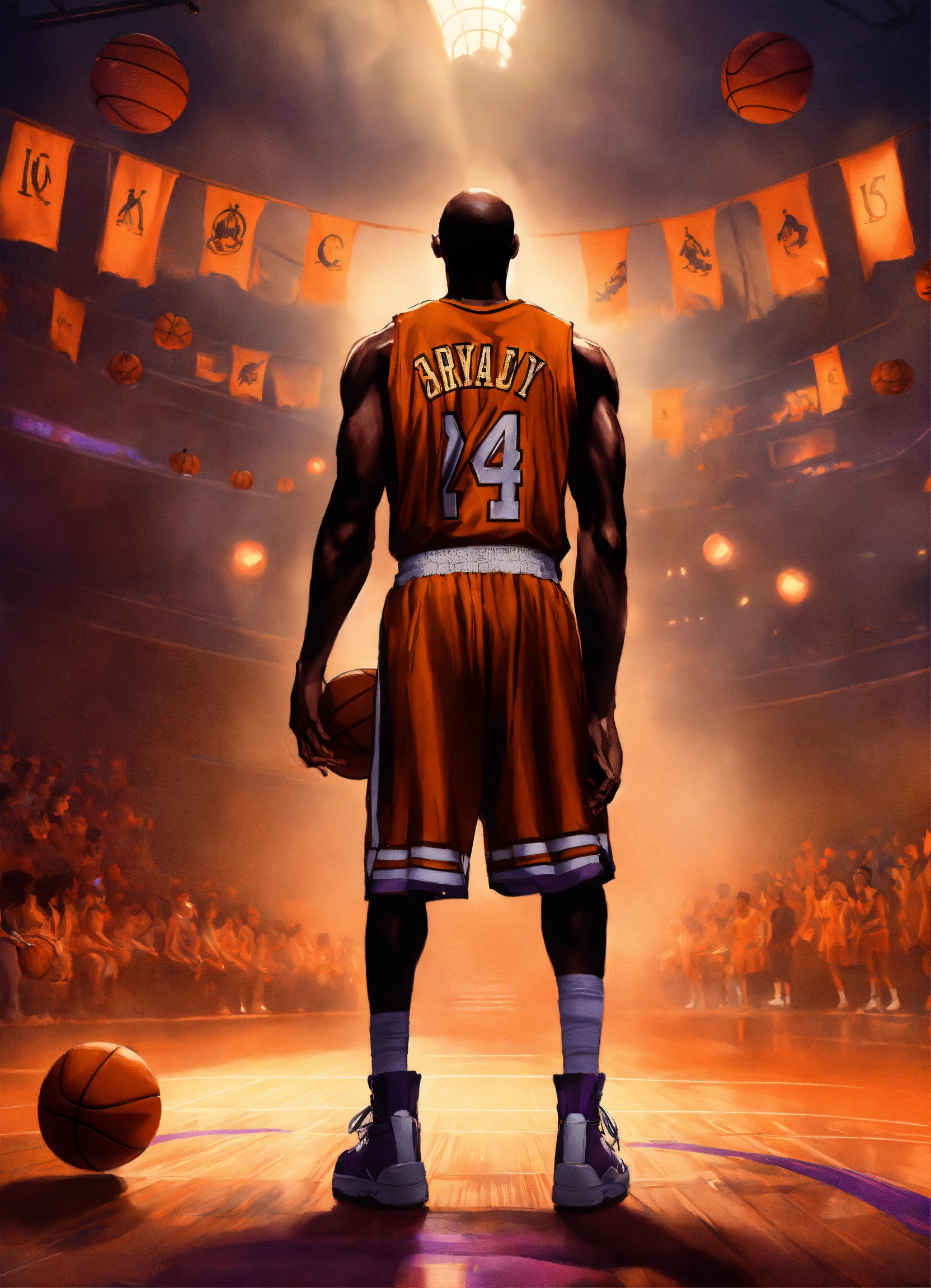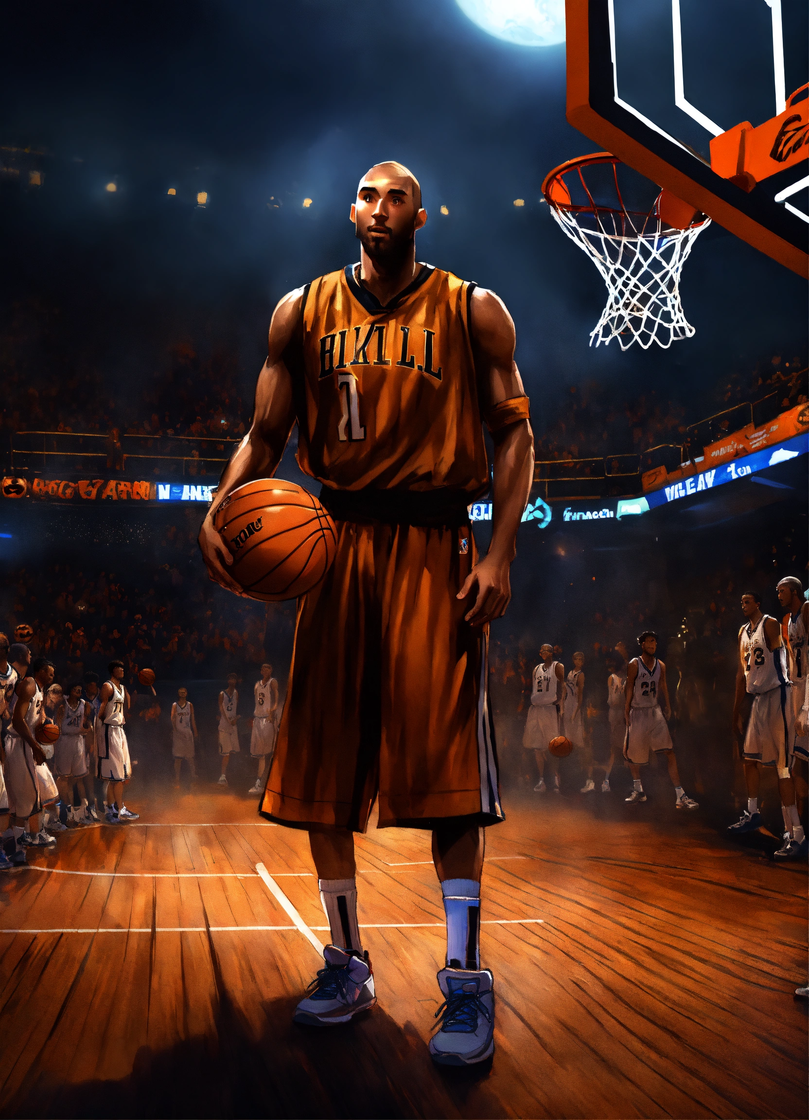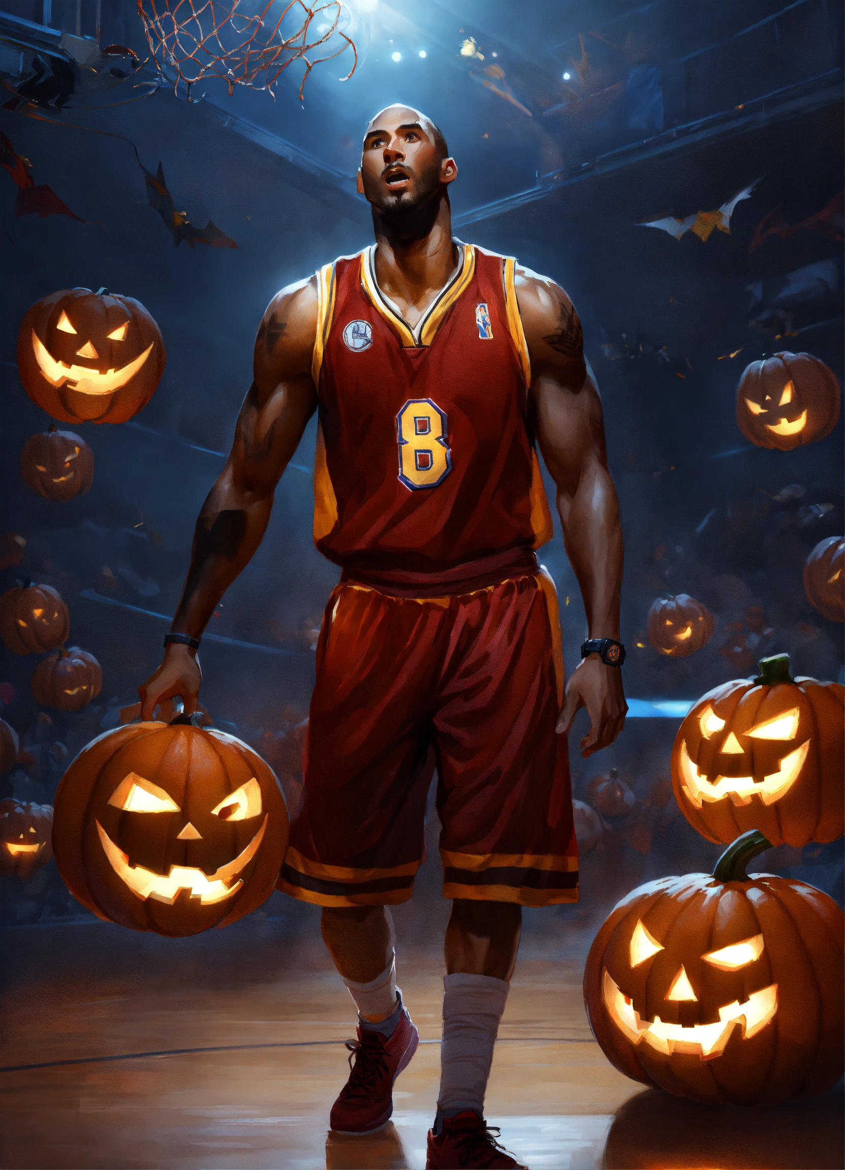 Kobe bryant steps onto the eerie wearing freddy krueger accessories, moonlit basketball court in a spooky halloween. as the chilling winds howl and ghostly shadows dance, faces a team of otherworldly opponents. describe the thrilling game, with basketballs glowing like jack-o'-lanterns and the court surrounded by ghostly spectators, as showcases his legendary skills in this halloween-themed basketball showdown, full body potrait, full long highly intricate detailed, light and shadow effects, intricate, highly detailed, digital painting, art station, concept art, smooth, sharp focus, illustration, advanced digital anime art, atmospheric lighting, detailed face, 8 k, hq, artstation, by stanley artgerm lau, wlop, rossdraws