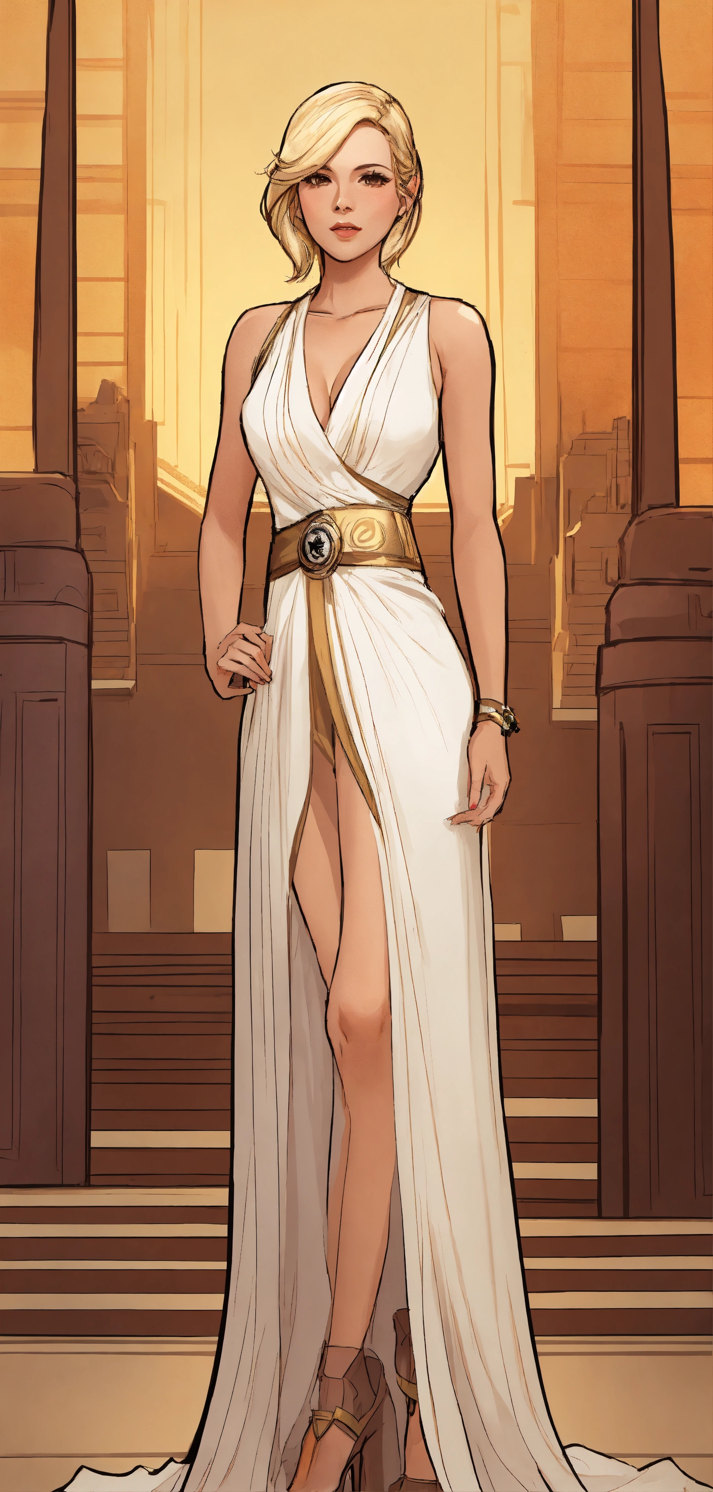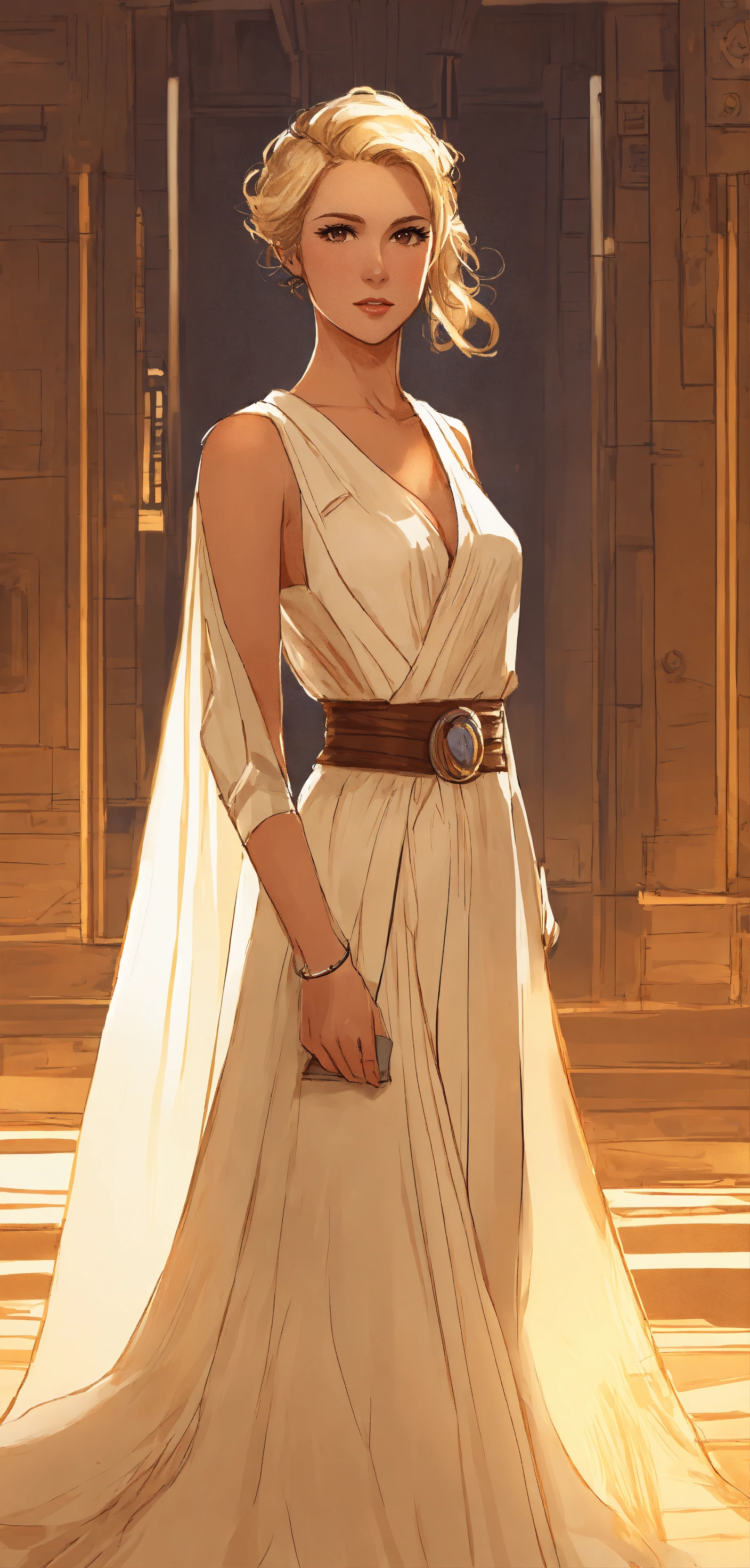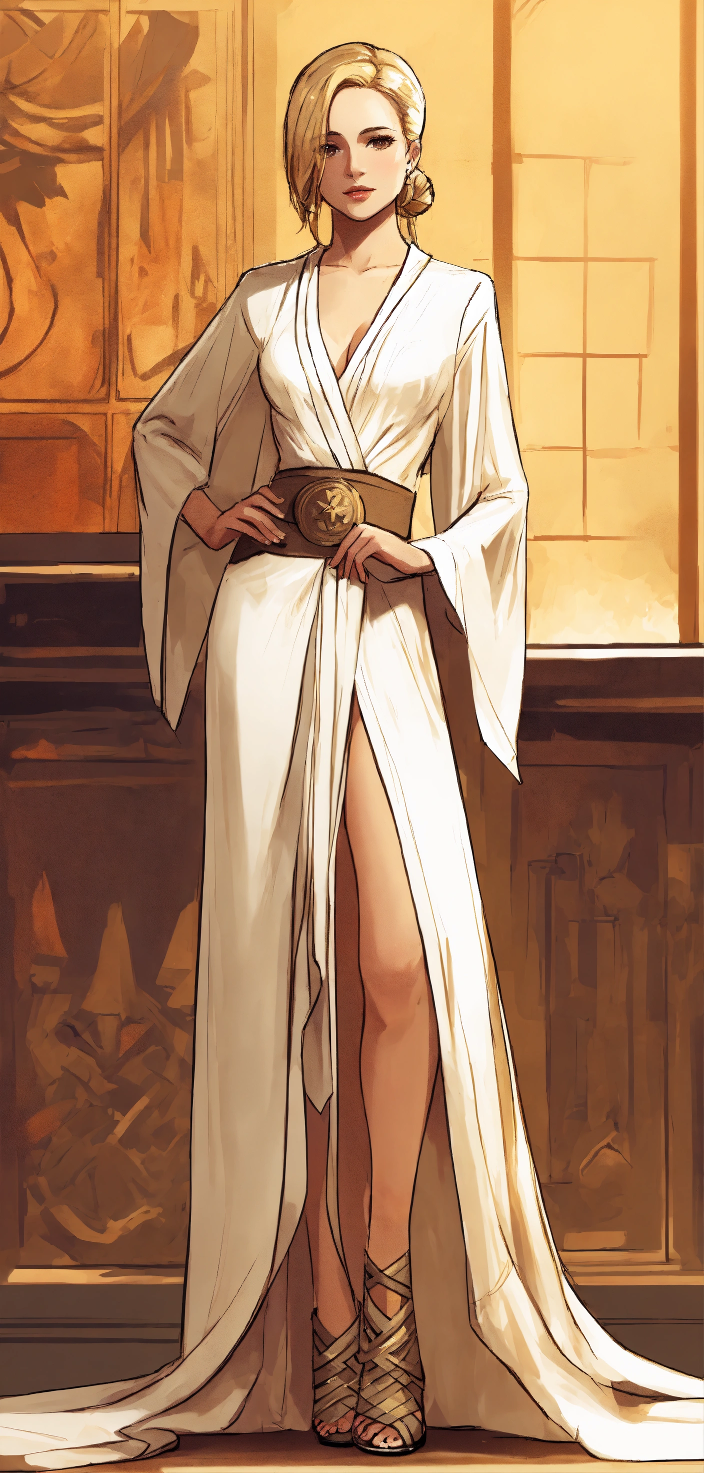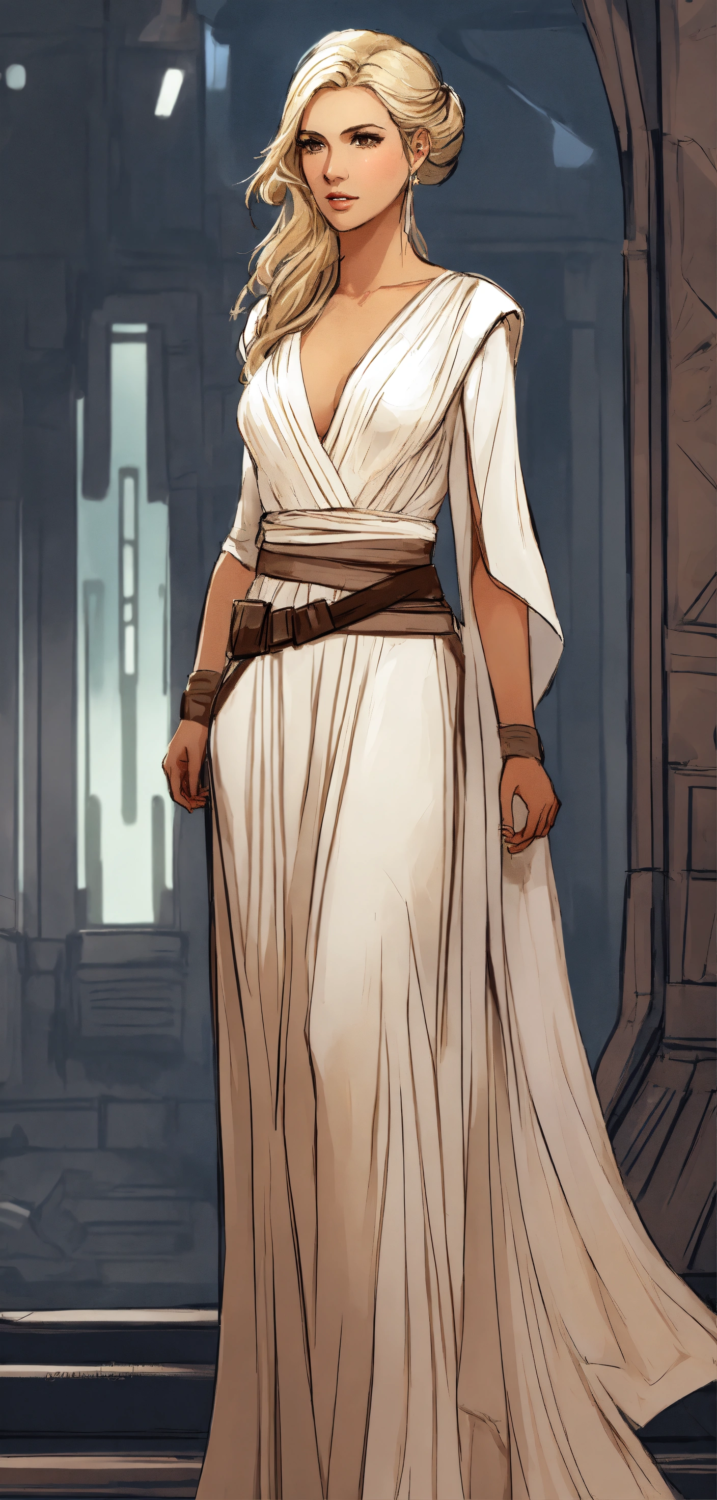 In sketch style, character art of a shy star wars diplomat woman in her thirties with straight blonde hair and dark brown eyes, wearing a floor-length, low cut white dress and heels.