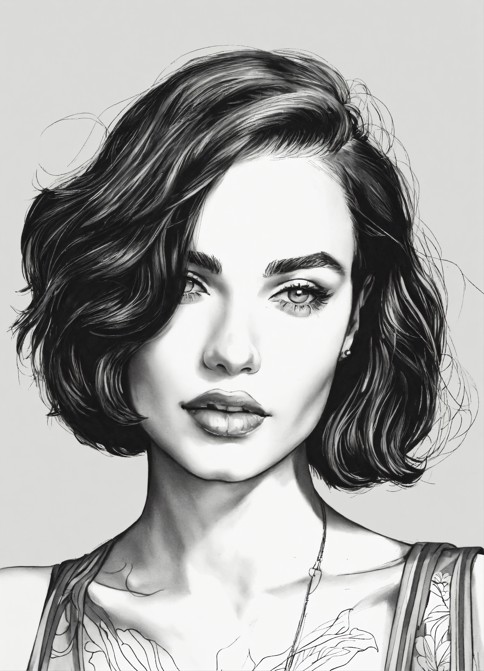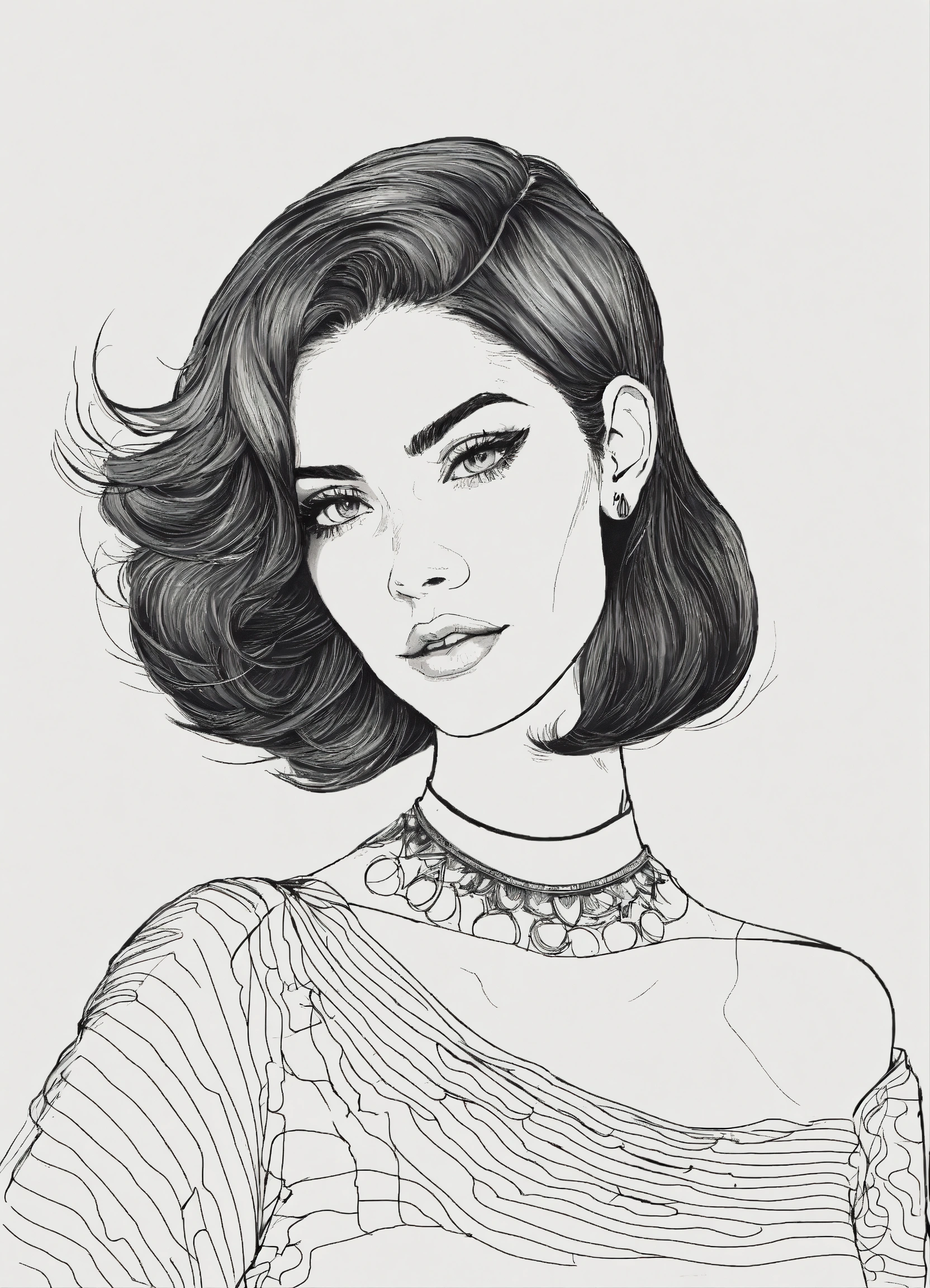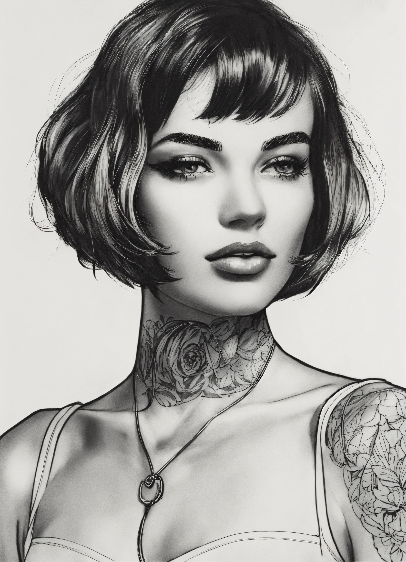 Black and white line drawing, woman, with a bob, upper body, lines, shoulders, smirking, retro, neck tattoos, white background