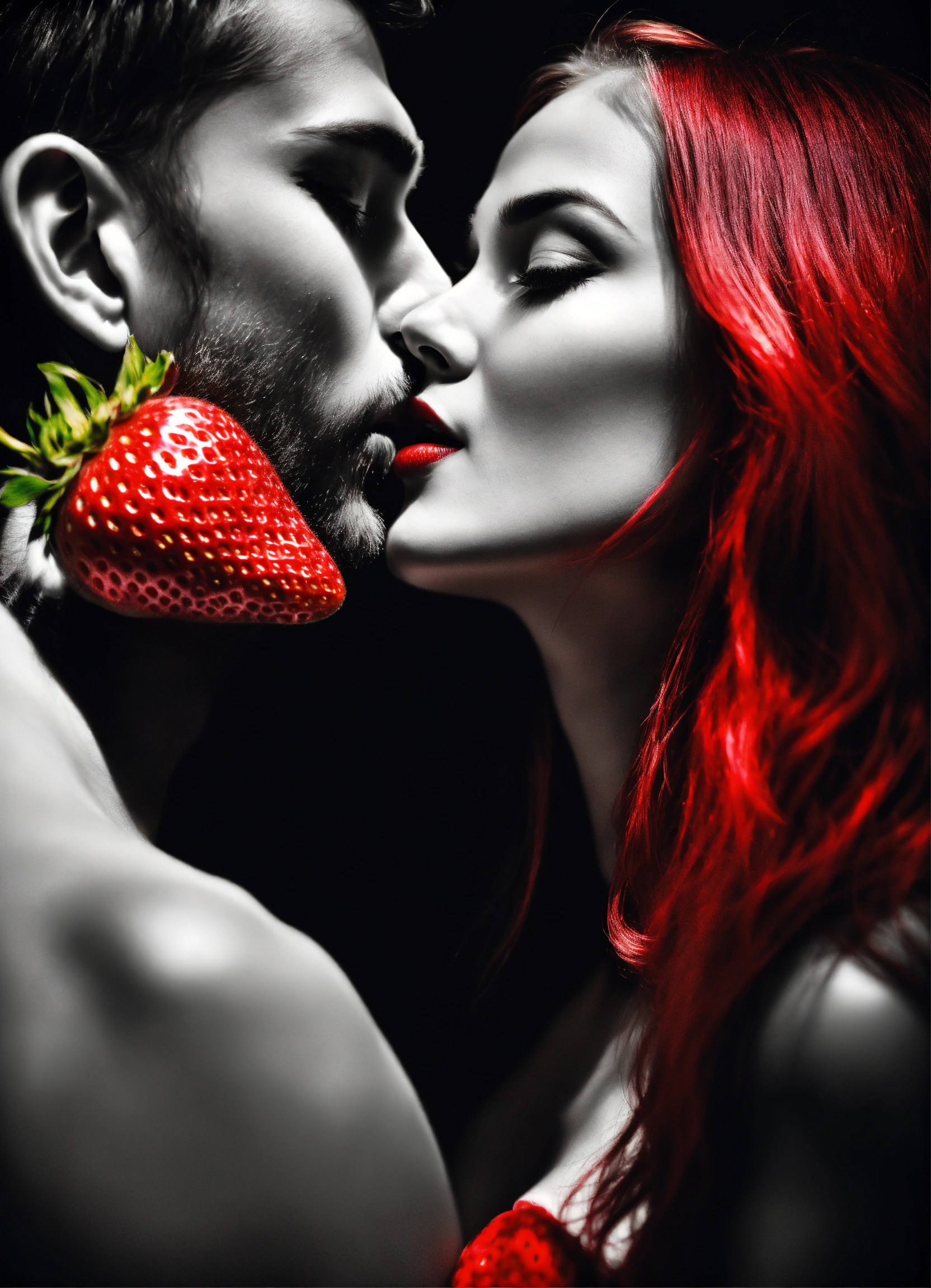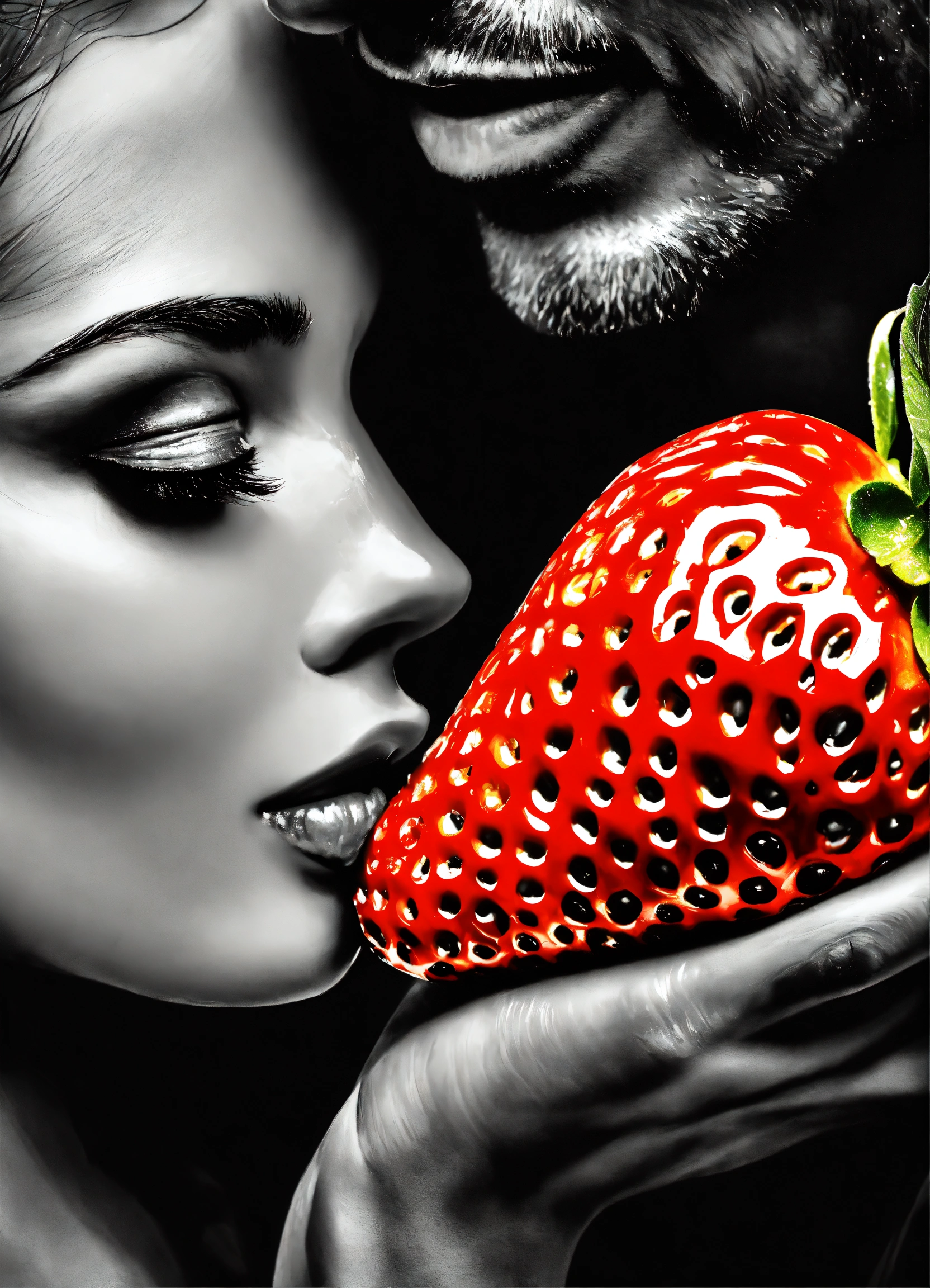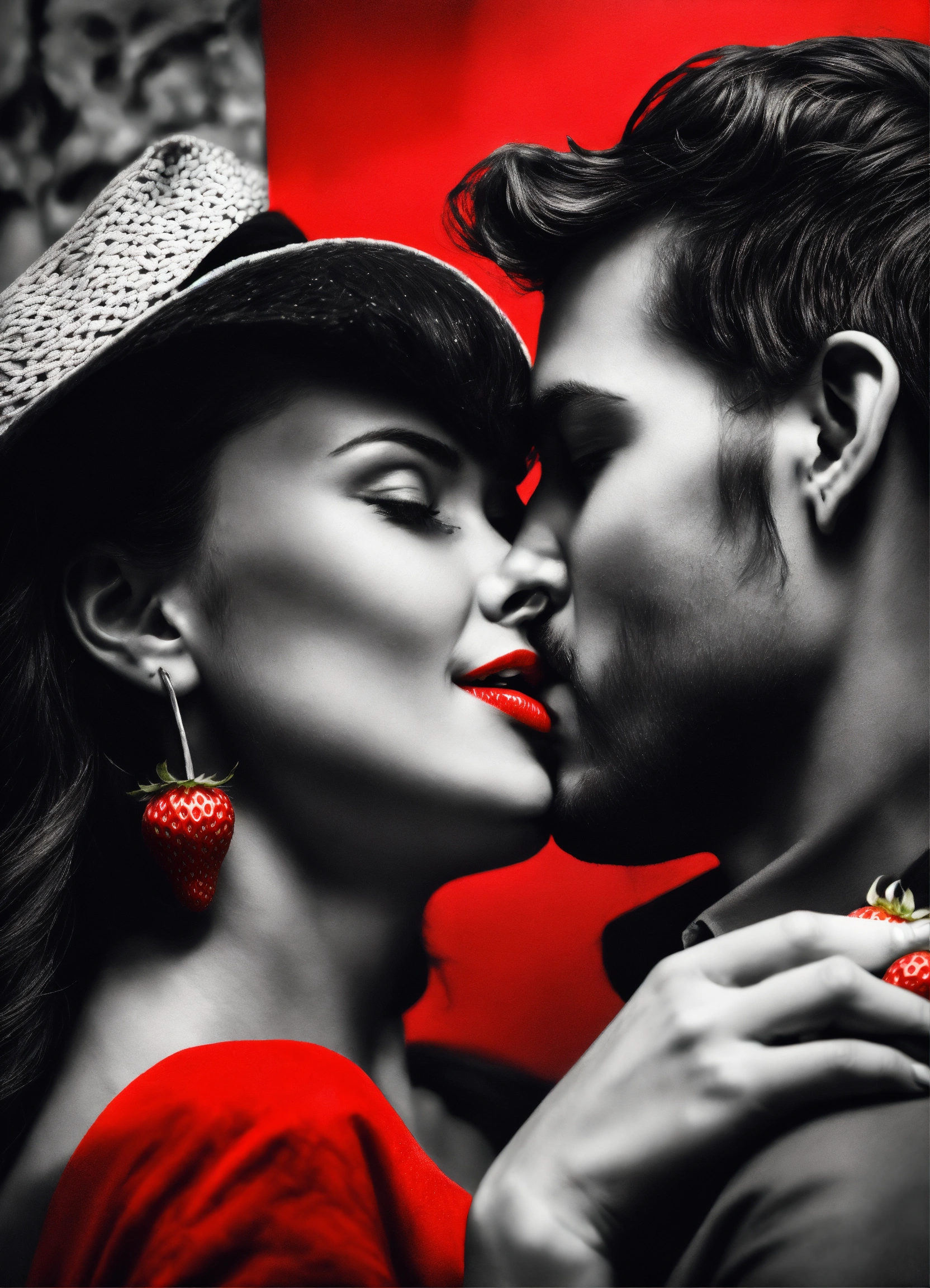 Fusion art of pop art and old black and white fade photography, of a passionate attractive strawberry kiss between a handsome man and a beautiful woman, passionate, loving, romantic, shades of grey with a tinge of light red, silver accent, romantic and modern style, novel art, high artistic value, emotional depth and expression