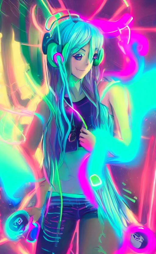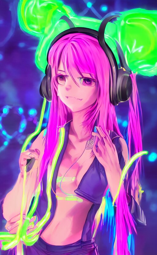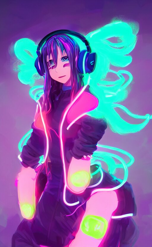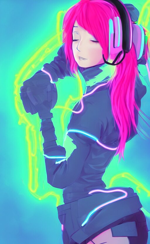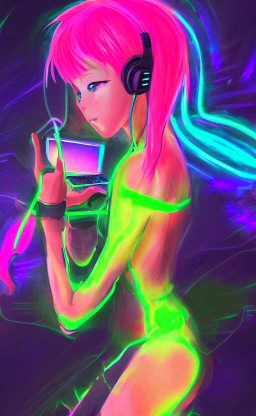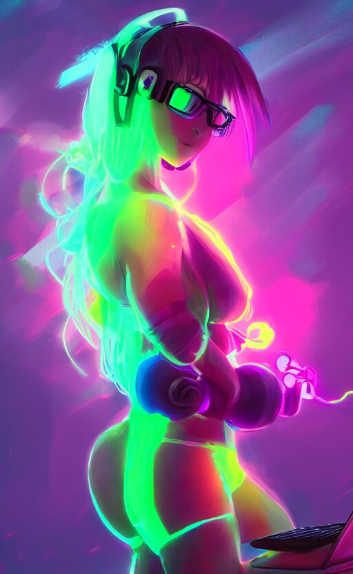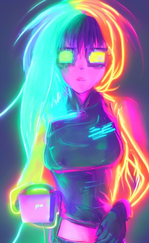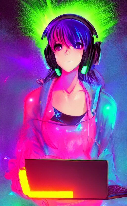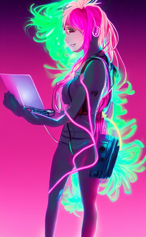 Anime girl with glowing neon hair wearing fit neon clothing and headphones while holding a laptop, wlop, concept art, digital painting, trending on artstation, highly detailed, epic composition, 8k uhd