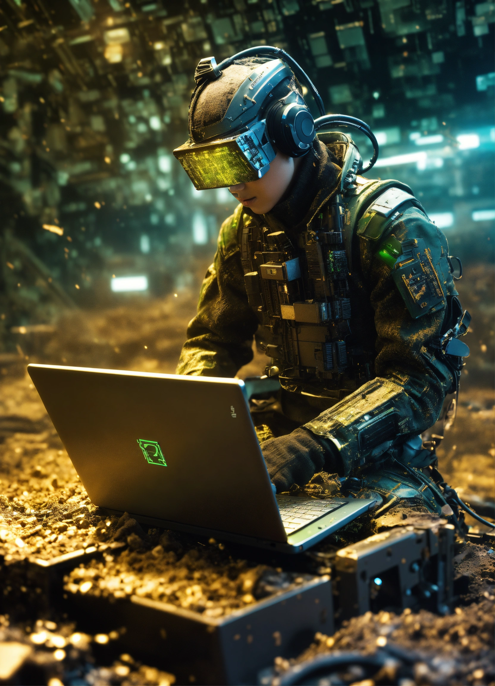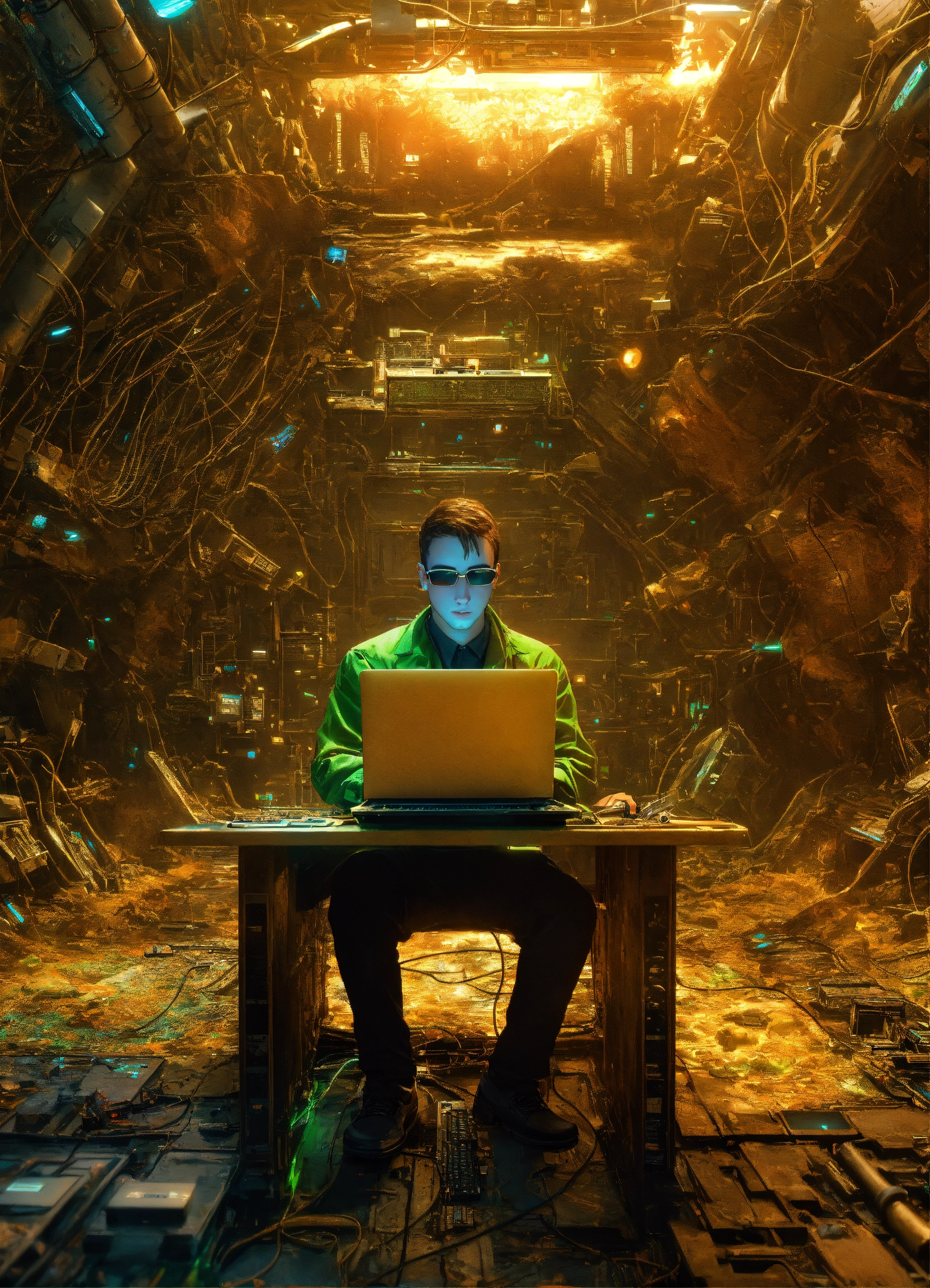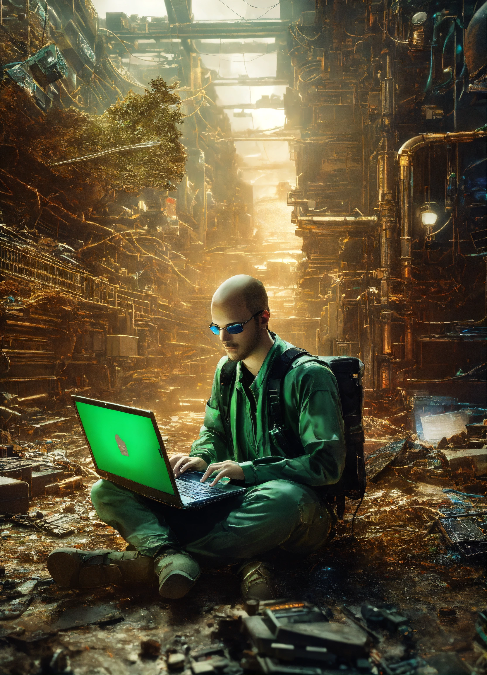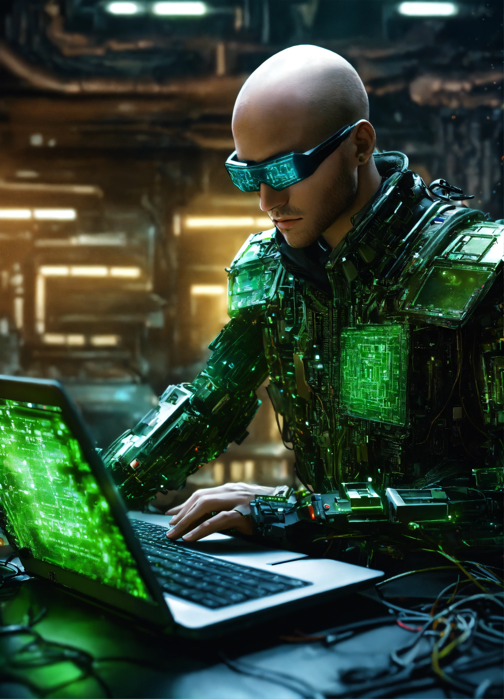 Computer scientist with a laptop, image in the matrix universe style, fantasy, magic, hyper realistic, detailed render, extremely complex and advanced chassis, natural dirt and debris detail, scuffs