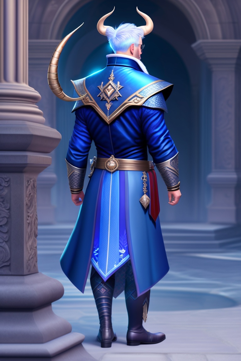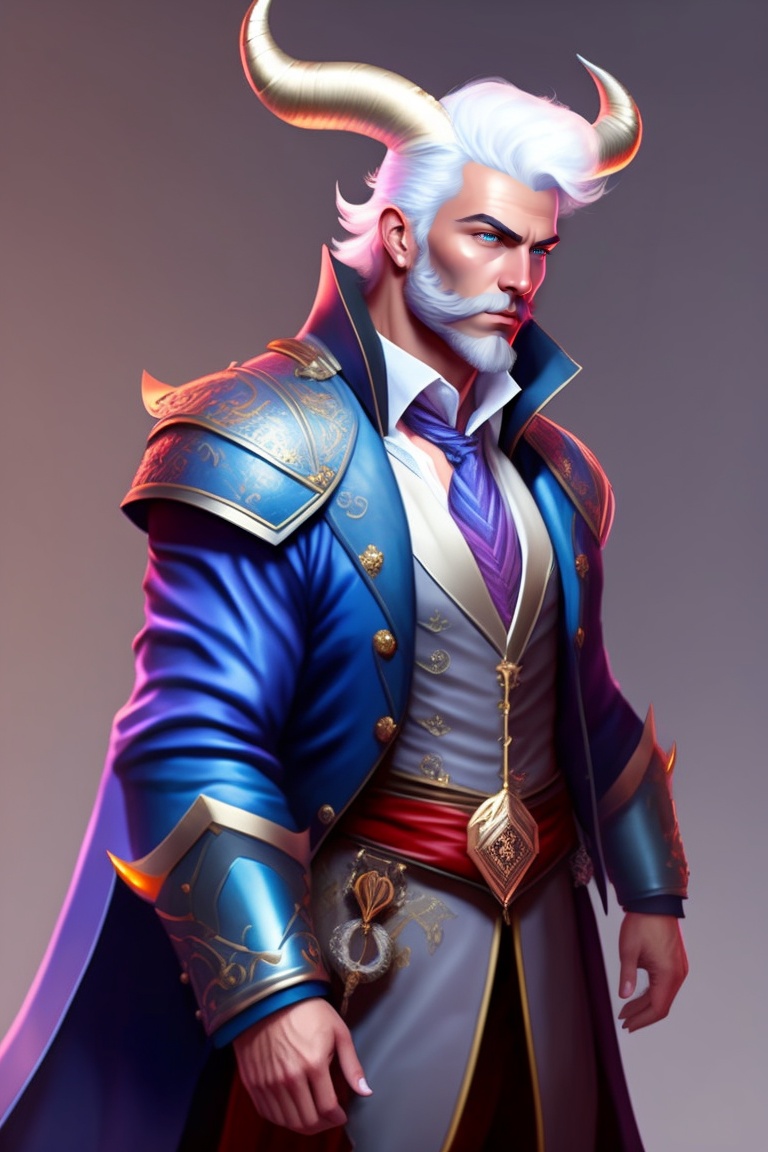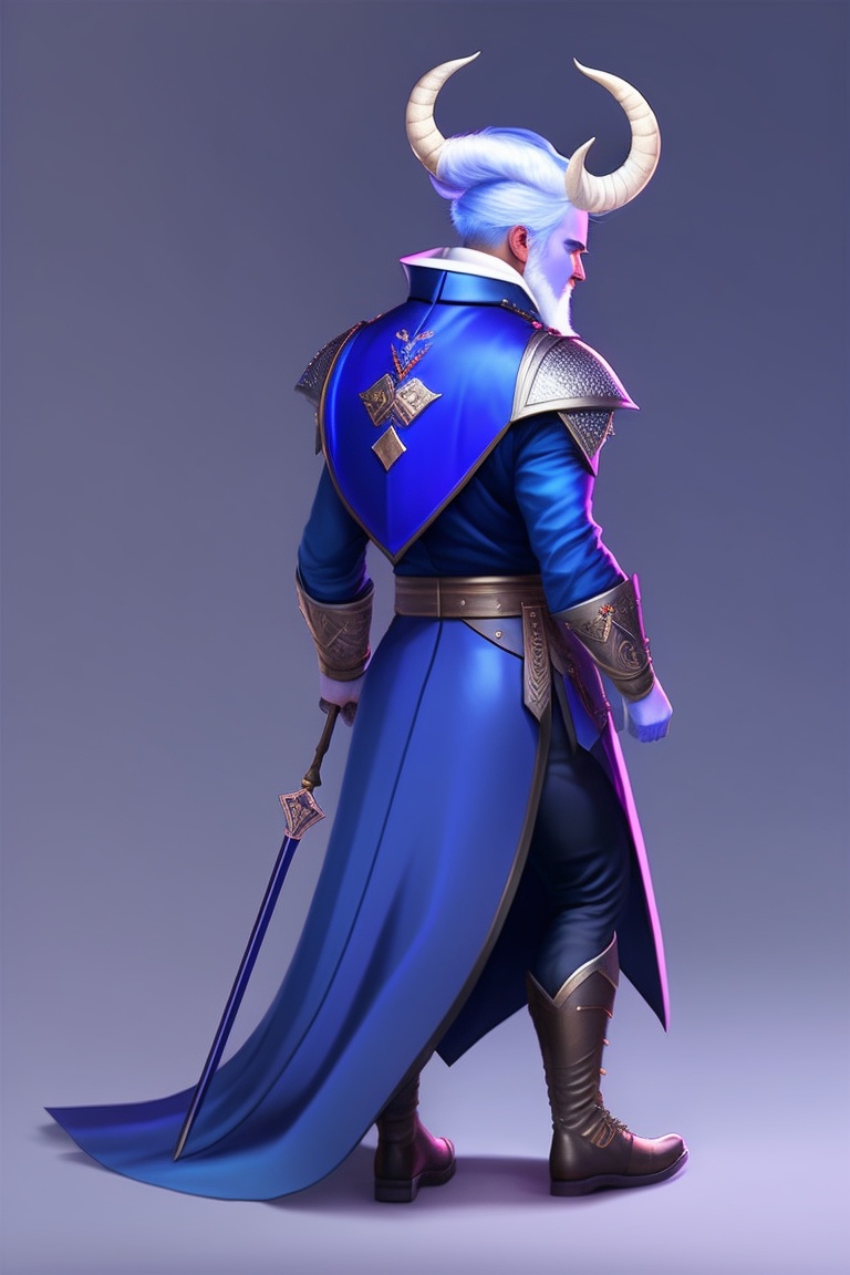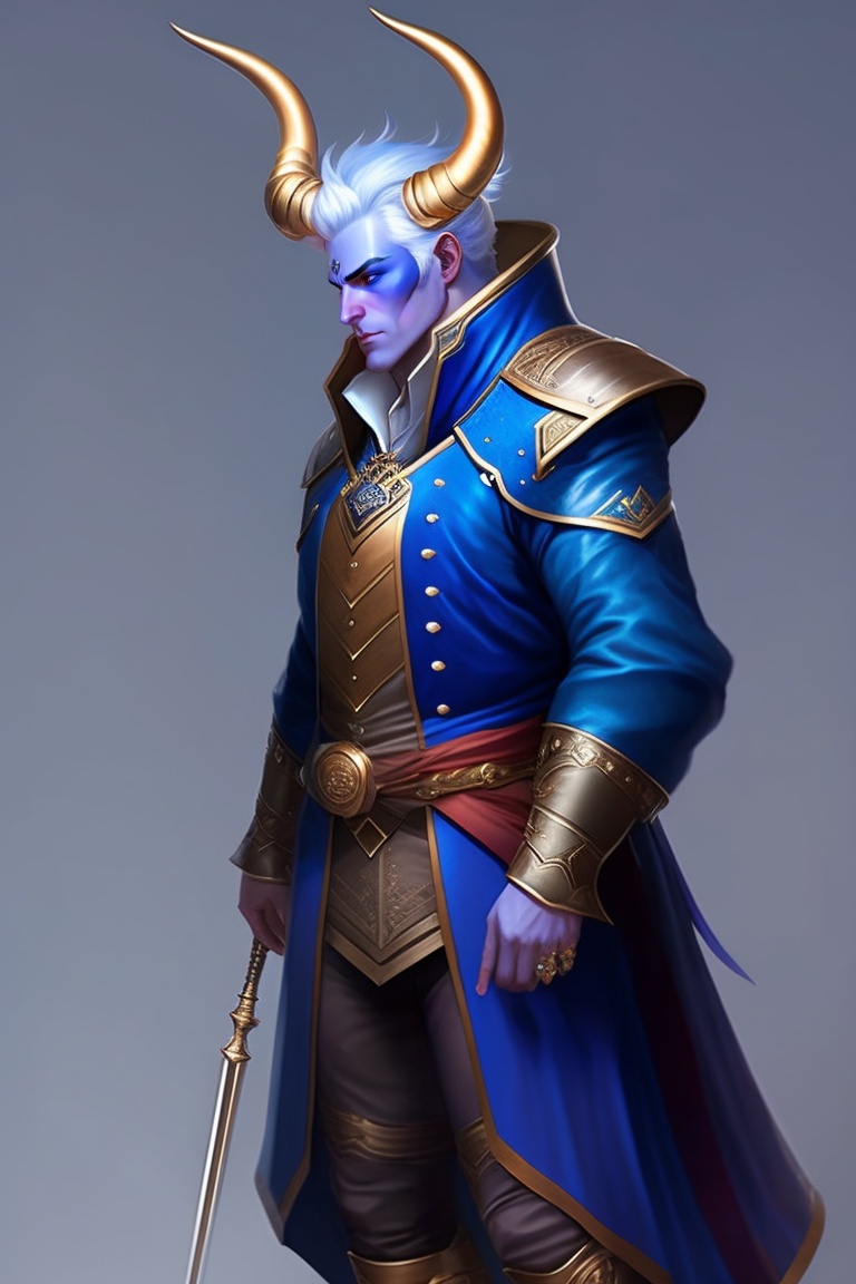 Male tiefling, dnd, dnd 5e, blue skin, dark blue skin, white hair, walking cane, fancy coat, pretty clothing, large horns, backwards curving horns, jewelry
