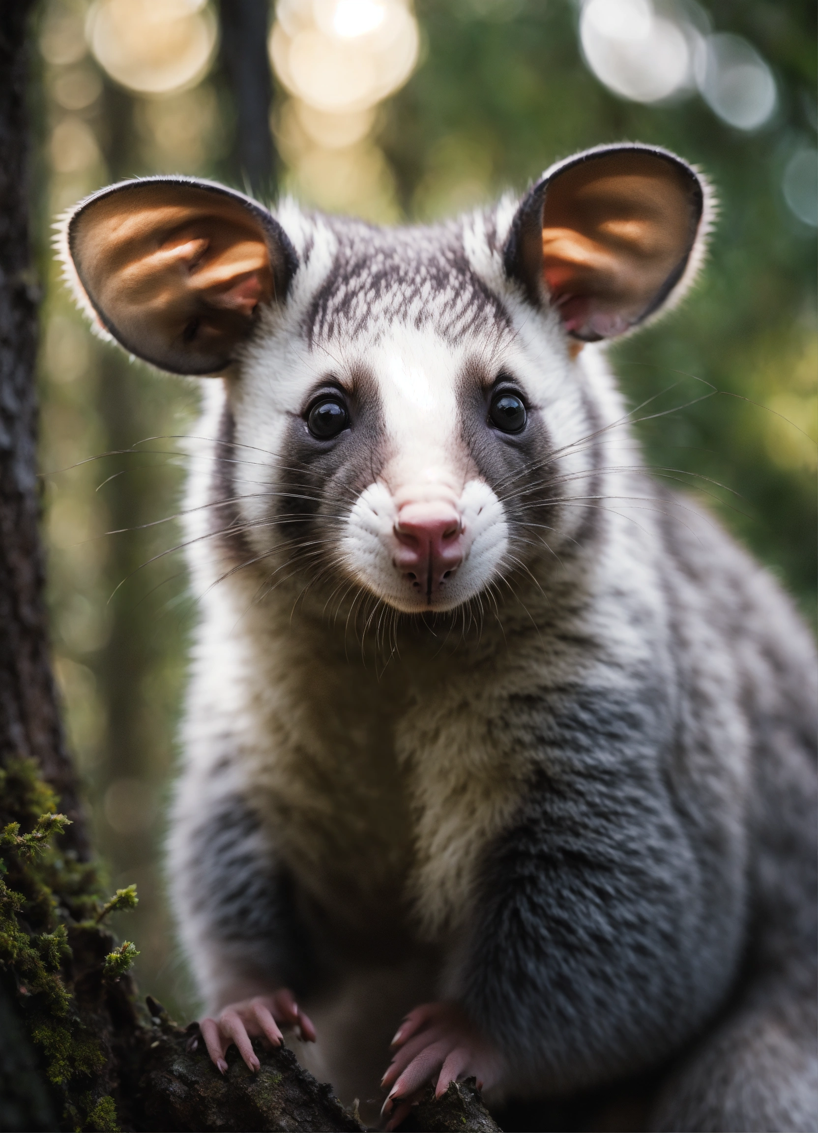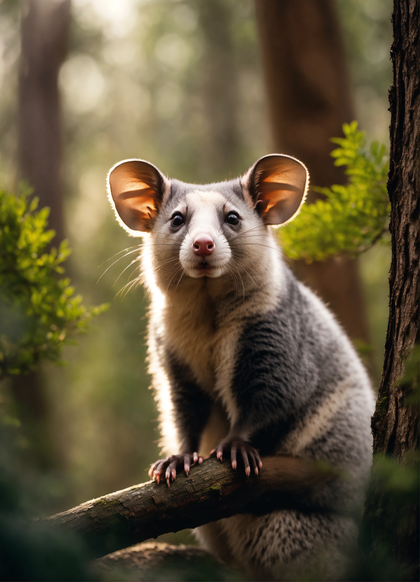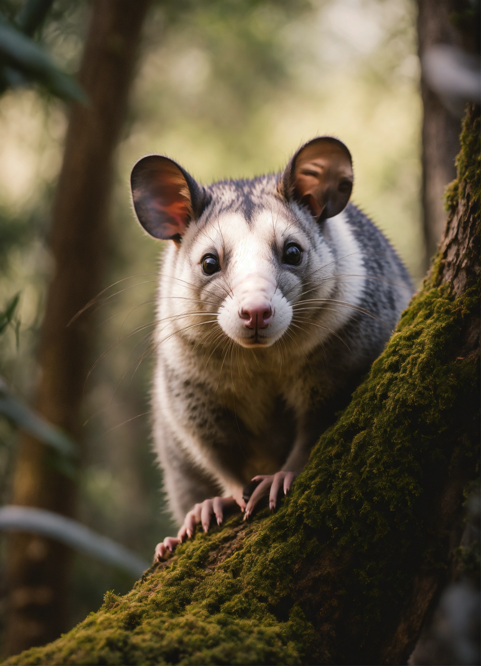 Muted portrait photography from the waist up titled "male possum in a forest", muted palette, soft colors, detailed, 8k