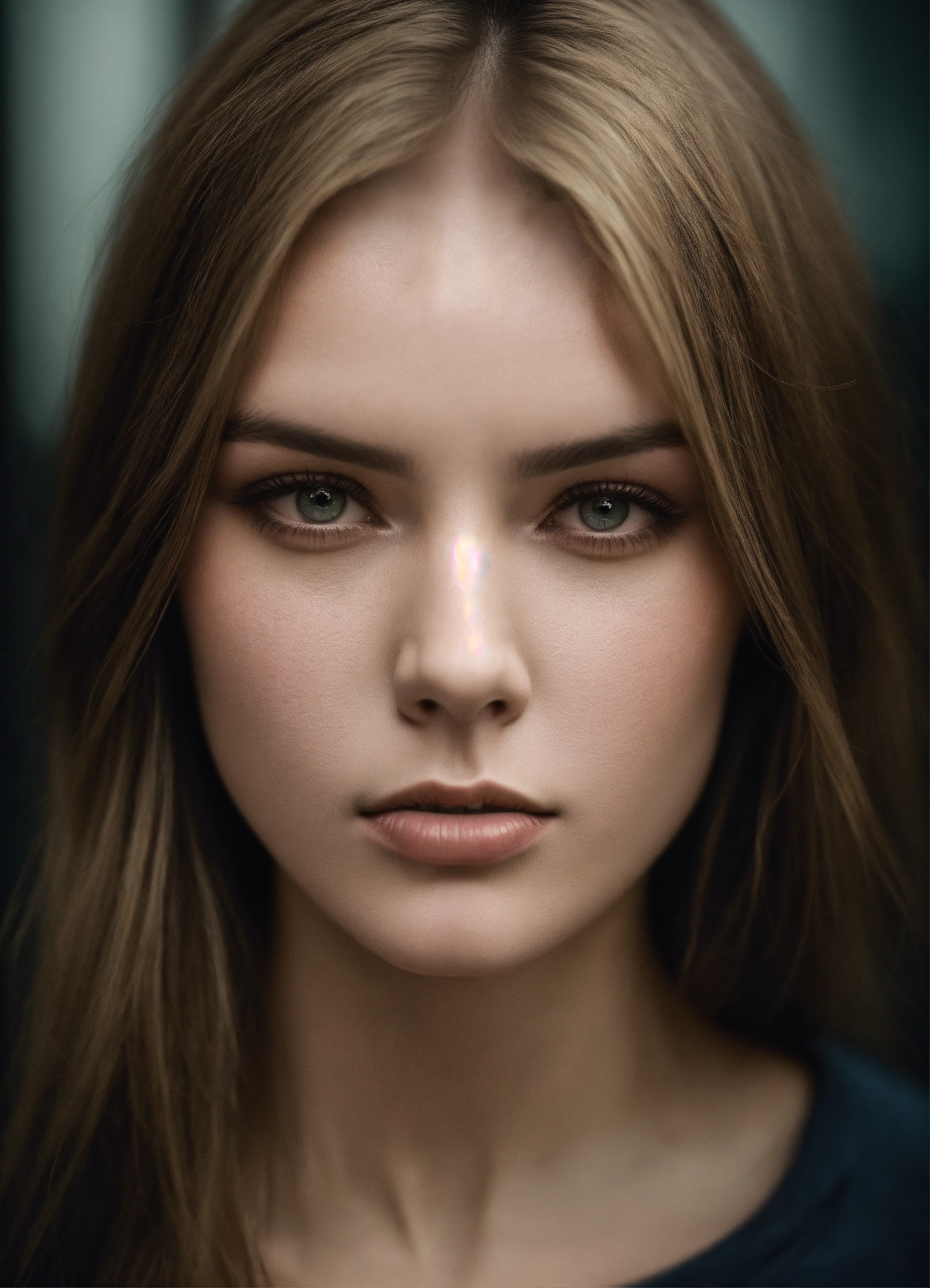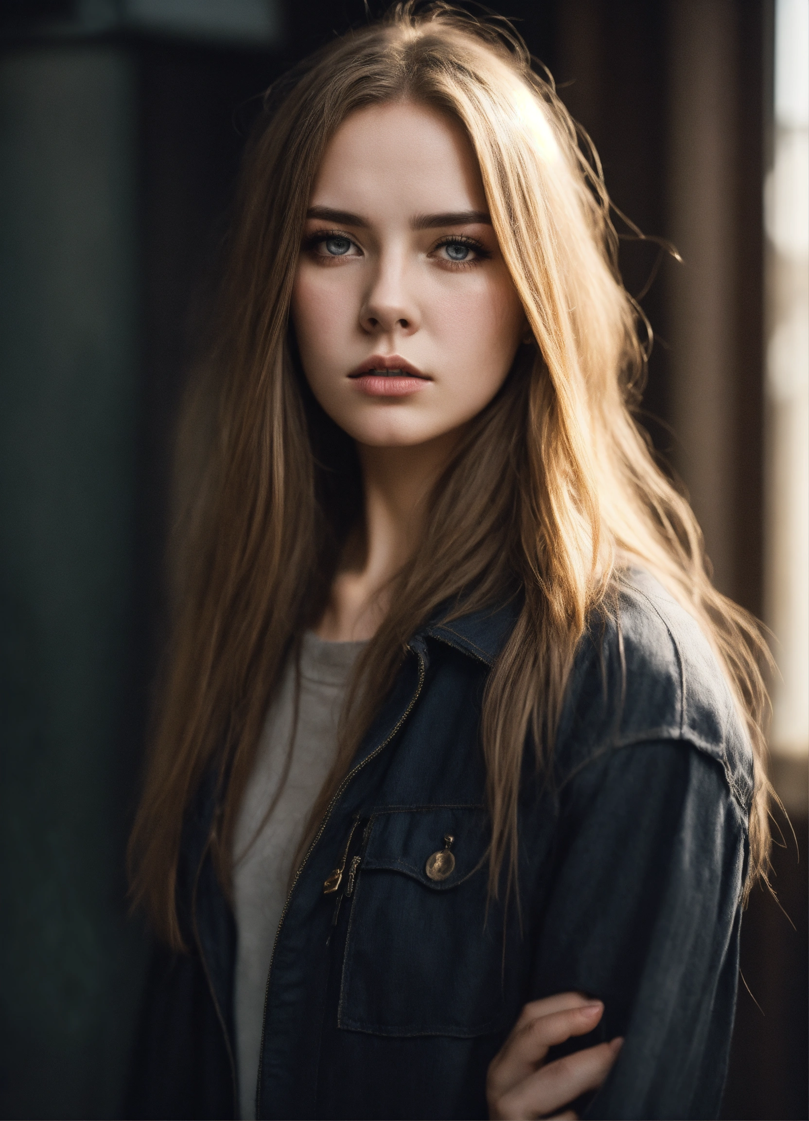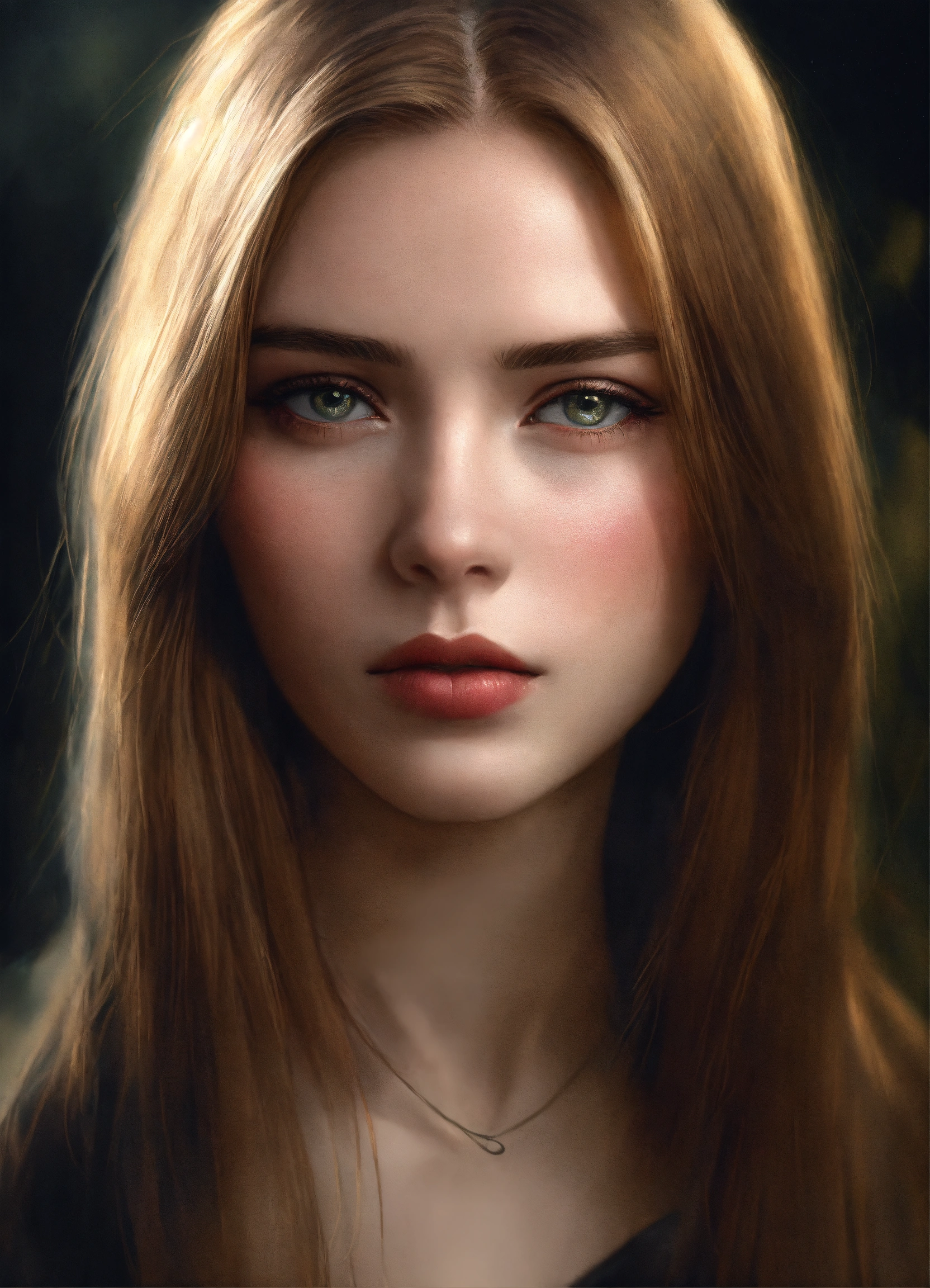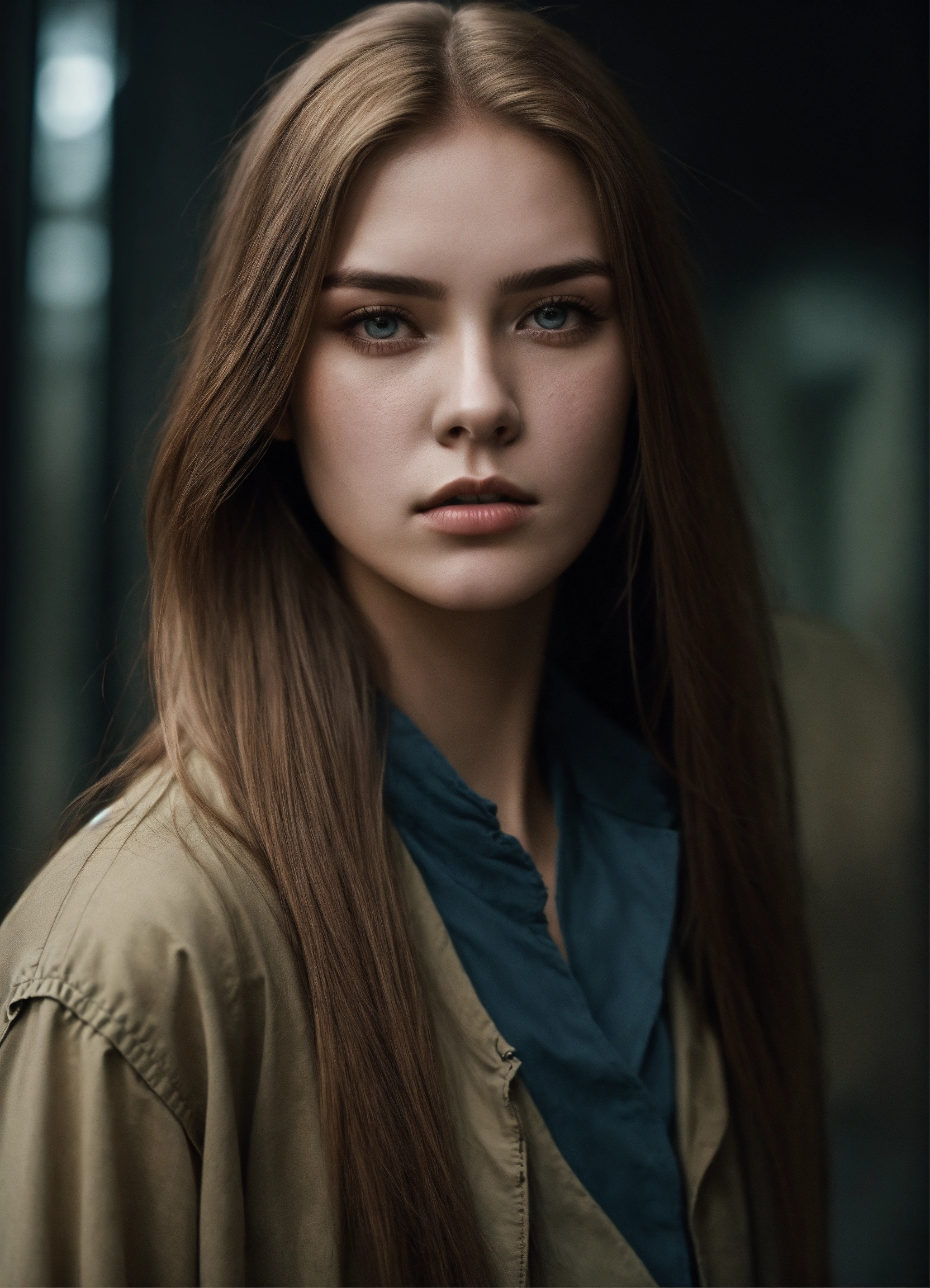 Portrait draw woman with straight light brown straight hair and light eyes, plain face, pale skin, serious look, dystopia, dark loose clothing, wide angle