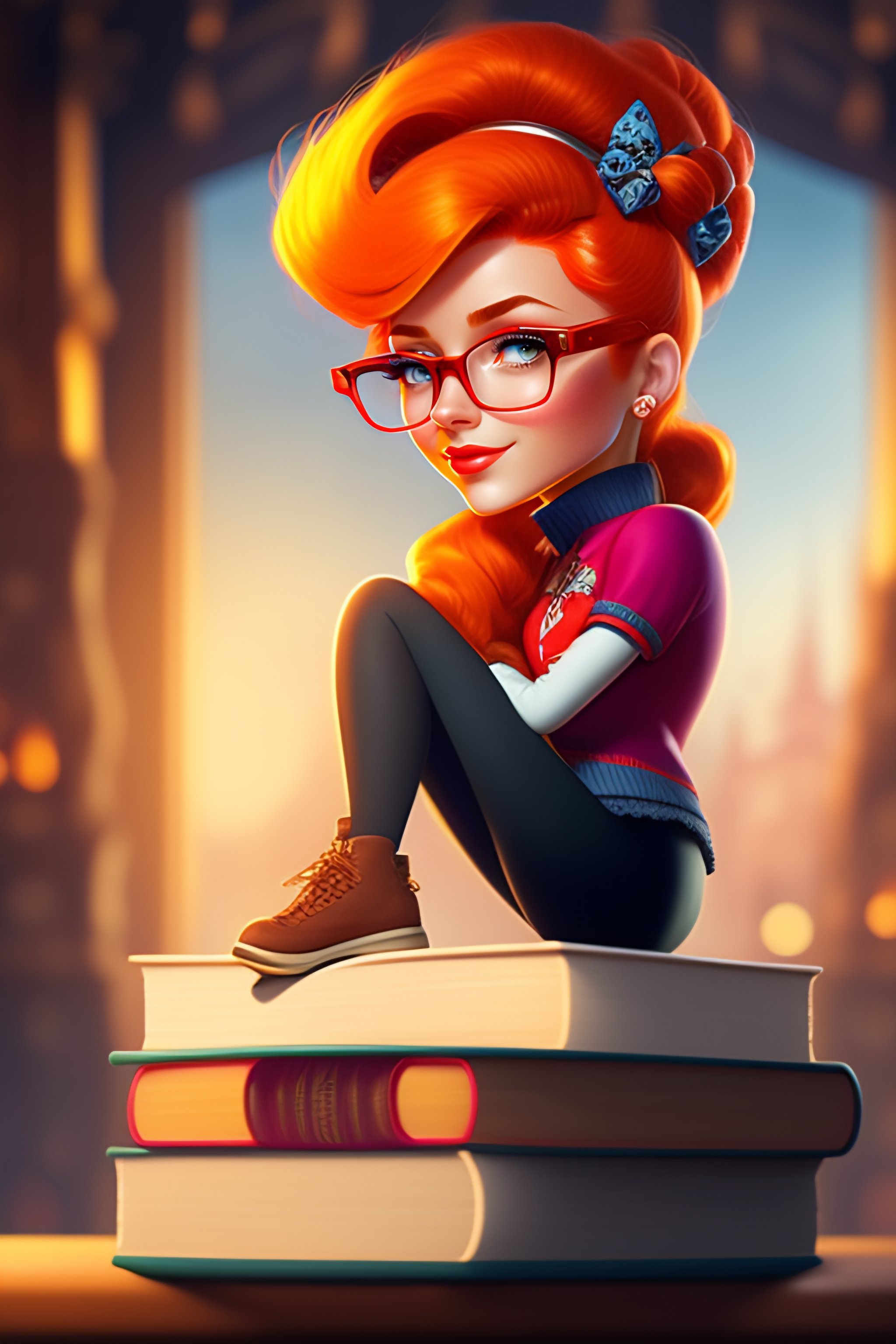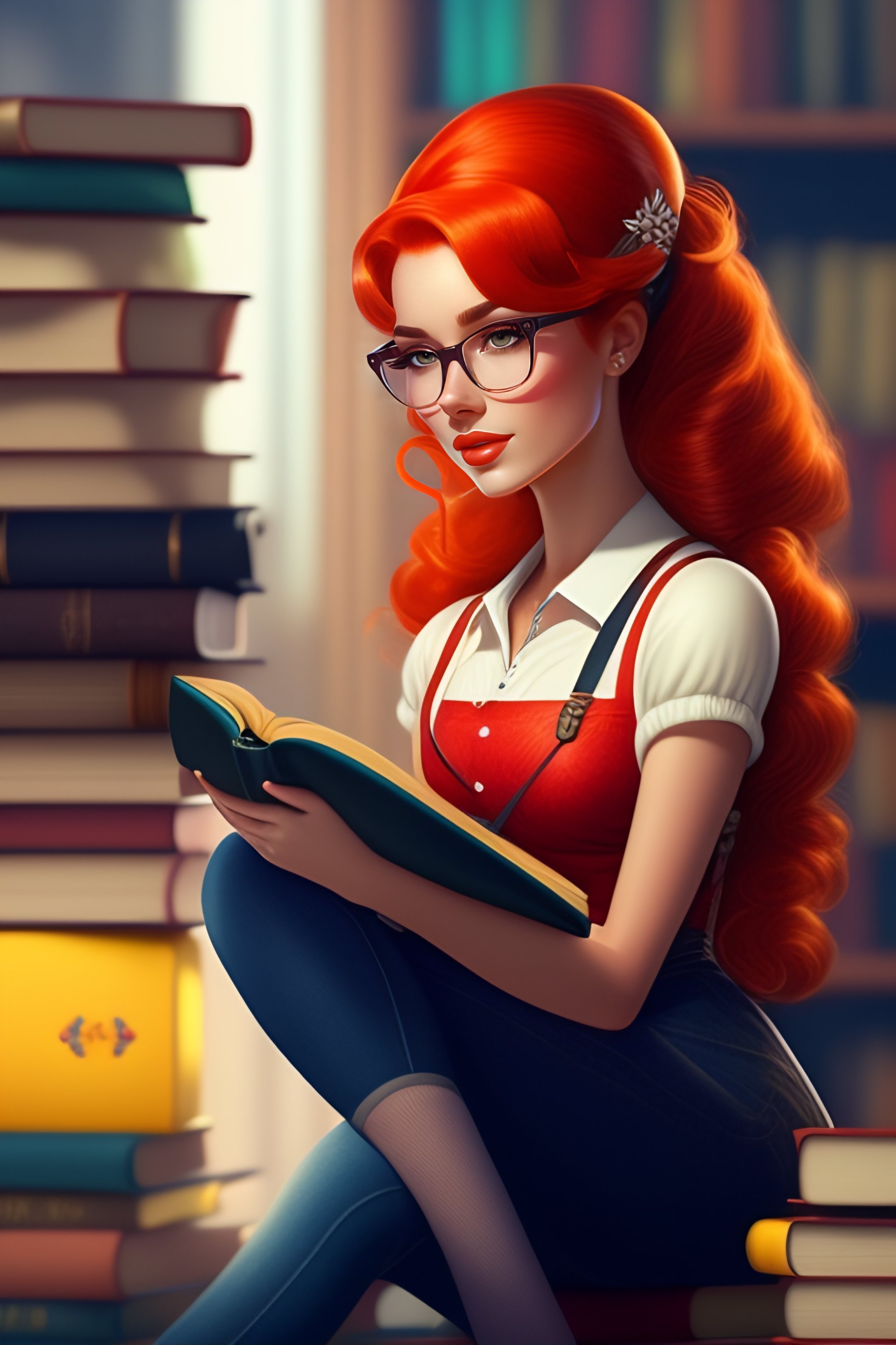 A young woman with red hair in a bun and glasses sits cross legged on top of a pile of books reading a book in a still from a disney movie. beautiful disney cartoon character art, high quality, detailed face