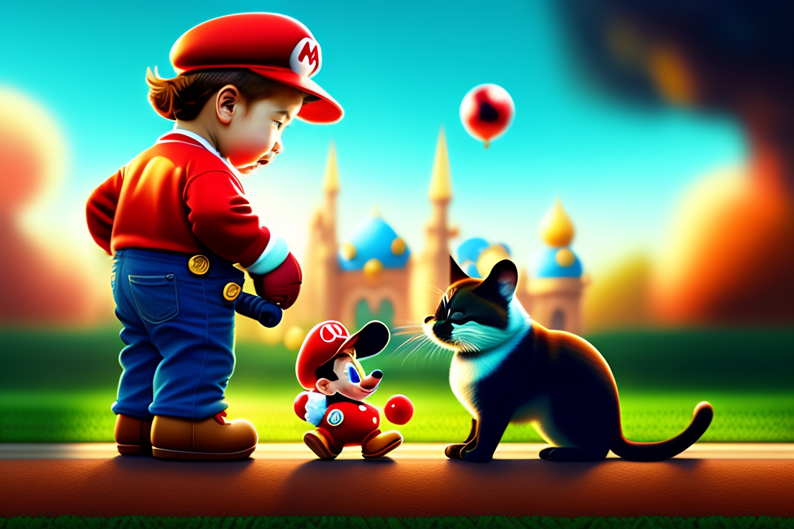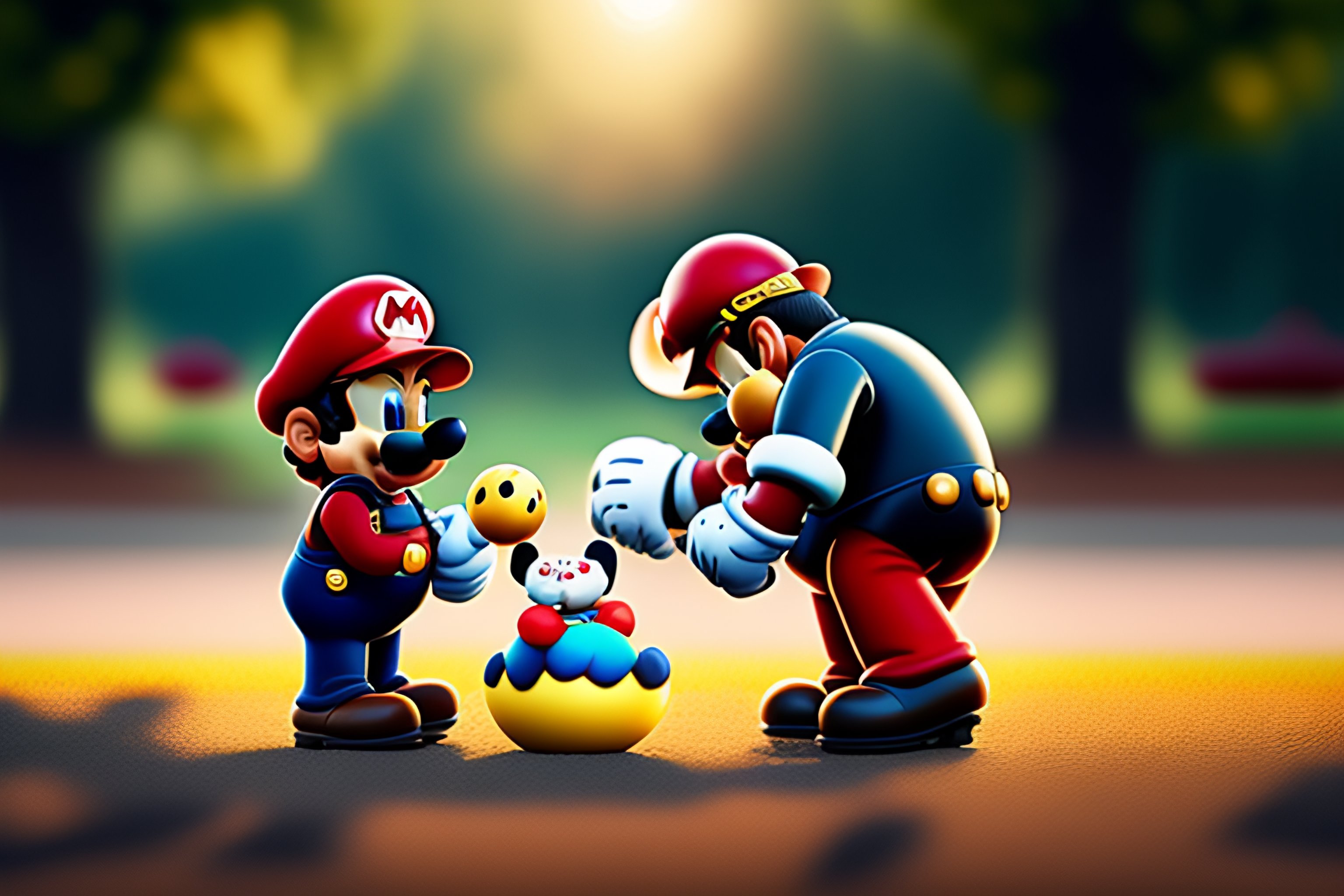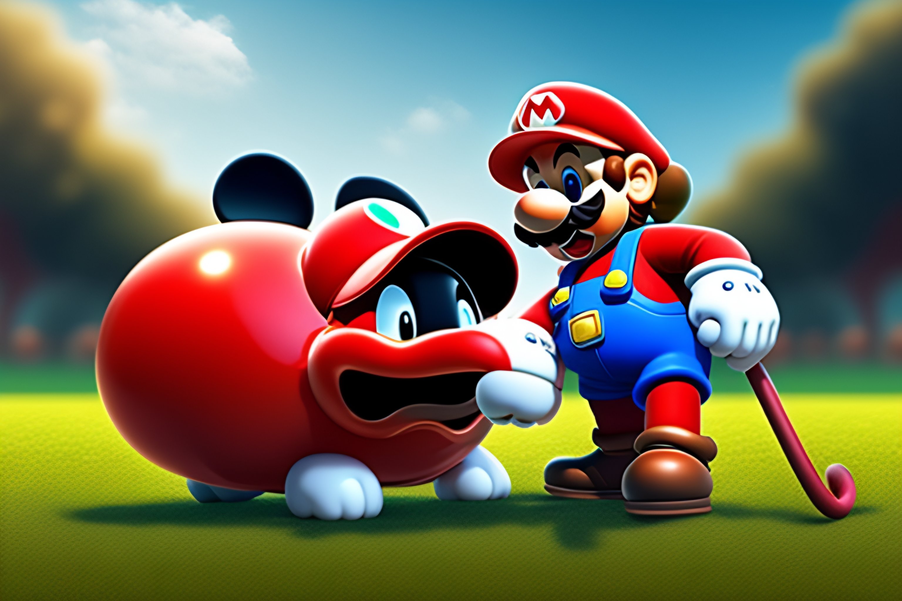 Super mario playing with mickey mouse in a park