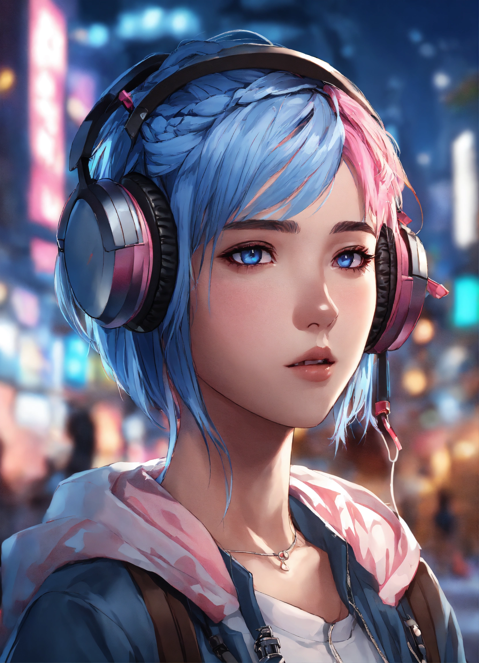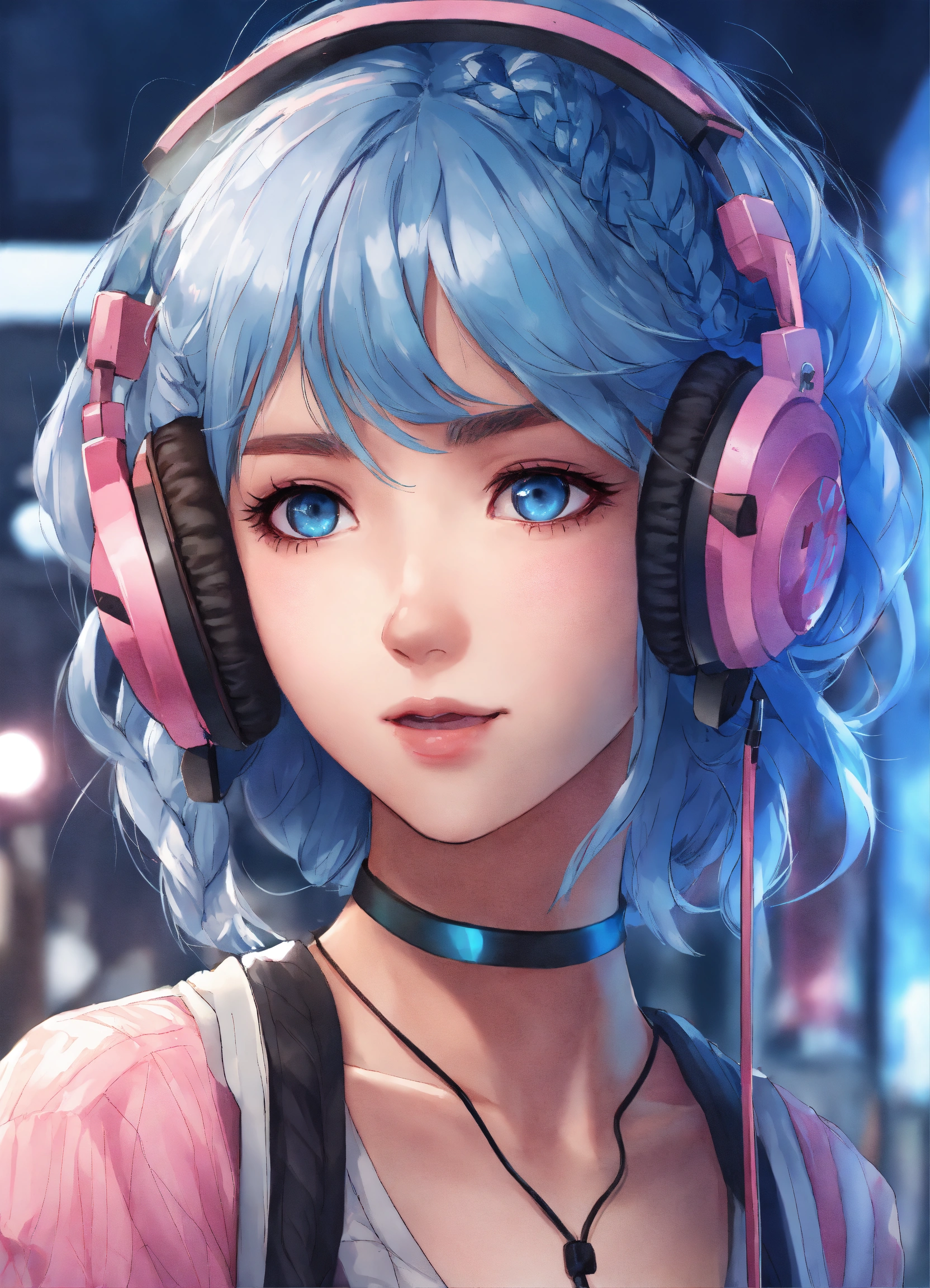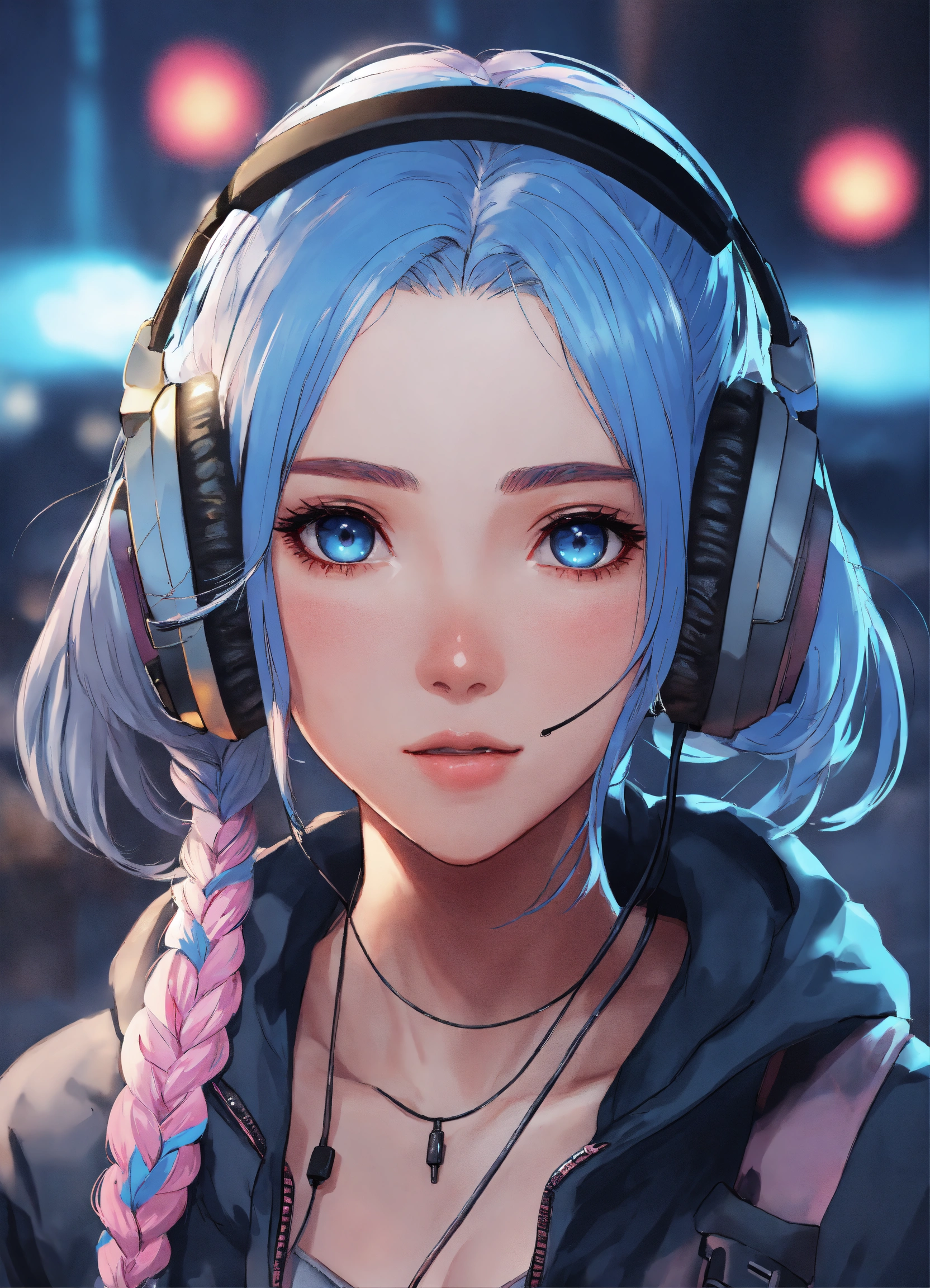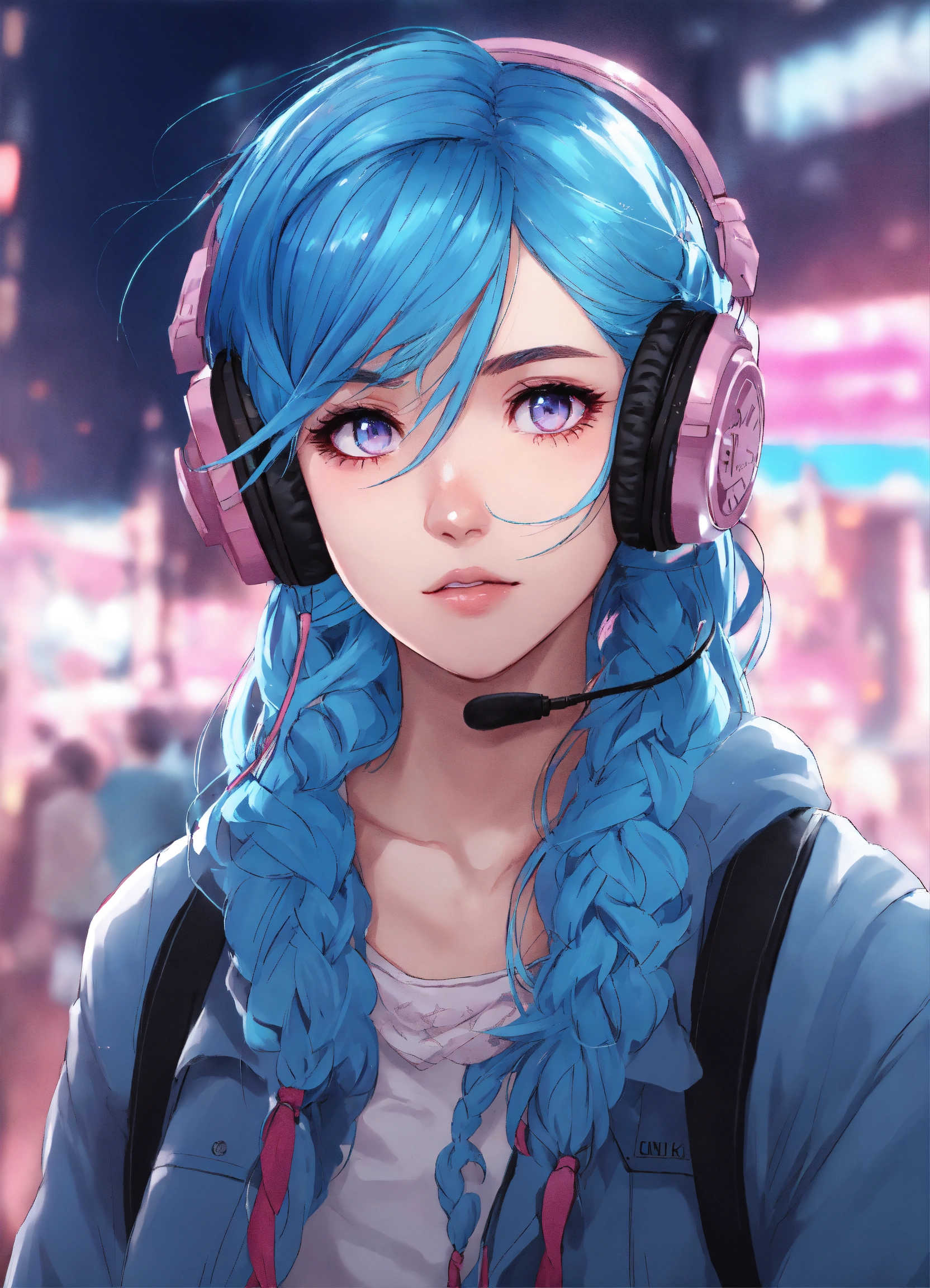1 woman blue hair, braided hair, pink eyes, detailed face 8k, little headphones on the head, style manga, detailed environment, 8k