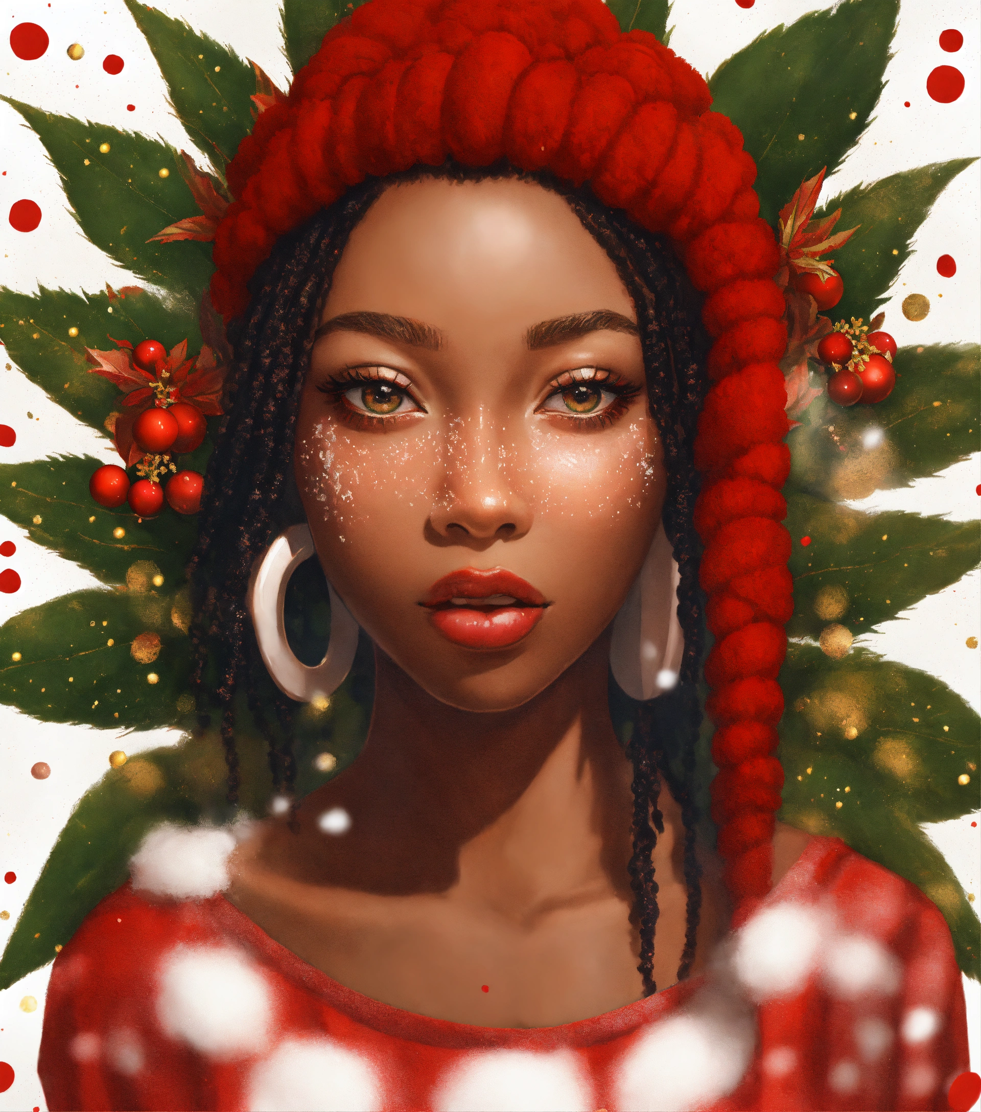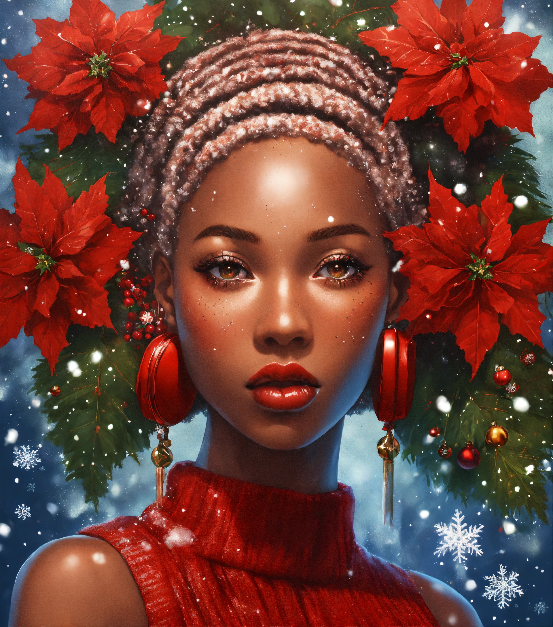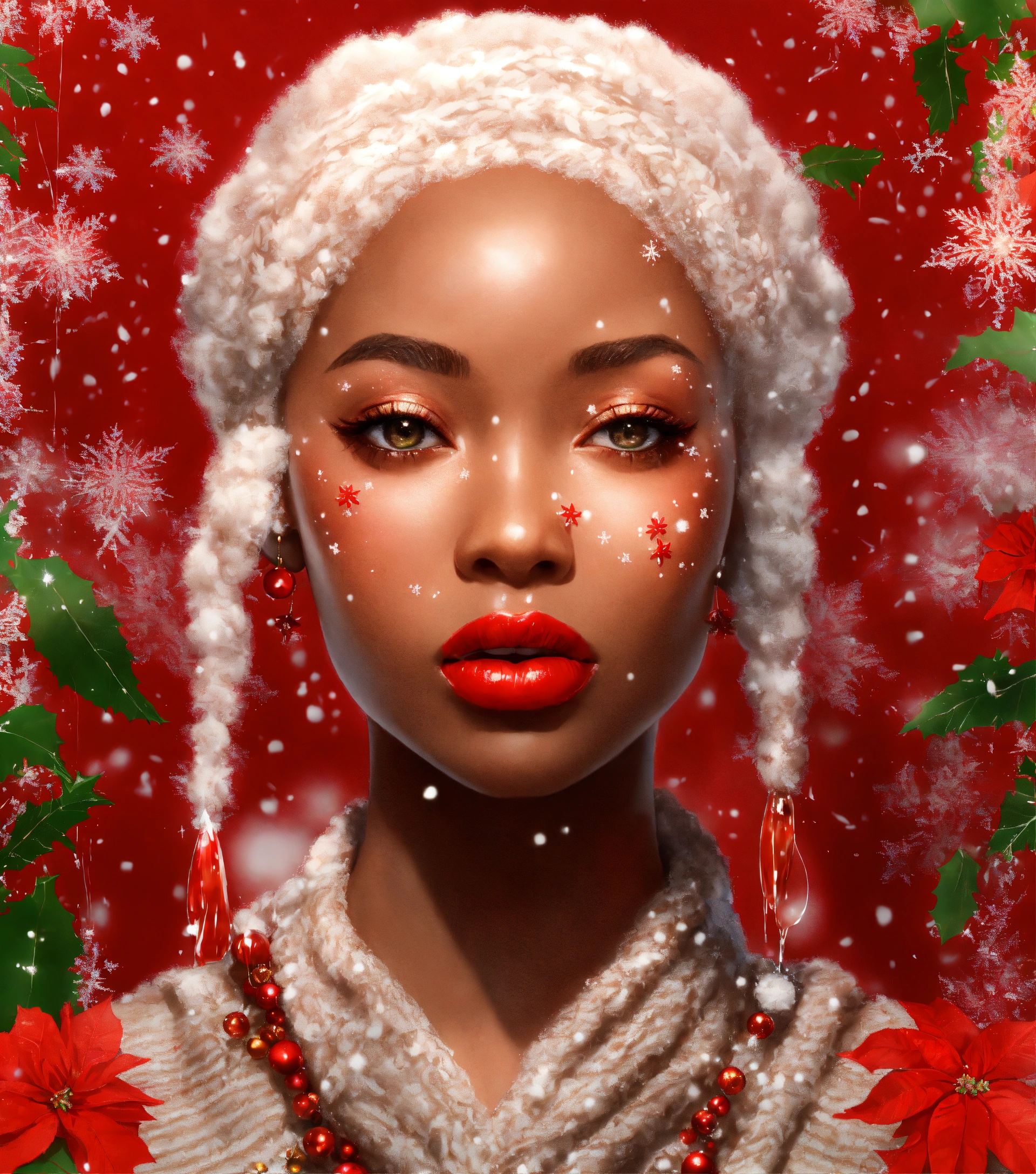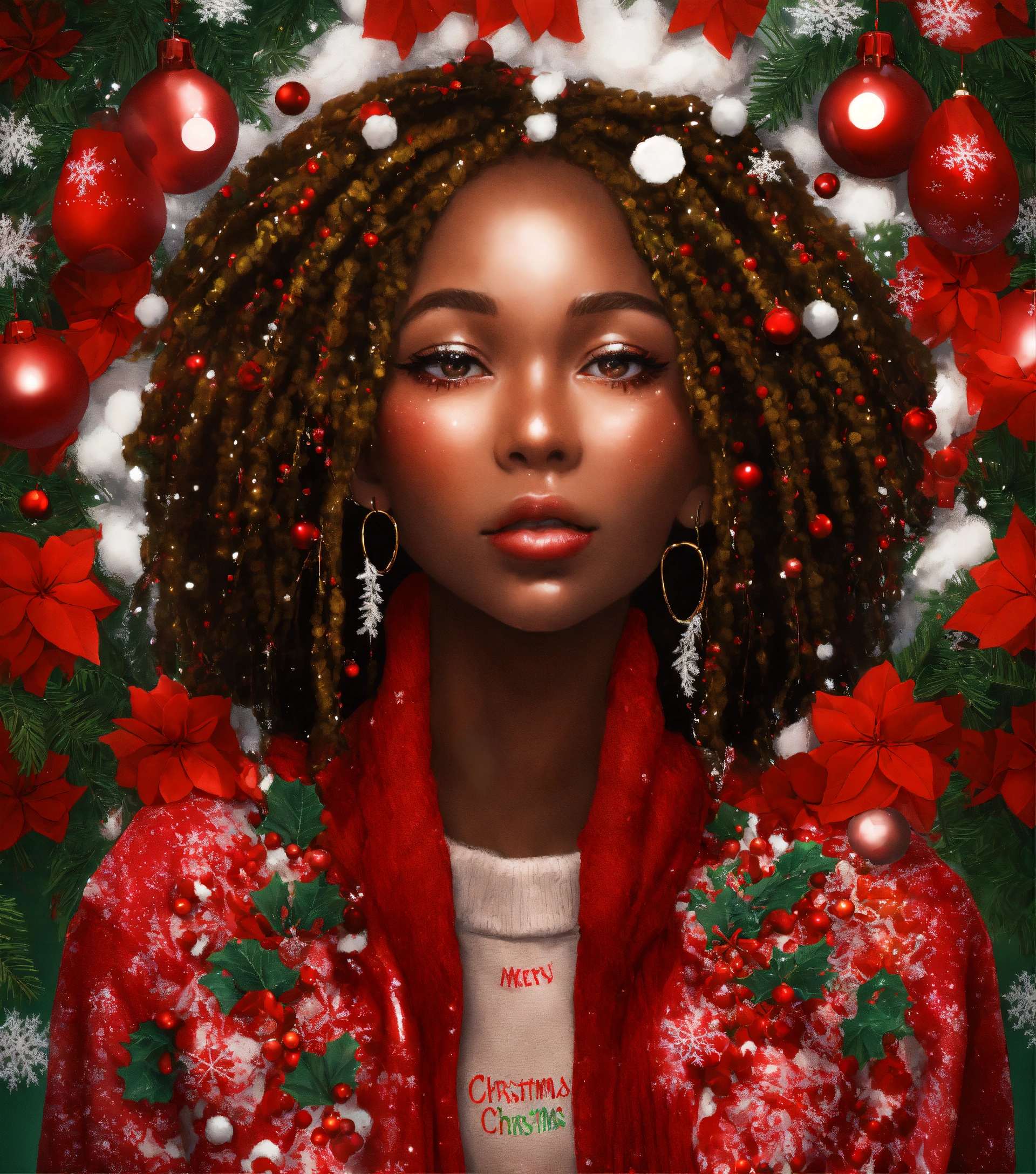 Afrocentric woman, locs, face of clear glass with honey flowing through her visible veins, waterfall of a dripping motor oil like substance and snow and ice flakes flowing over her with christmas traditional seasonal flowers sticking at various pulse points. powdered sugar on lips with flecks falling. wearing a cashmere red check pattern sweater with fluffy feather accents. 3d art, this art work tells a story of the beauty of women shining through and enduring strength. subject is facing towards the observer with slight smile and knowledgeable eyes. full head shown in portrait. rule of thirds. full portrait. front facing wide angle. kewpie kawaii manga anime. christmas theme. poinsettia and christmas ferns