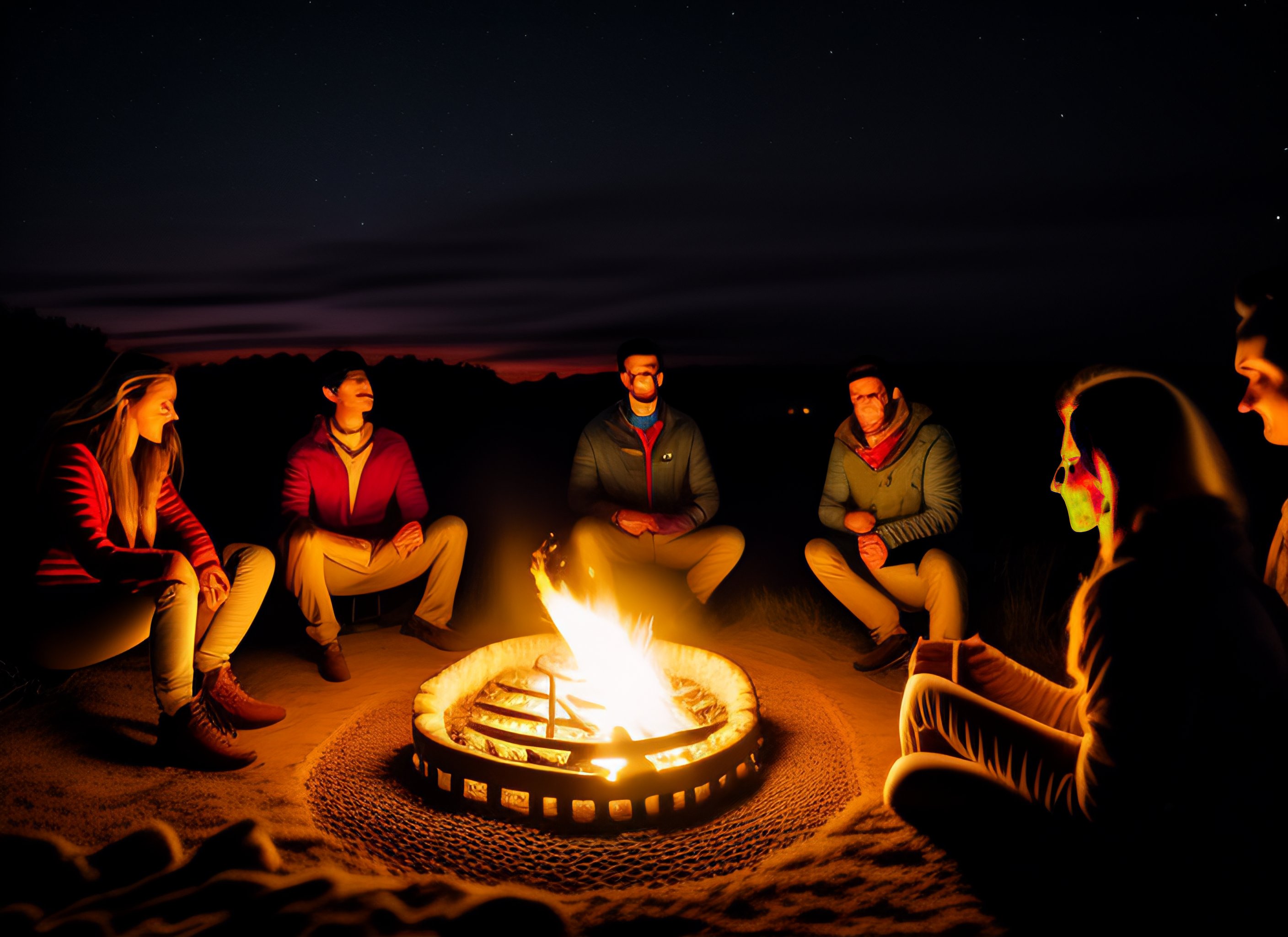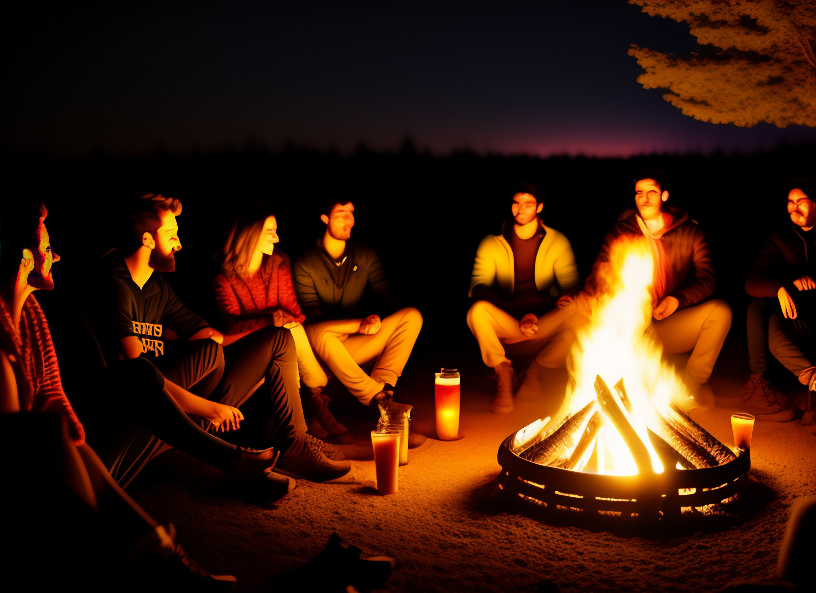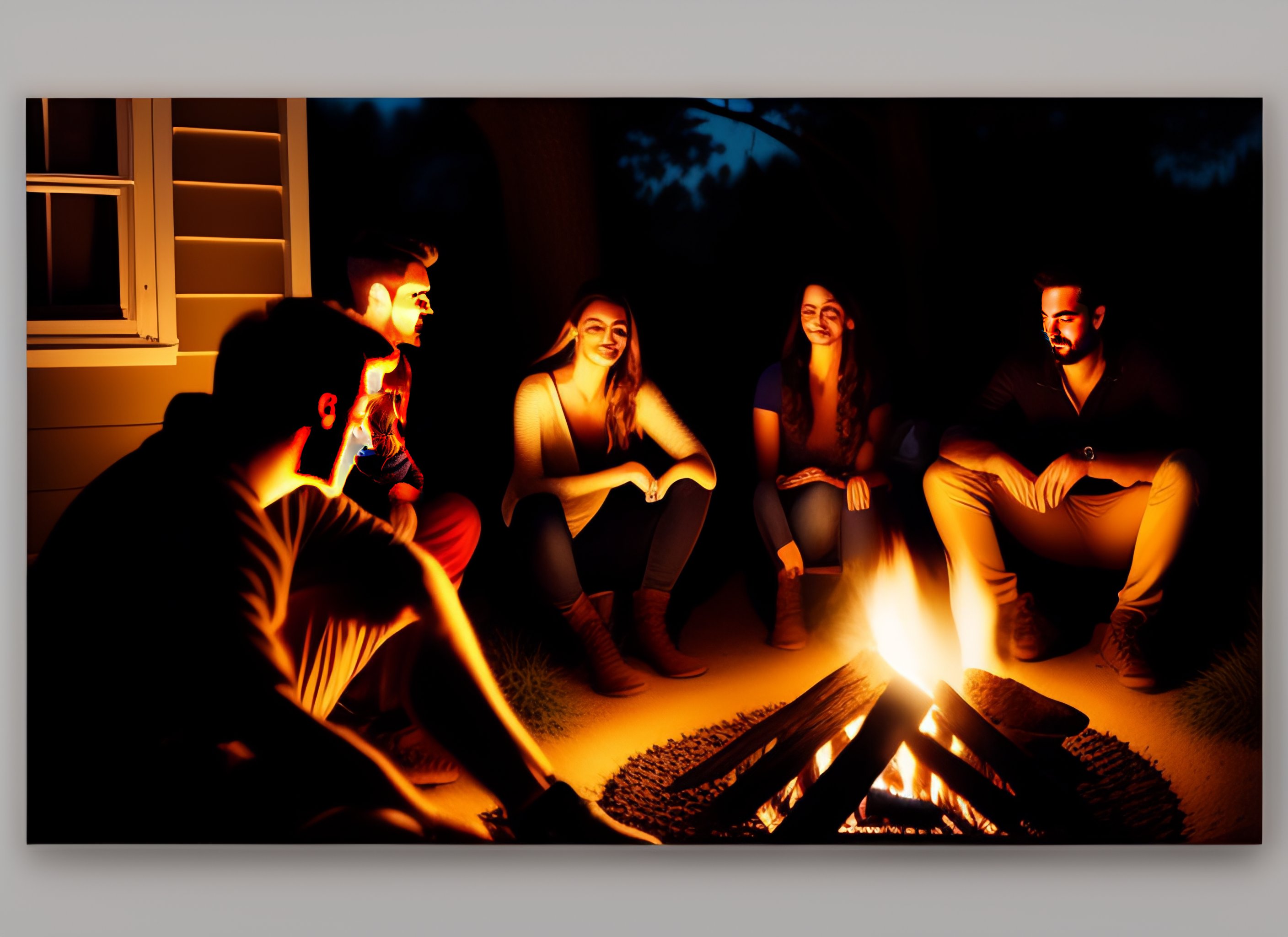 This photograph shows a group of friends gathered around a campfire. the professional canon camera has been positioned low, capturing the friends from below as they sit in chairs around the fire. the light from the campfire illuminates their faces and creates moving shadows in the background of the image. the framing of the photograph includes both the friends and the fire and the camping environment, showing the camaraderie and relaxed atmosphere of the night. post-processing has been used to increase the contrast and clarity of the image, bringing out the details of the friends' expressions and clothing. the photograph is a warm and cozy capture of a relaxing and fun time with friends