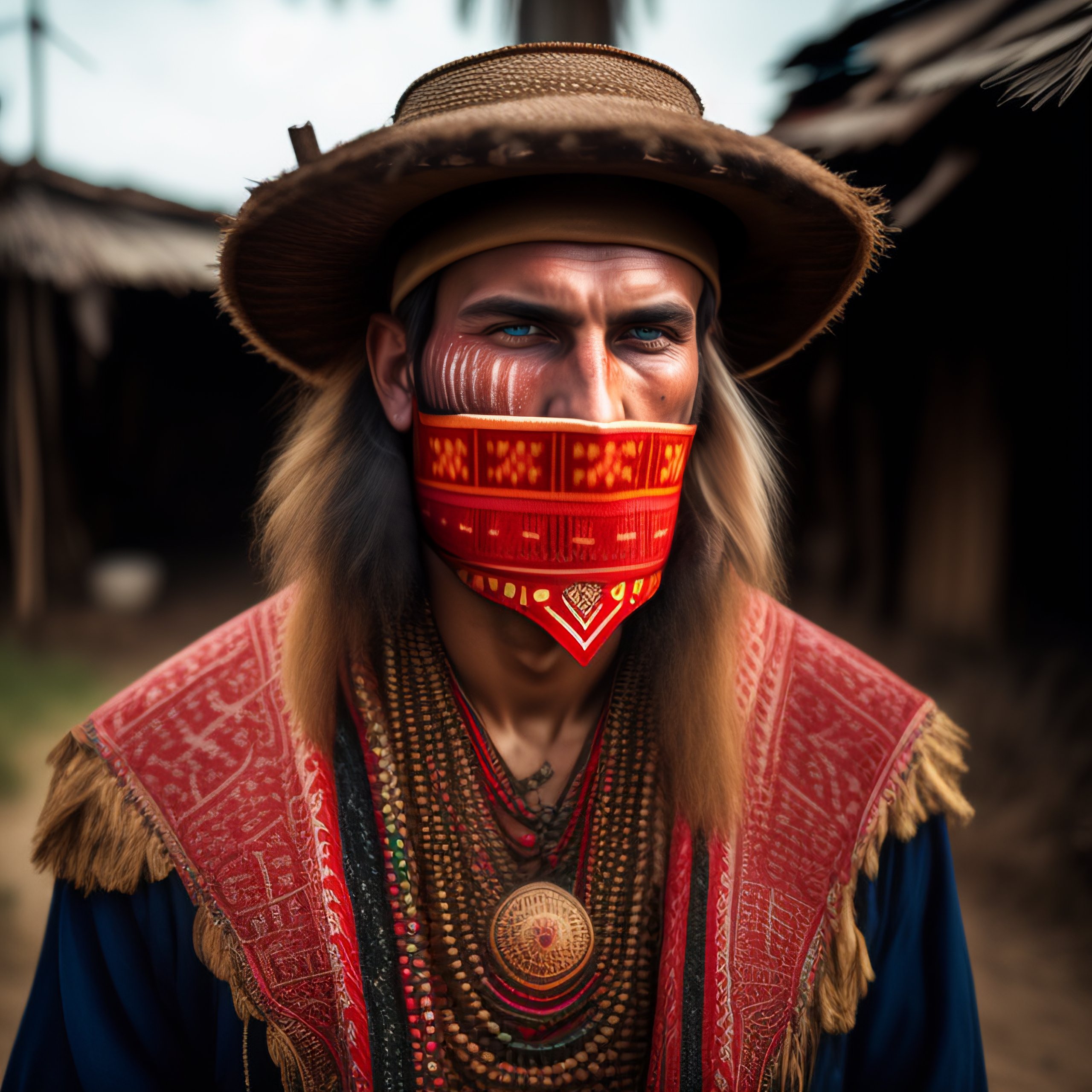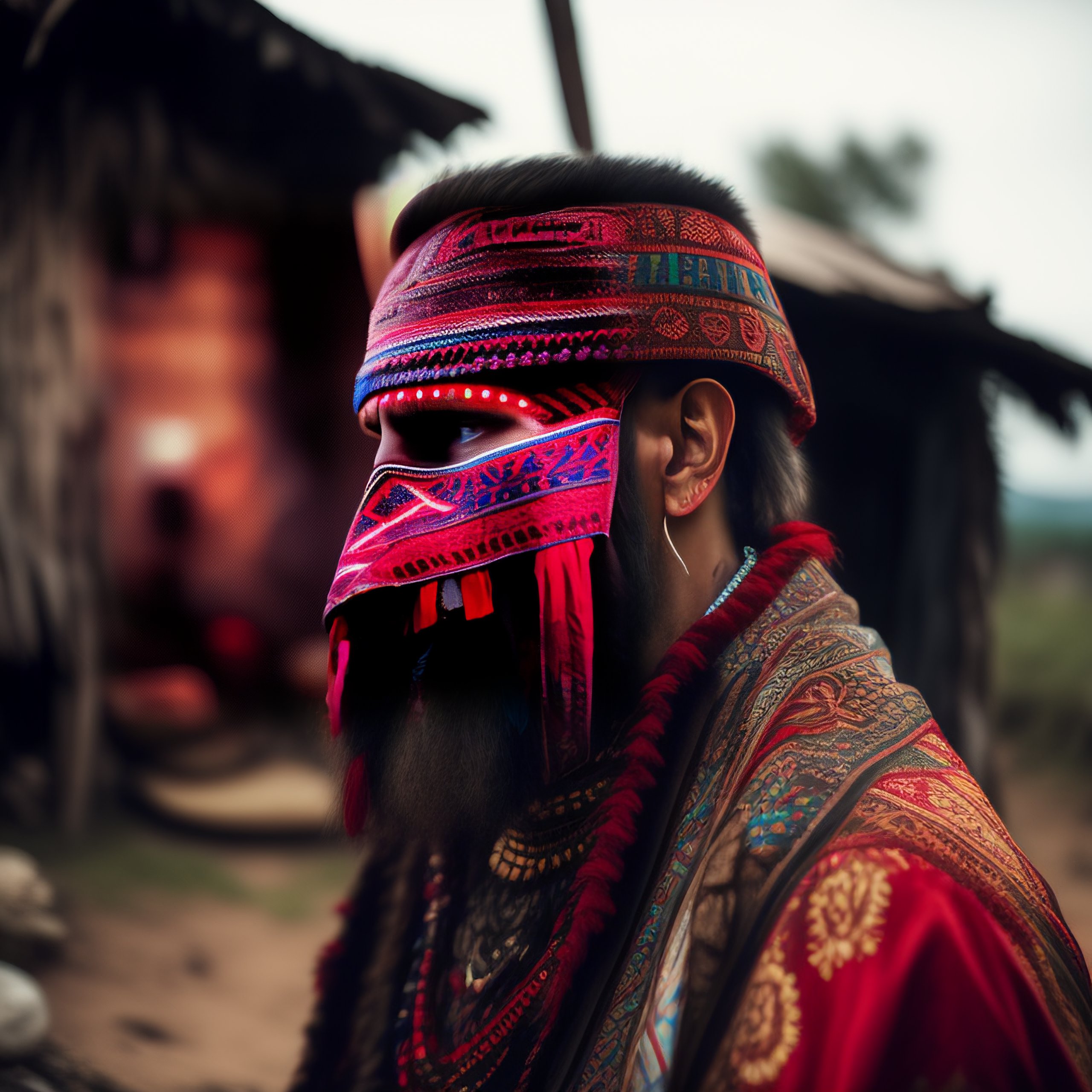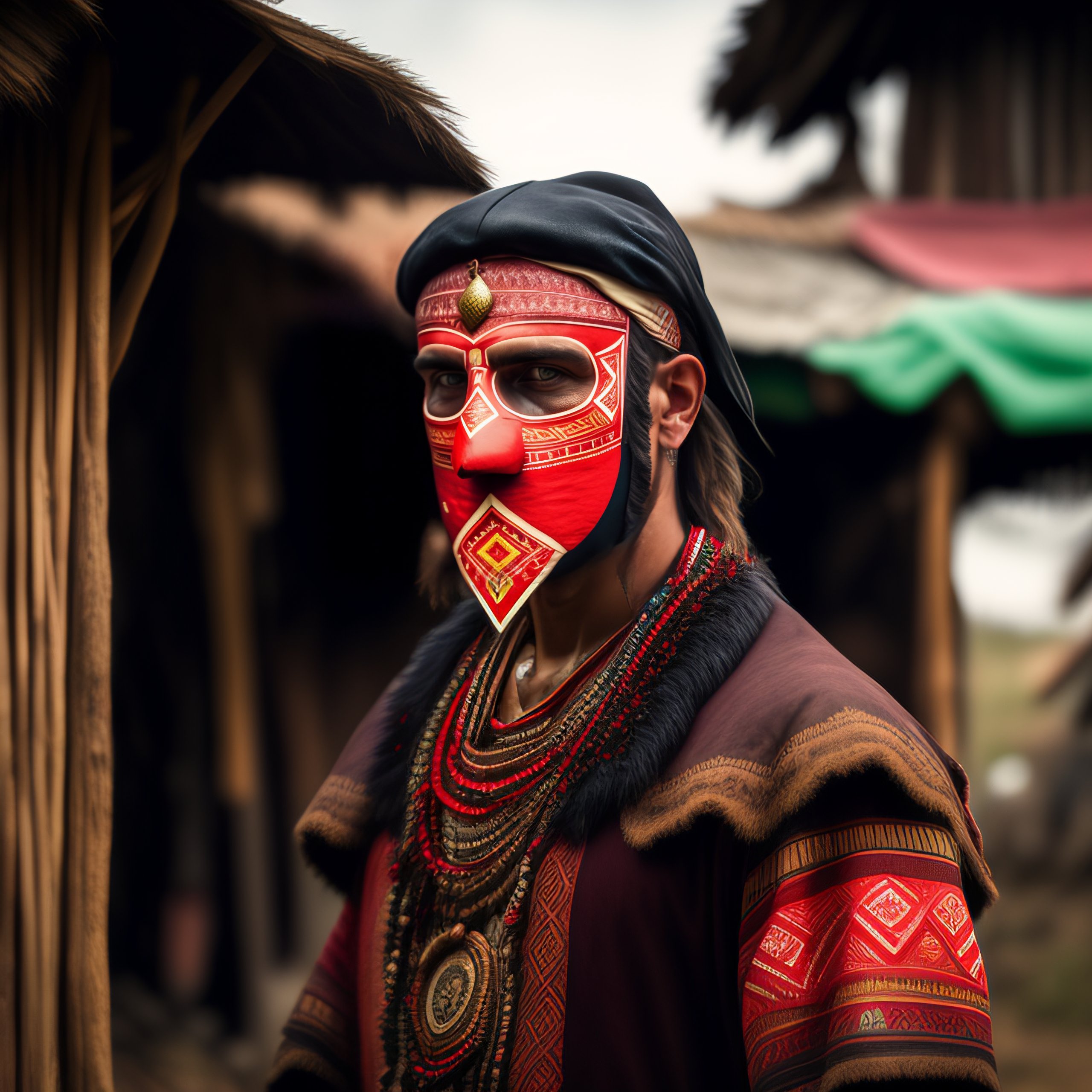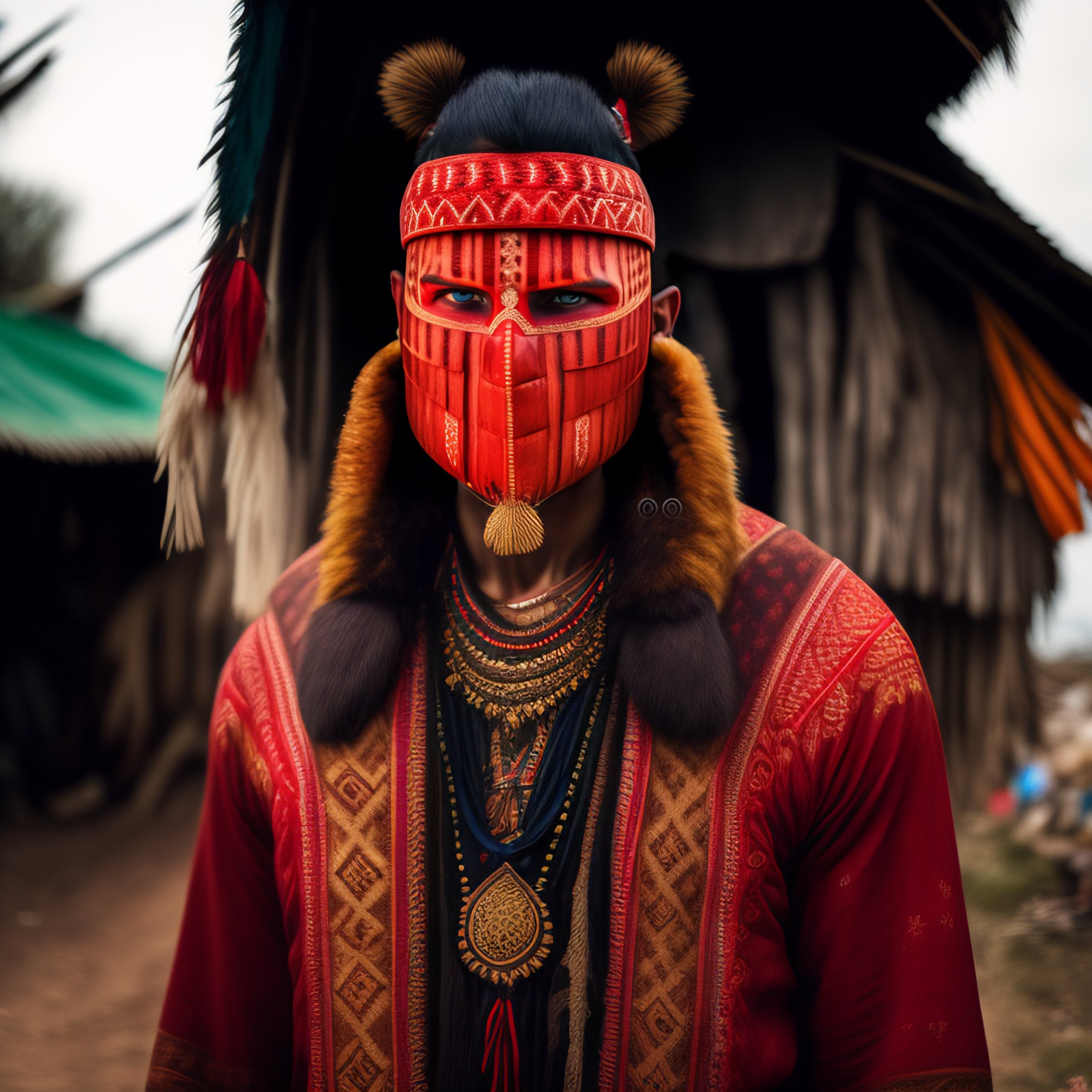 Wide angle environmental shot of a mysterikus slavic man wearing a wooden kuker mask in tribal clothing with red and whjte balkan type patterns, hidden face, cluttered and messy shack, action shot, tattered torn shirt, porcelain cracked skin, vibrant, photo realistic, realistic, dramatic, dark, sharp focus, 8k.