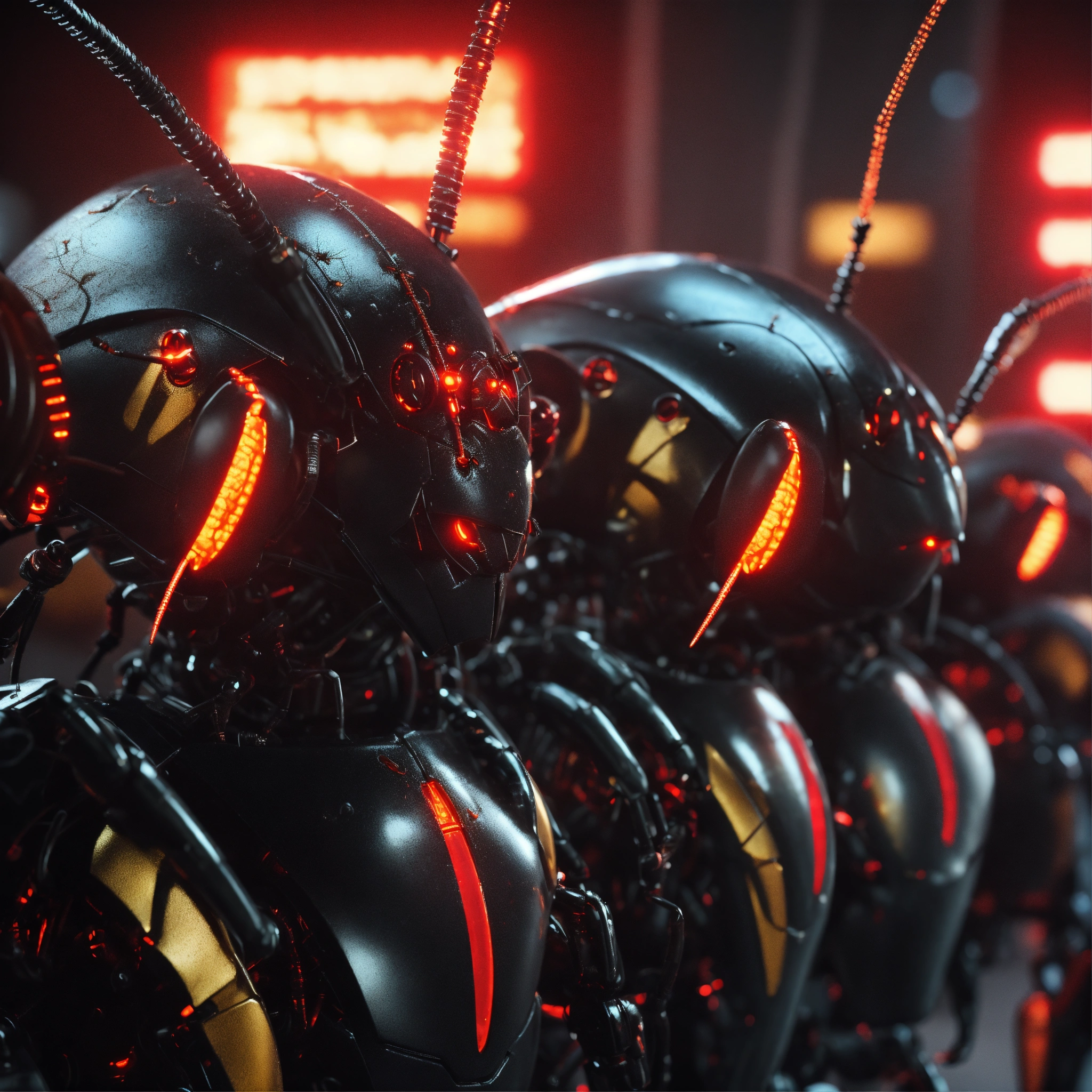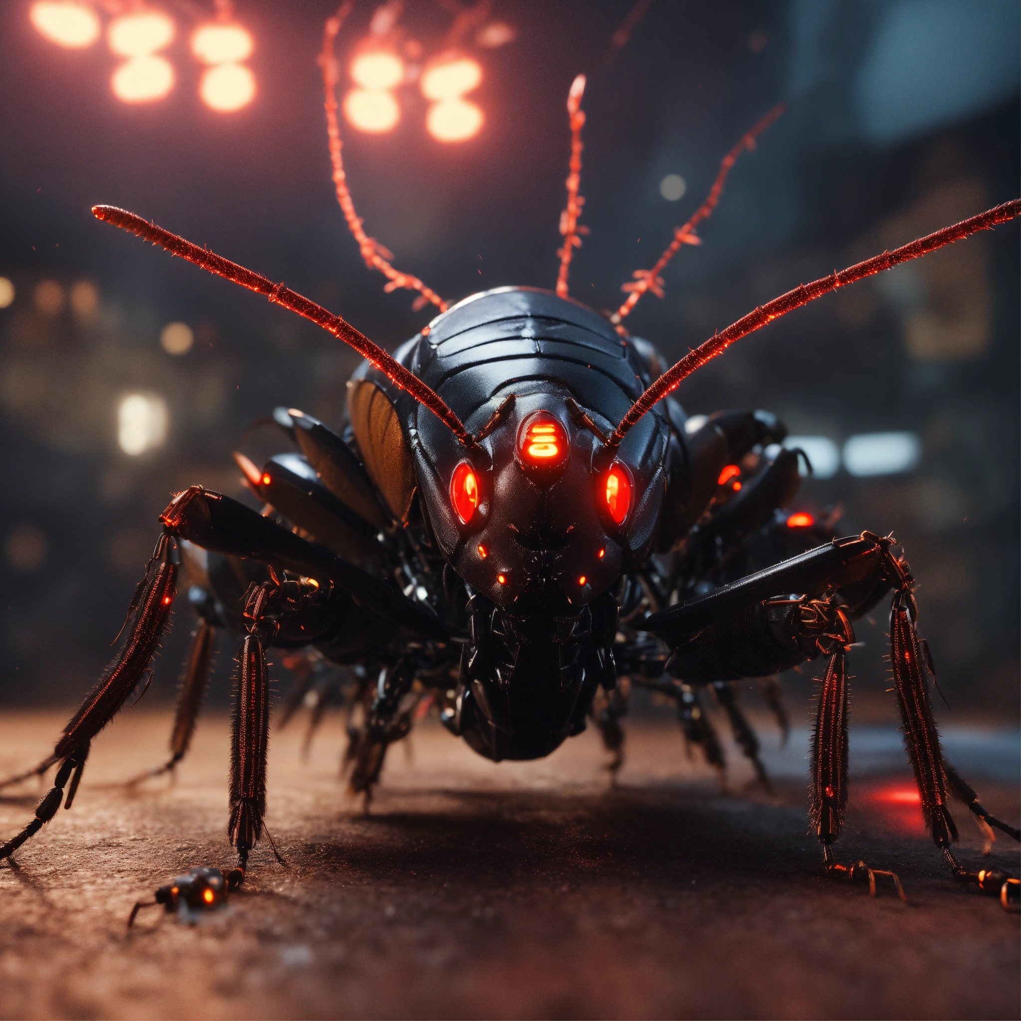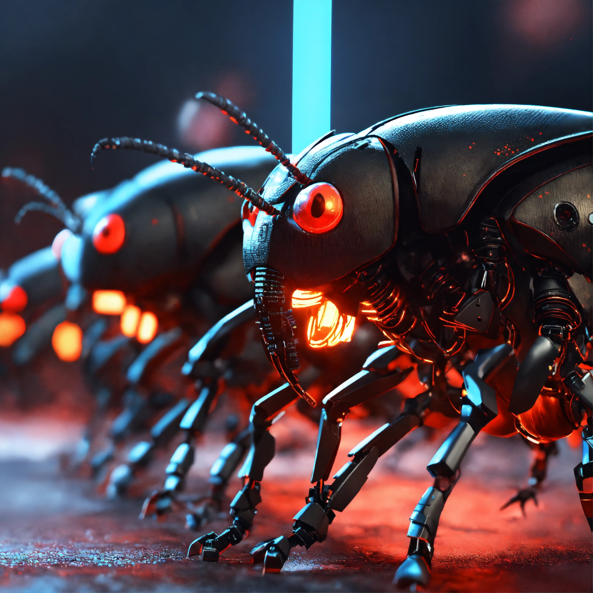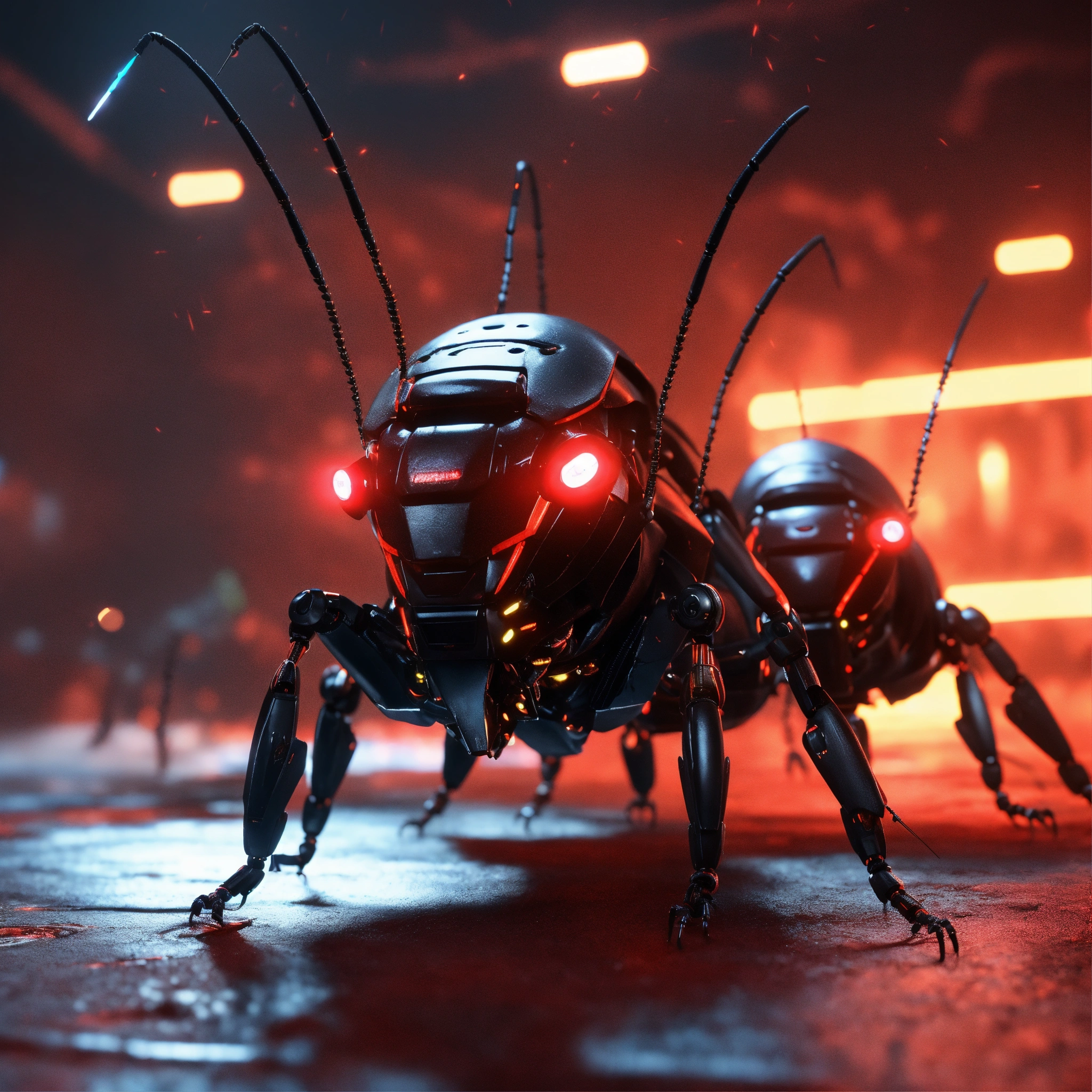 Zoom out shot of group of 3 cockroach faced black robotic humanoids with red glowing eyes, detailed circuit markings, standing up laughing and ready to attack, lightning bolts shoot from its antenna, realistic, 8k, unreal engine