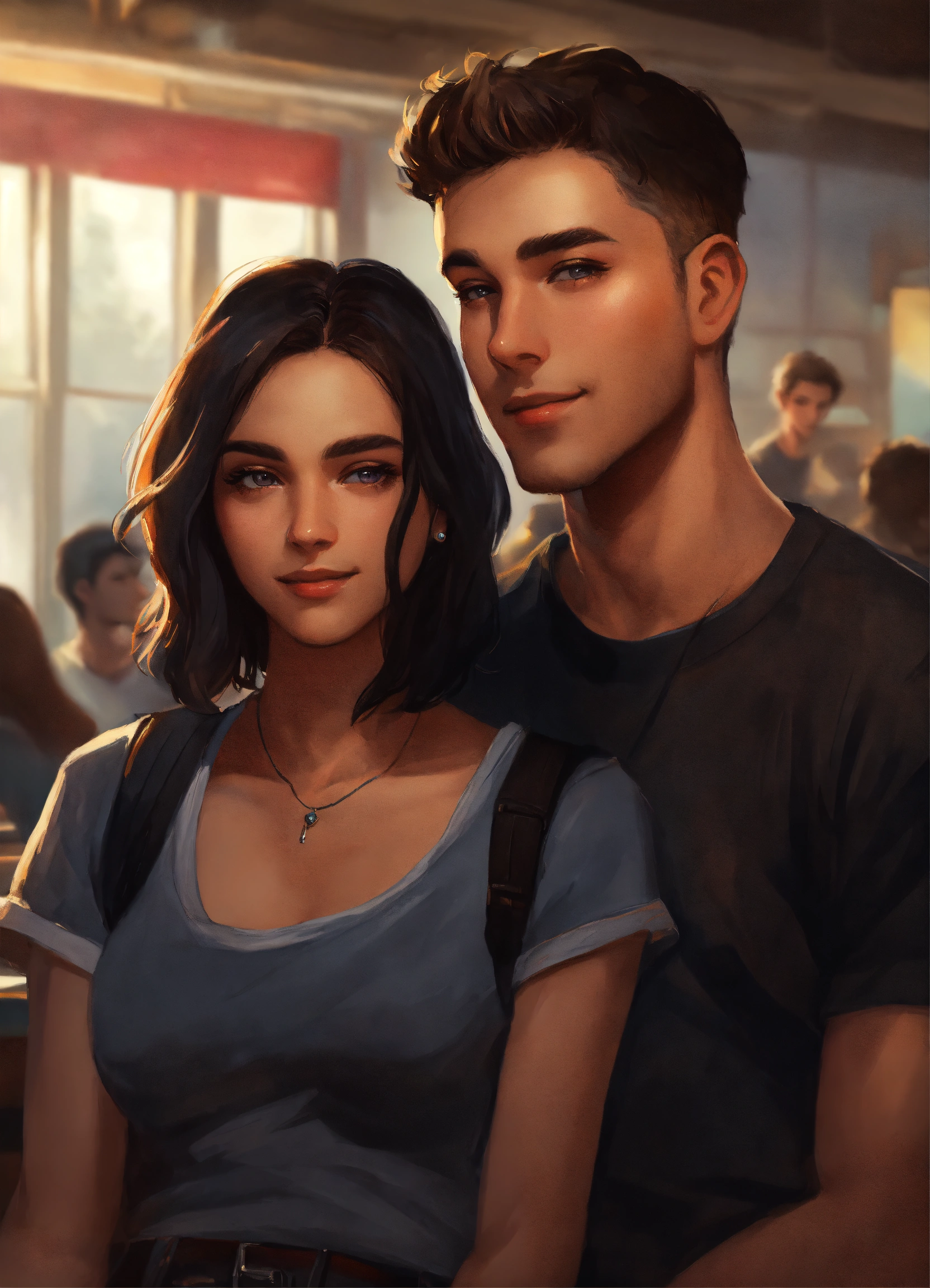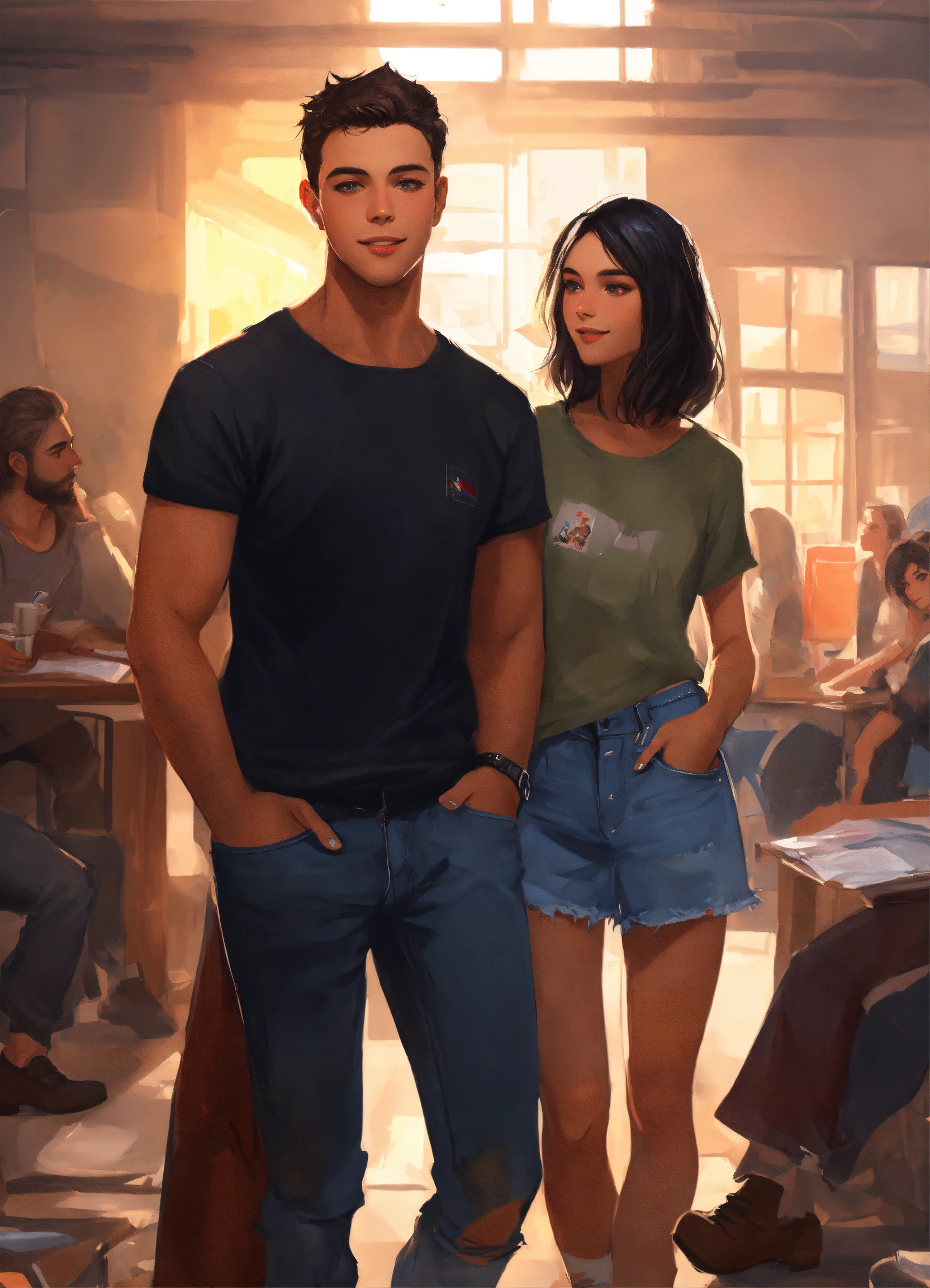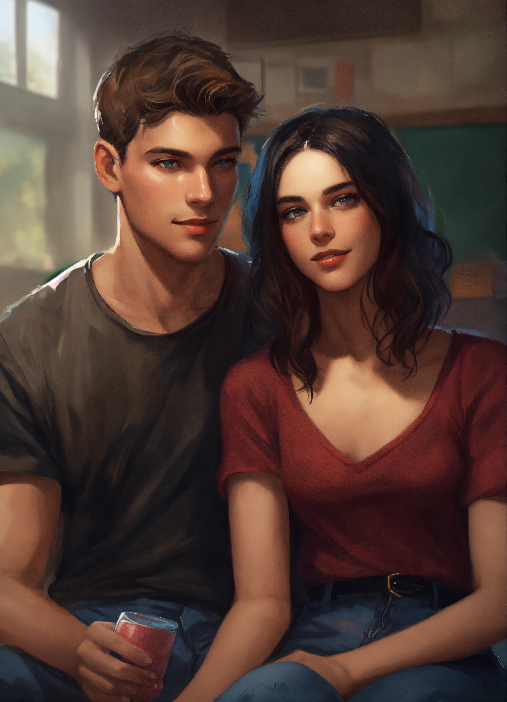 A detailed full body portrait romantic european 20 years old couple of a man looks like moritz hau with a sacarstic smile wearing a black t-shirt and a dark haired girl looks like katy miro, with a jeans. they are look at other romantic. contemporary, backgroud of a college classroom, illustrator, by justin gerad and greg rutkowski, digital art, realistic painting, dnd, character design, trending on artstation, medium shoot