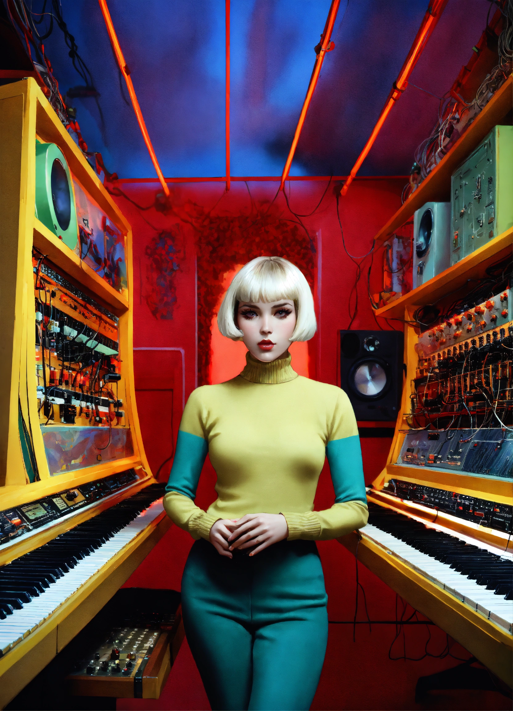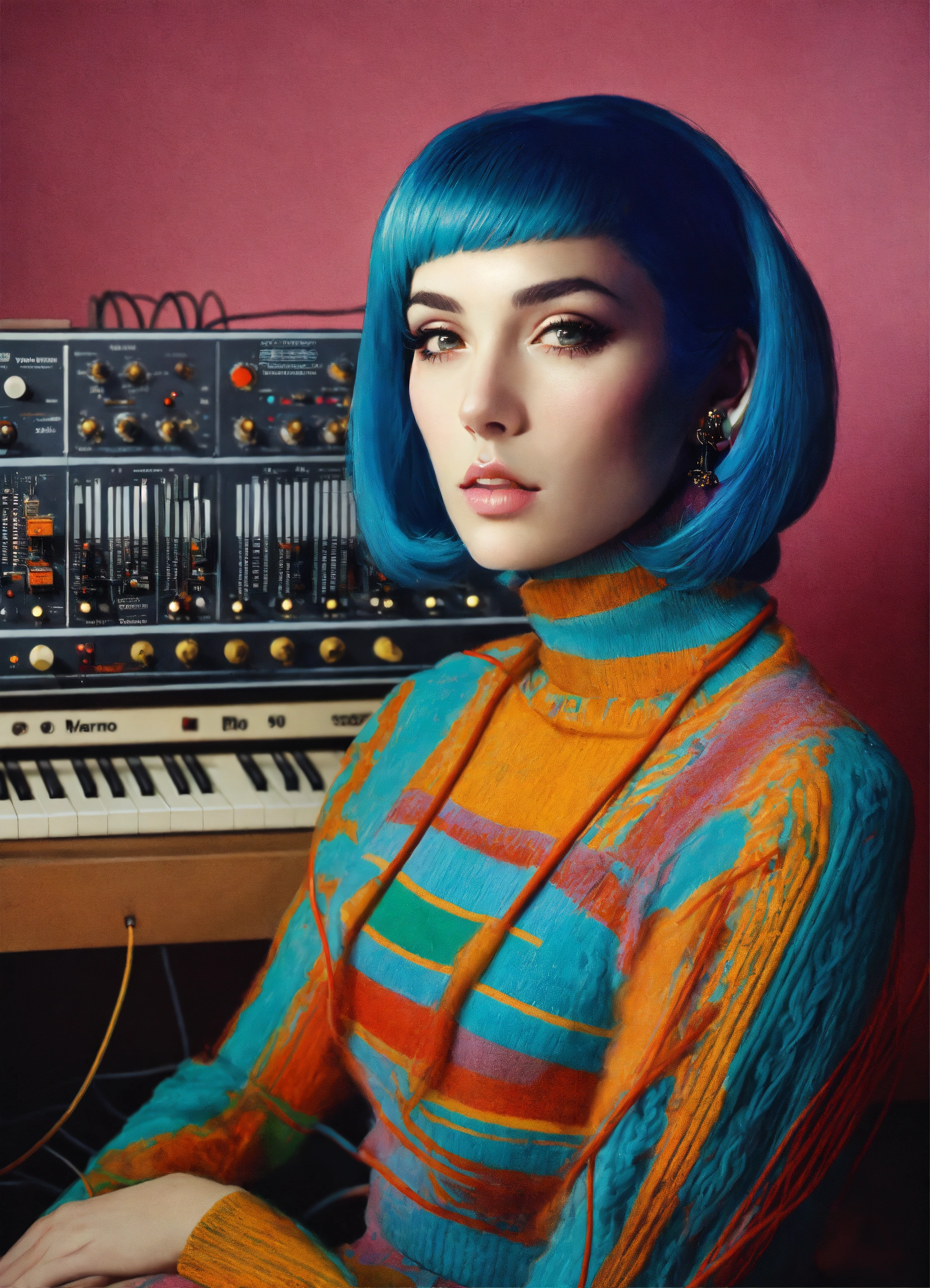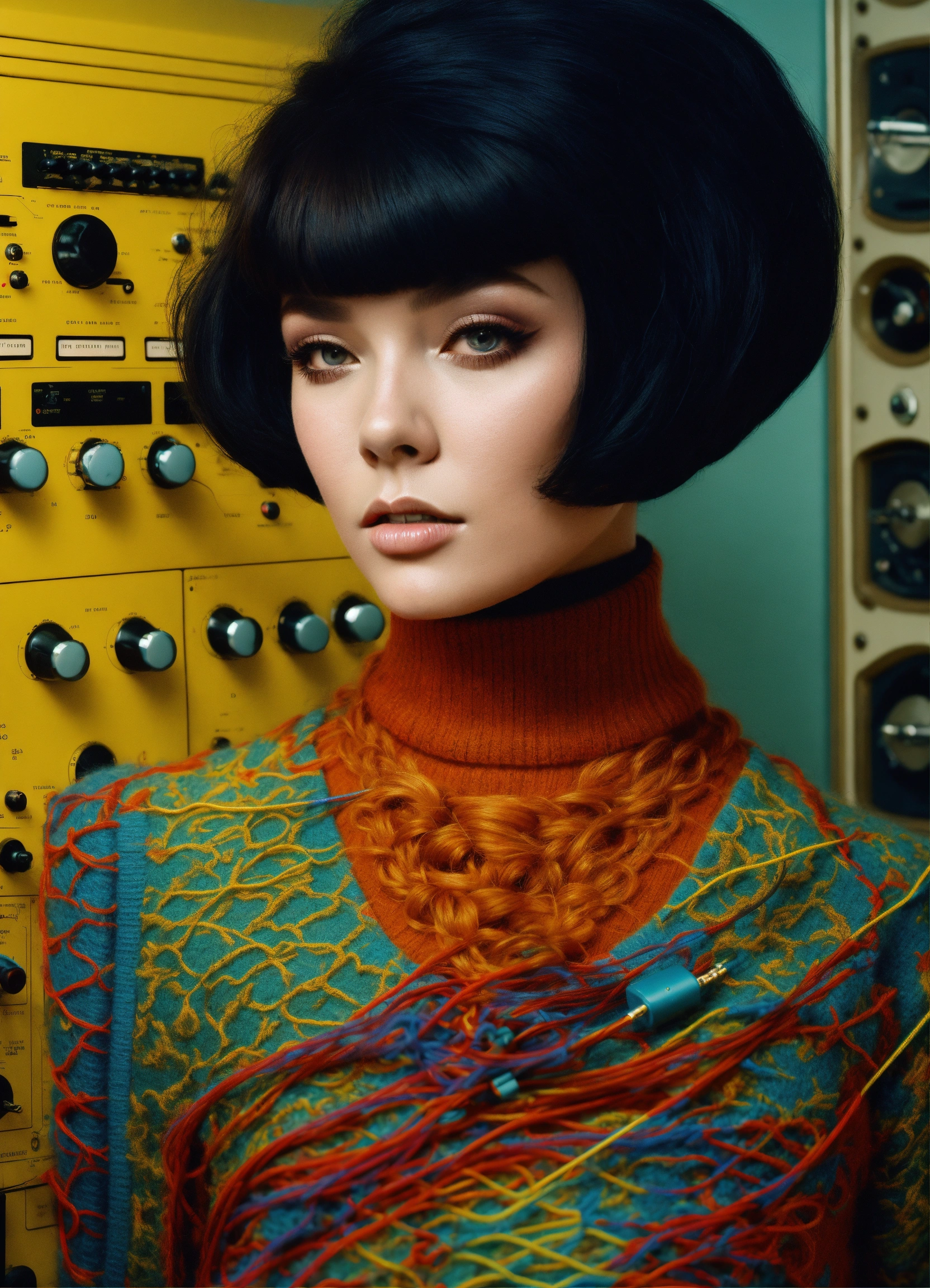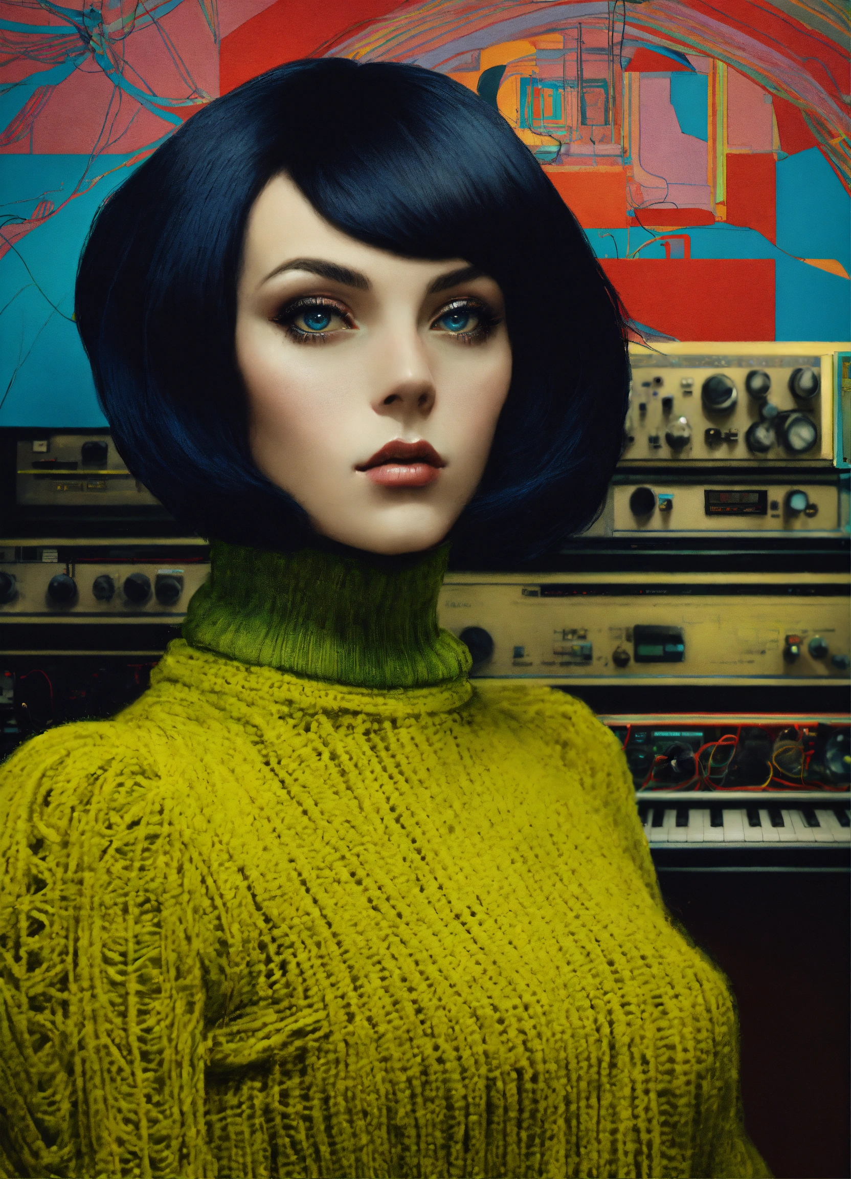 Half body front portrait photography, in front of synthesizer machines with cables and wires, an american pop 60's famous woman in wool multicolor turtleneck pul with a 50's haircut, 80 degree view, art by sergio lopez, natalie shau, james jean and salvador dali
