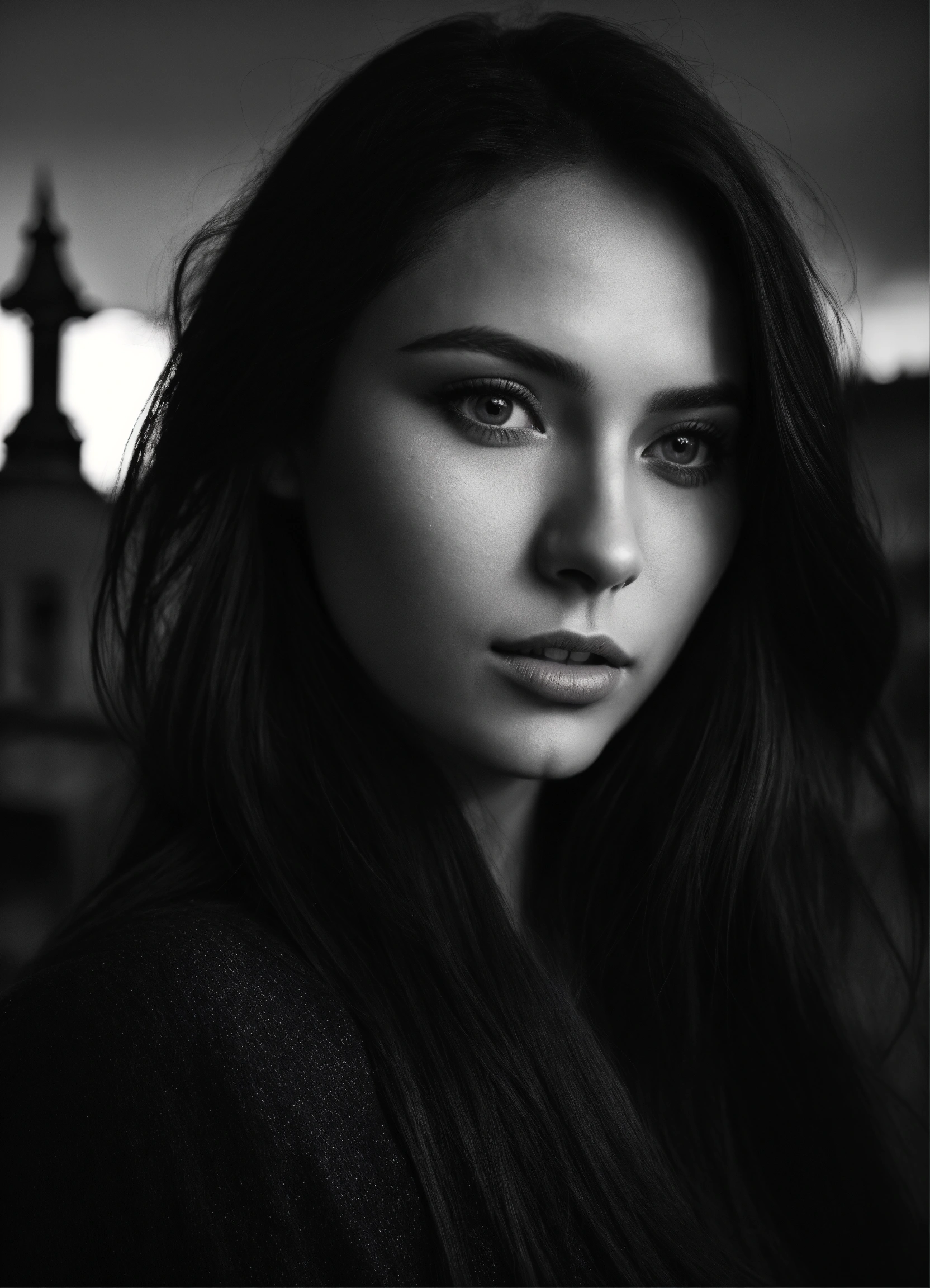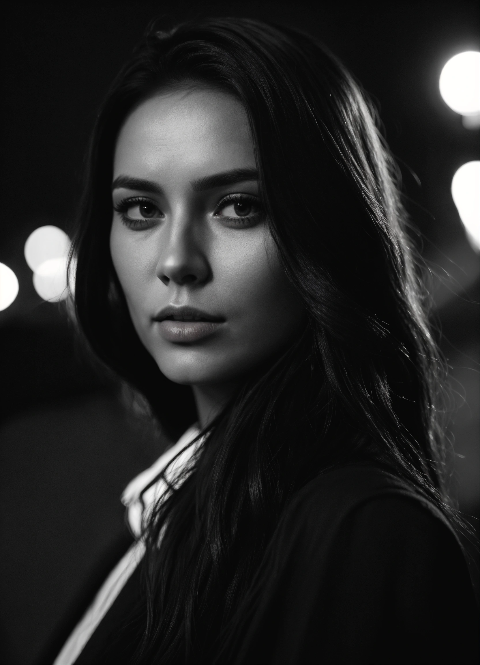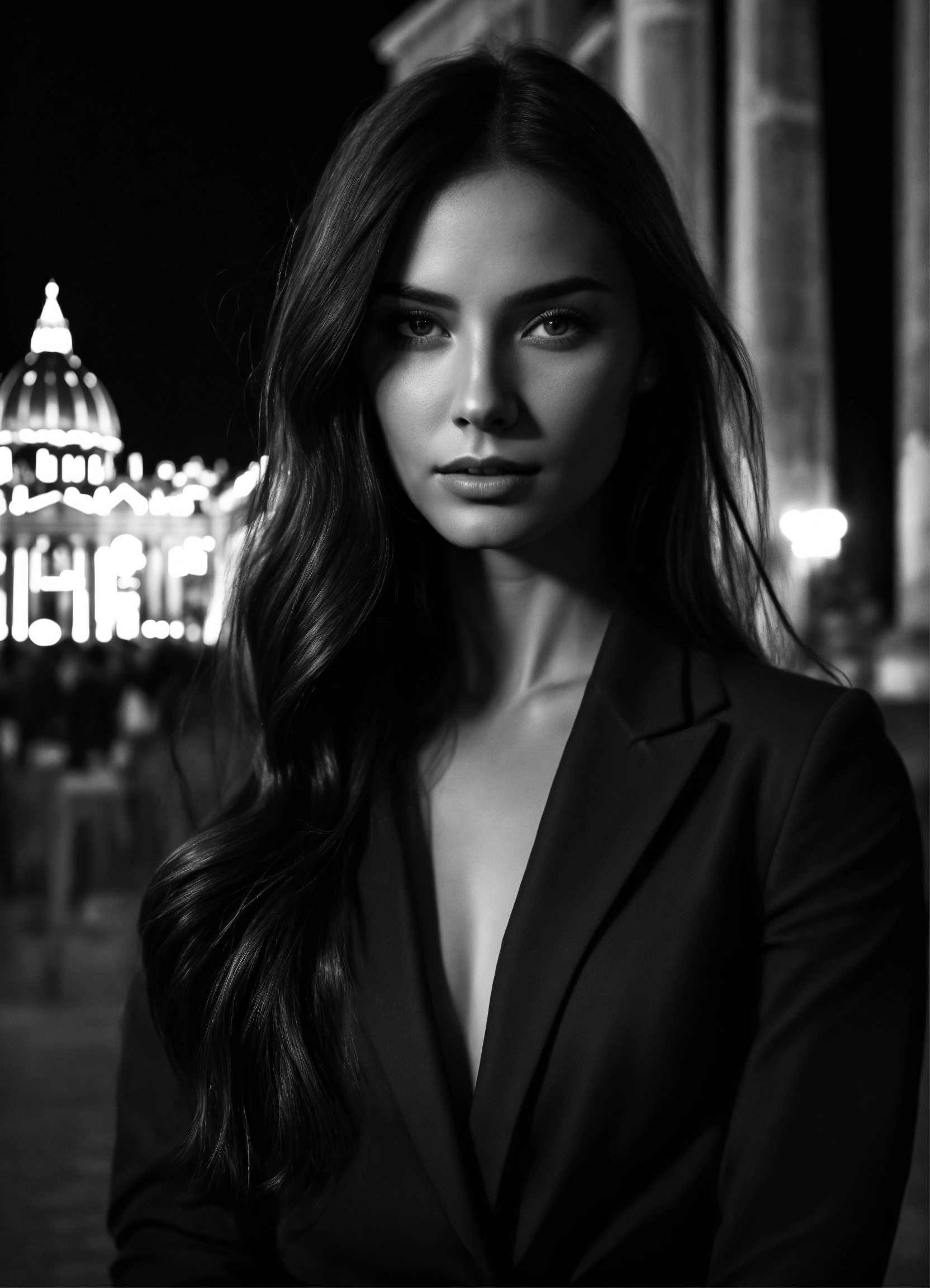 Photo of model women long dark hair, black and white, realistic, portrait, not painted, very detailed faces, skin with pores, 4k, dark suit, skin not smoothed, looking into the camera, dark shirt. vatican in rome in full view at night as background