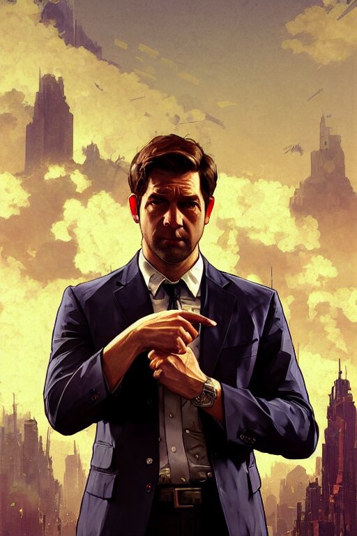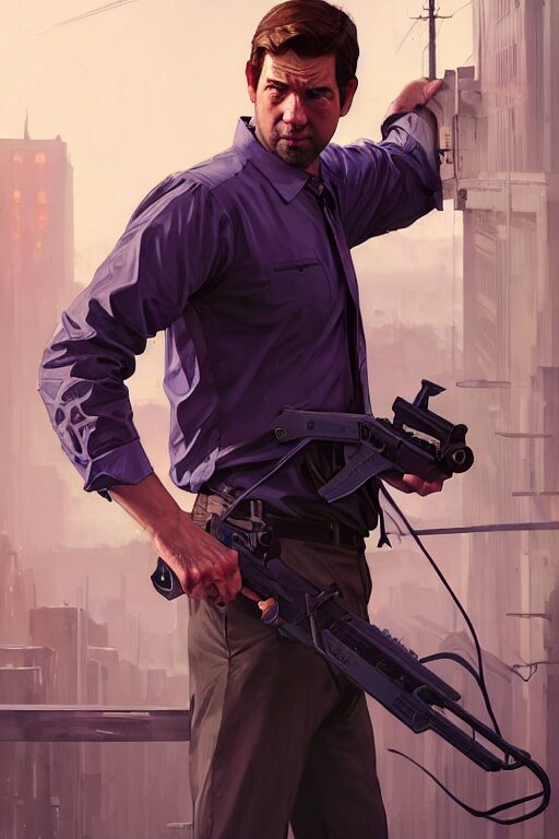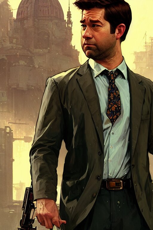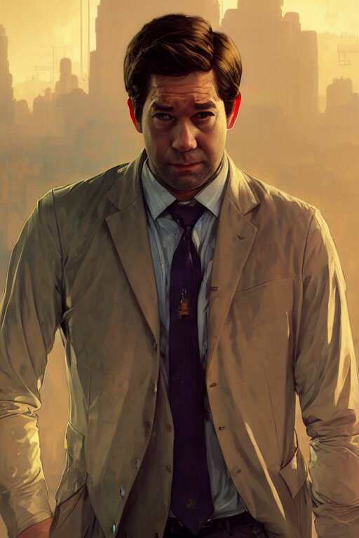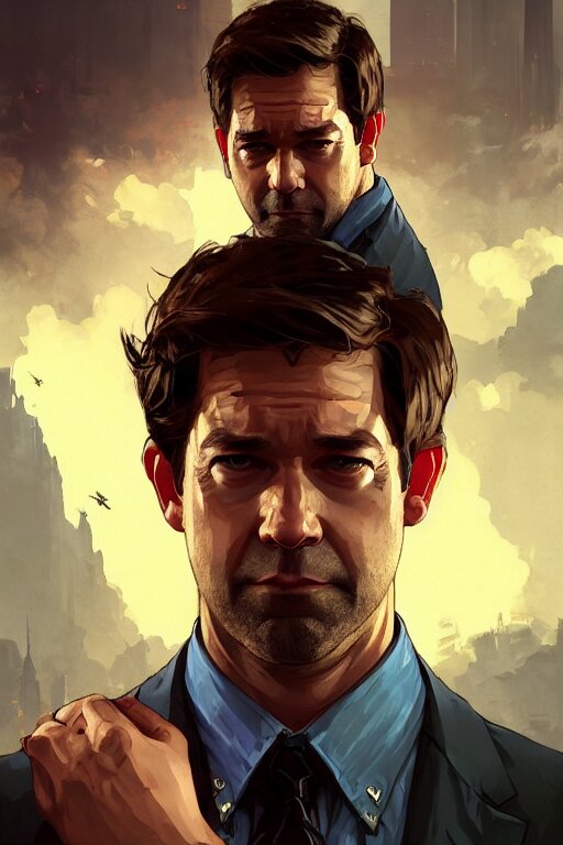 Gta jim halpert john krasinski profile picture by greg rutkowski, dynamic pose, intricate, futuristic, fantasy, elegant, by stanley artgerm lau, greg rutkowski, thomas kindkade, alphonse mucha, loish, norman rockwell, fantasy lut, asymmetric, long hair, retro computer graphics, video game, fluid lines