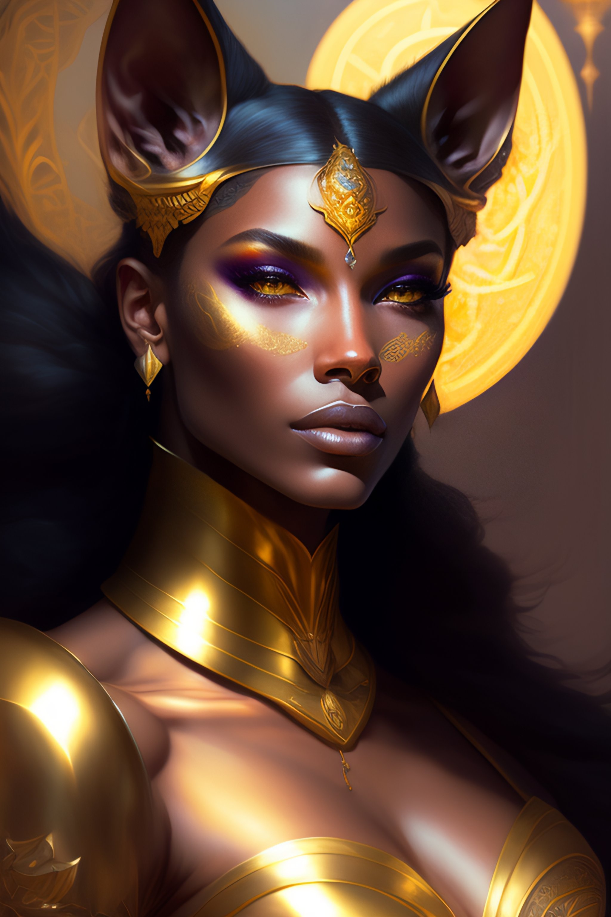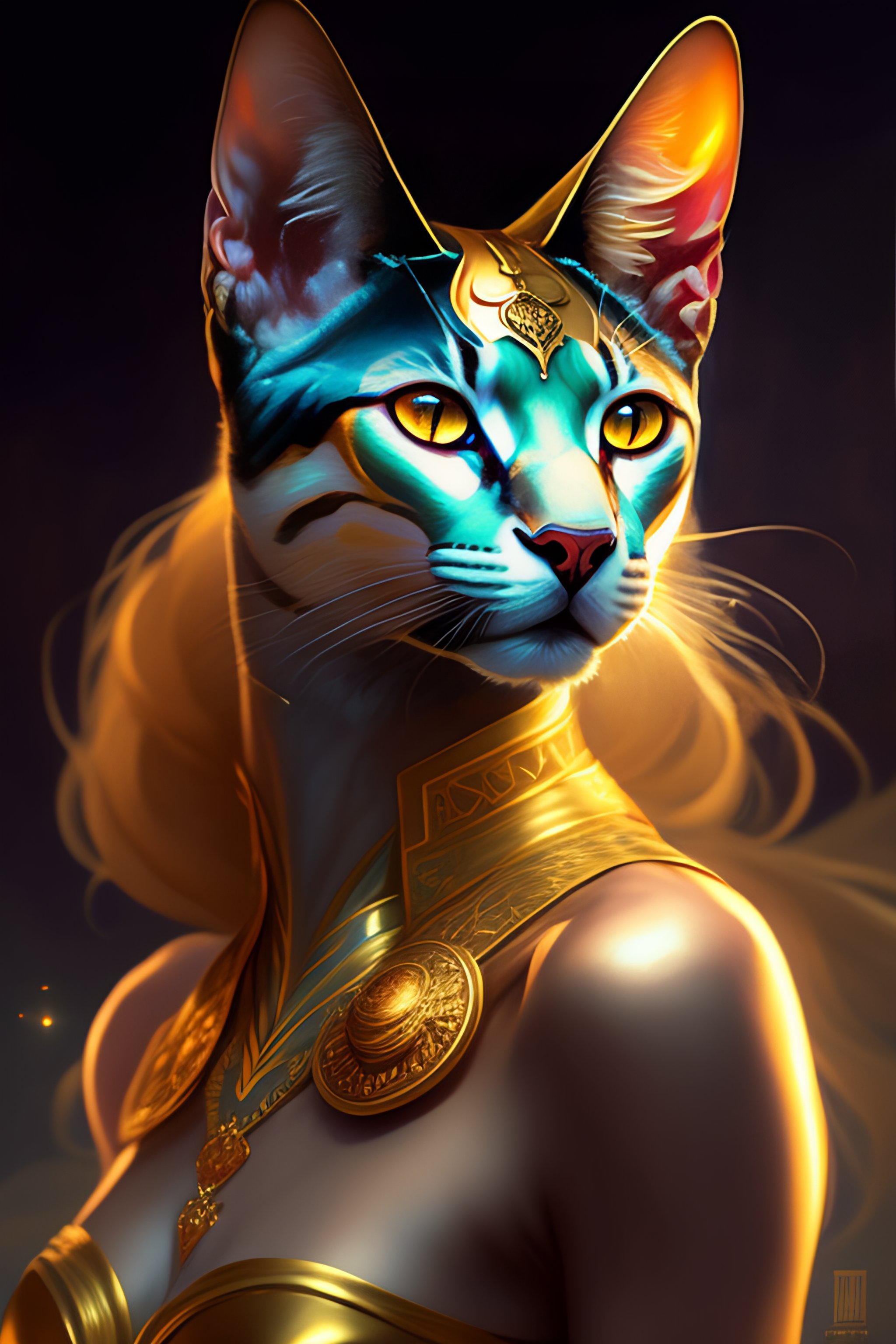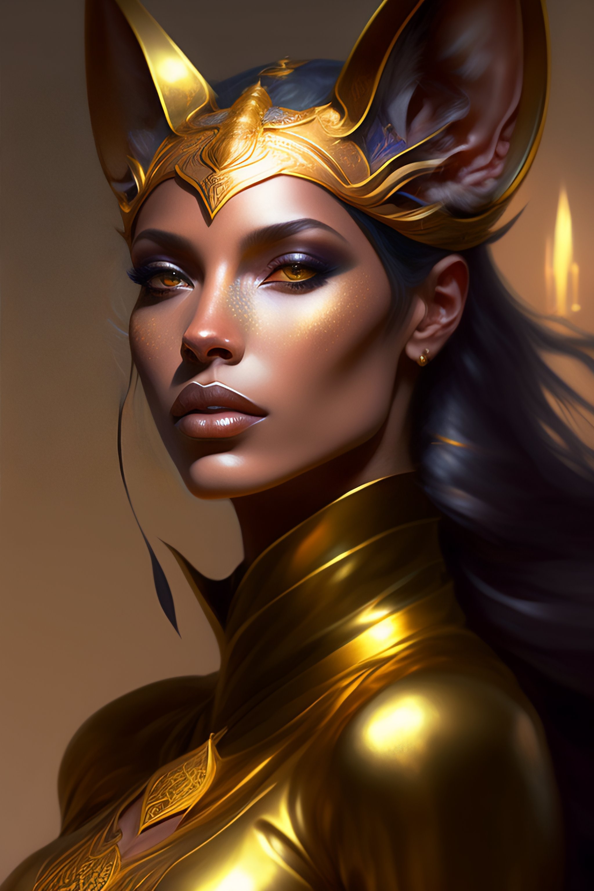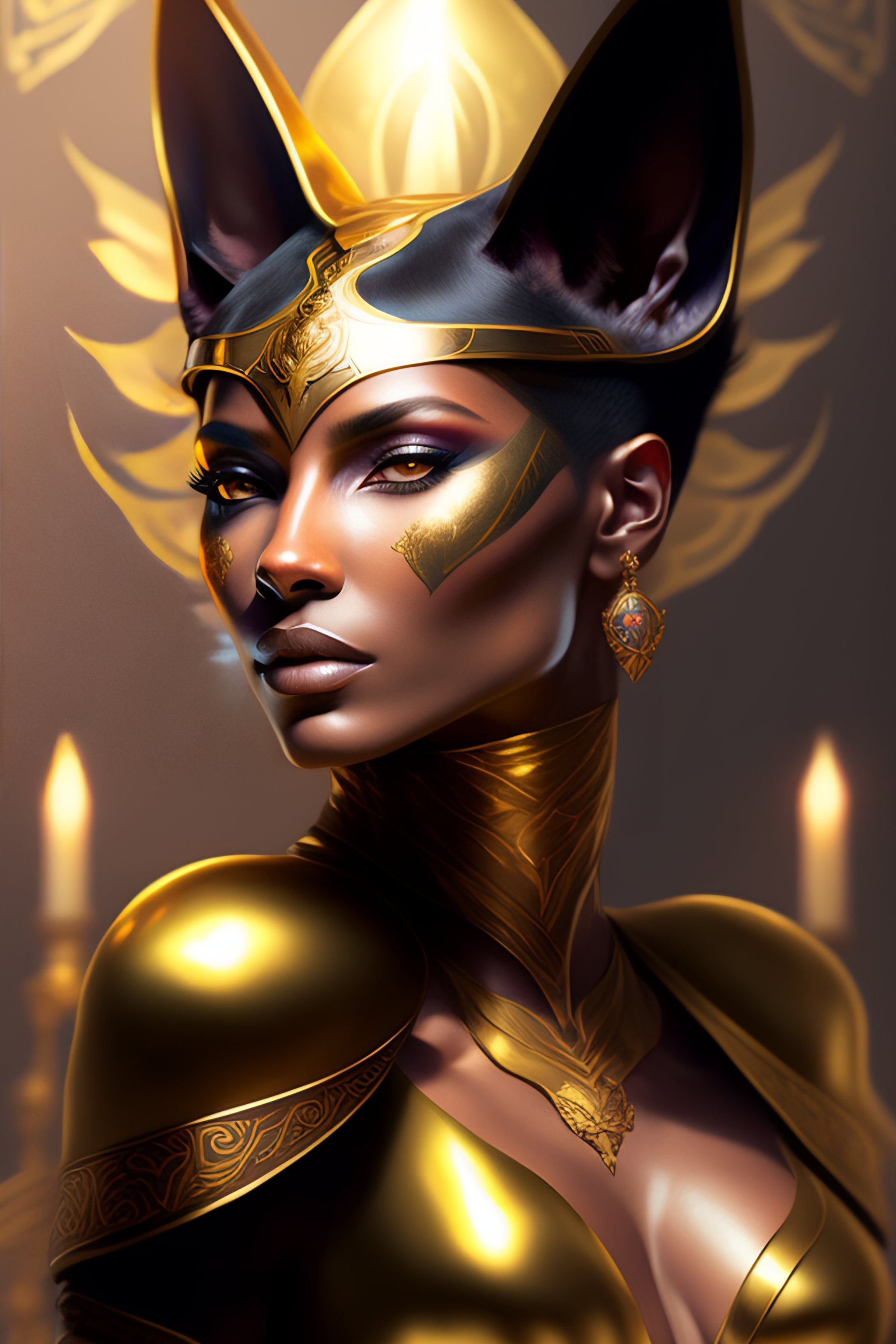 Anubis, portrait of a half cat half human, face of a cat, feline head, golden dress, glow golden tatto, galatic shamen with quantum energy fantasy, fantasy magic, undercut hairstyle, dark light night, intricate, elegant, sharp focus, illustration, highly detailed, digital painting, concept art, matte, art by wlop and artgerm and greg rutkowski and alphonse mucha, masterpiece, goddess