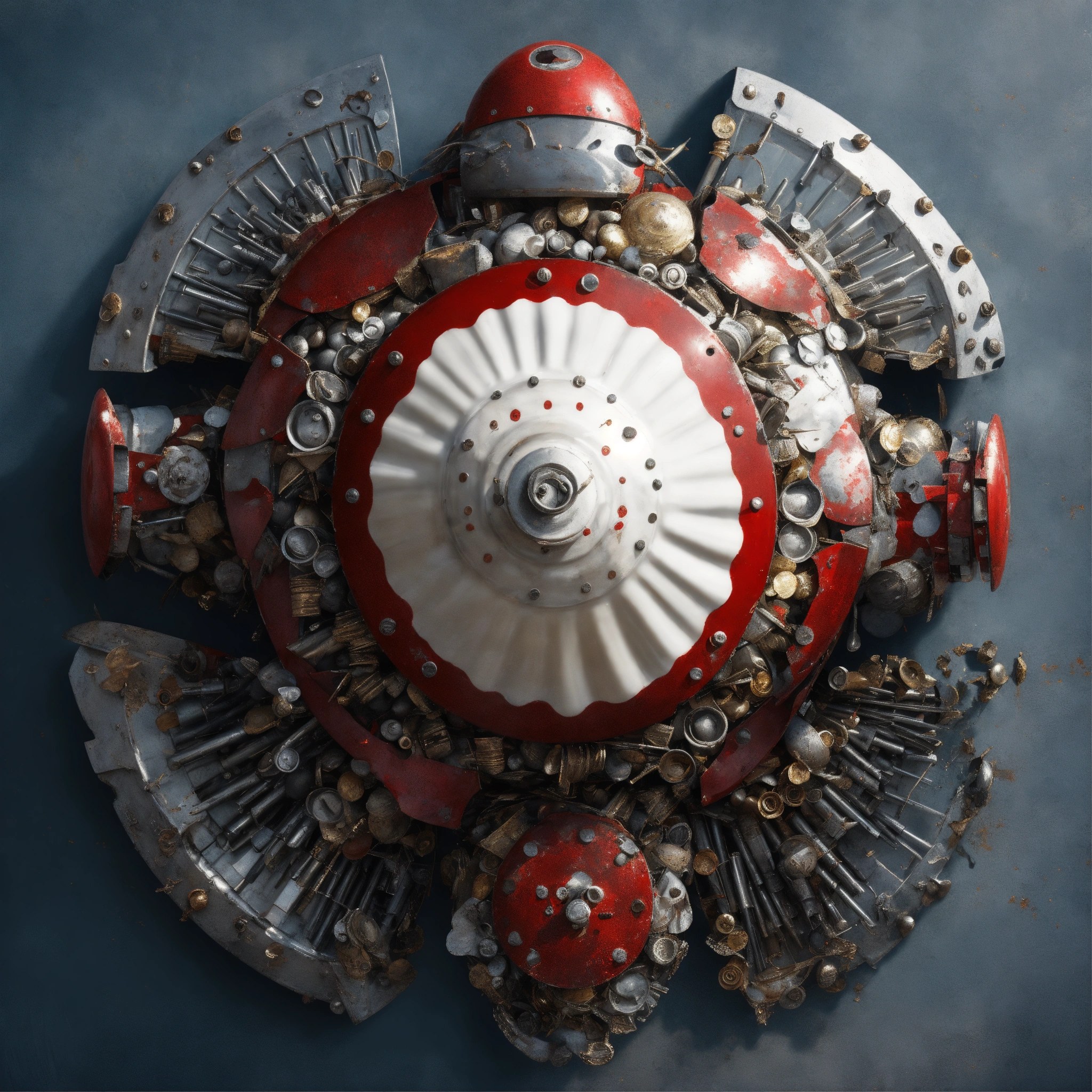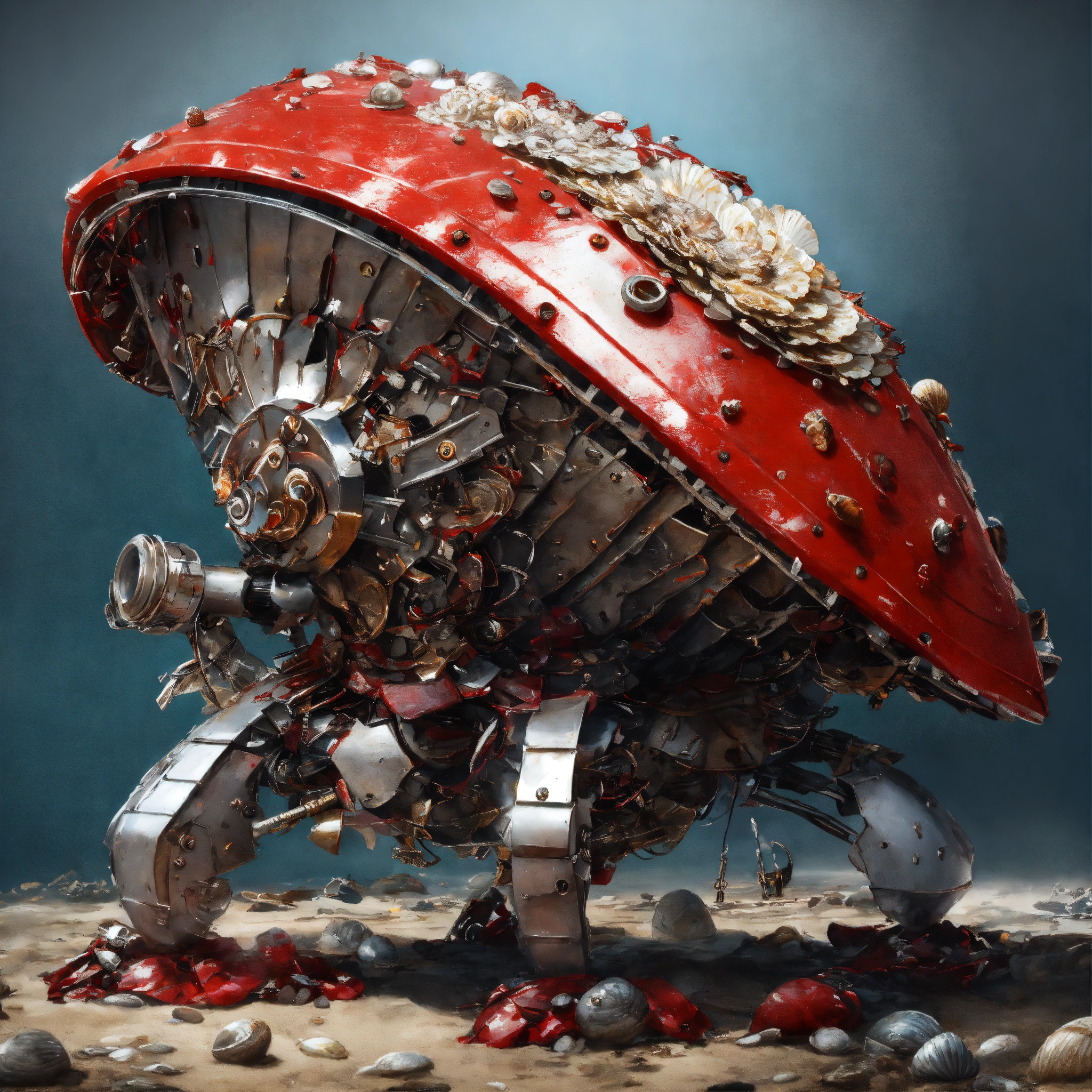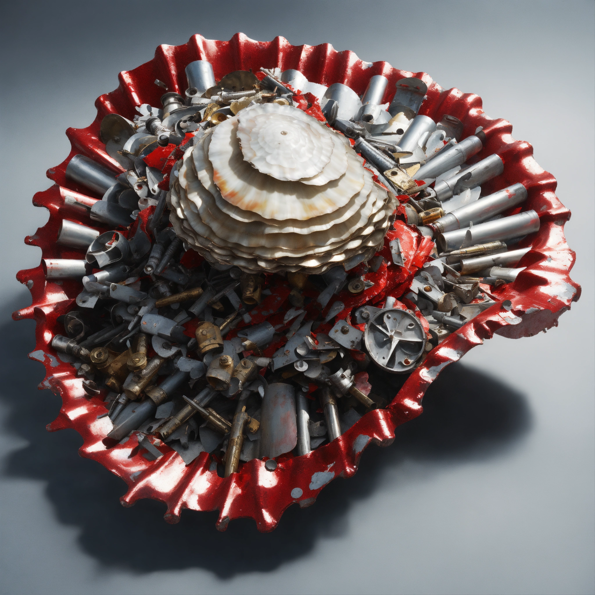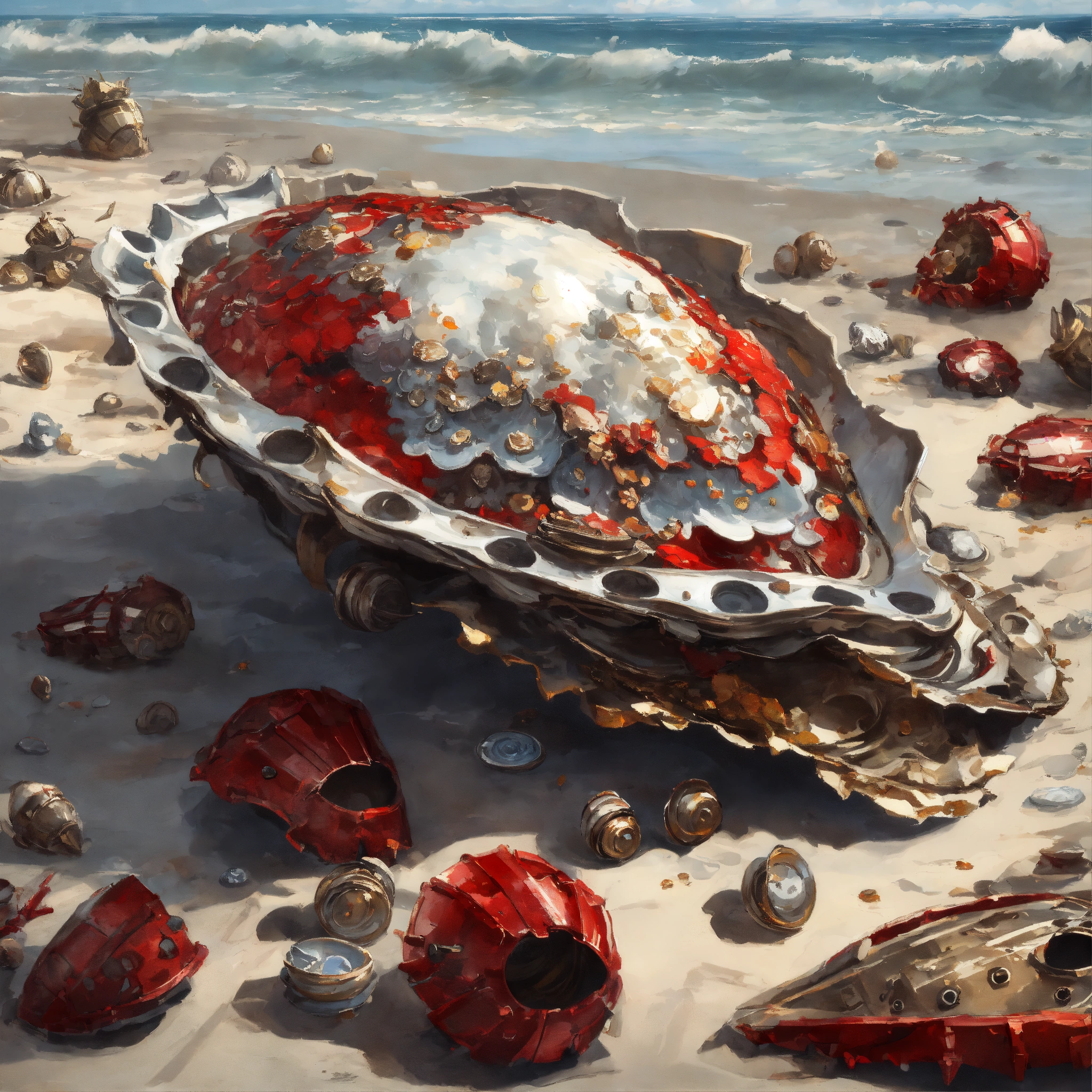 Concept art of an oyster covered in metal scrap guns armor metal objects, shell made out of scrap metal guns armor metal objects, white and red, ocean, oil painting style, highly detailed, brush strokes, 8k