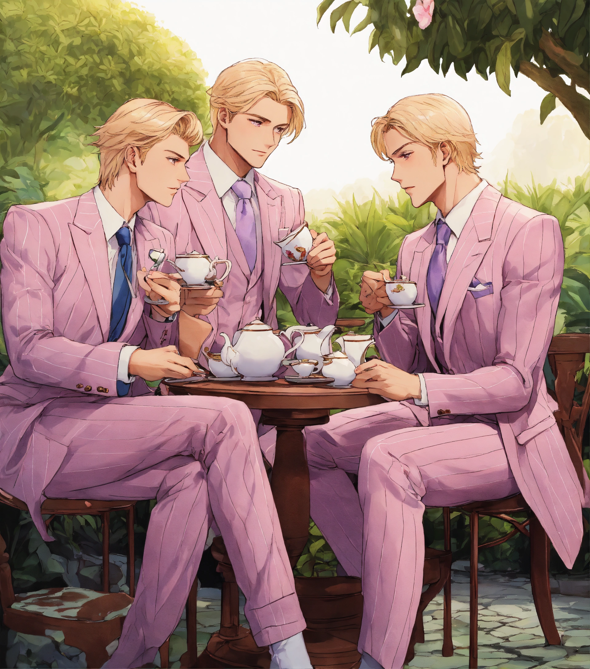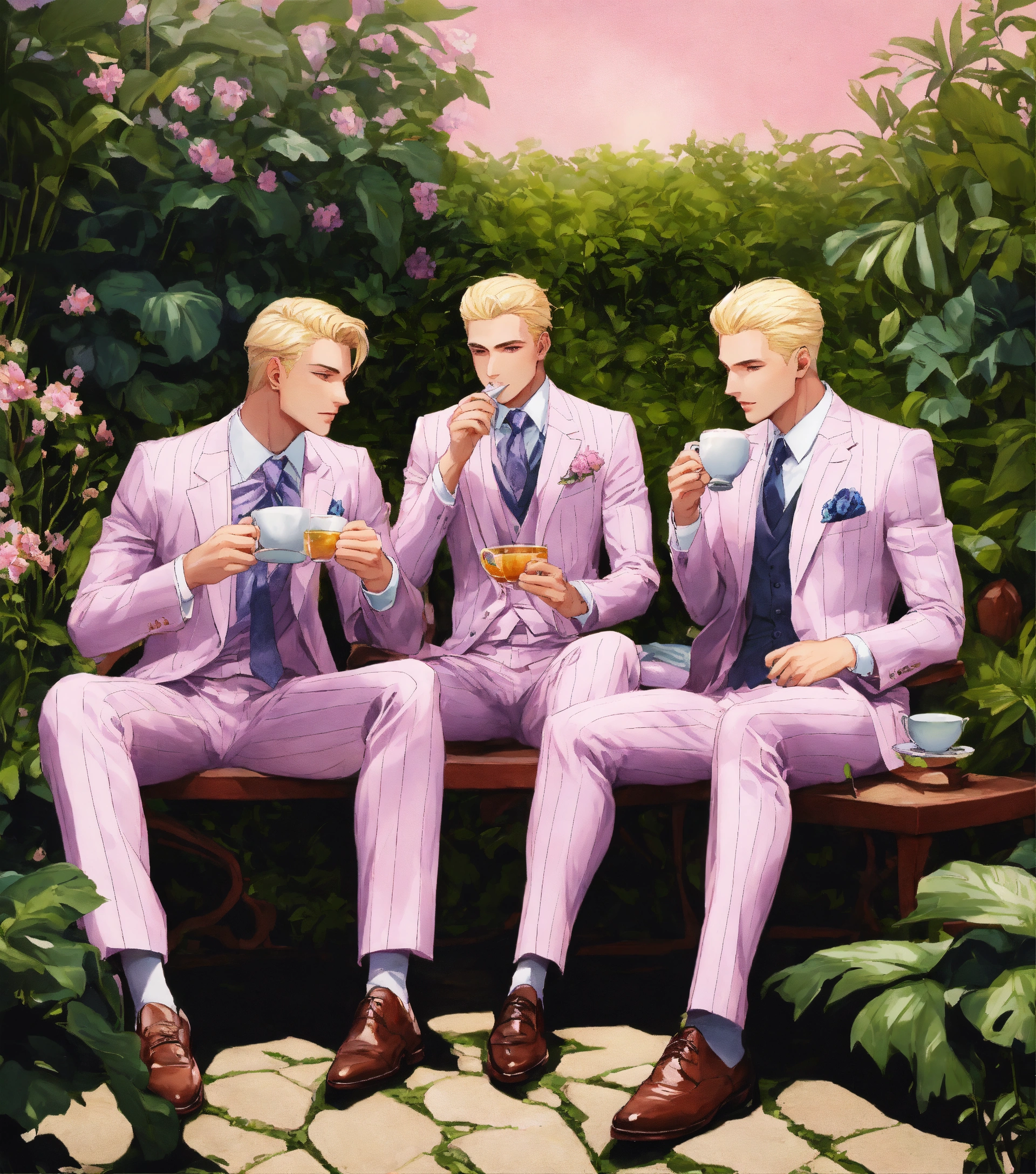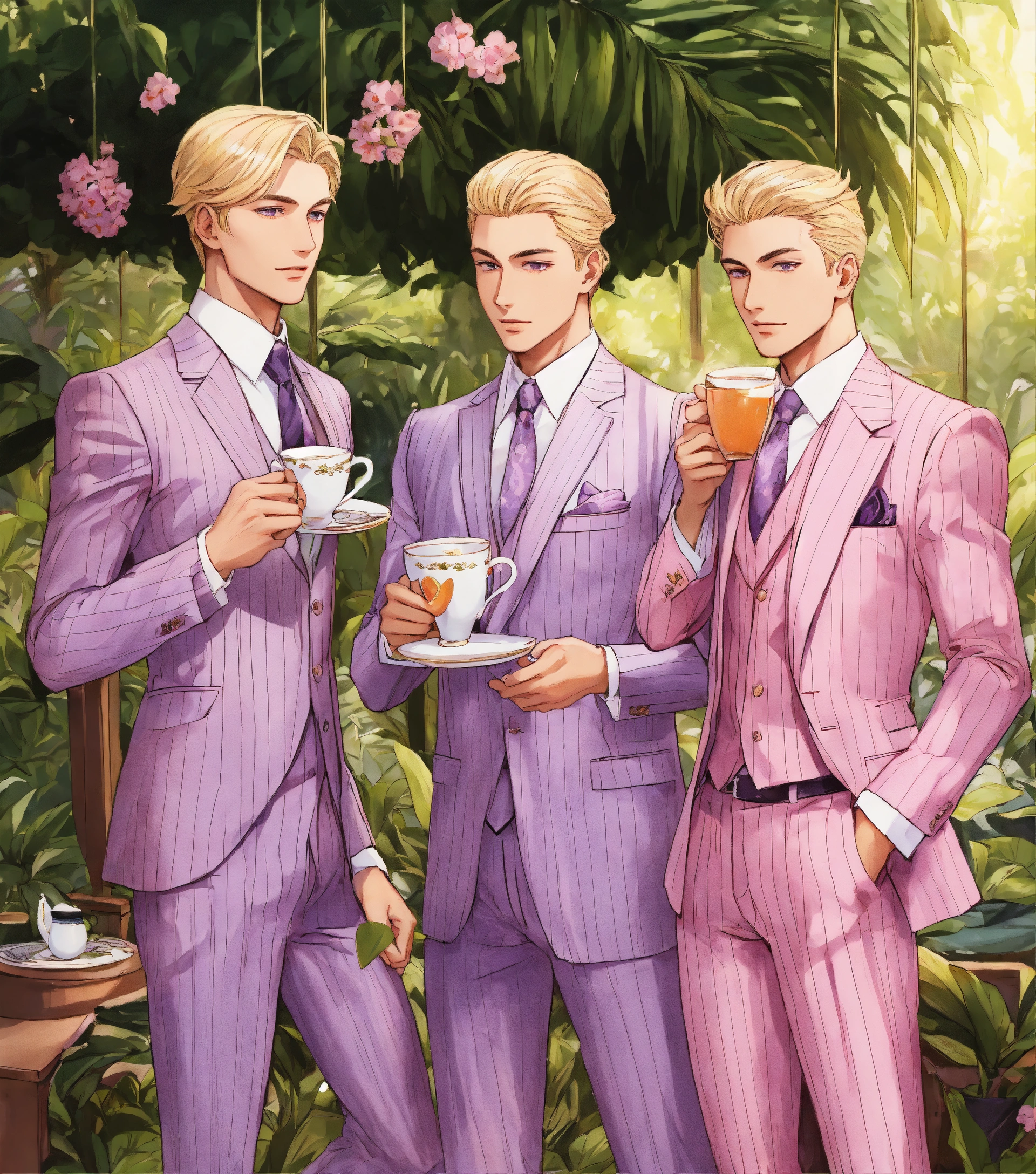Three blonde male businessmen in pale purple and light pink pinstripe suit, drinking tea in an exotic garden, manga style