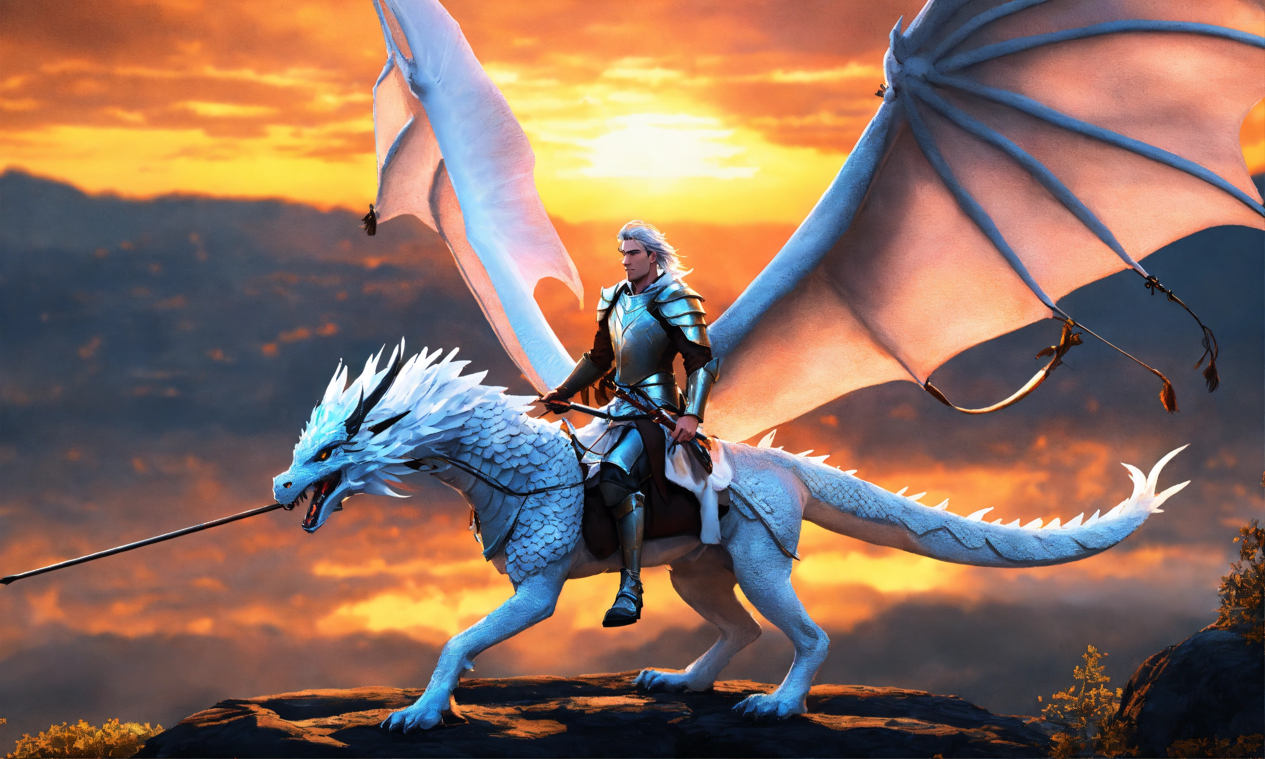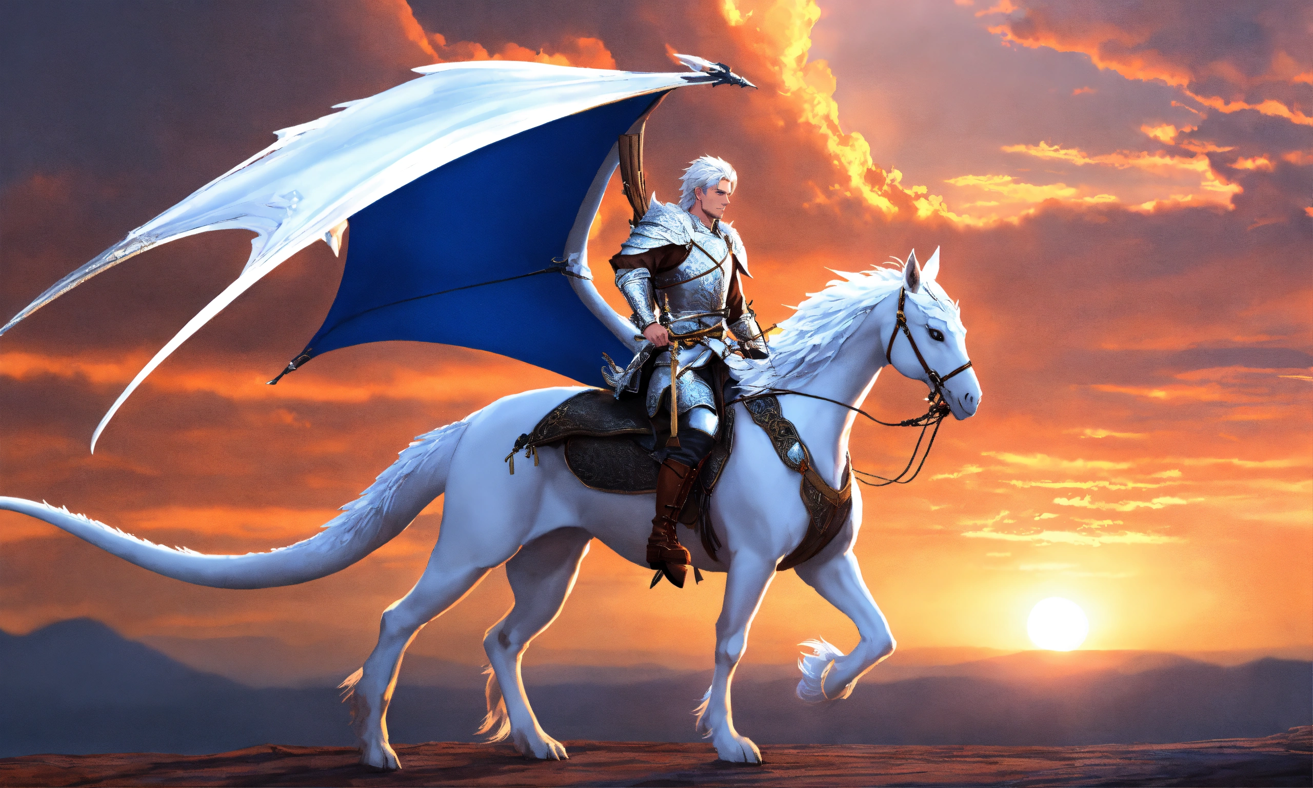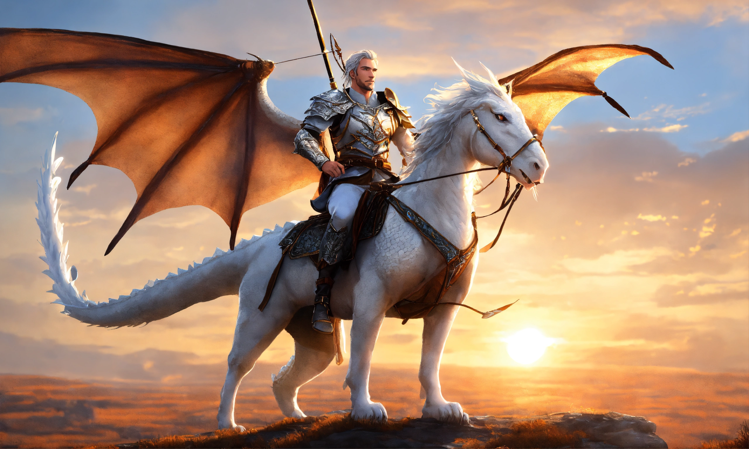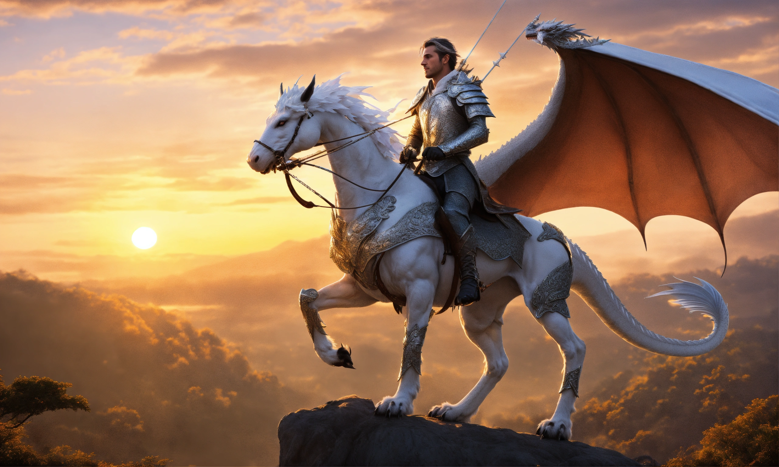 A handsome silver archer rides on a beautiful white dragon into the sunset