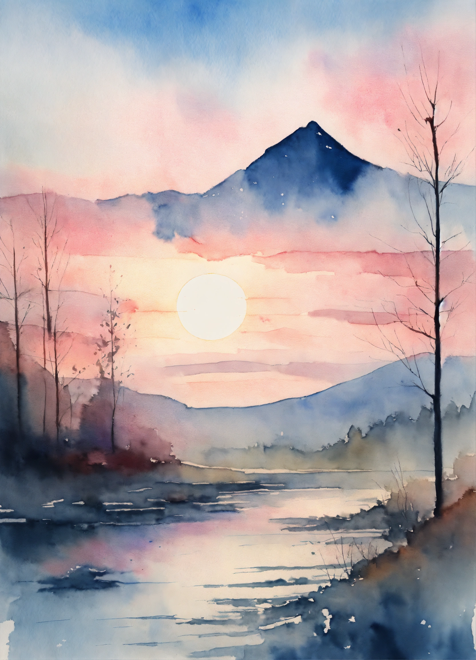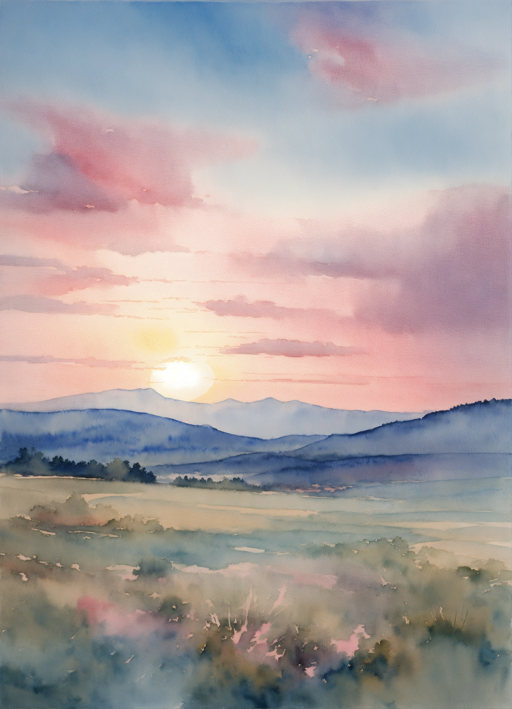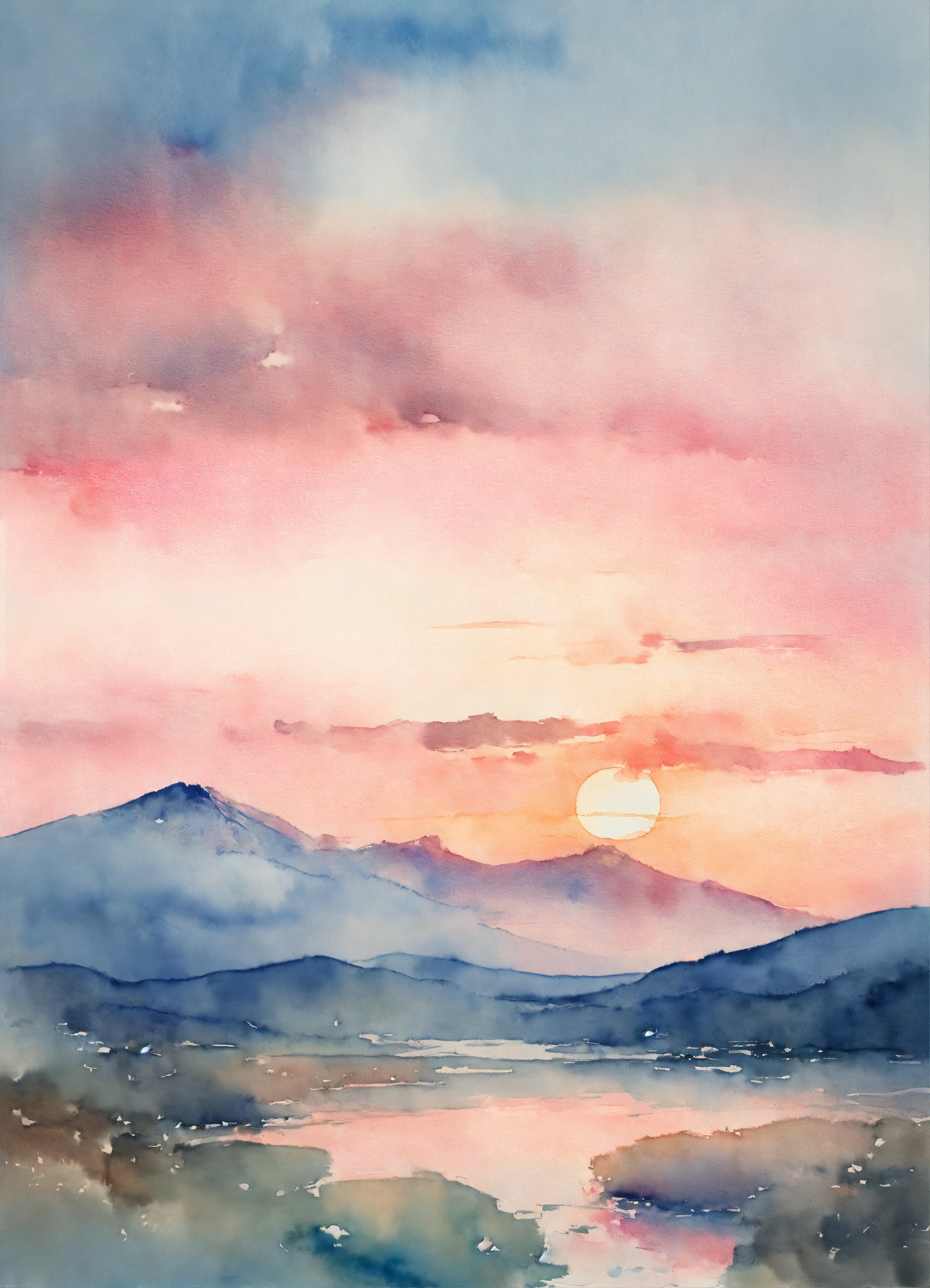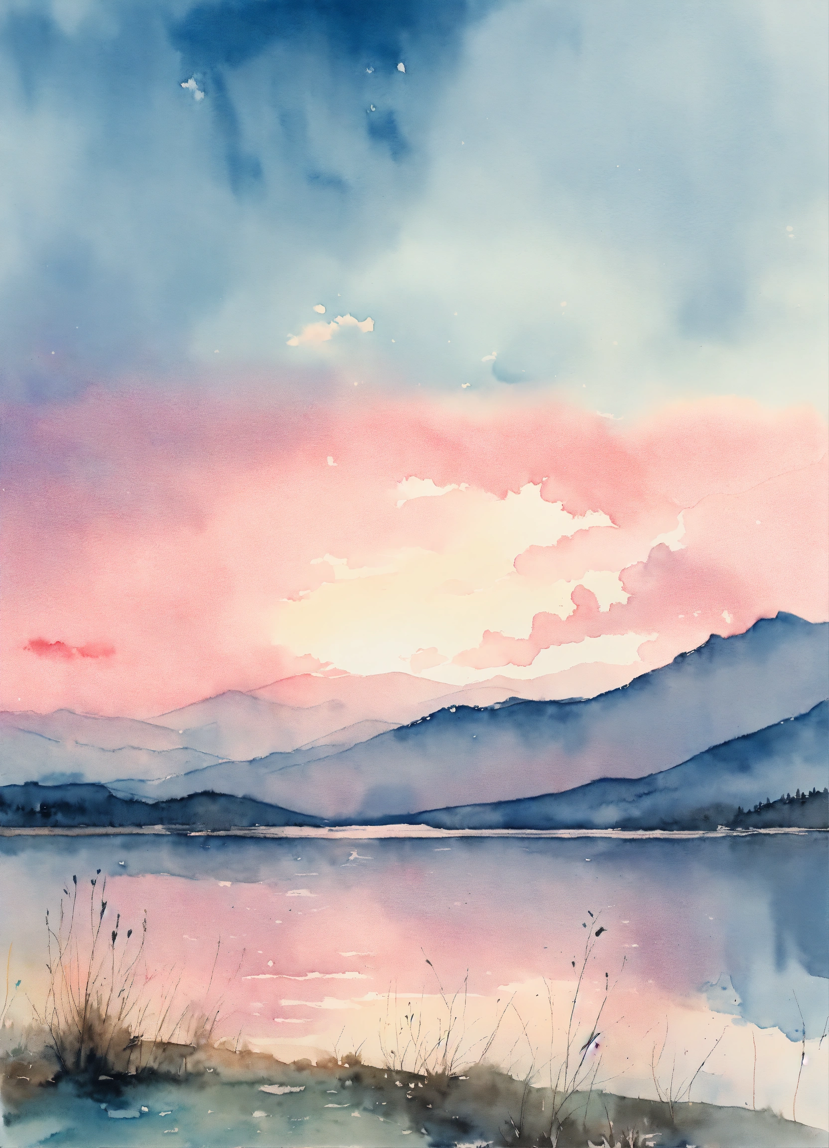 Beautiful watercolor painting of a pale blue sunrise with hints of pink, no trees, dynamic clouds, faint mountains in the bachround