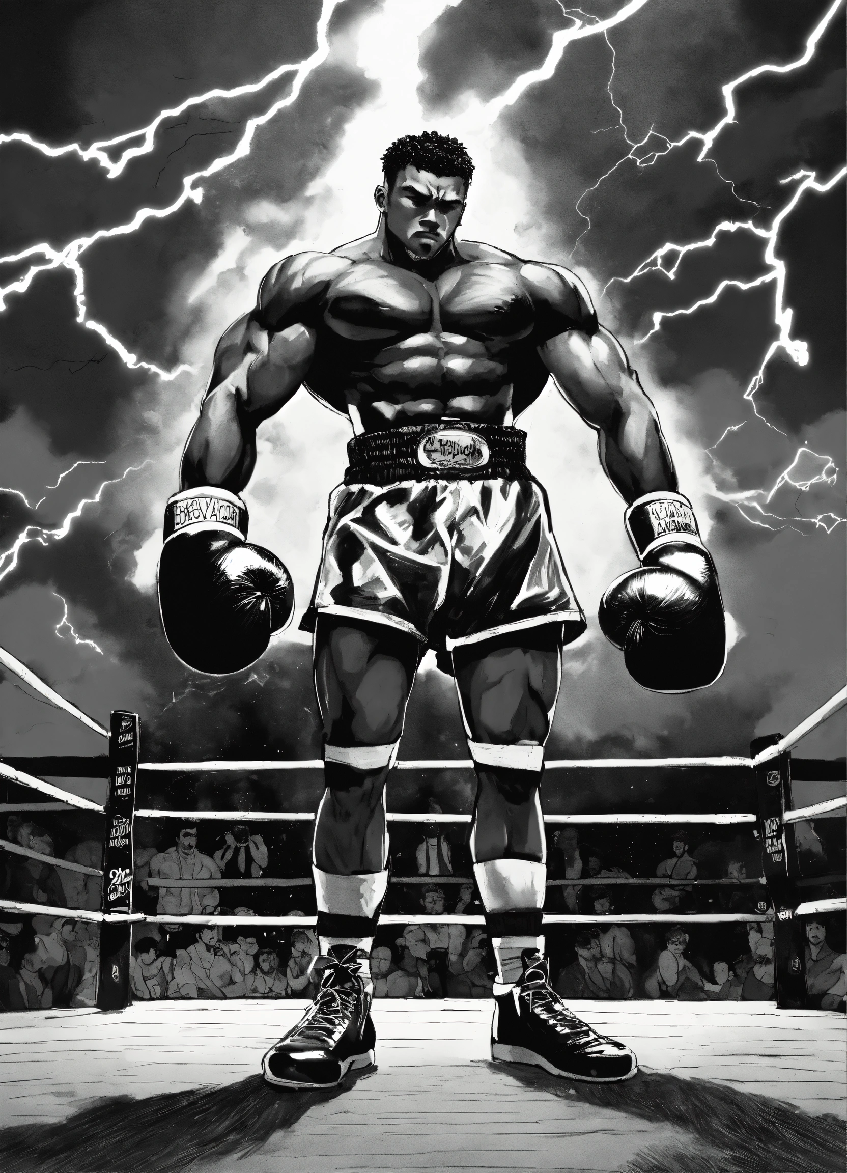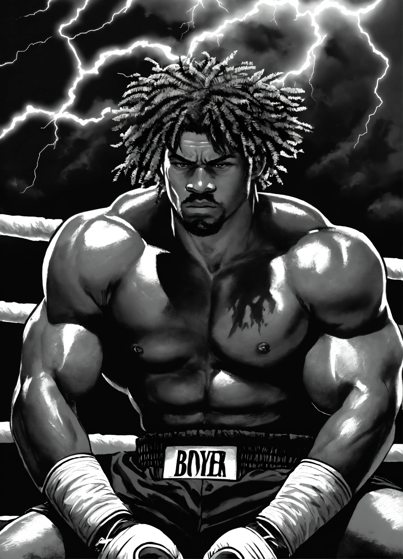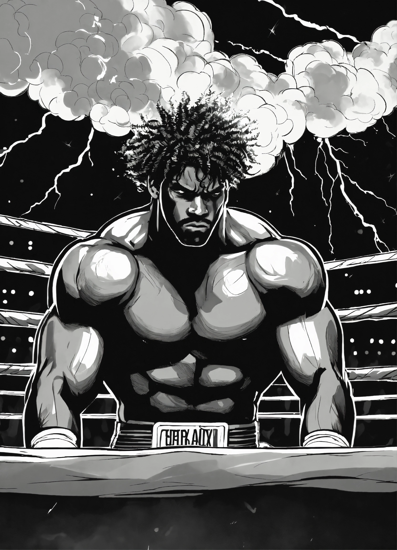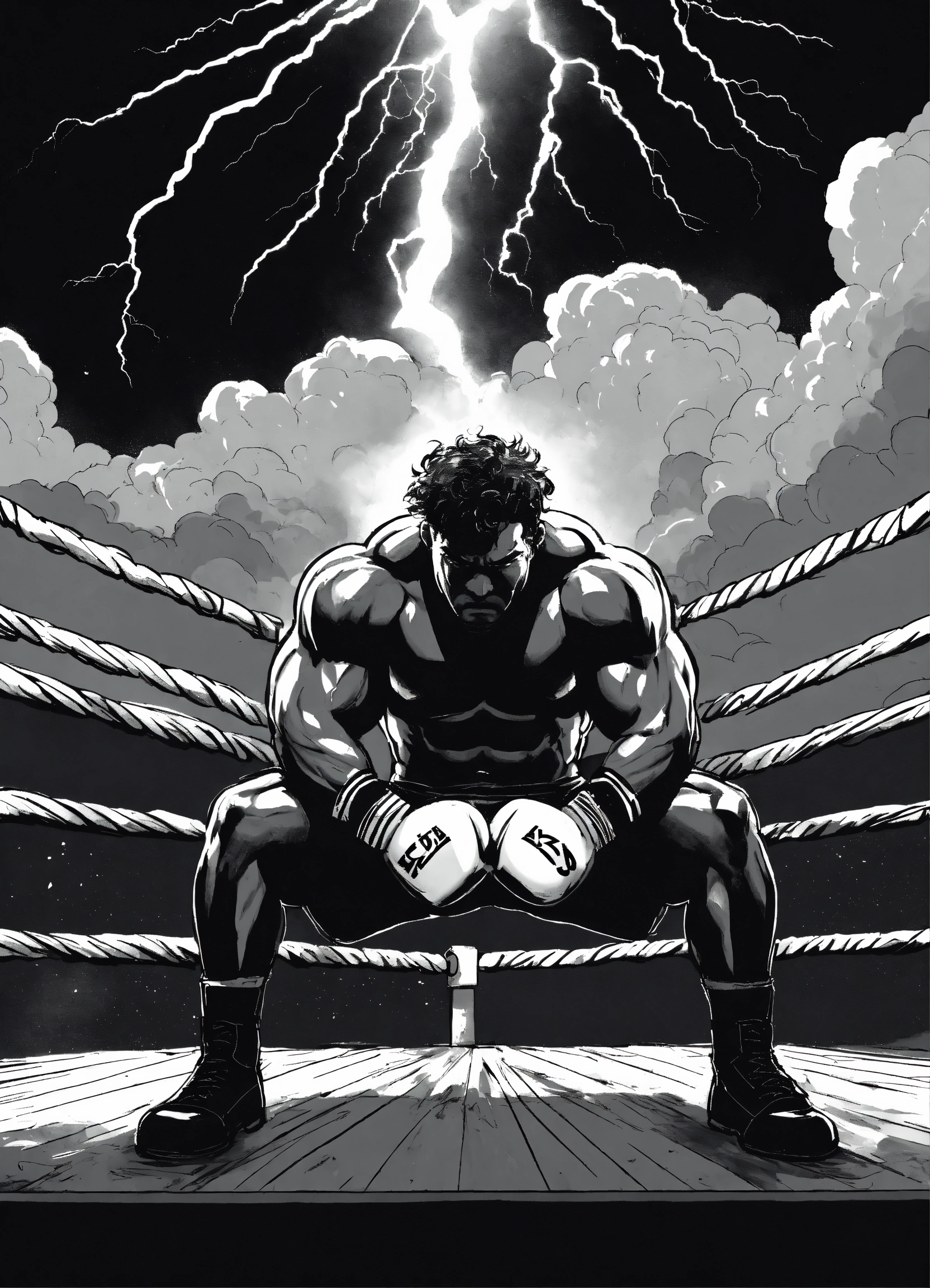 A black and white illustration of a sad masculine boxer, laying in boxing ring, with wild hair and big muscles, with lightning and clouds swirling around him